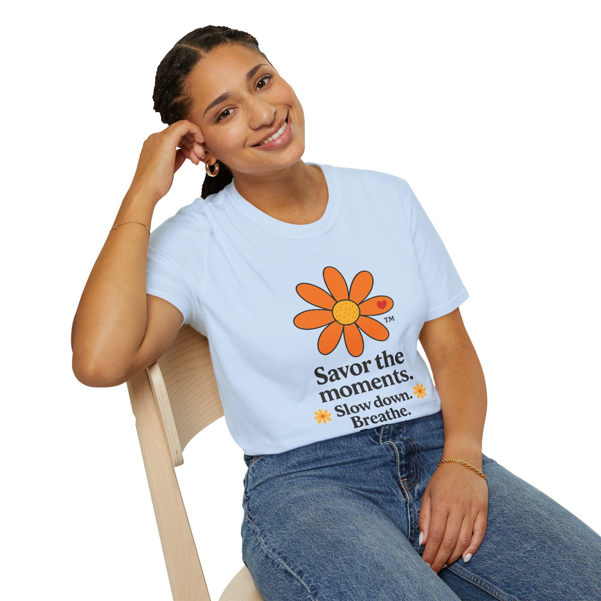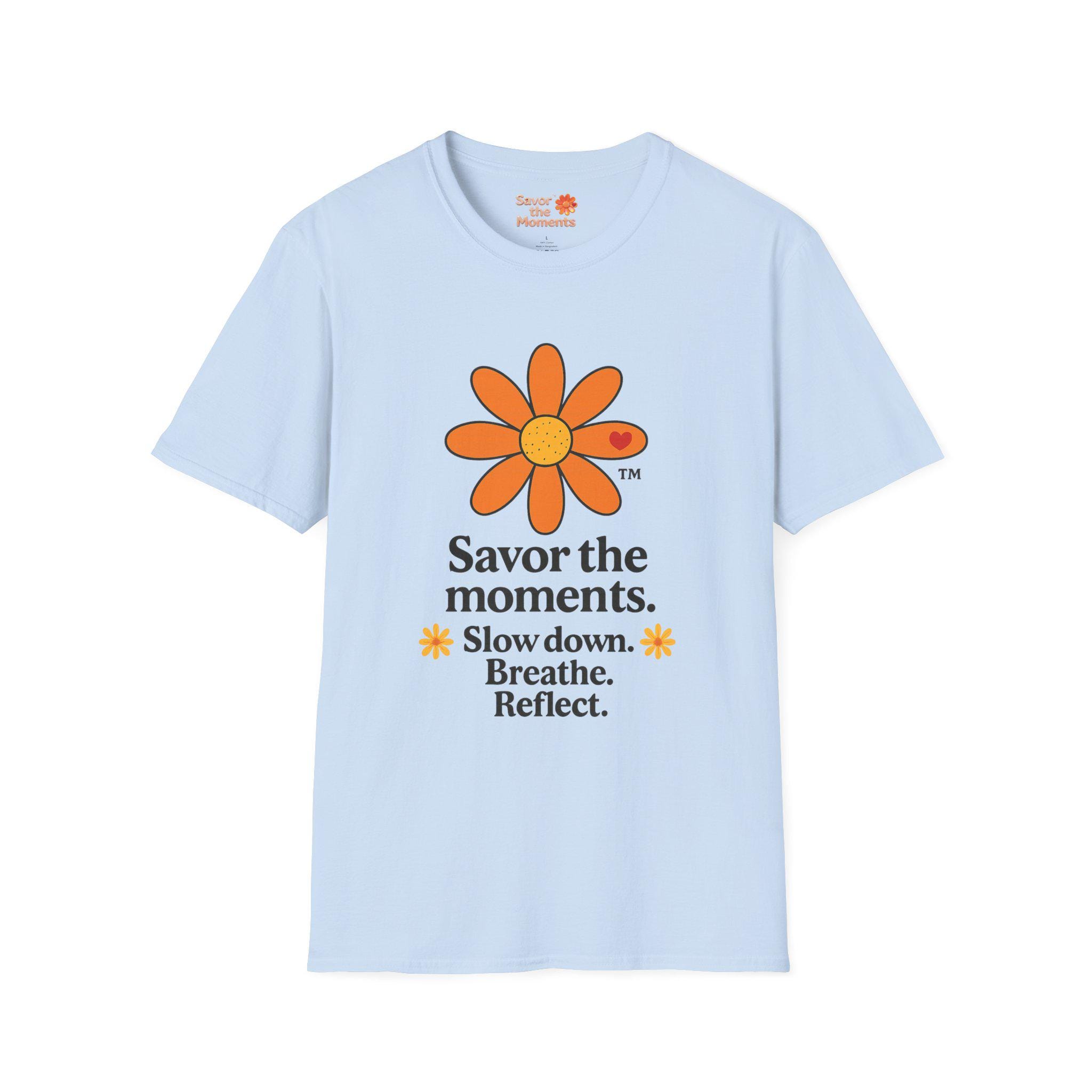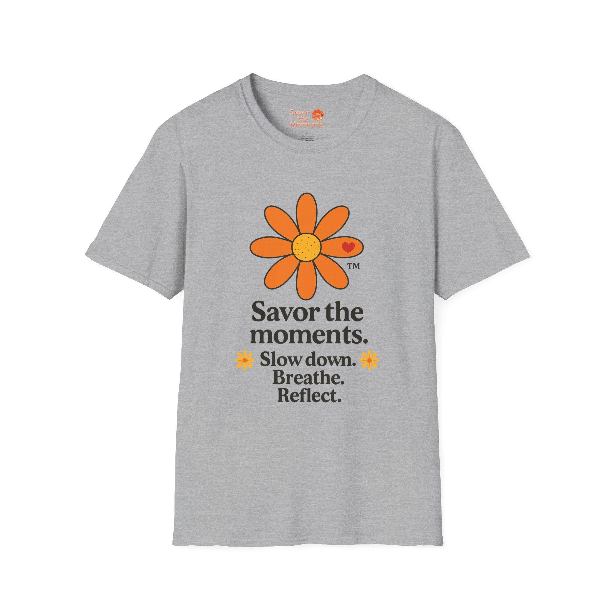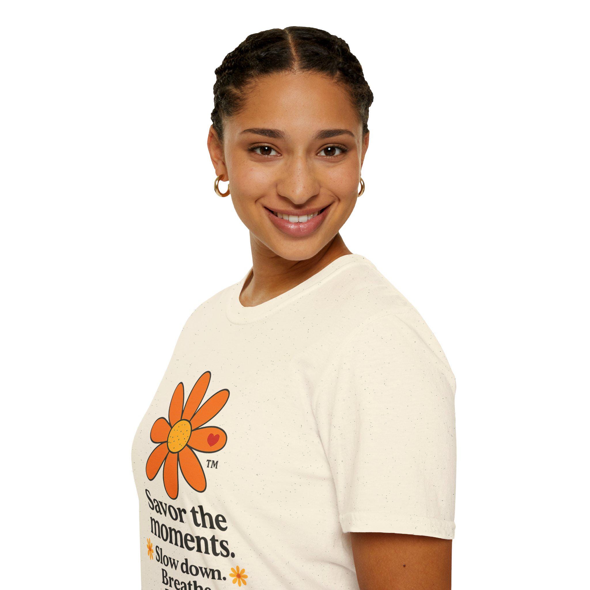 Savor the Moments™ Wellness Tee • Daisy Flower Positive Quote Shirt • Slow Down Breathe Reflect Calm Graphic • Mindful Living Gift. This lightweight cotton tee carries a quiet, sunny message: slow down, breathe, and notice the small things. A simple orange daisy blooms above a minimal, type-driven reminder to savor the moments. Wear it when you need a gentle nudge toward presence — mornings with coffee, slow walks in the park, or evenings unwinding after a busy day. The cut is classic and comfortable so the design sits cleanly on the chest and back, letting the art and words do the calming work. It’s a wearable pause that fits easily into everyday routines and small, mindful rituals.