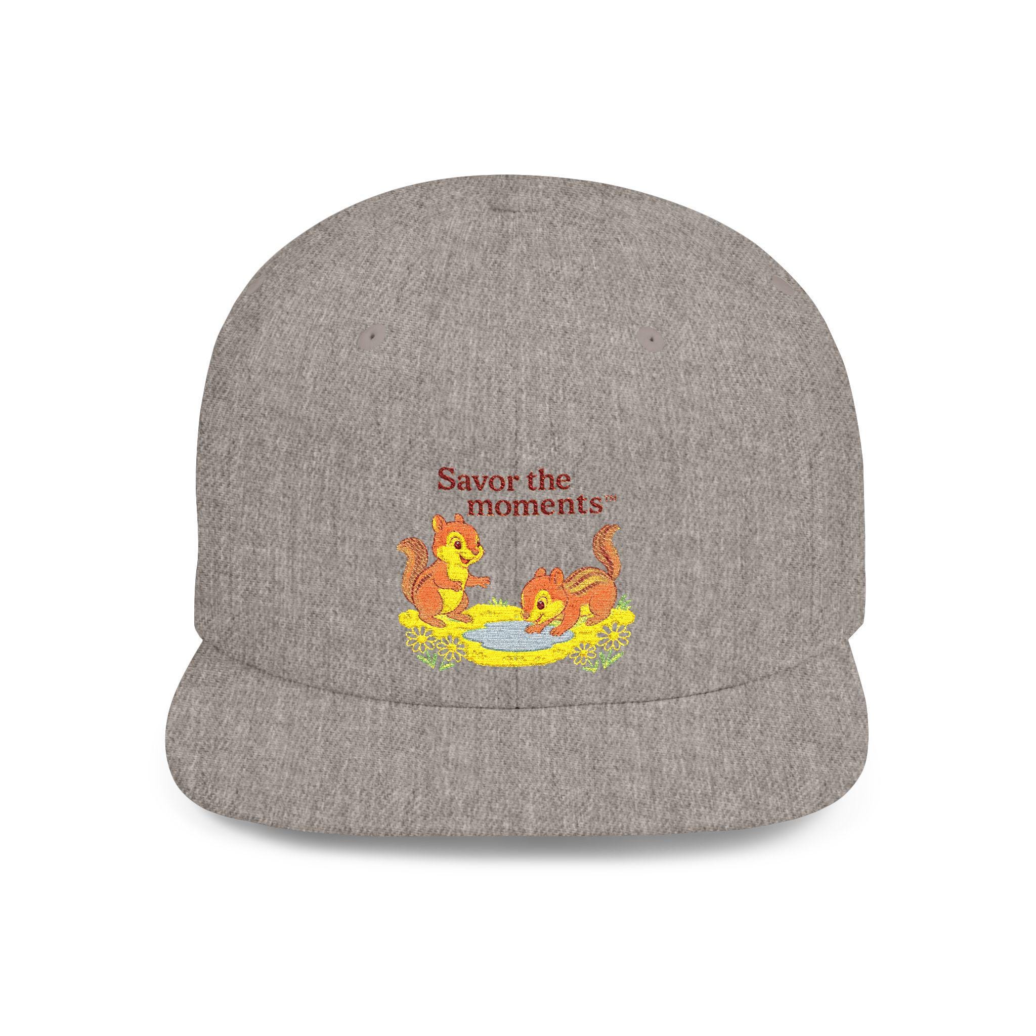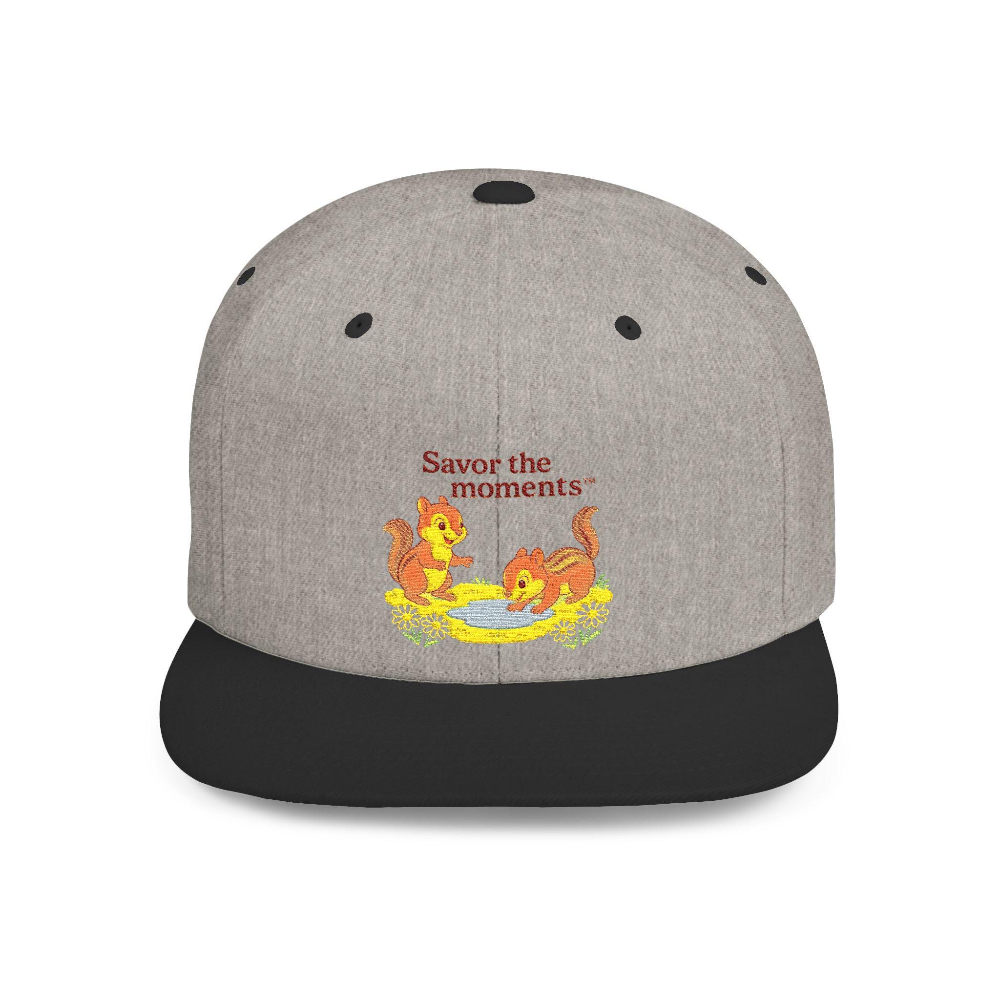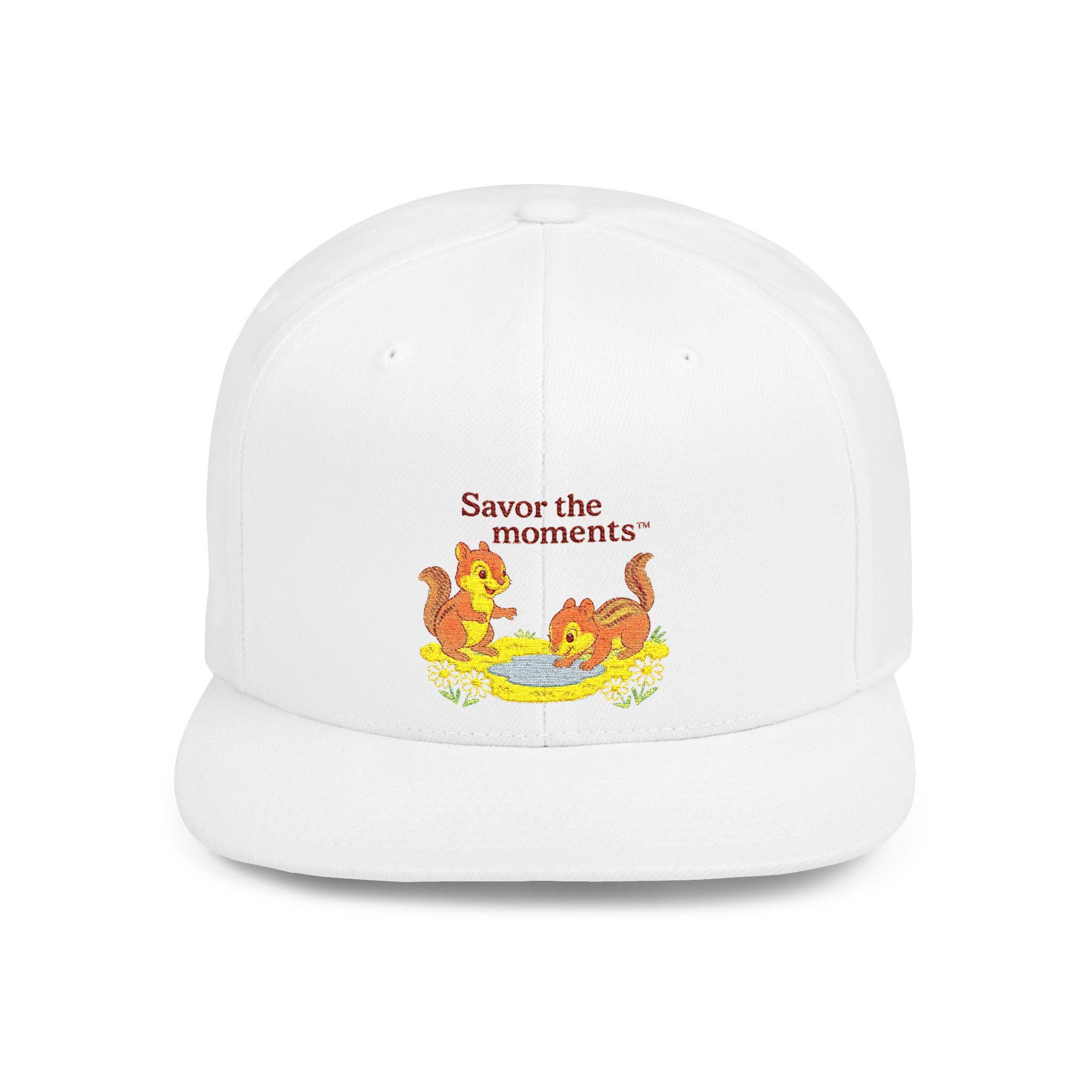 Chipmunks Embroidery Flat Bill Snapback • Vintage Picnic‑Style Cap • Savor the Moments™ Nature Hat • Cute Woodland Gift Idea. A structured, vintage-inspired snapback that brings a warm, nostalgic whisper to everyday wear. The flat-bill silhouette holds a crisp embroidered scene: two playful squirrels gathered around a bowl, framed by the gentle phrase “Savor the moments.” Clean white canvas sets the illustration front and center, while the subtle green undervisor gives a nod to classic ballcap styling. High-profile panels keep the shape bold and present, and the adjustable plastic snap closure makes it easy to dial in a comfortable fit. Wear it on slow weekend mornings, while wandering farmers’ markets, or during backyard gatherings — it’s a little gesture toward slowing down and noticing small, bright details.
