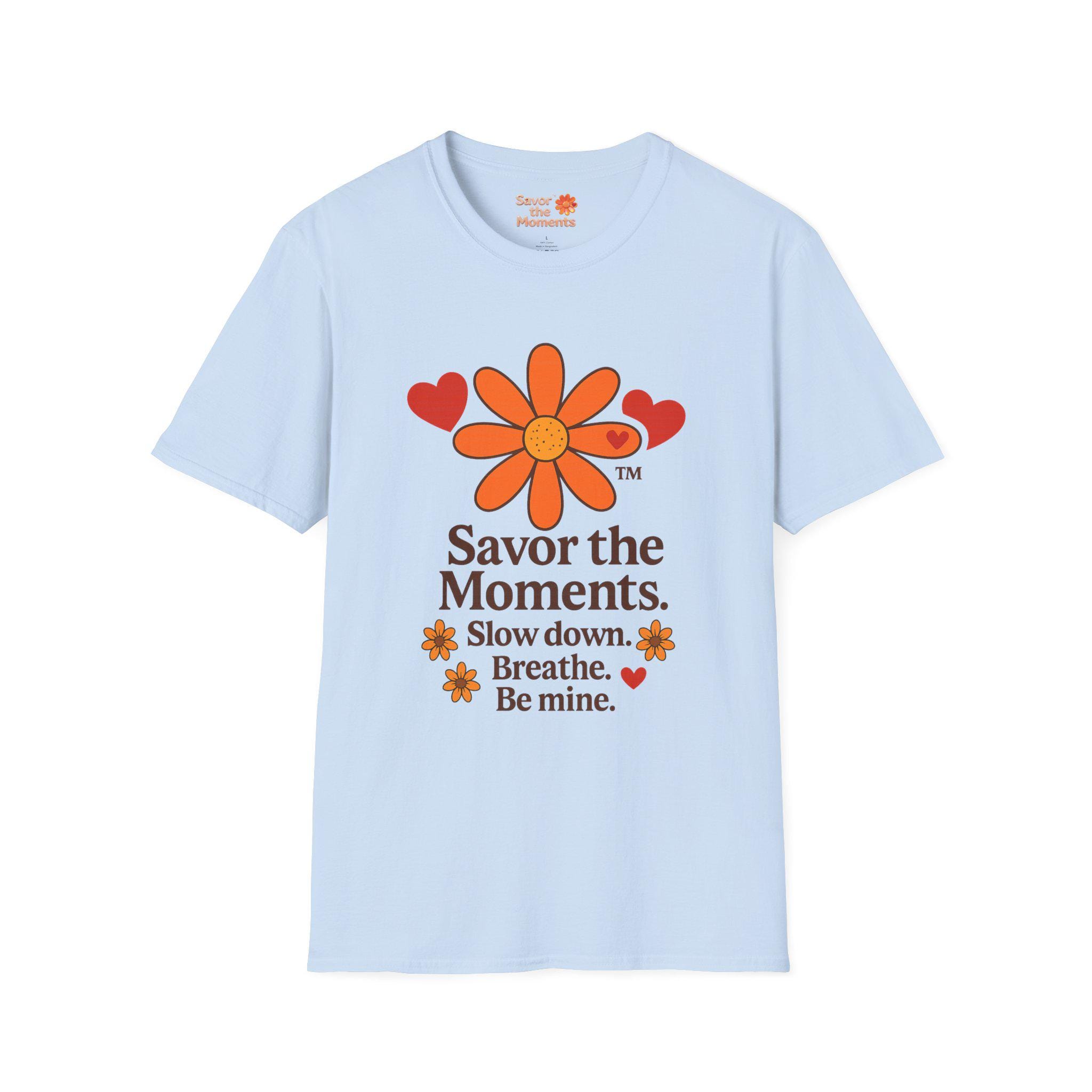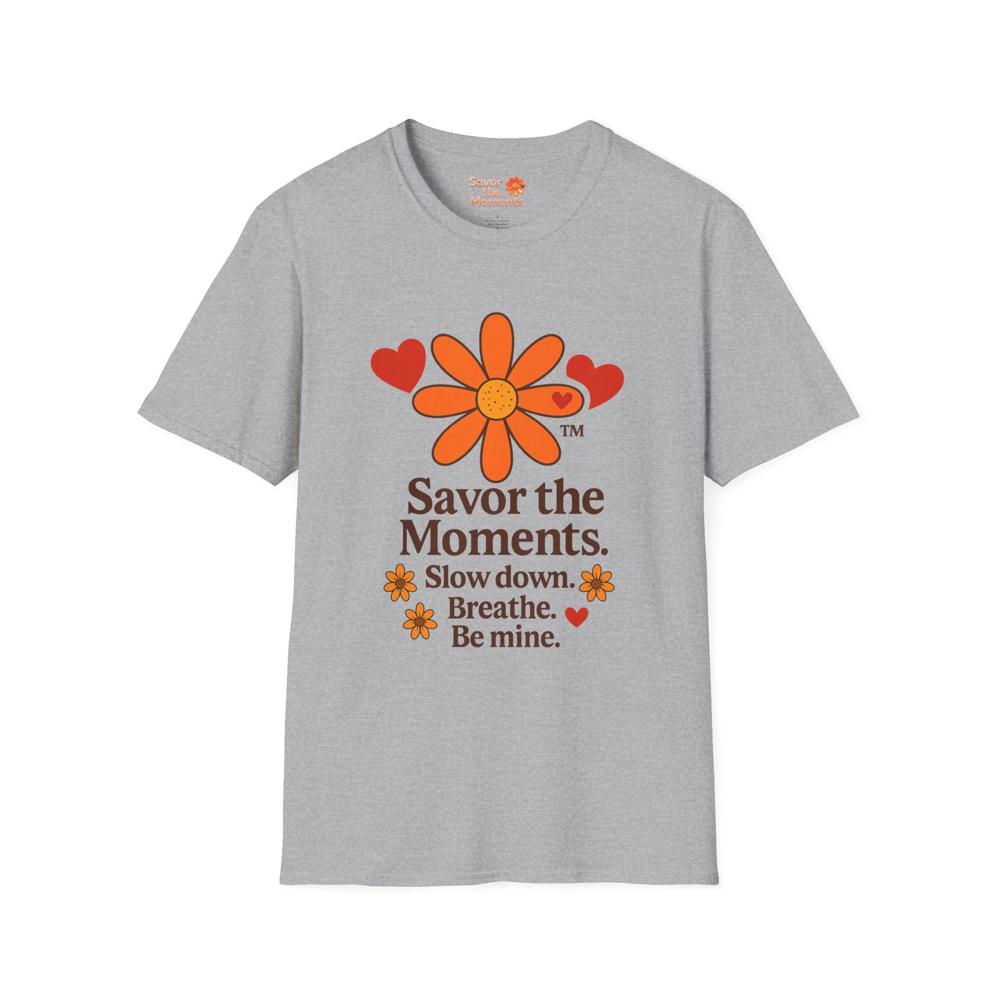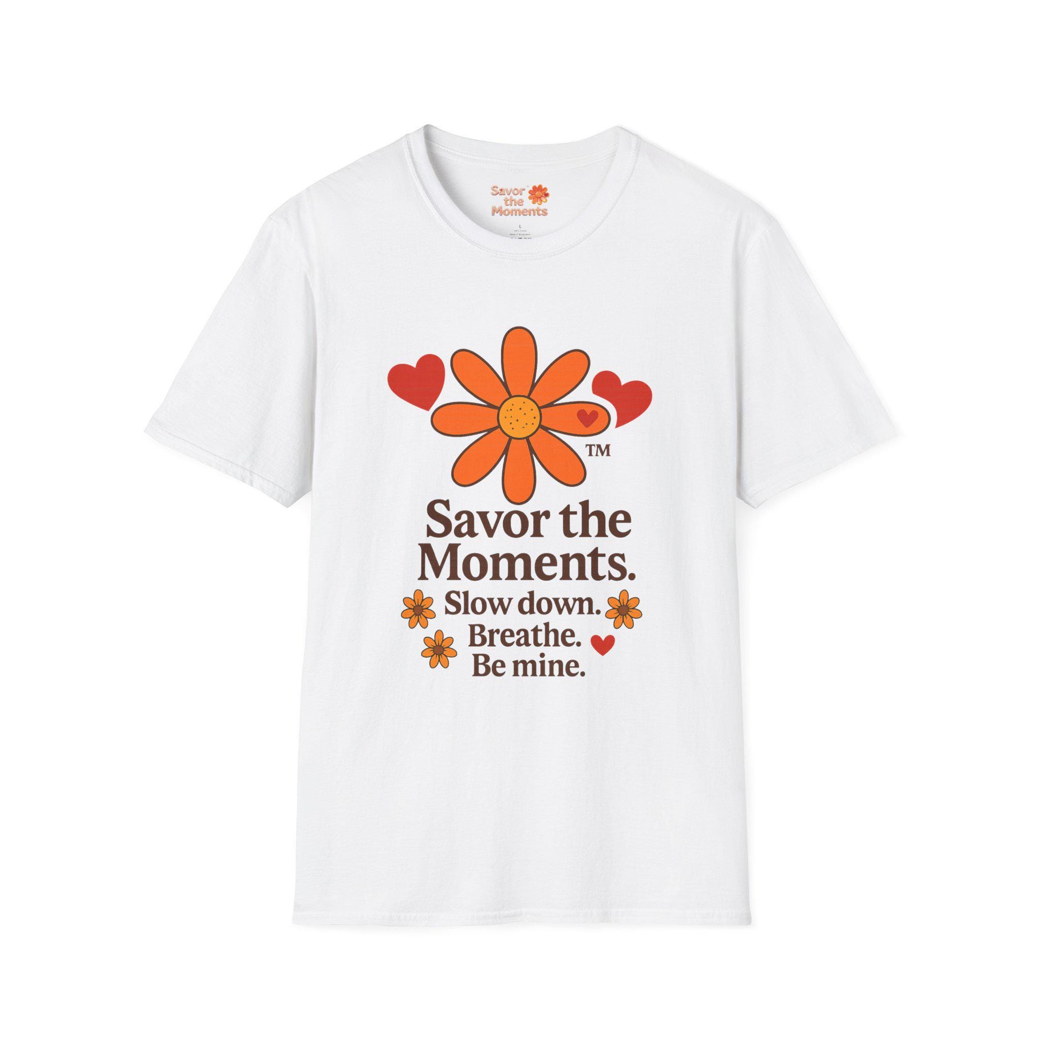 Valentine’s Day Savor the Moments™ Daisy T‑Shirt • Orange Flower & Hearts Graphic • Inspirational Quote Tee • Meaningful Gift for Him or Her. This lightweight cotton tee carries a gentle, nostalgic energy — a soft white canvas printed with a sunflower-like daisy, warm orange hearts, and the calming mantra: “Savor the Moments. Slow down. Breathe. Be mine.” Wear it when you need a quiet reminder to pause and notice the small, tender parts of your day. The crew neck and classic fit sit comfortably whether you’re strolling a farmers’ market, sipping coffee on a porch, or curled up with a book. Subtle vintage hues and clean typography make it easy to layer under a cardigan or wear solo for an understated, cozy look.