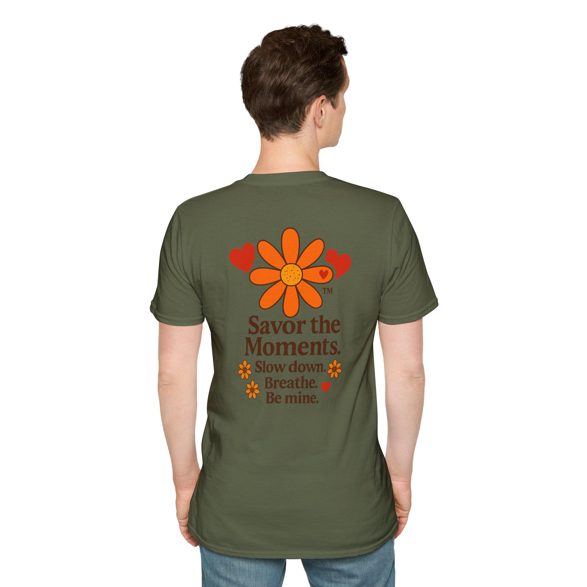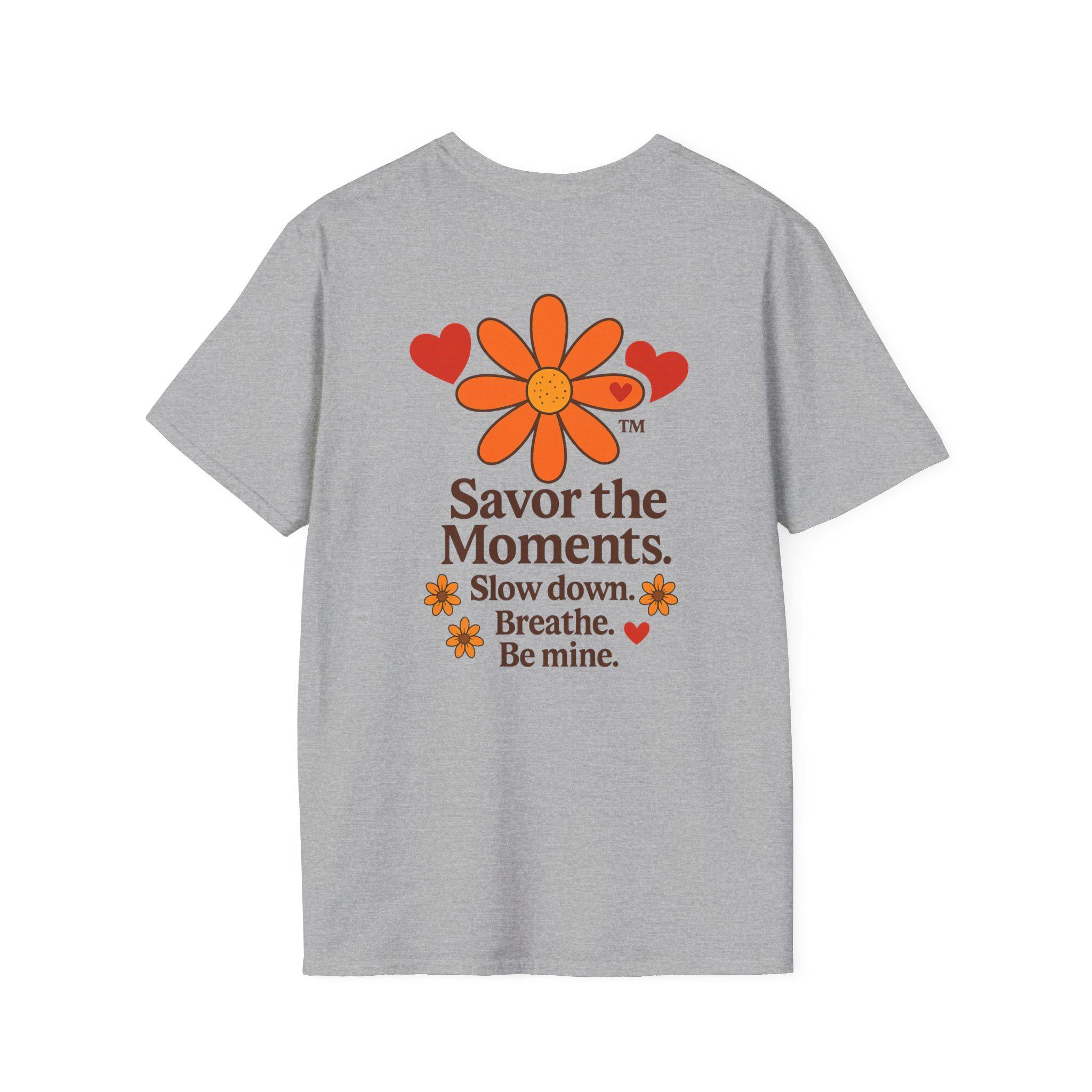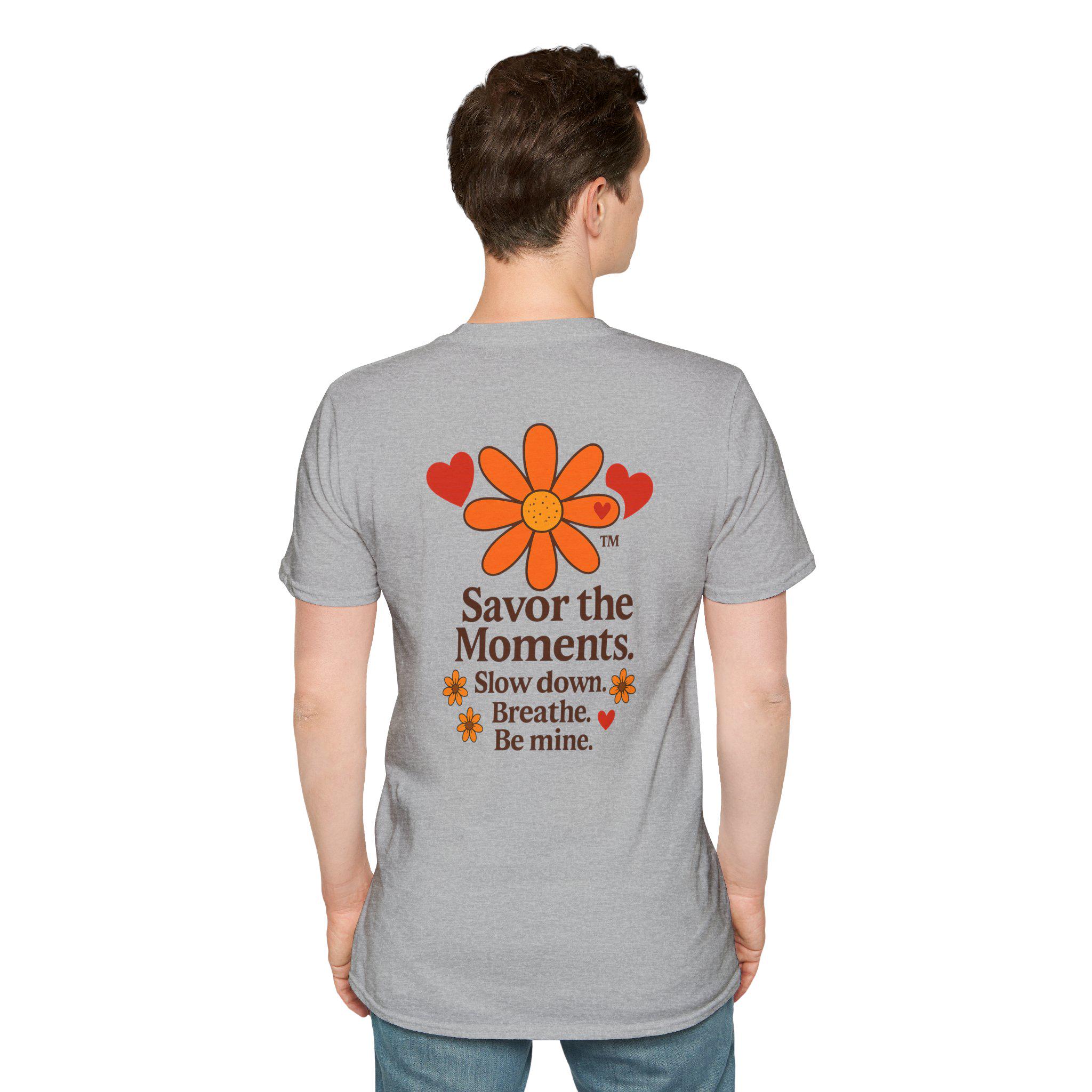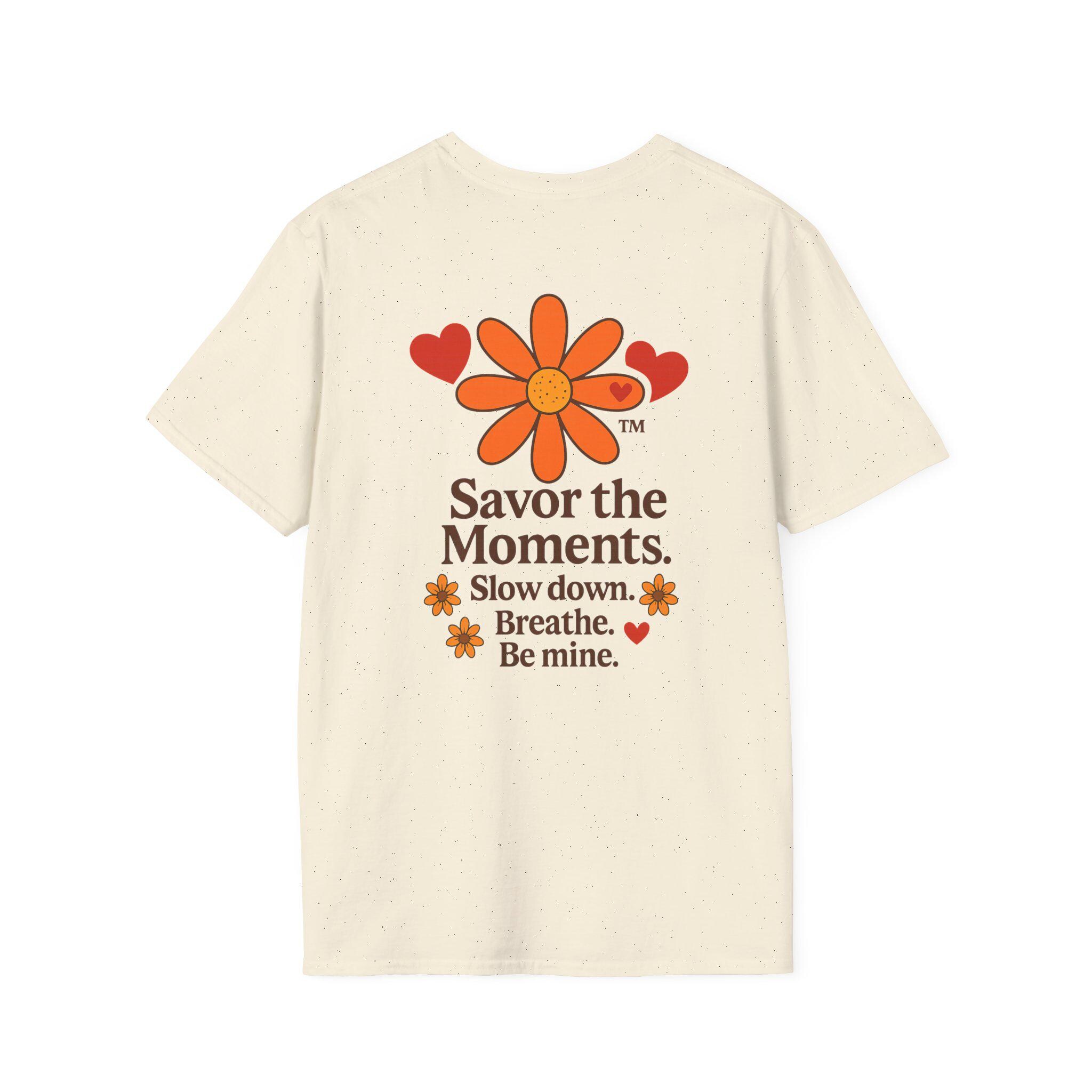 Valentine’s Day Savor the Moments™ Daisy T‑Shirt • Orange Flower & Hearts Graphic • Inspirational Quote Tee • Meaningful Gift for Him or Her. This lightweight cotton tee carries a gentle, nostalgic energy — a soft white canvas printed with a sunflower-like daisy, warm orange hearts, and the calming mantra: “Savor the Moments. Slow down. Breathe. Be mine.” Wear it when you need a quiet reminder to pause and notice the small, tender parts of your day. The crew neck and classic fit sit comfortably whether you’re strolling a farmers’ market, sipping coffee on a porch, or curled up with a book. Subtle vintage hues and clean typography make it easy to layer under a cardigan or wear solo for an understated, cozy look.
