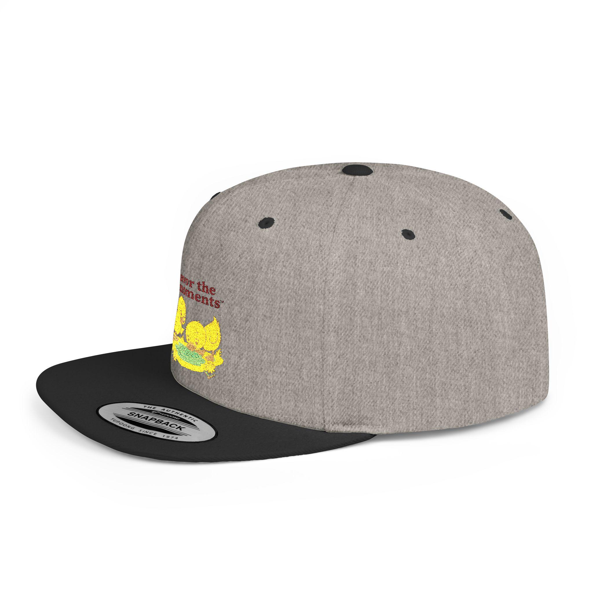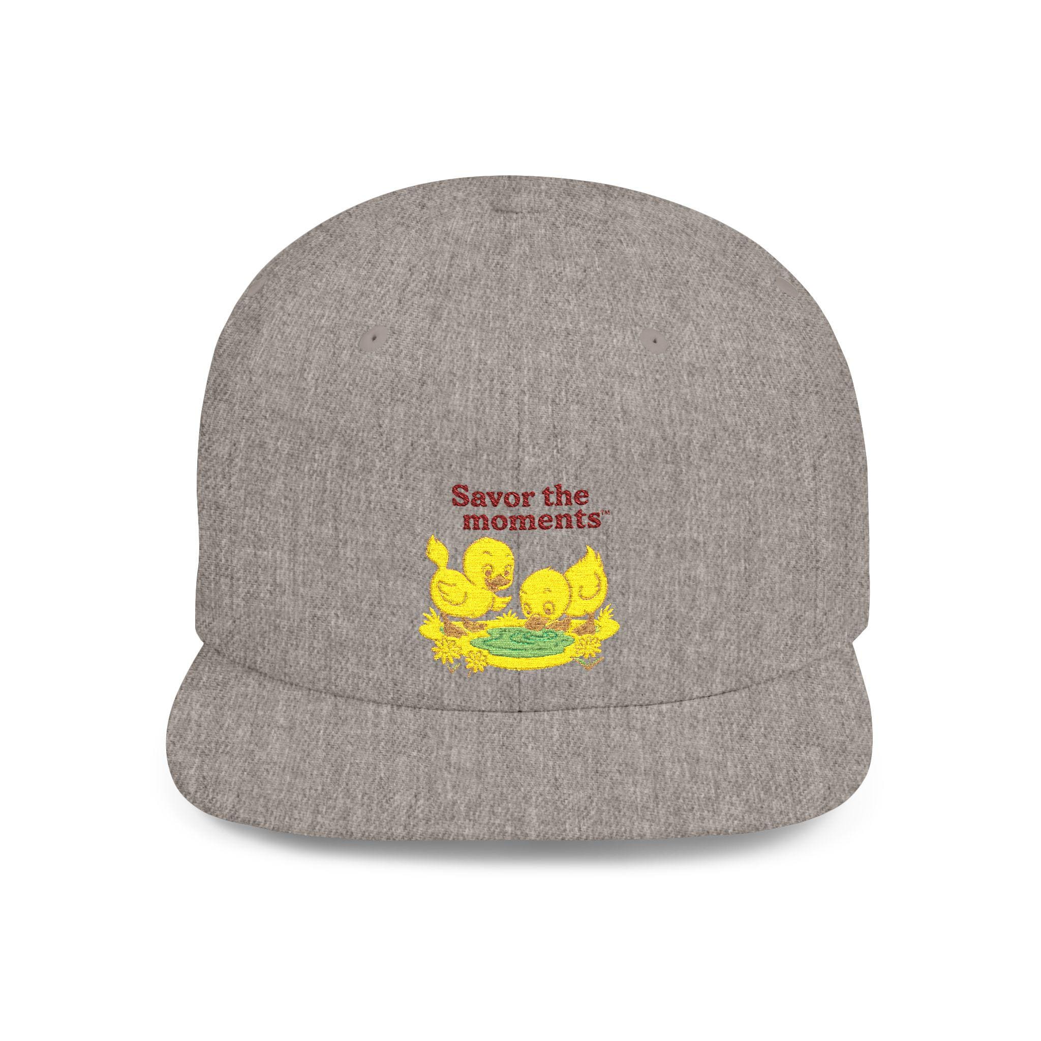 Embroidered Baby Chicks Flat Bill Snapback • Soft Pastel Spring Floral Hat • Savor the Moments™ Nature Graphic • Gift for Outdoorsy Friends. A clean, structured snapback embroidered with a soft, nostalgic design — tiny yellow chicks gathered around a bright nest under the words “Savor the moments.” The flat bill and high-profile crown give it a bold silhouette, while the green undervisor nods to classic cap styling. Lightweight yet sturdy fibers hold the shape; the adjustable snap lets you dial in a comfortable fit. Wear it on slow morning walks, weekend markets, or when you want a subtle, cheerful reminder to notice small joys.