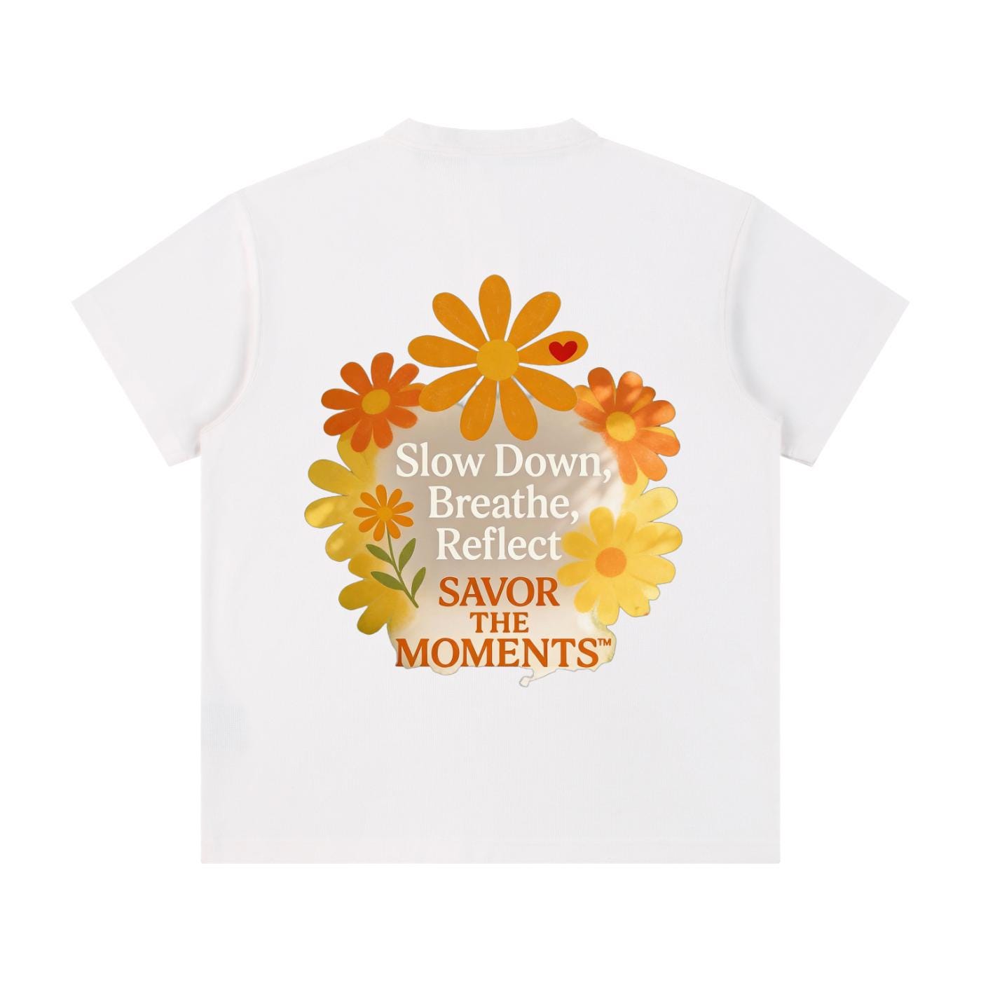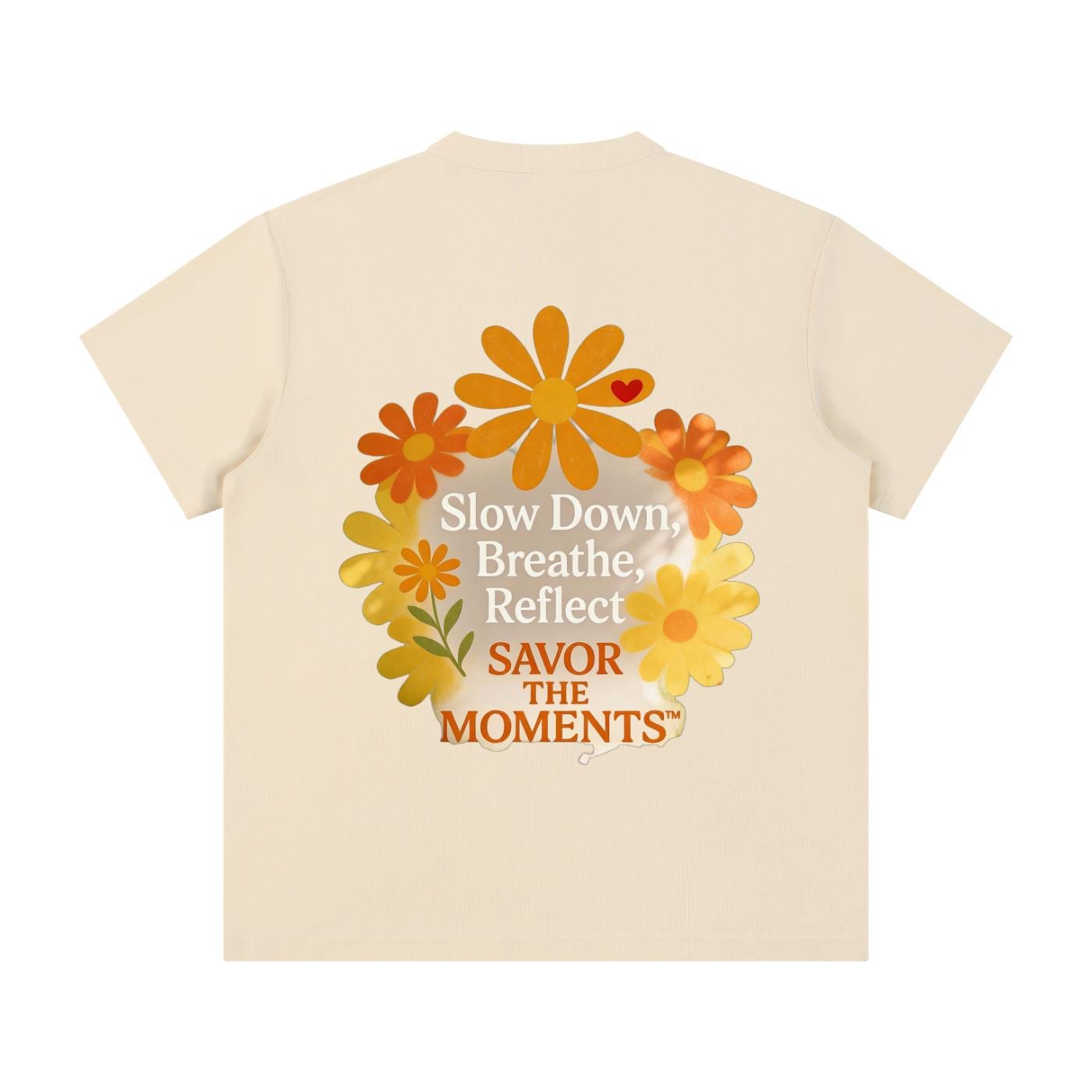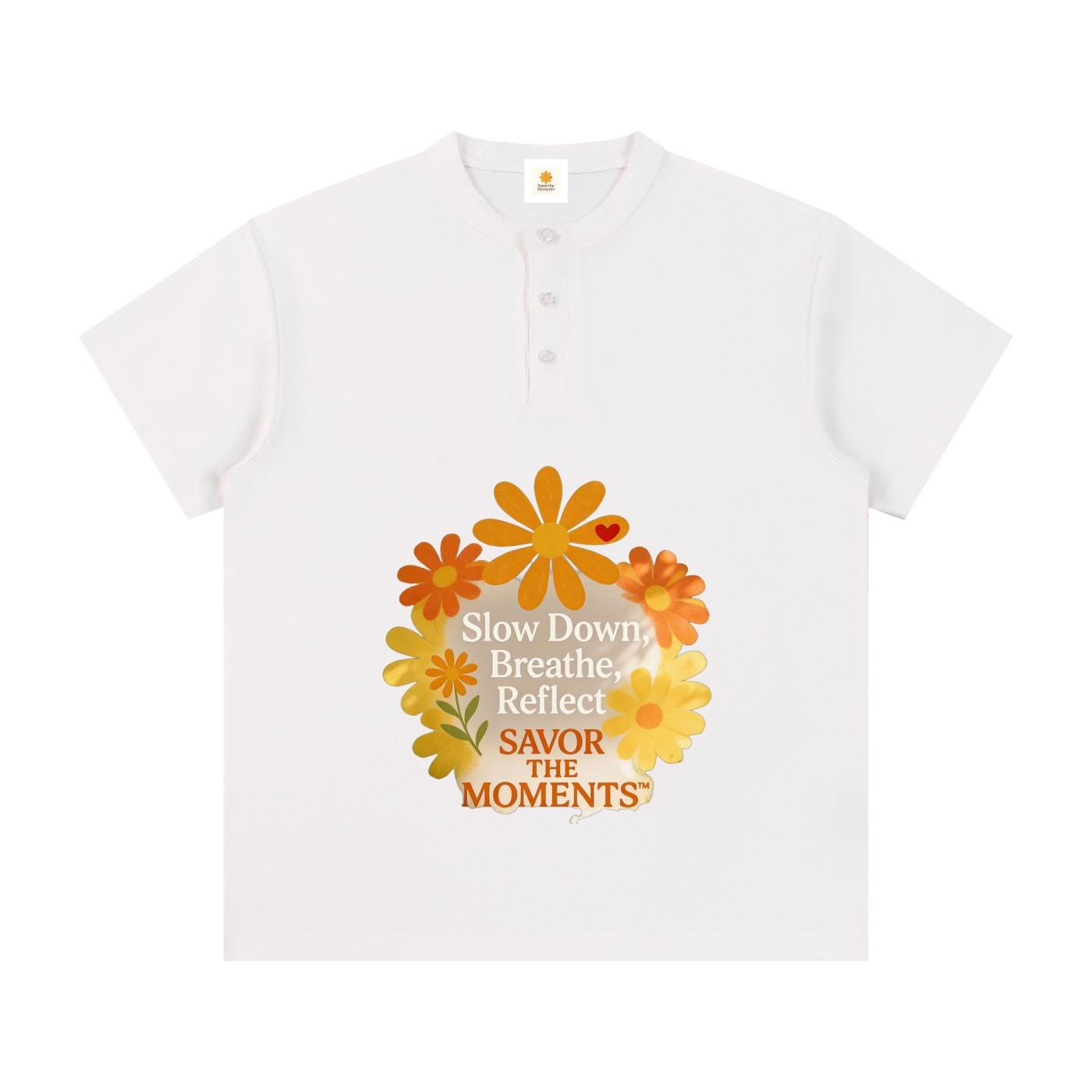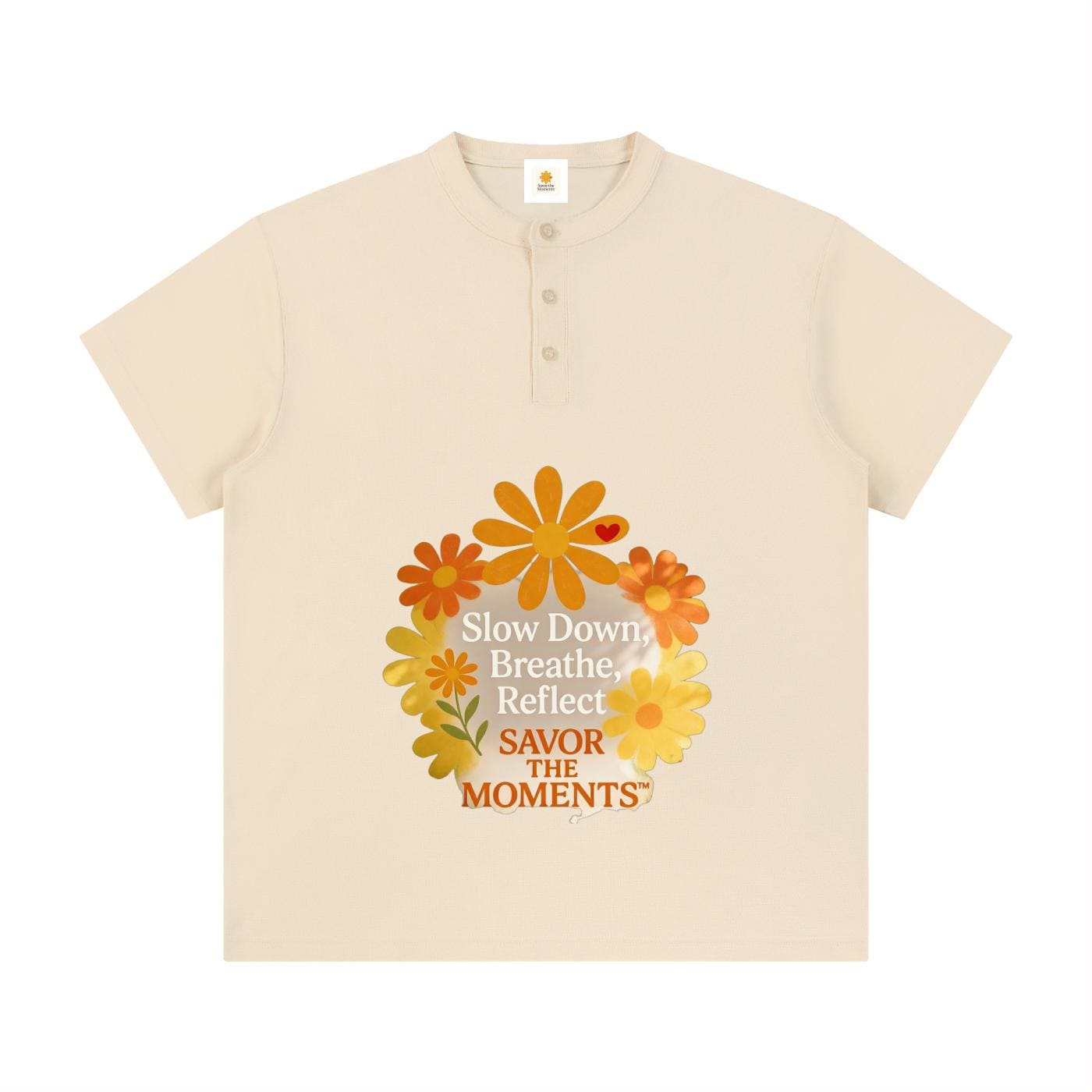 Orange Daisy Henley Tee • Savor the Moments™ Slow Down Breathe Shirt • Soft Wellness Quote Top • Calm Mindful Living Everyday Wear.