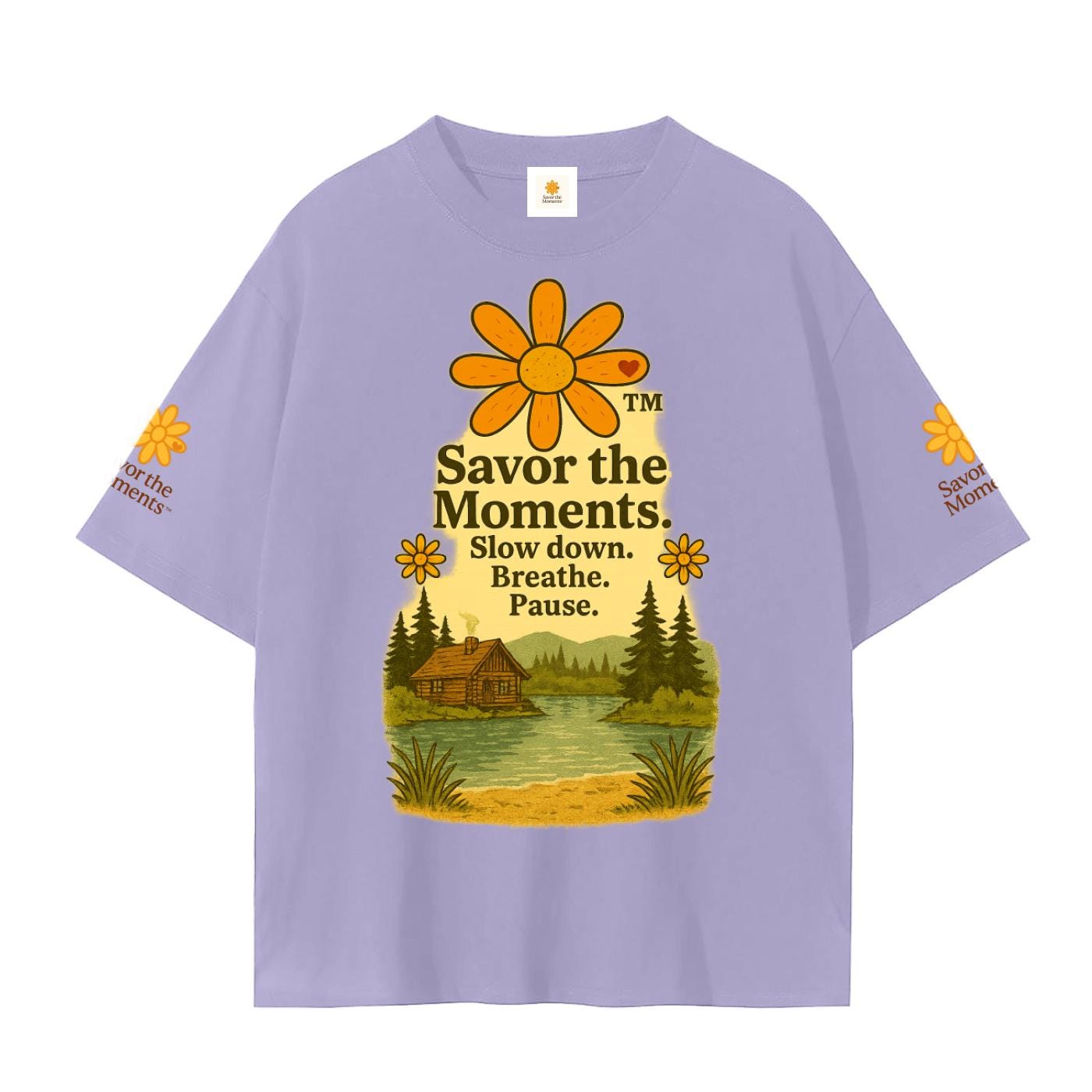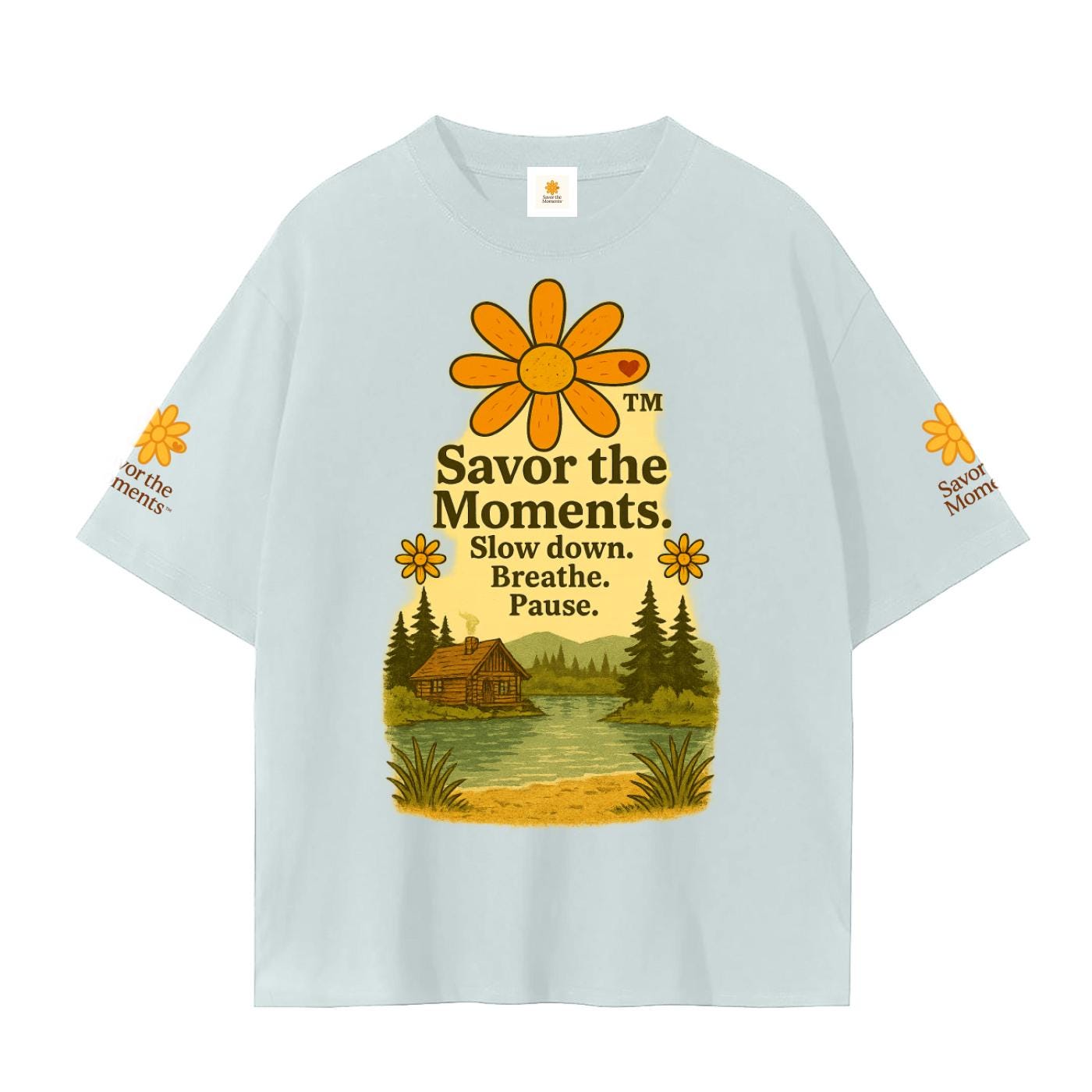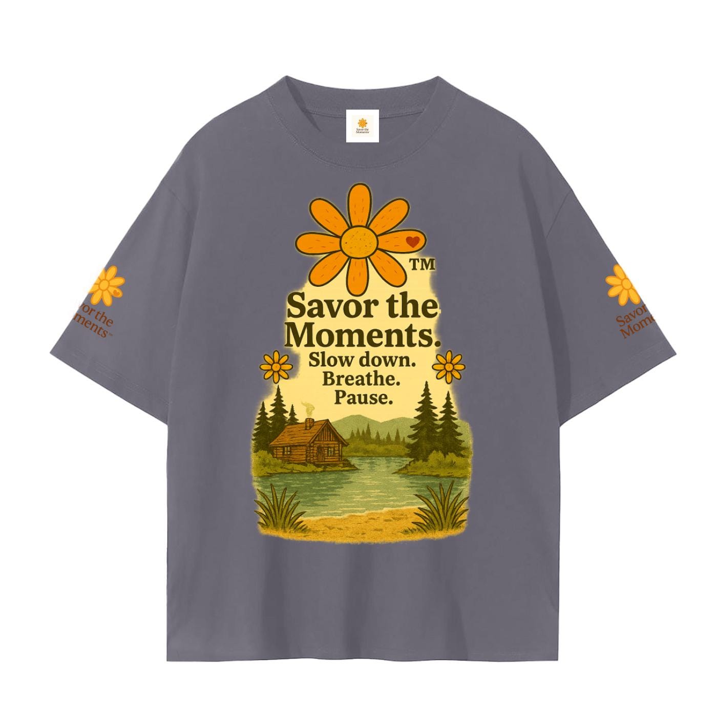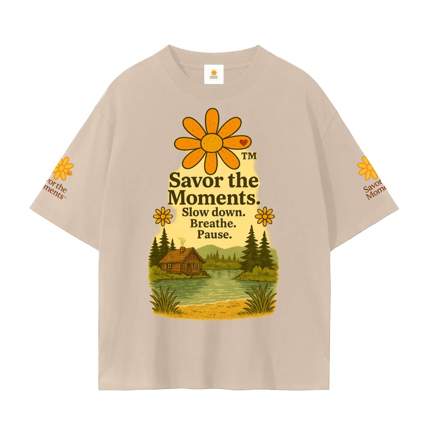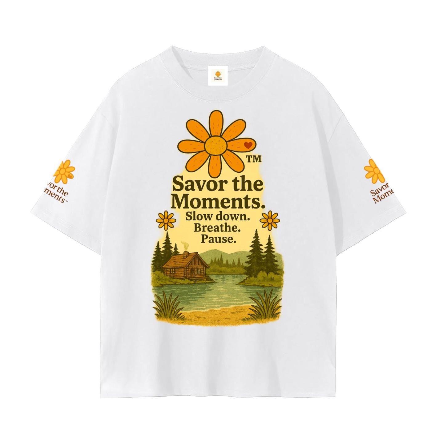 Nature Cabin & Lake Graphic Tee • Unisex Seamless Orange Daisy Shirt • Slow Down Breathe Pause Wellness Quote • Soft Mindful Savor the Moments™ Top