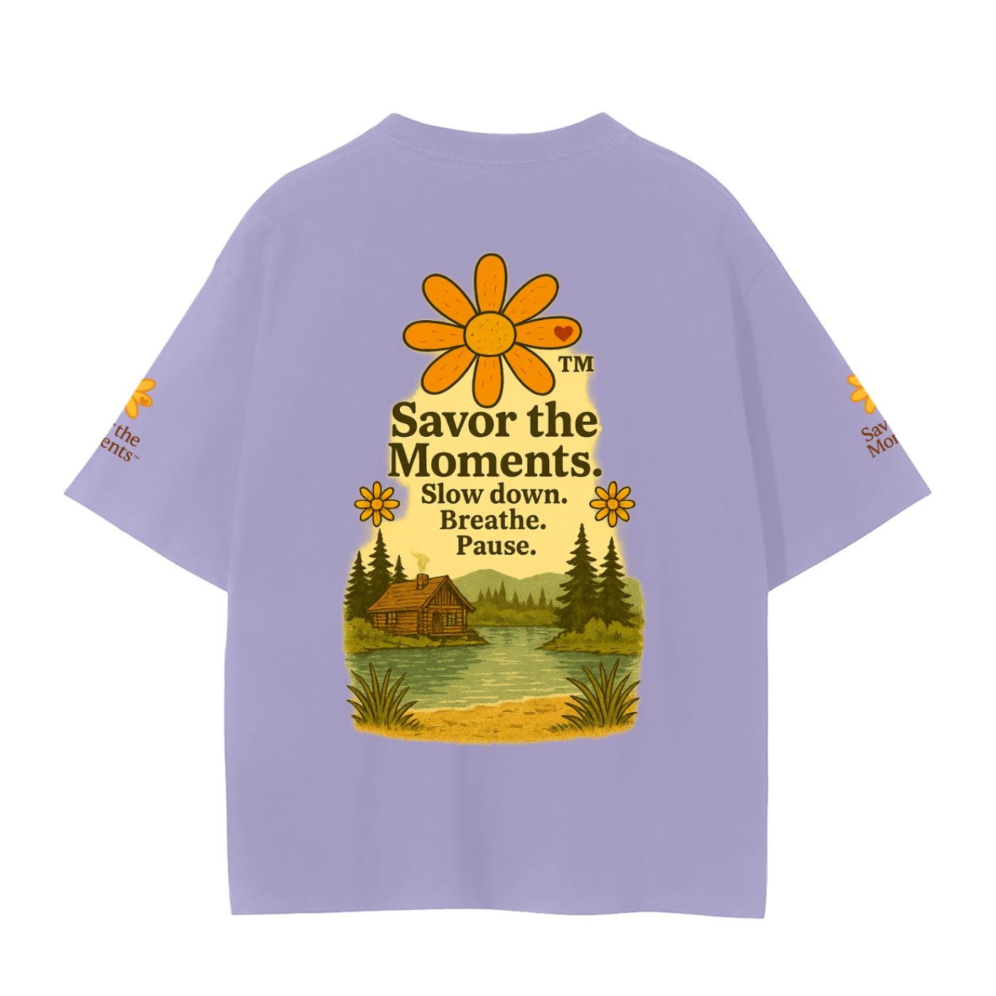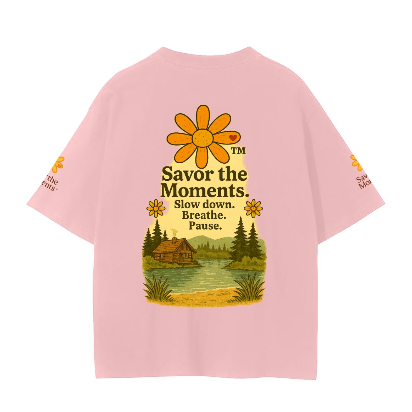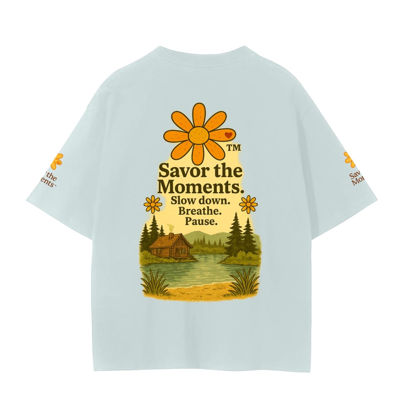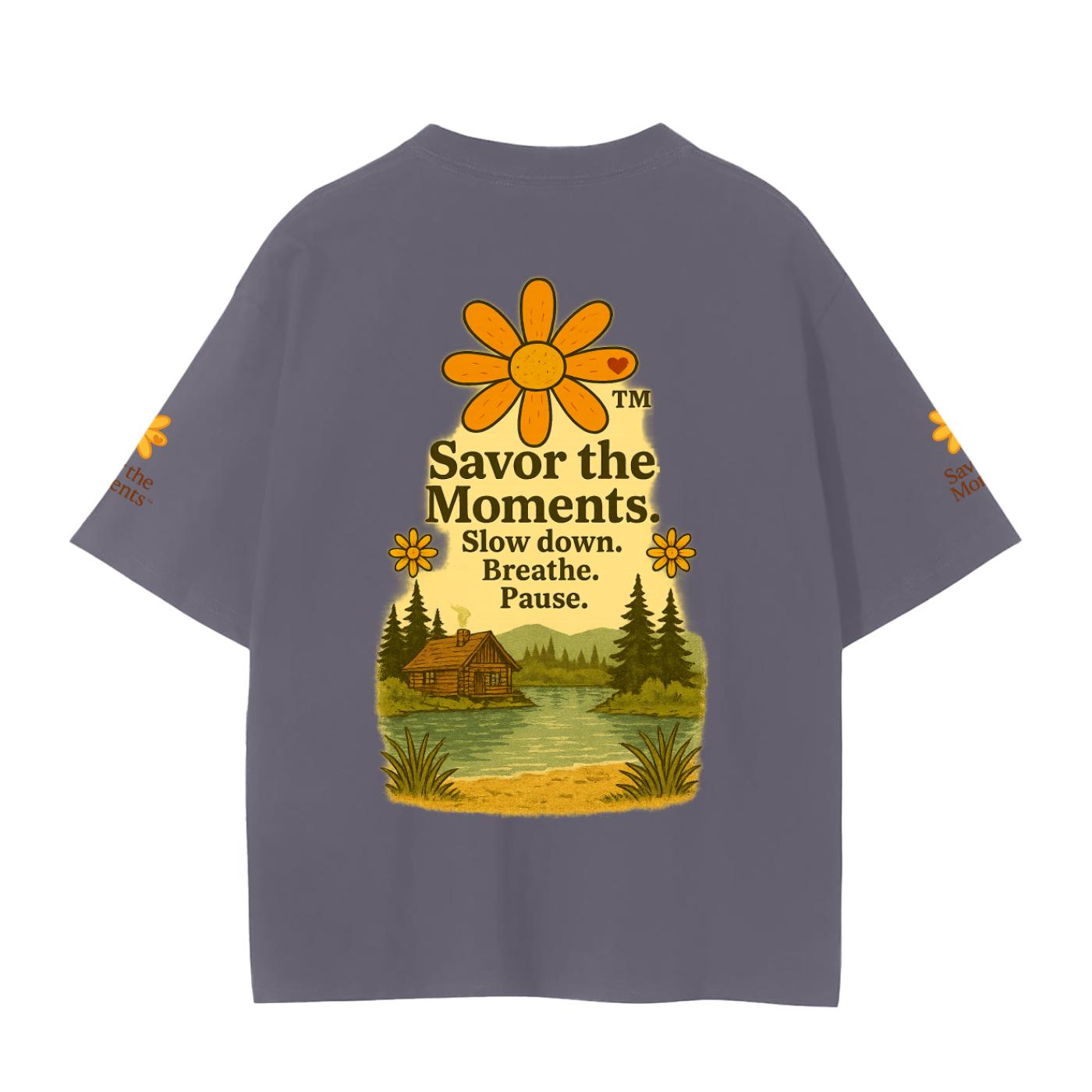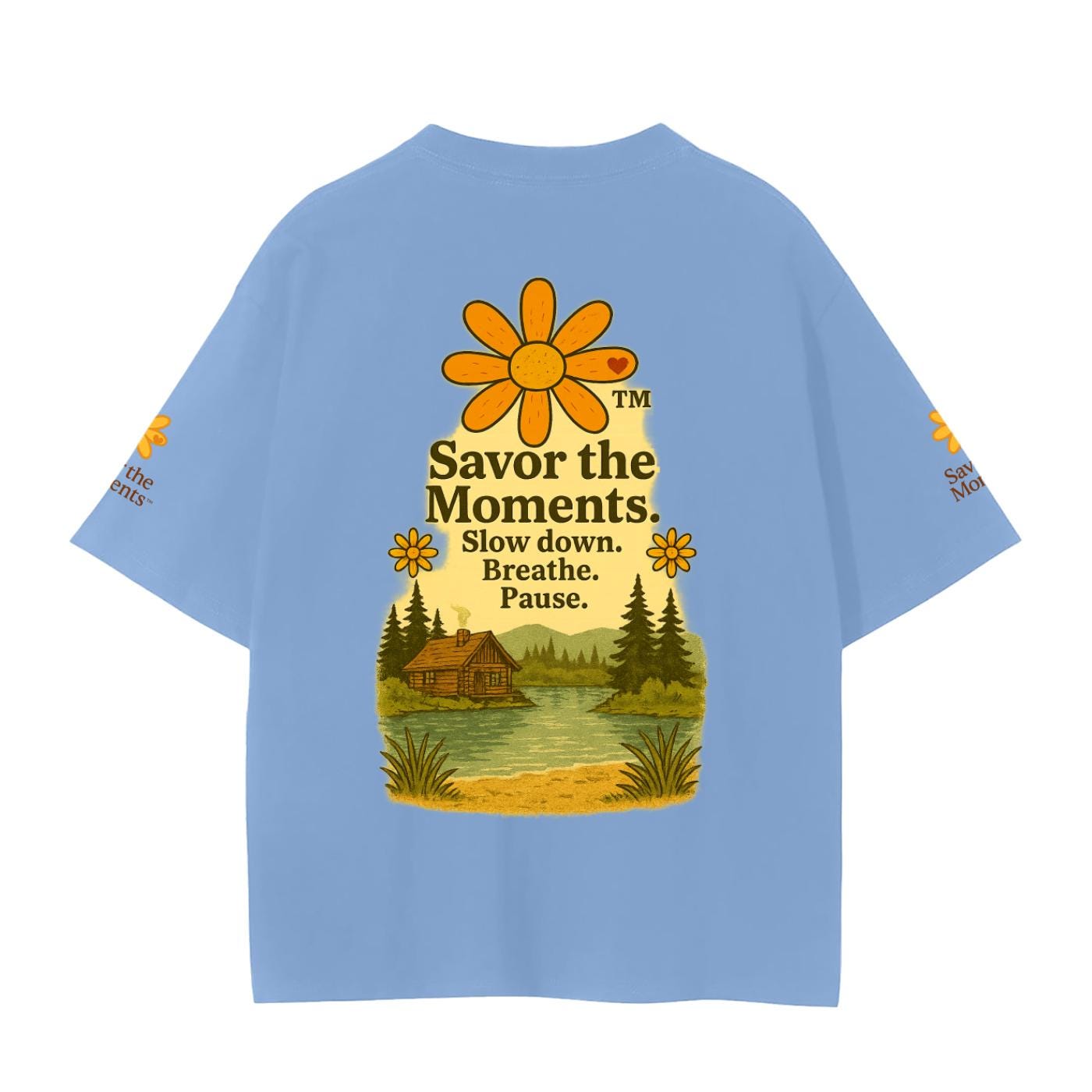 Nature Cabin & Lake Graphic Tee • Unisex Seamless Orange Daisy Shirt • Slow Down Breathe Pause Wellness Quote • Soft Mindful Savor the Moments™ Top