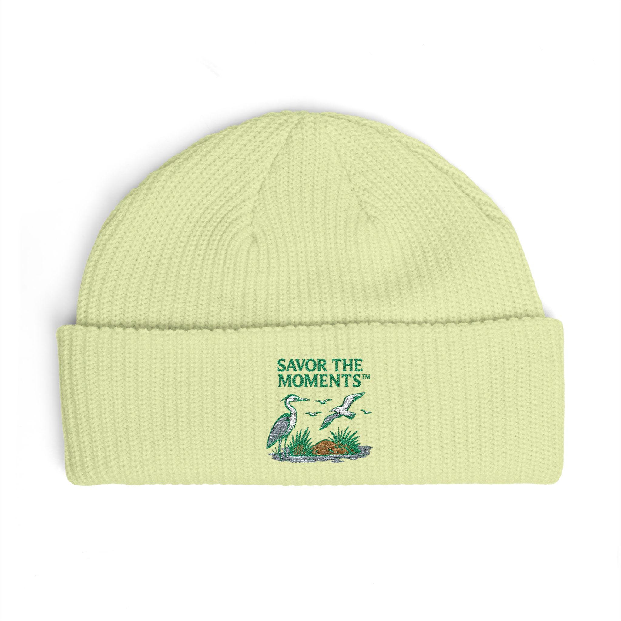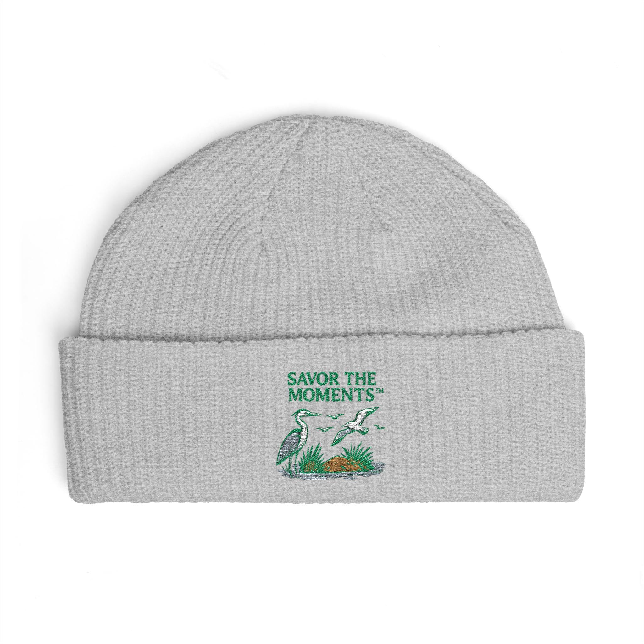 Coastal Bird Embroidery Cuff Beanie • Herons & Seagulls Nature Illustration • Savor the Moments™ Outdoor Floral Design • Cozy Coastal Wear. This cuff beanie brings slow, quiet mornings to your everyday wear. The wide ribbed knit and fisherman-style cuff fold down into a cozy silhouette that holds warmth without feeling bulky. A small, nature-inspired embroidered scene rests on the cuff — soft greens and warm earth tones that read like a micro-memo to pause and savor. Wear it on chilly commutes, foggy weekend hikes, or curled up with coffee; it settles into routines and adds a thoughtful, handcrafted touch to whatever you’re doing.