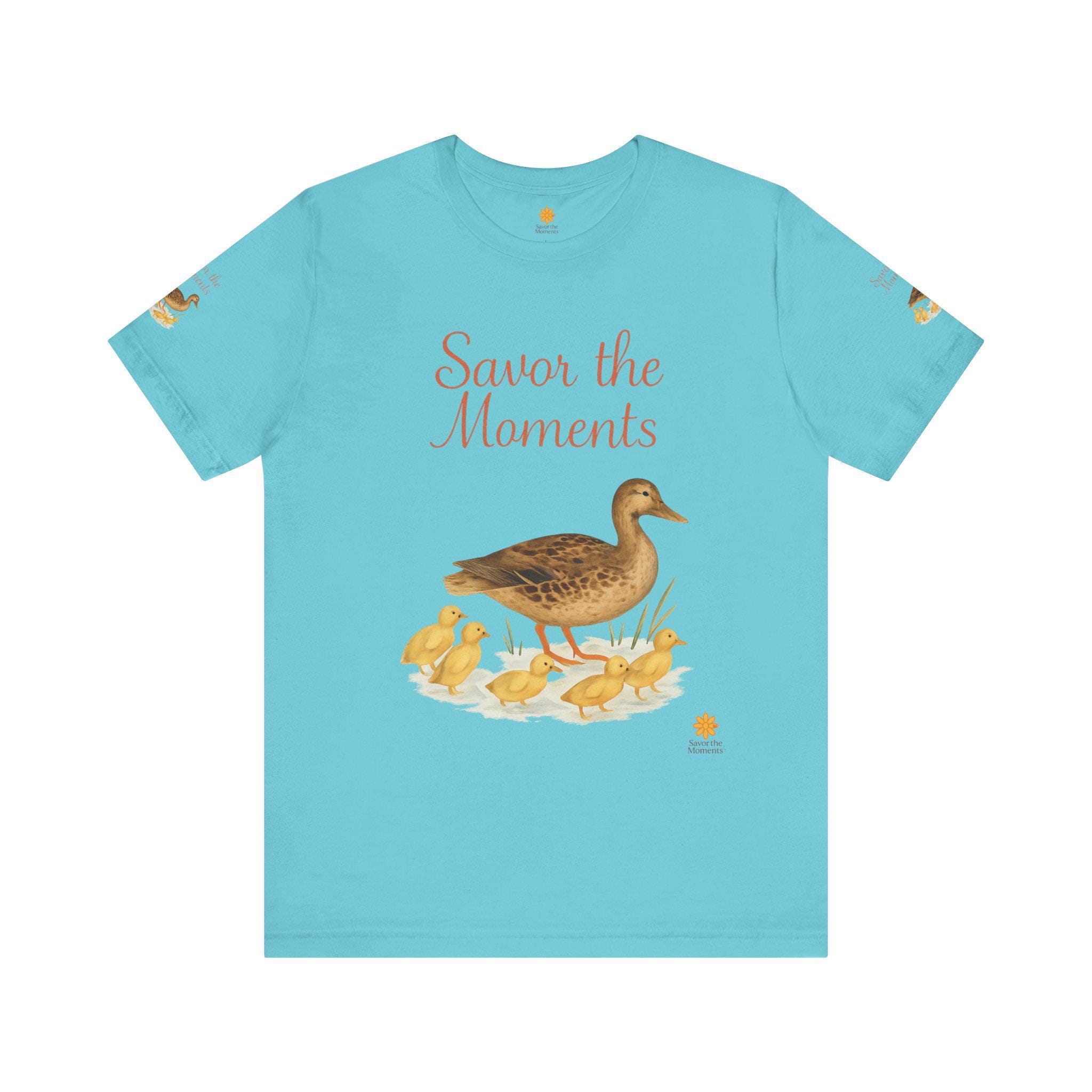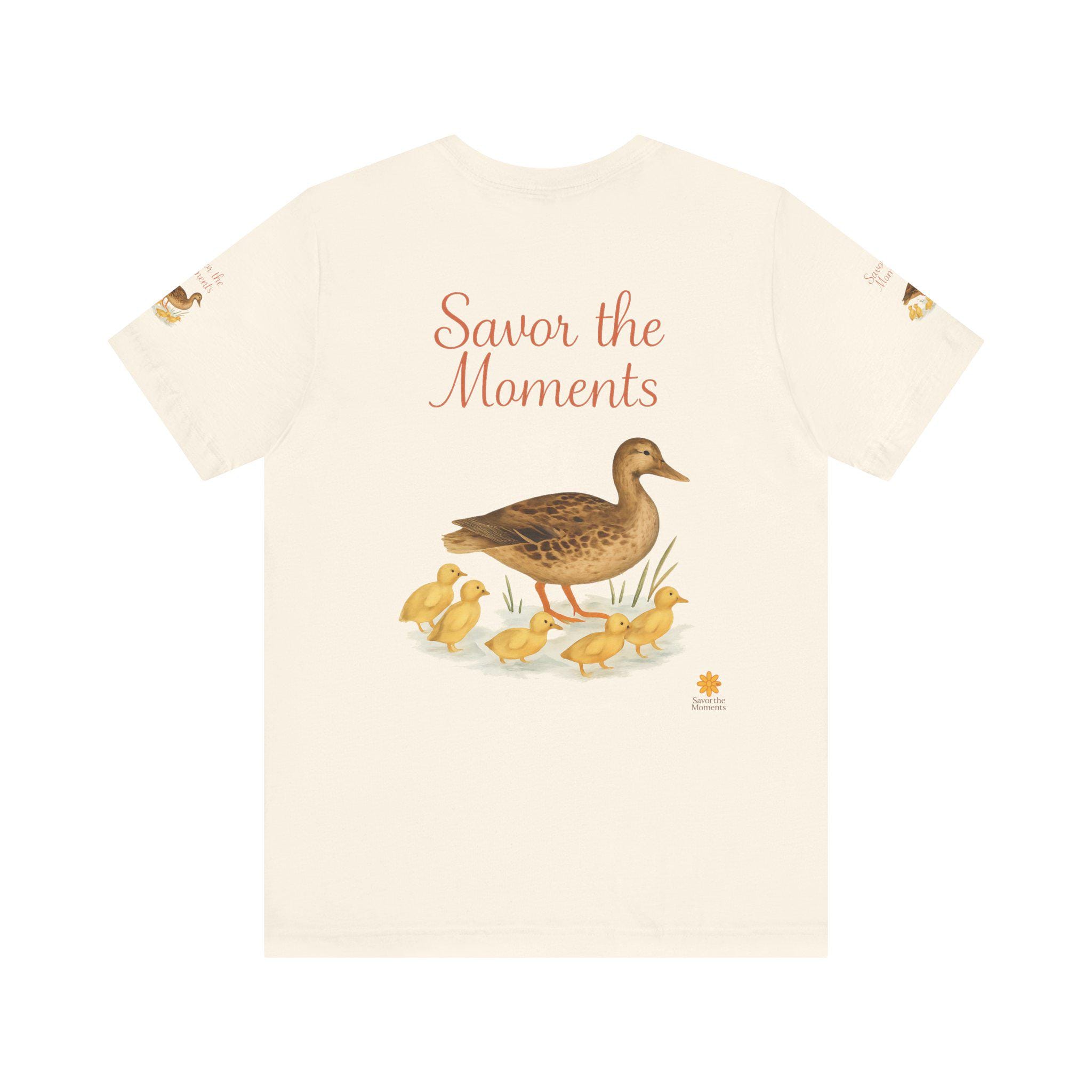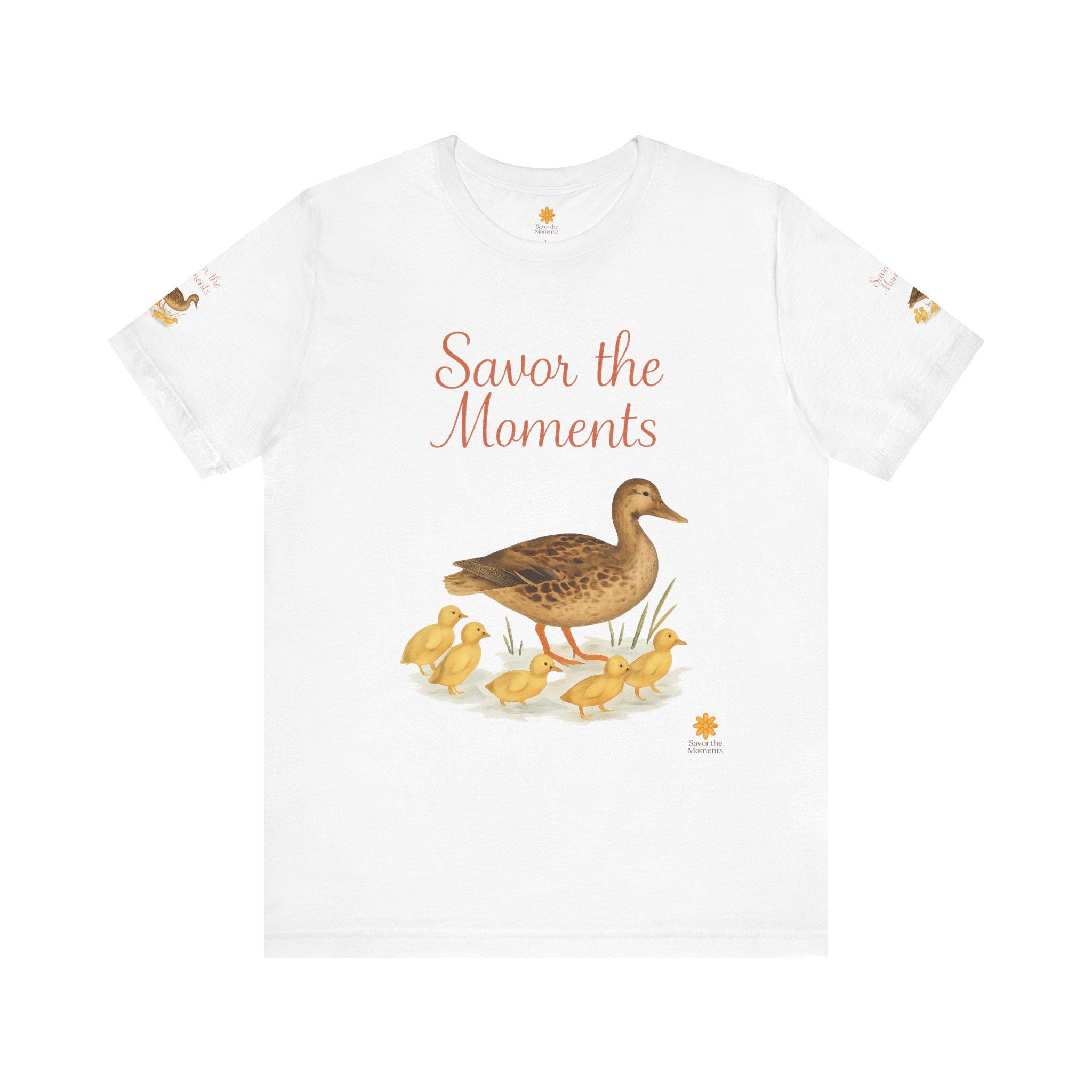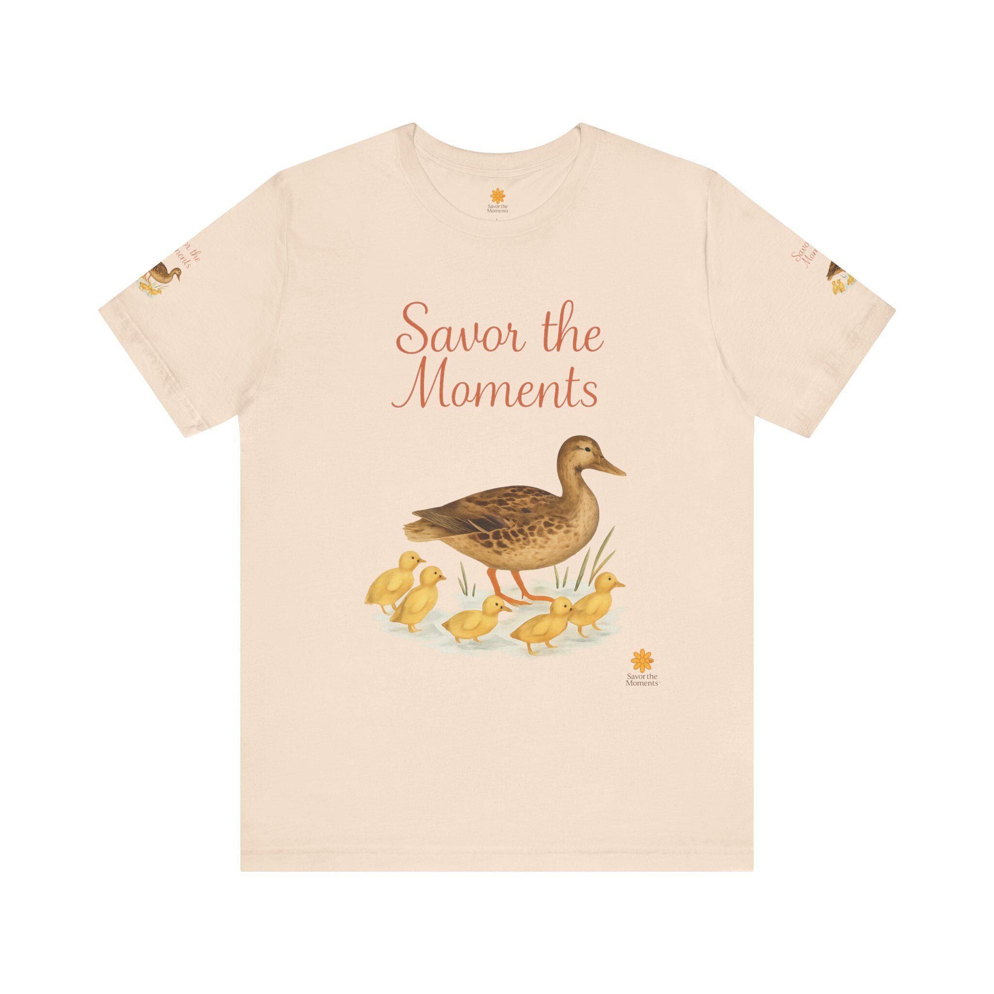 Nature‑Inspired Duck Family Tee • Savor the Moments™ Bird Graphic • Duck Mom with Ducklings Shirt • Pond Vibe Wildlife Family‑Themed Apparel. This lightweight jersey tee features a gentle, vintage-inspired duck illustration and the warm script message “Savor the Moments.” It settles softly against the skin and layers easily under a cardigan or over a tank. The breathable Airlume combed cotton keeps you comfortable on morning walks, at casual gatherings, or while curled up with tea and a book. Subtle printed details on each sleeve add a handcrafted touch that small-batch lovers will notice. Wear it when you want clothing that whispers calm, invites slow moments, and connects to simple, everyday joys.