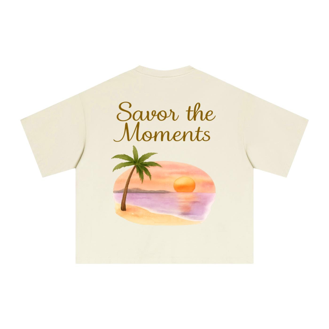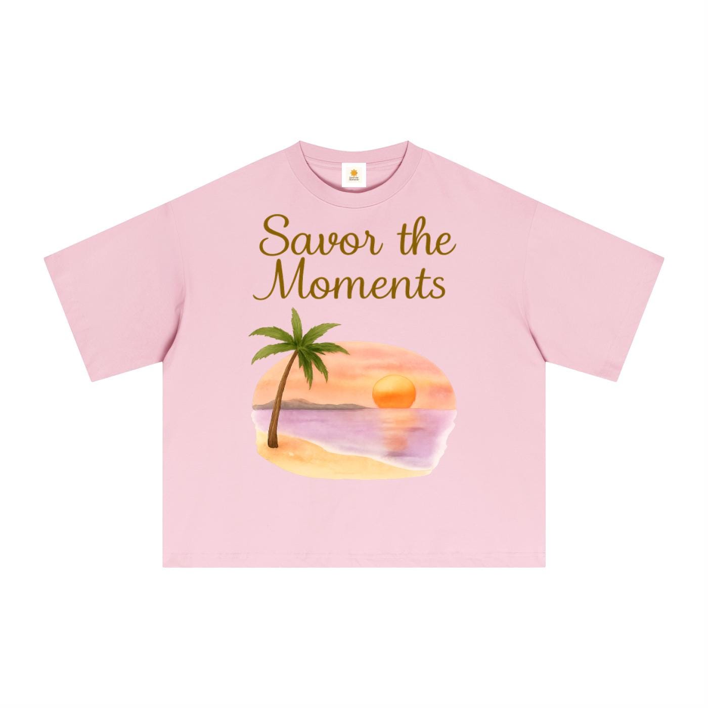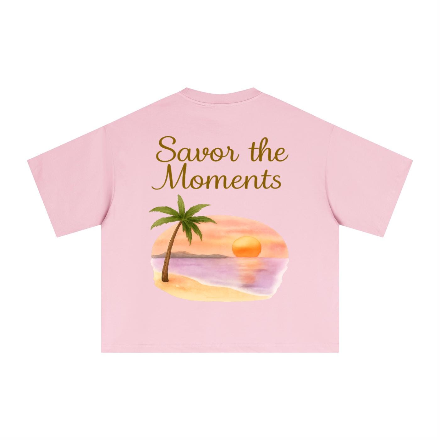 Essential Sorona boxy t‑shirt with beach style, palm trees, sunset colors, peaceful ocean vibe, and a soft tropical coastal feel.