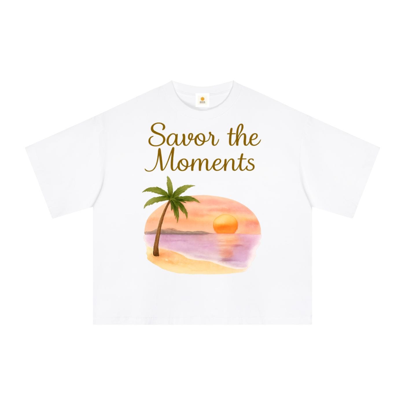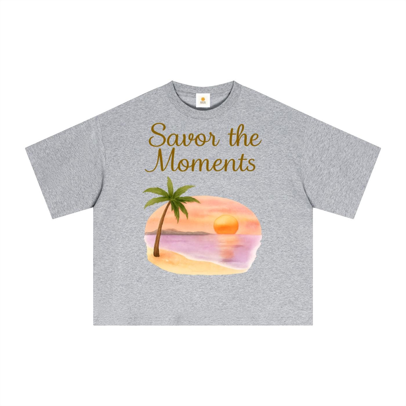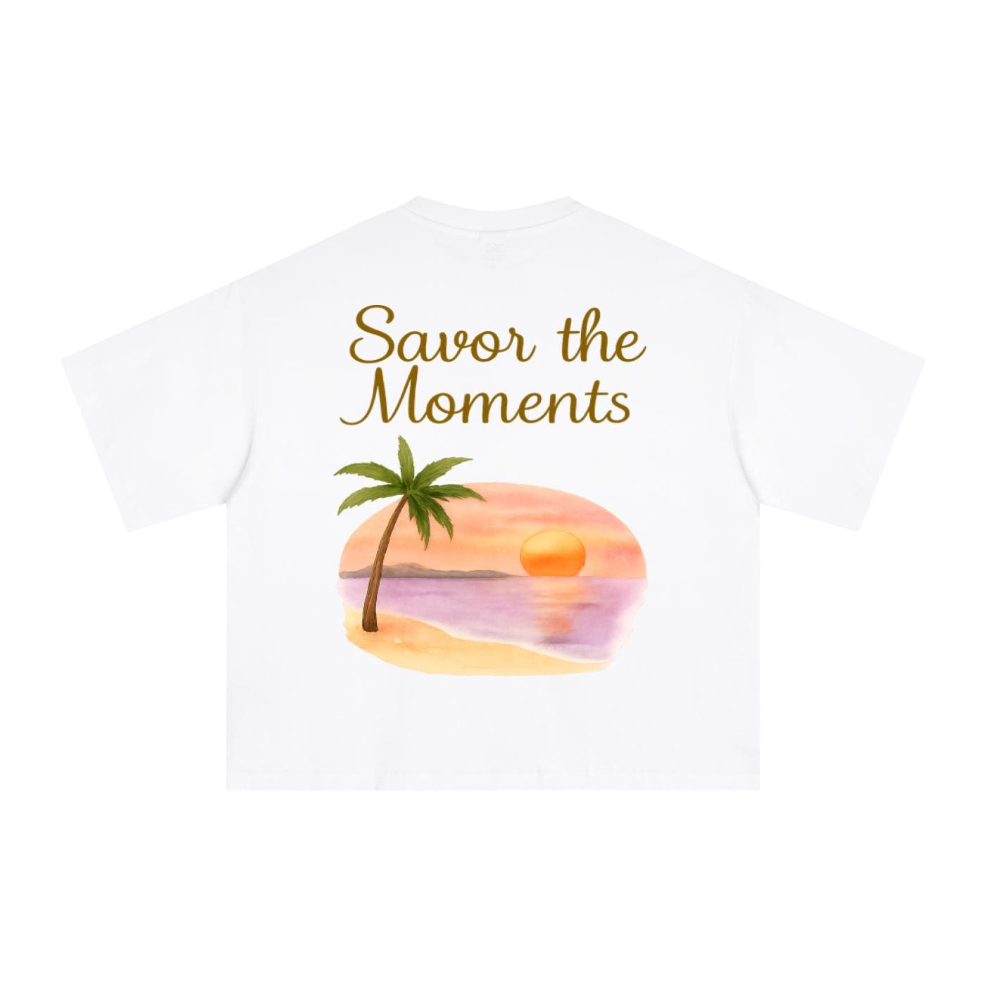 Essential Sorona boxy t‑shirt with beach style, palm trees, sunset colors, peaceful ocean vibe, and a soft tropical coastal feel.