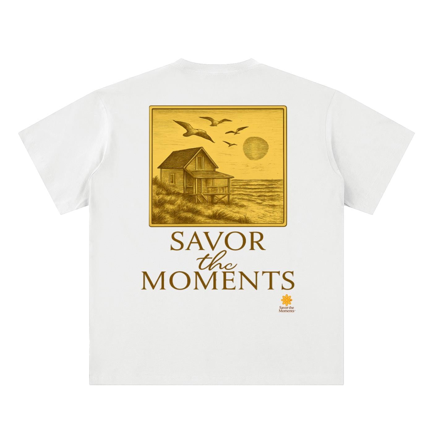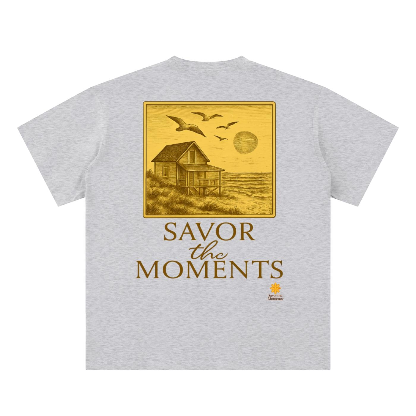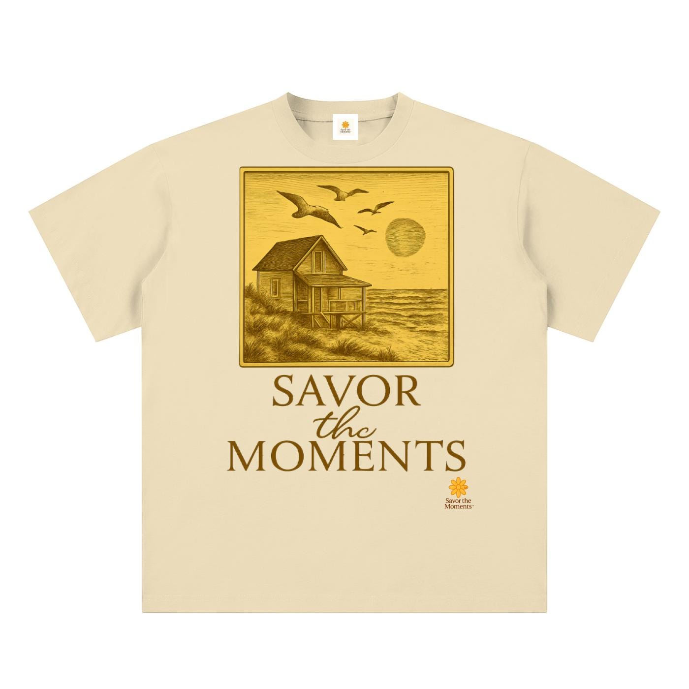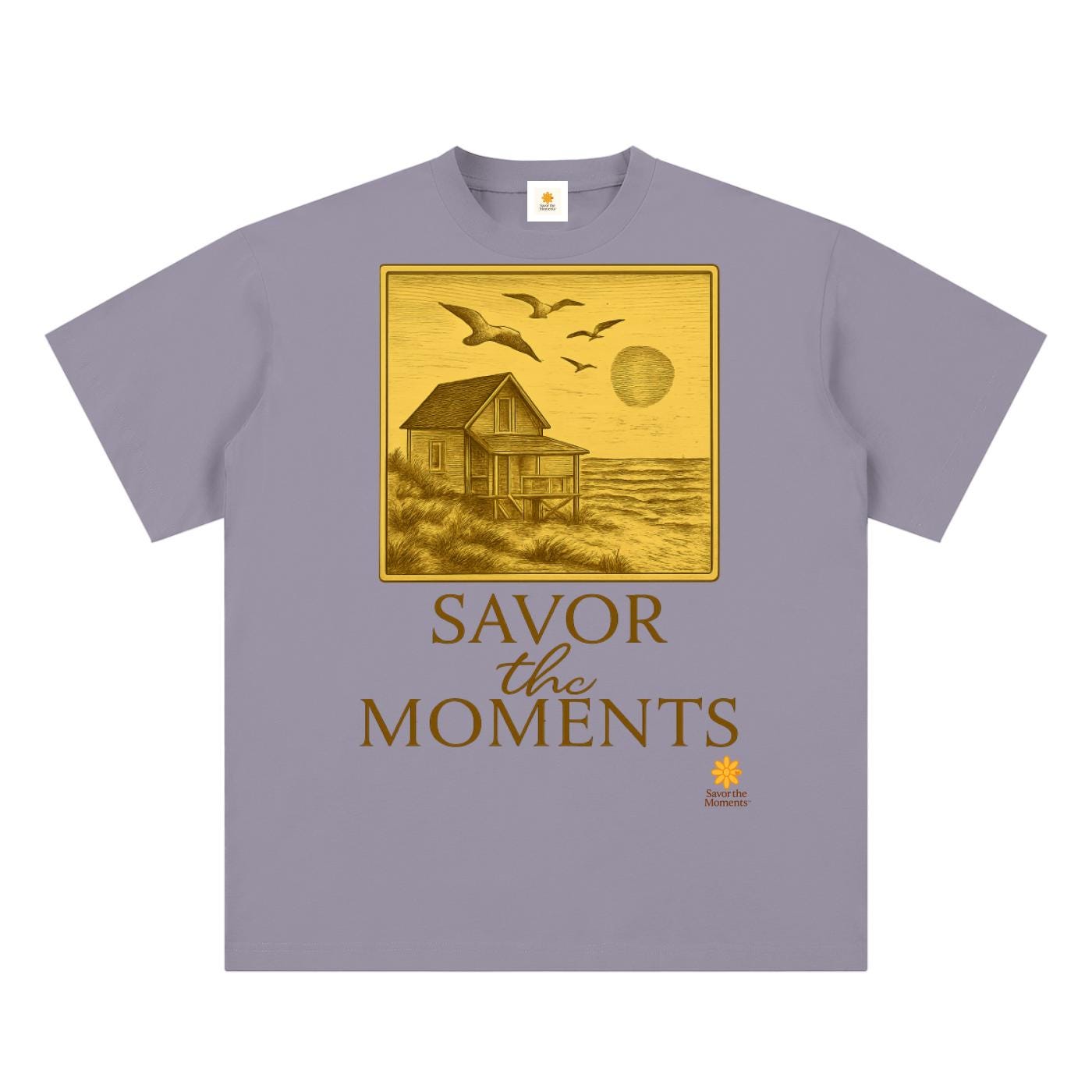 Unisex sueded cotton t‑shirt, a peaceful coastal vibe, inspired by ocean breezes, seagulls, soft sunset colors. Savor the Moments TM