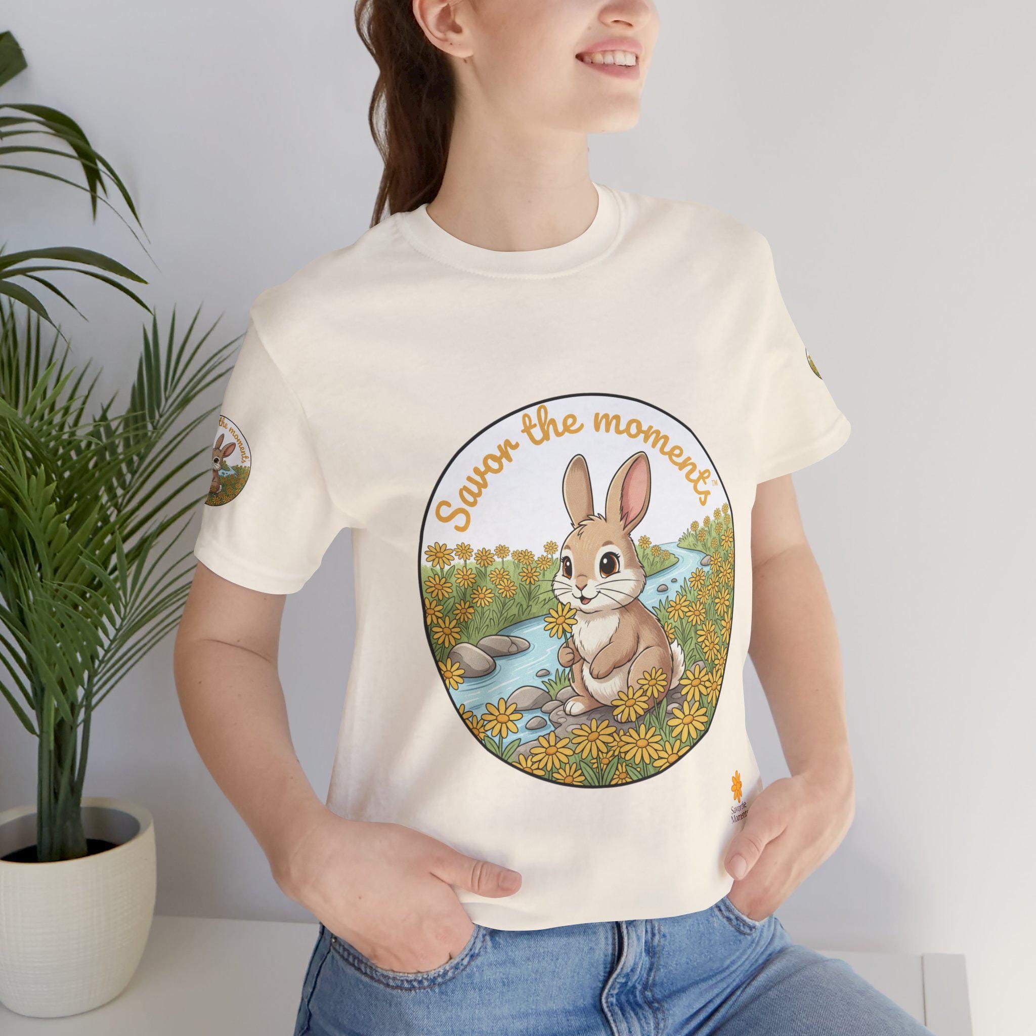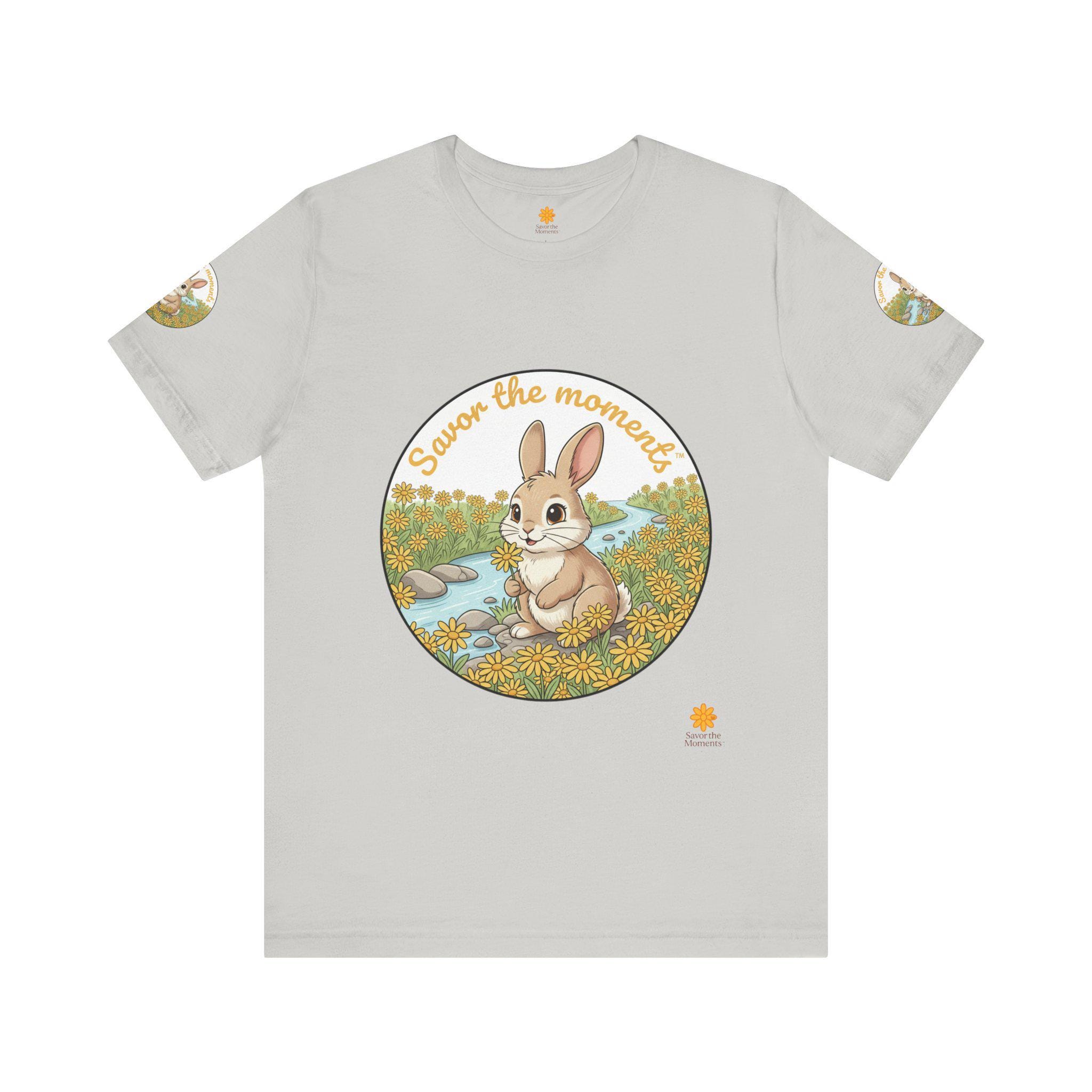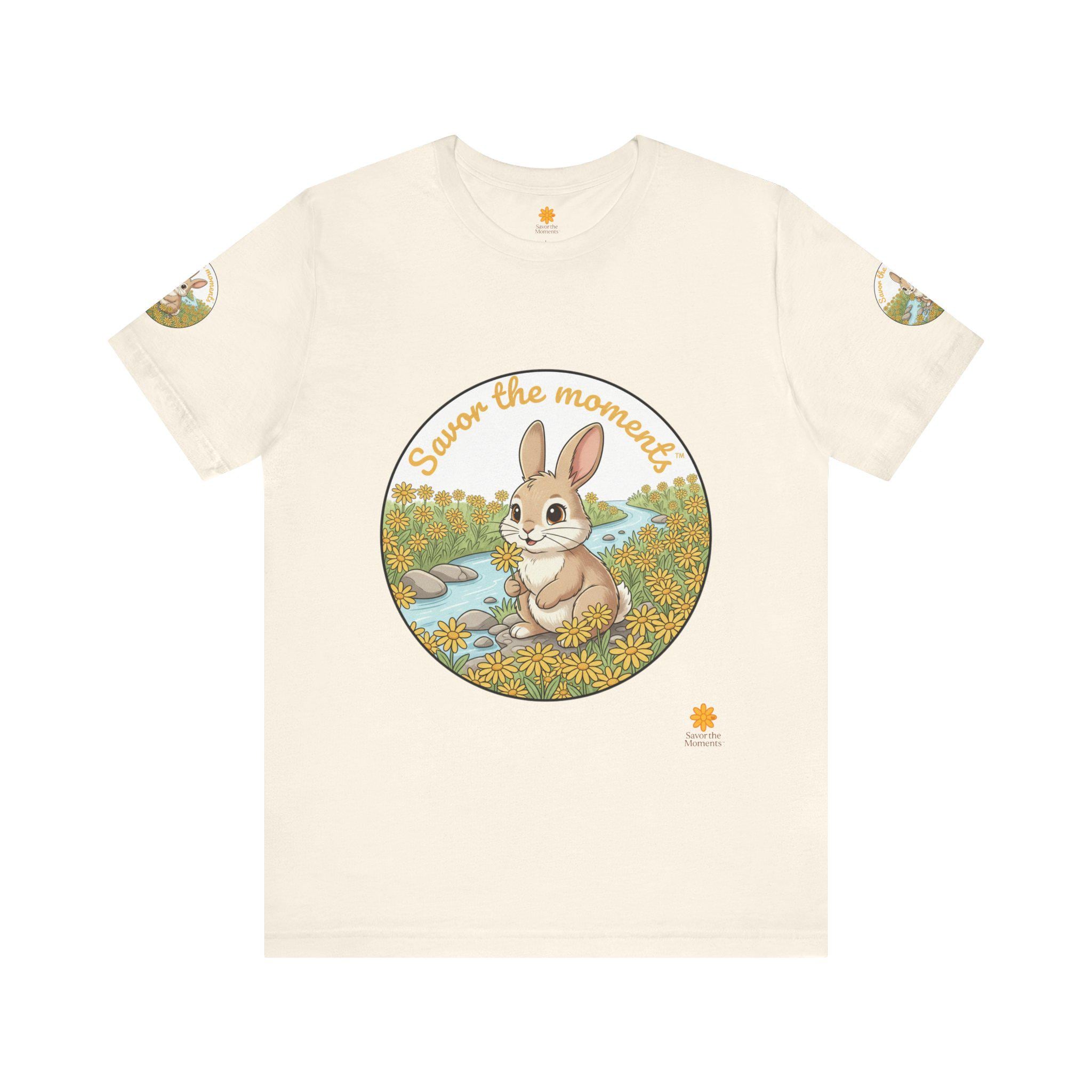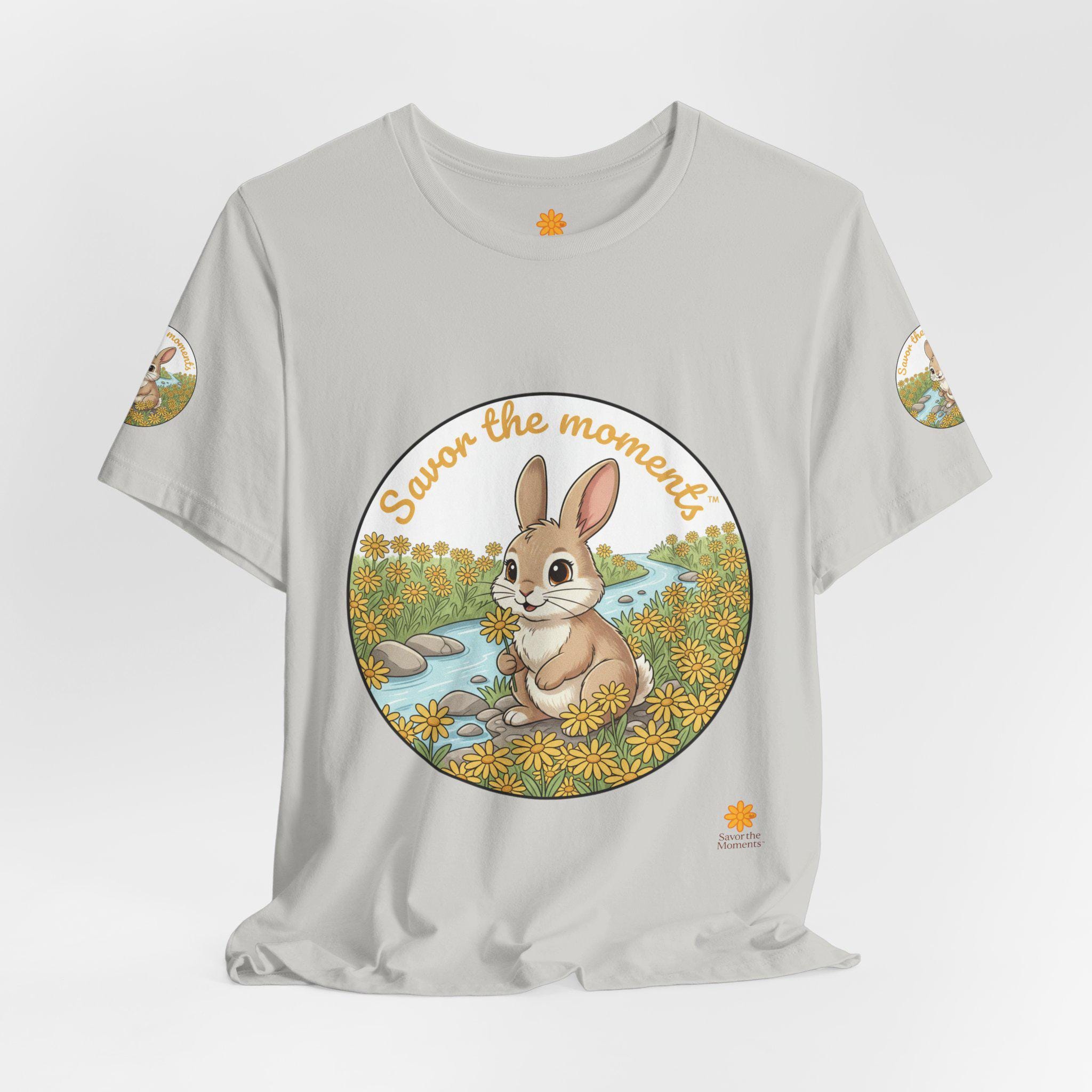 Savor the Moment Bunny tee | Rabbit Meadow Illustration T-Shirt, Easter, Floral, daisies, nature, gift, holiday, Catoon, meadow, woodland. Soft, breathable tee printed with a gentle springtime scene: a wide-eyed bunny sitting beside a stream, framed by daisies and the warm script, “Savor the moments.” The shirt feels light and airy against the skin, with a classic crew neckline and subtle sleeve emblems that echo the main illustration. Wear it for slow mornings, park visits, or whenever you want a quiet reminder to pause and enjoy small joys. Ethically produced and tear-away labeled for comfort, this shirt layers easily under a cardigan or pairs with jeans for an easy, calm look.