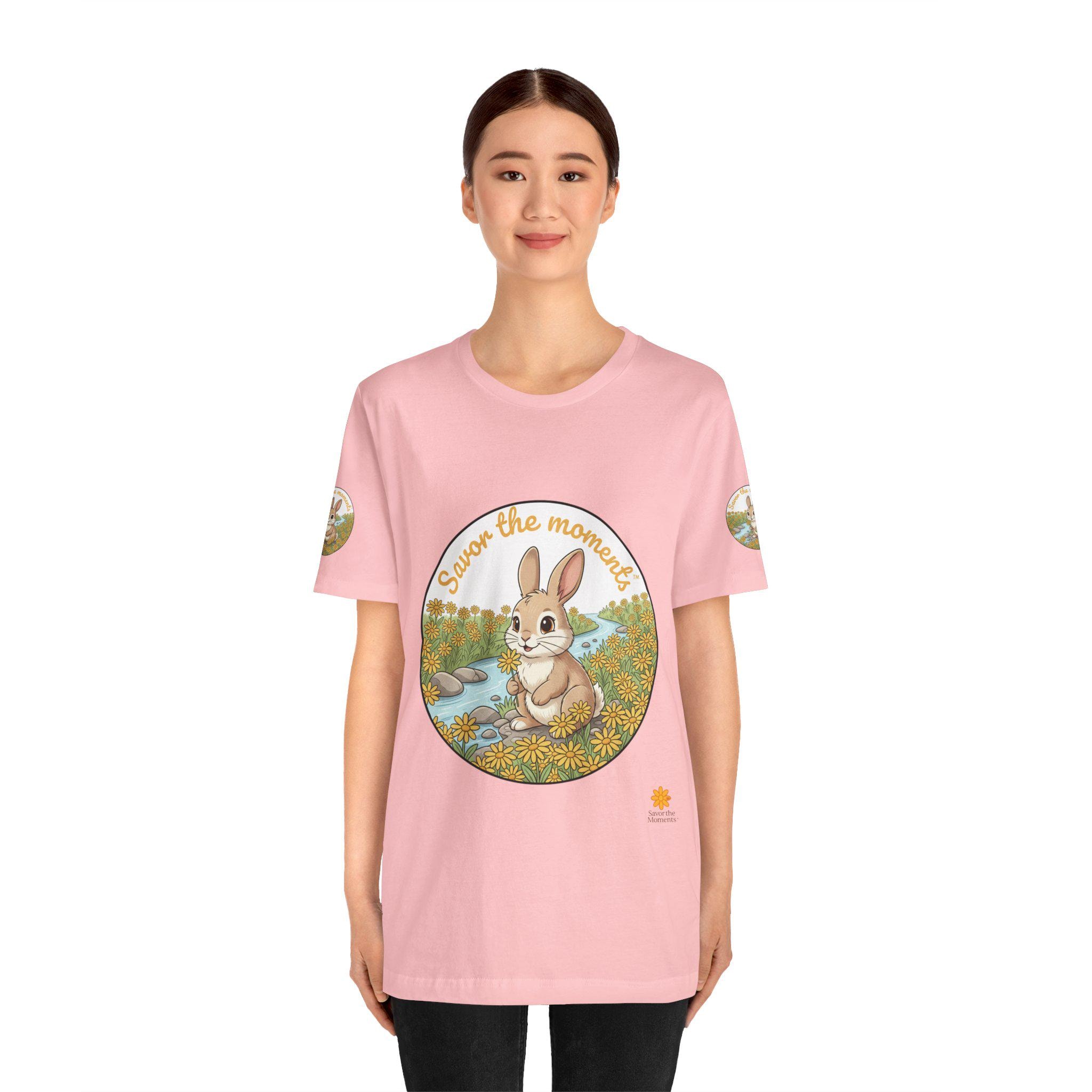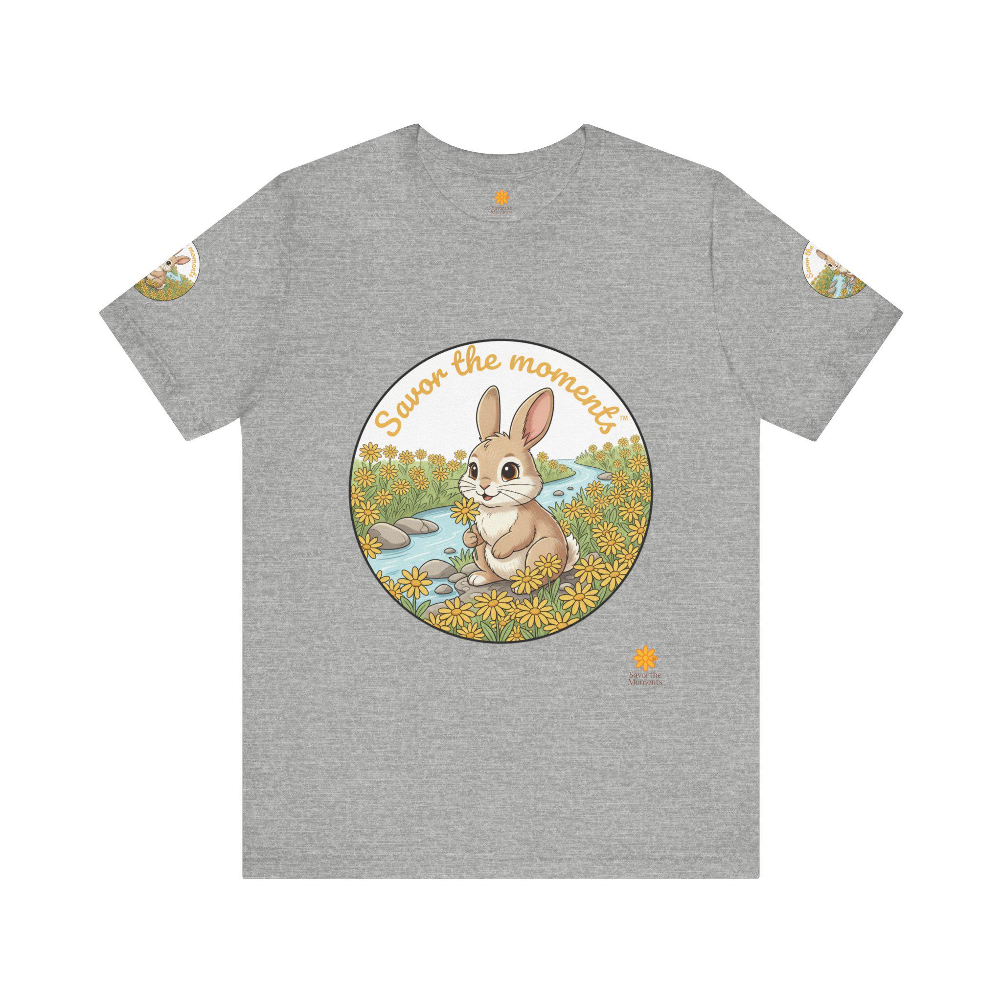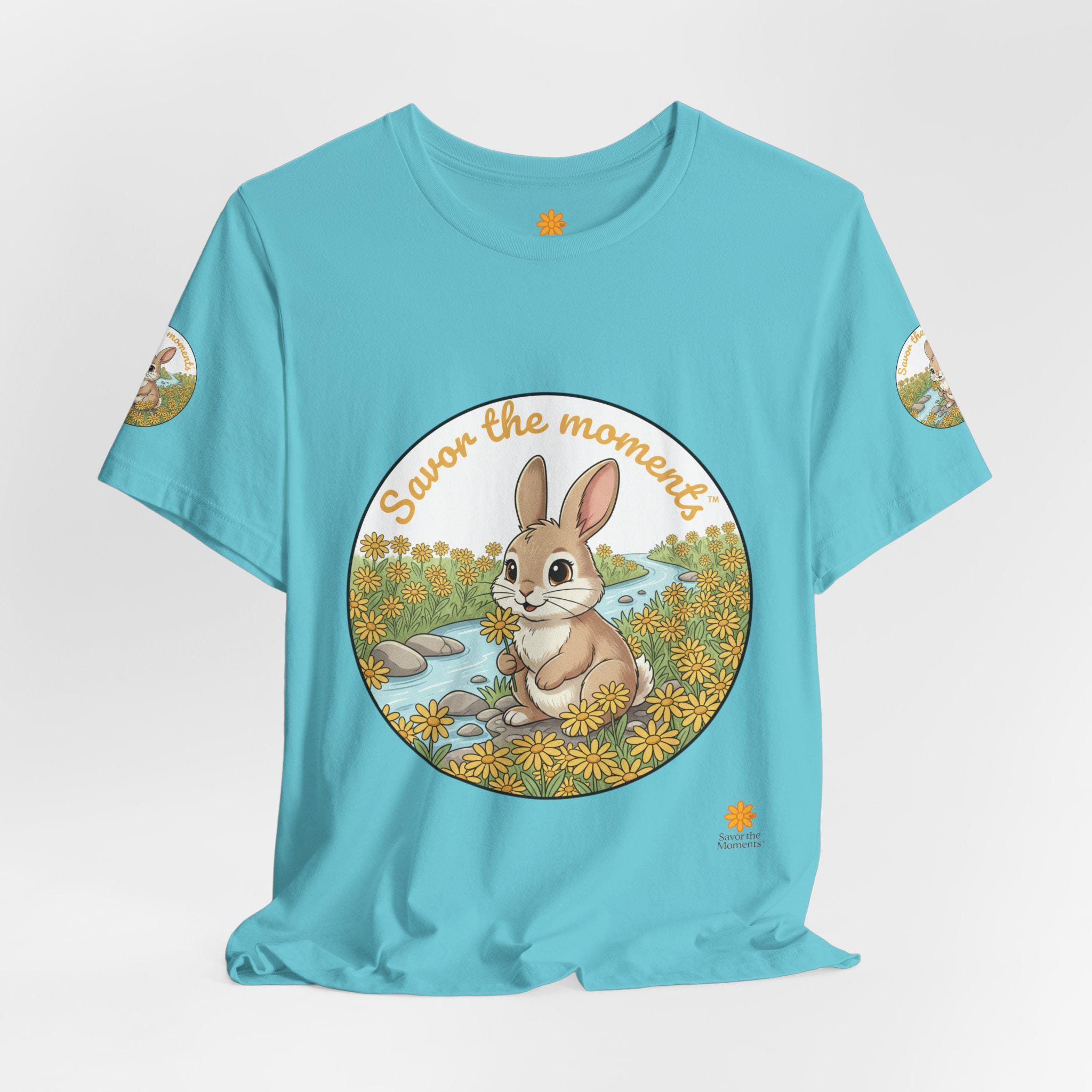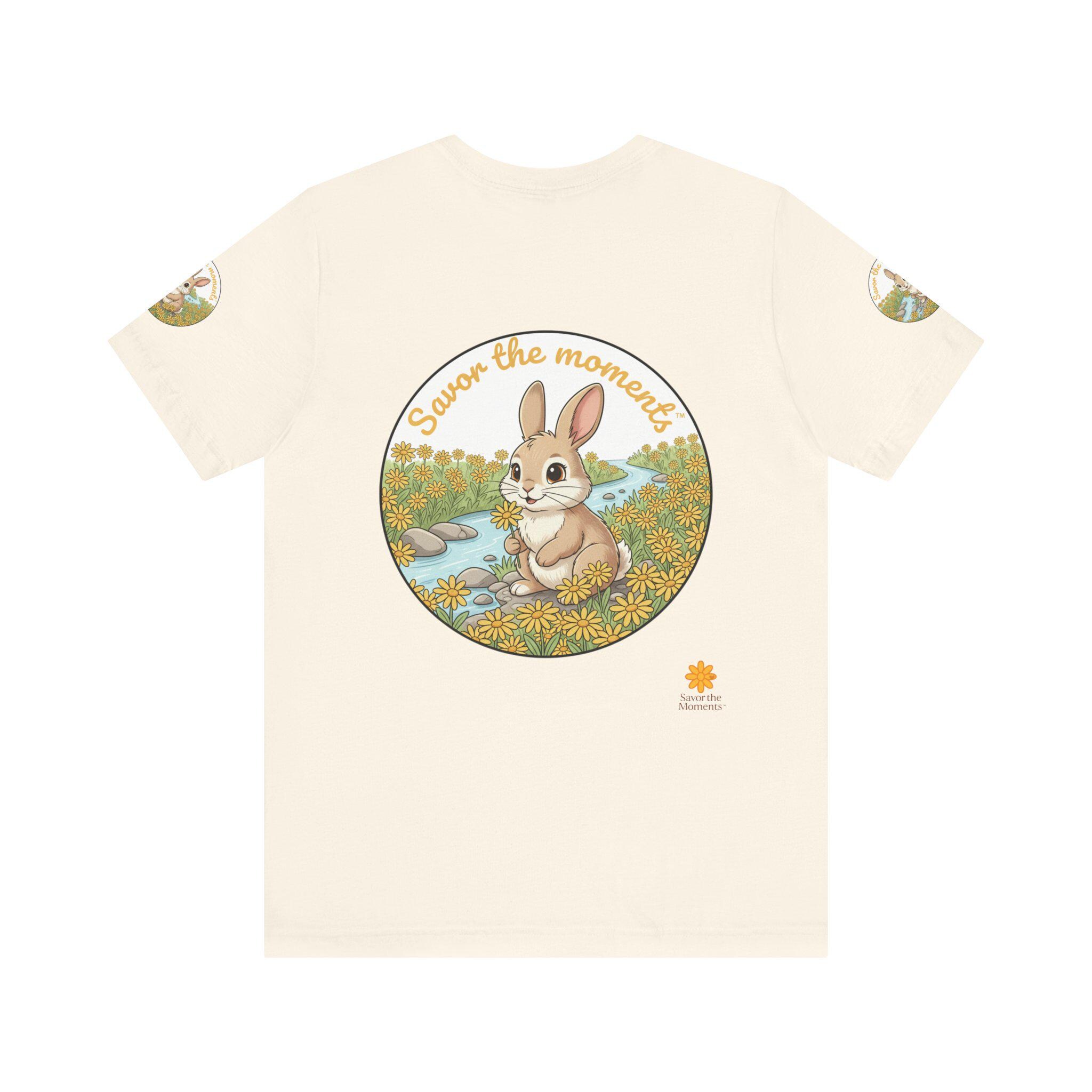 Savor the Moment Bunny tee | Rabbit Meadow Illustration T-Shirt, Easter, Floral, daisies, nature, gift, holiday, Catoon, meadow, woodland. Soft, breathable tee printed with a gentle springtime scene: a wide-eyed bunny sitting beside a stream, framed by daisies and the warm script, “Savor the moments.” The shirt feels light and airy against the skin, with a classic crew neckline and subtle sleeve emblems that echo the main illustration. Wear it for slow mornings, park visits, or whenever you want a quiet reminder to pause and enjoy small joys. Ethically produced and tear-away labeled for comfort, this shirt layers easily under a cardigan or pairs with jeans for an easy, calm look.
