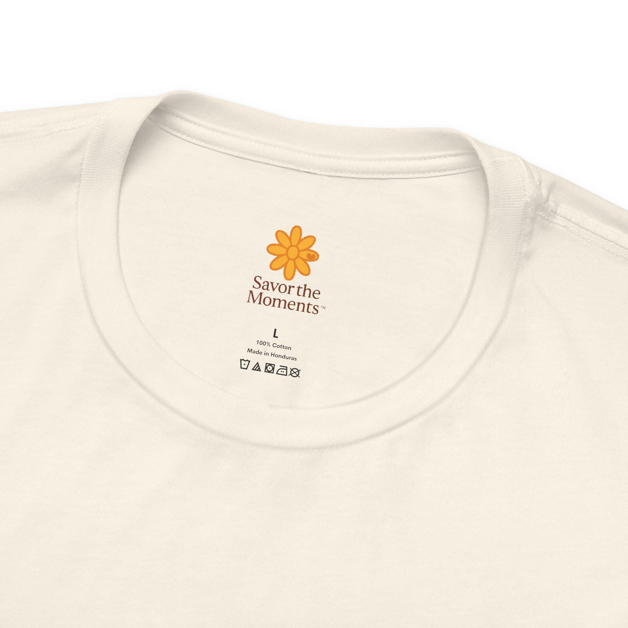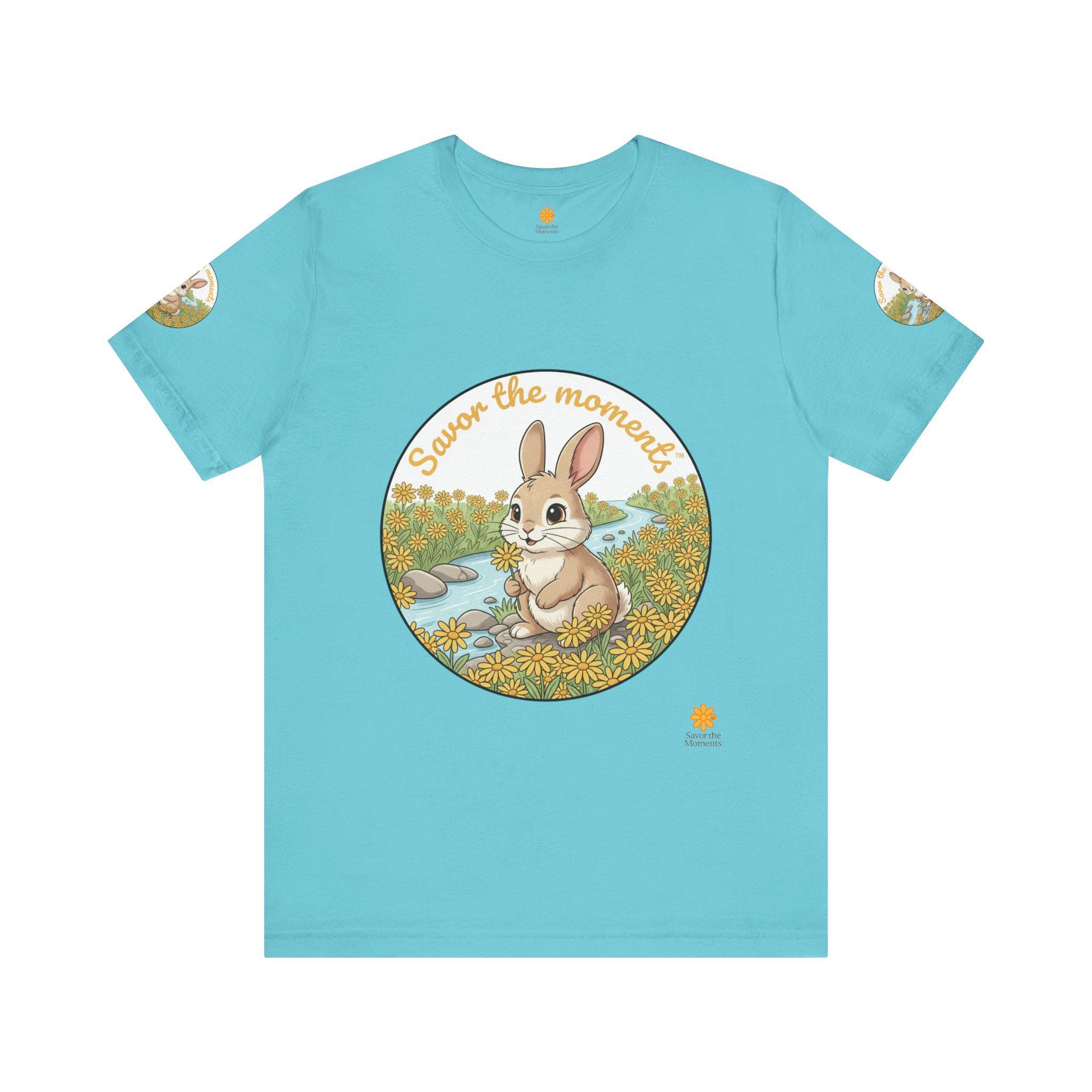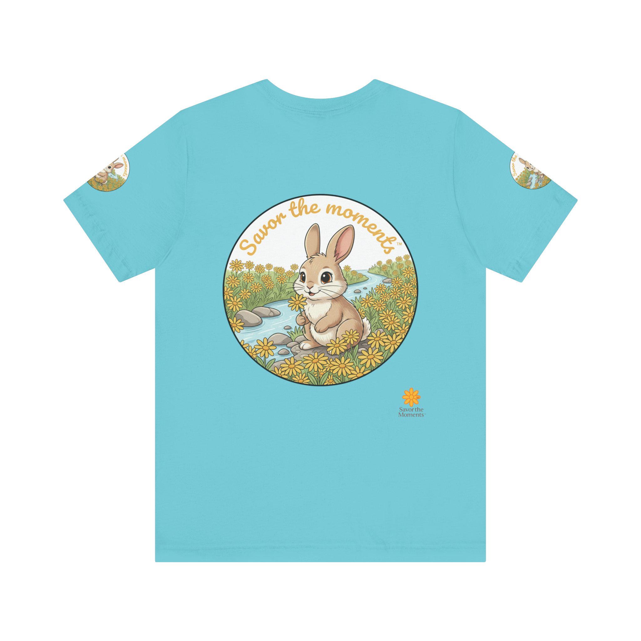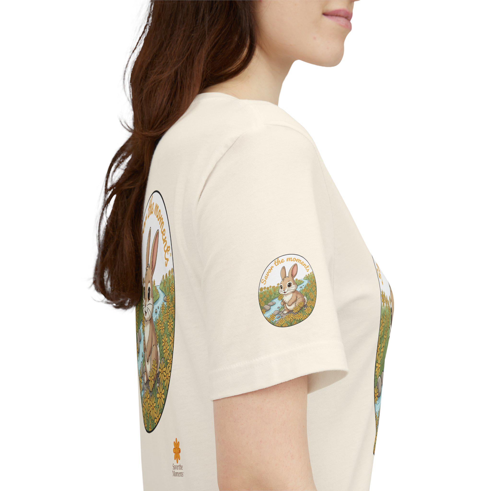 Savor the Moment Bunny tee | Rabbit Meadow Illustration T-Shirt, Easter, Floral, daisies, nature, gift, holiday, Catoon, meadow, woodland. Soft, breathable tee printed with a gentle springtime scene: a wide-eyed bunny sitting beside a stream, framed by daisies and the warm script, “Savor the moments.” The shirt feels light and airy against the skin, with a classic crew neckline and subtle sleeve emblems that echo the main illustration. Wear it for slow mornings, park visits, or whenever you want a quiet reminder to pause and enjoy small joys. Ethically produced and tear-away labeled for comfort, this shirt layers easily under a cardigan or pairs with jeans for an easy, calm look.