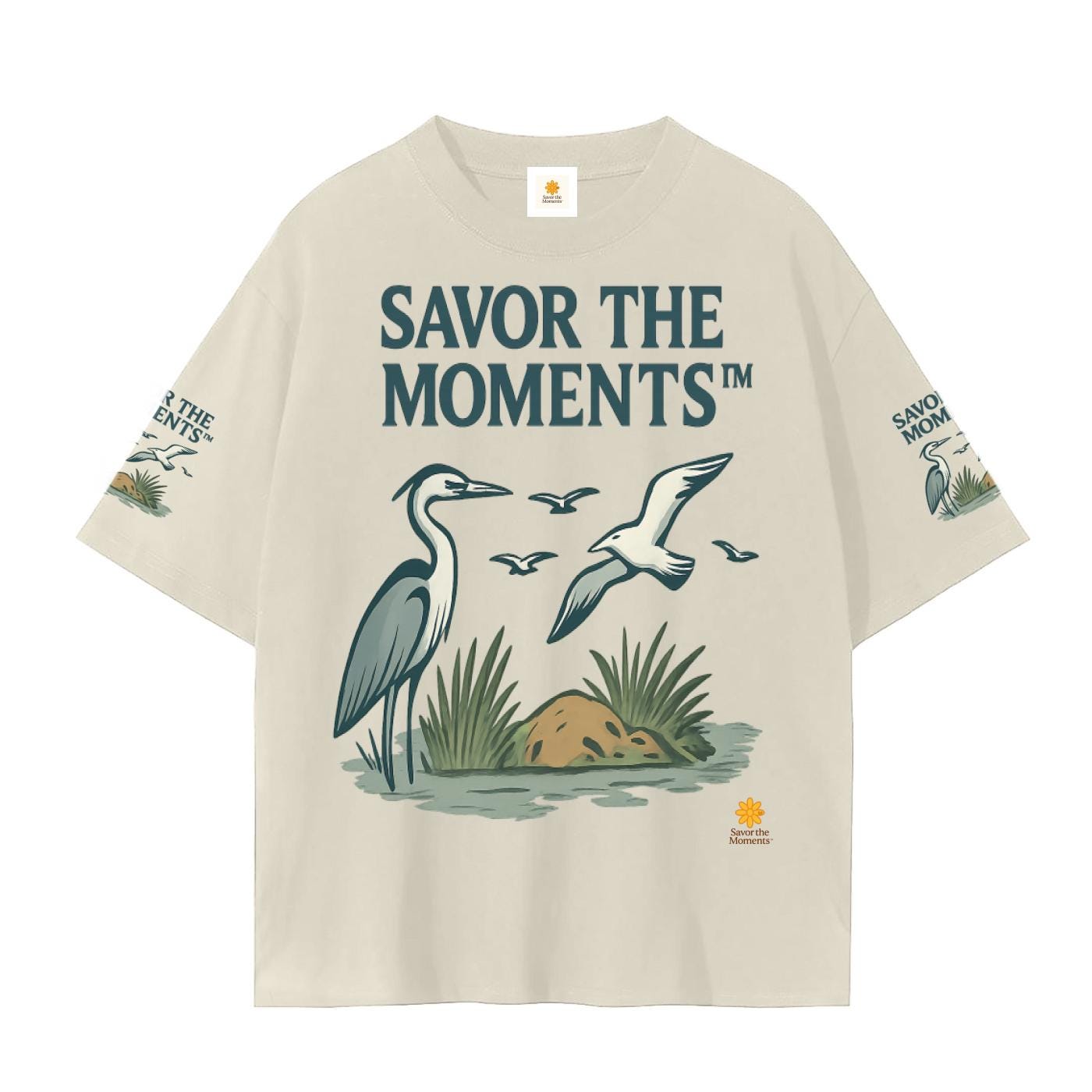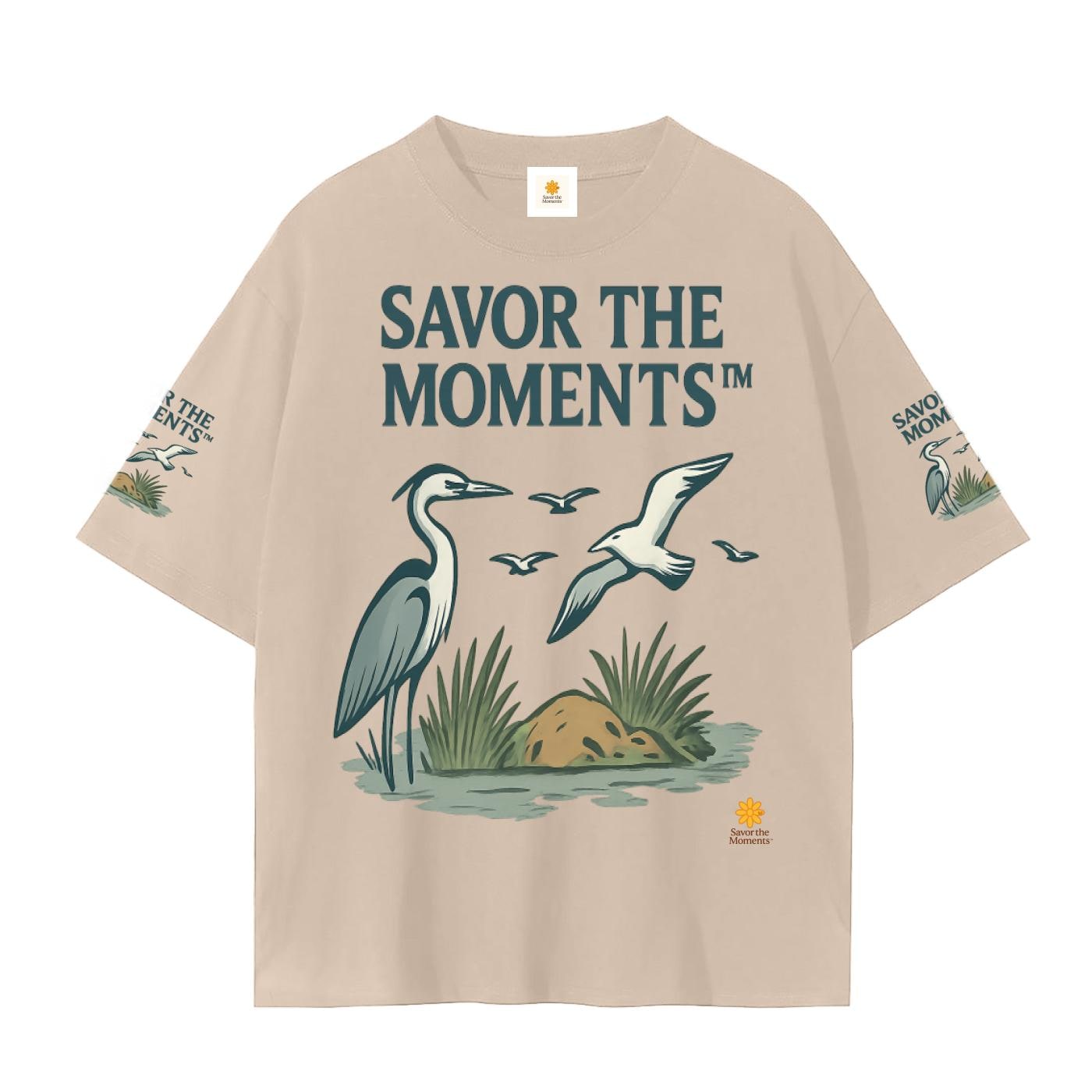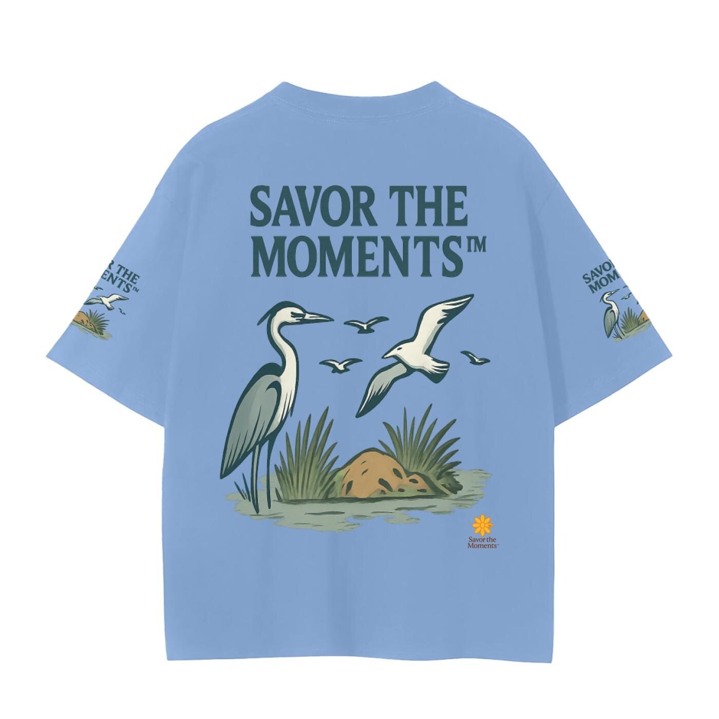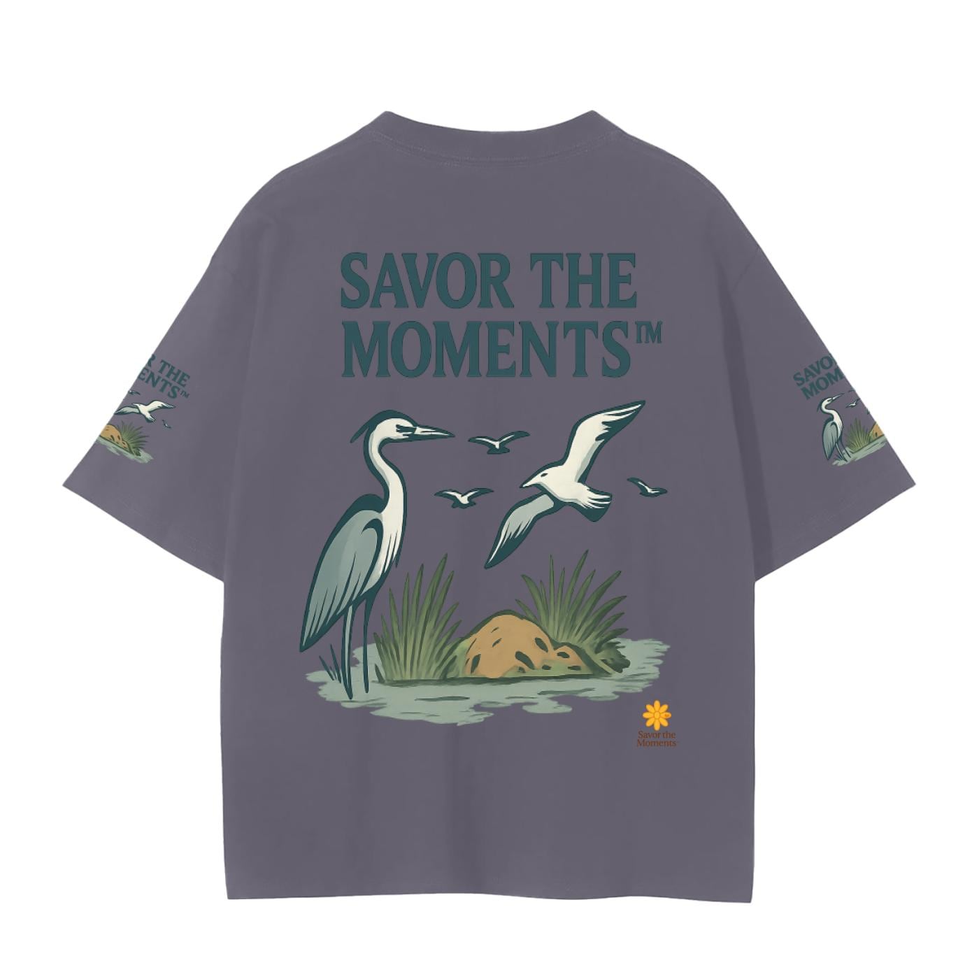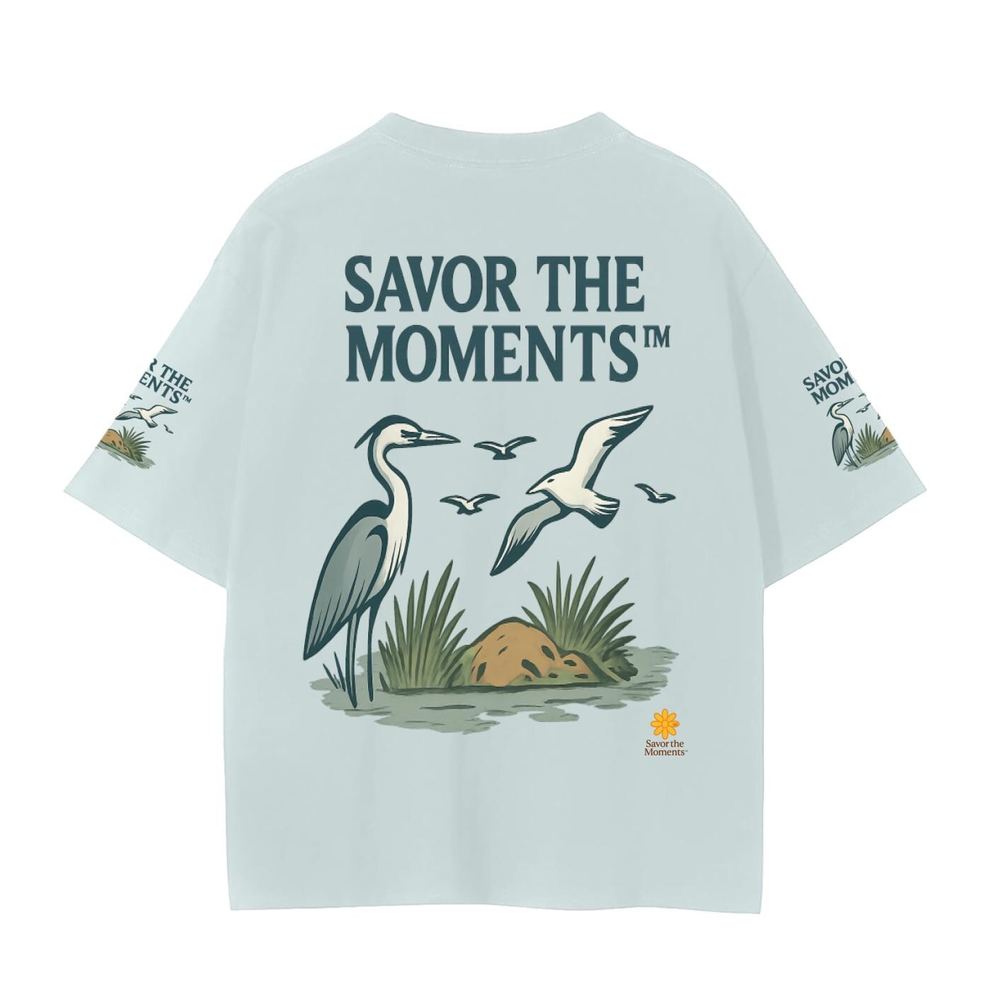 Coastal vibe Unisex Seamless T‑Shirt featuring heron Graphic, sea oats, and marsh birds, relaxed beach‑inspired summer gift for nature lovers.