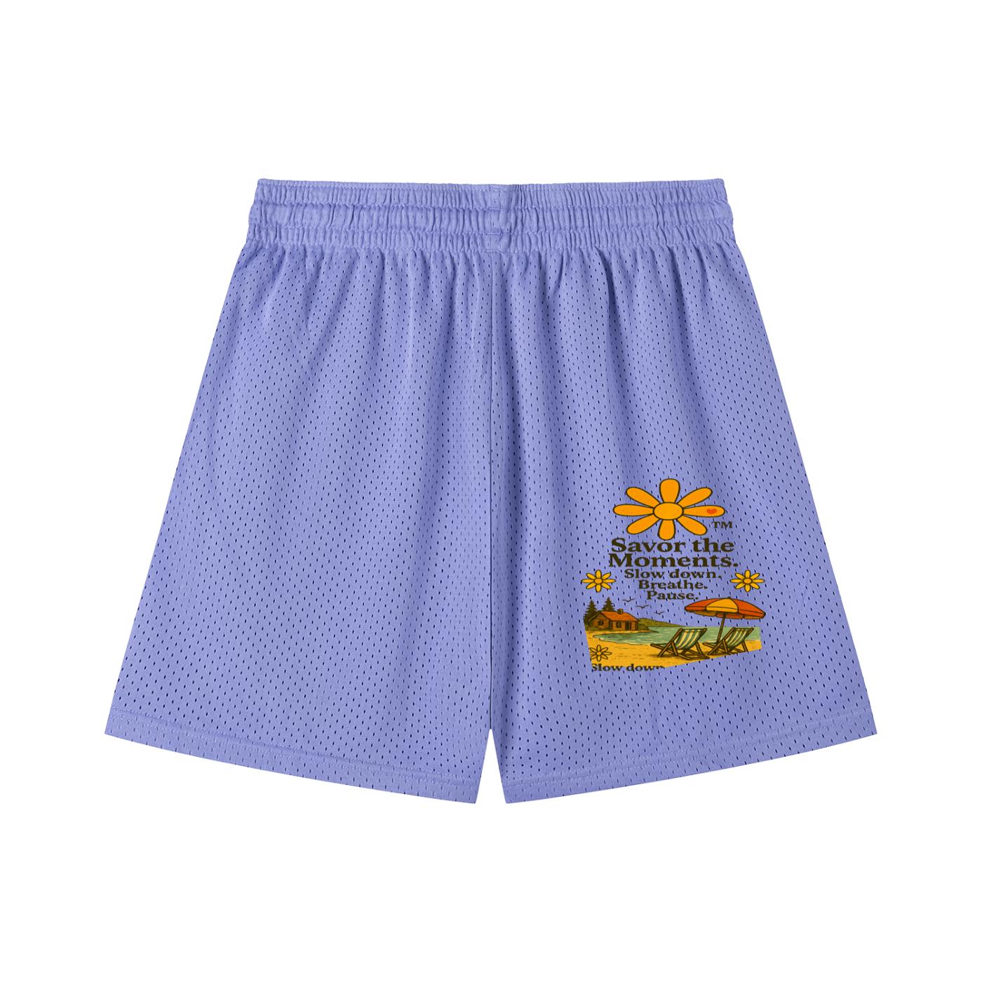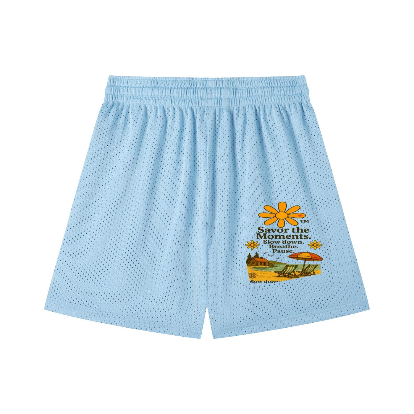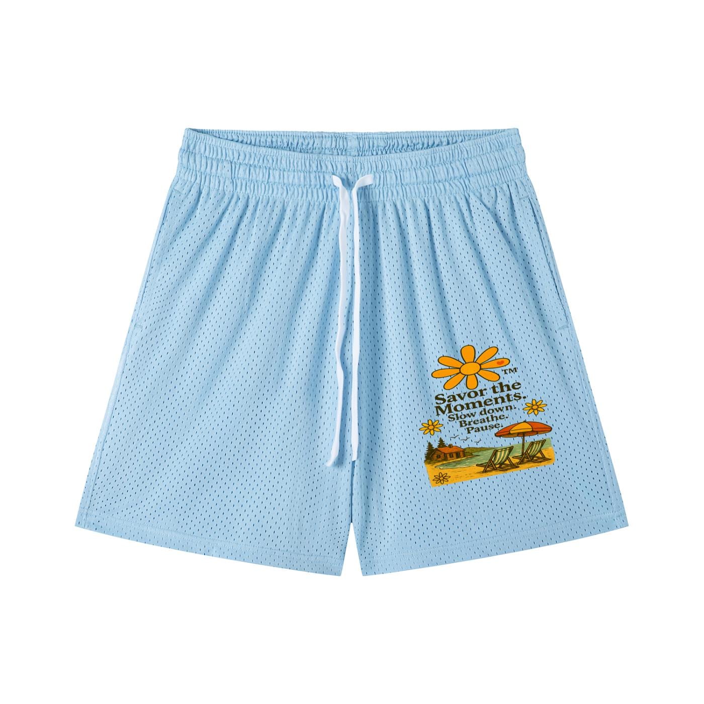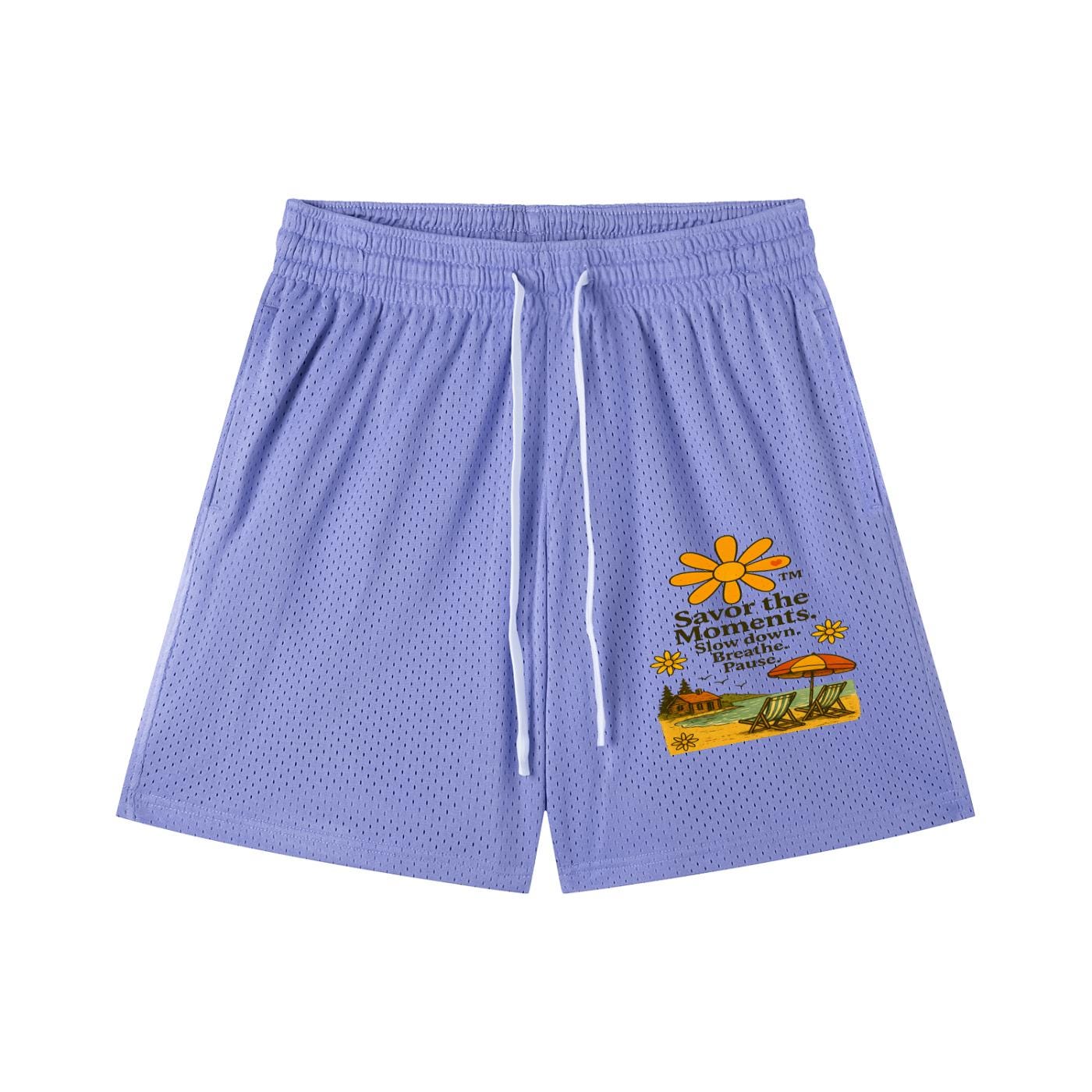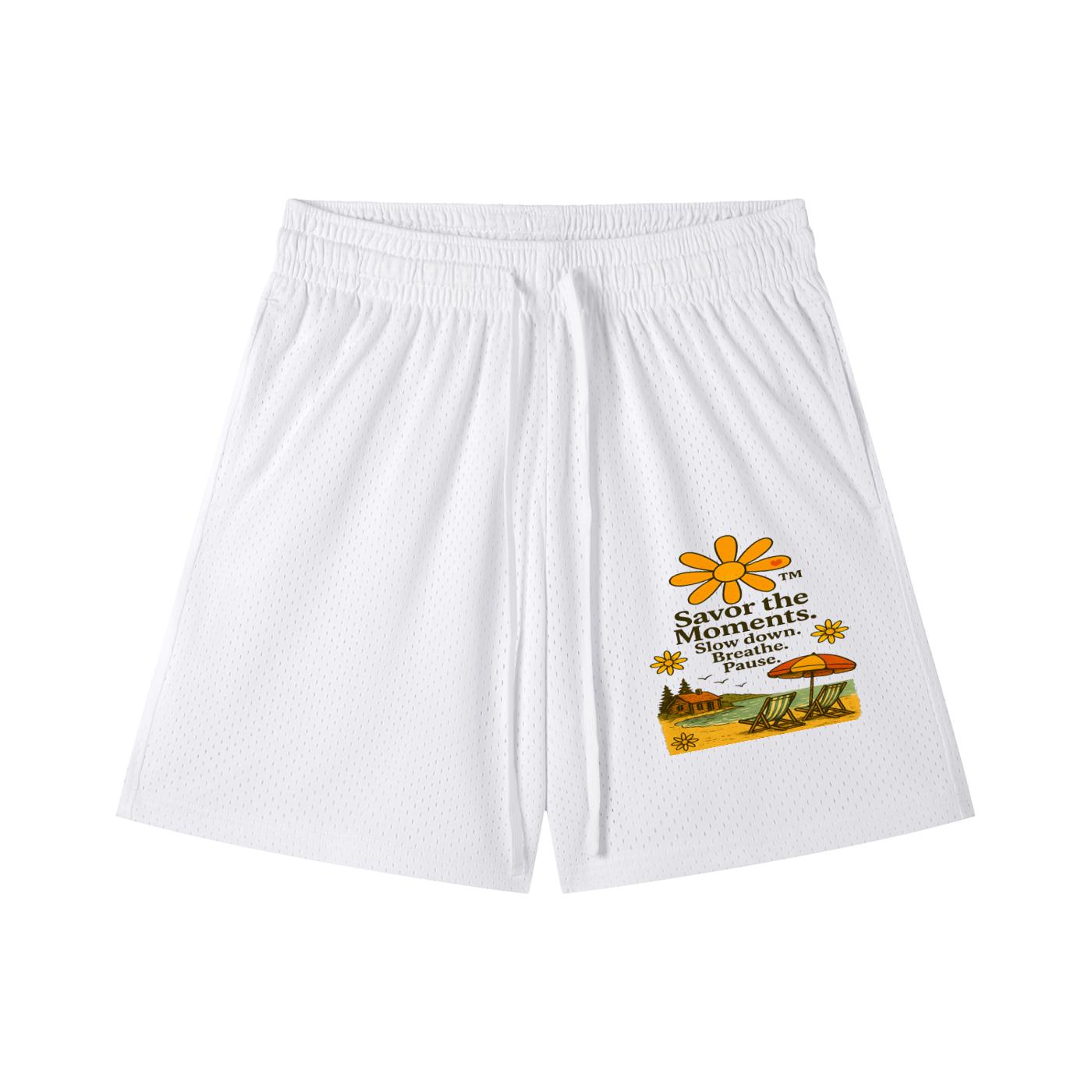Shorts, Sporty Mesh Drawstring, lake vibe, beach chairs, birds, calming Slow Down, Breathe, Pause phrases, outdoor running and casual days.