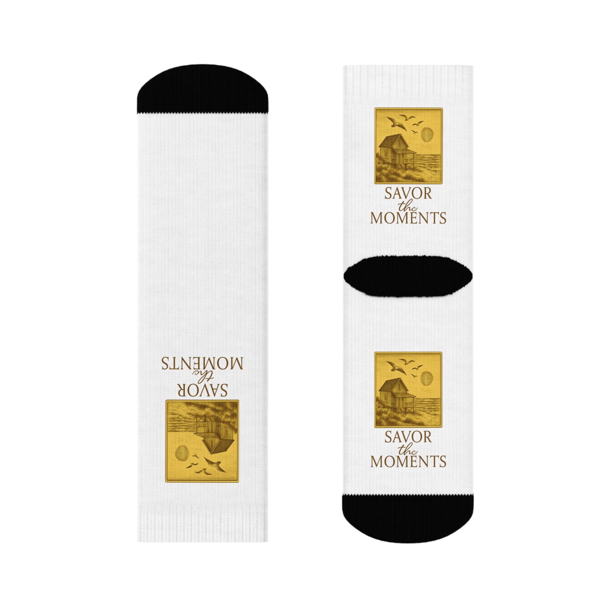 These soft, cushioned crew socks carry a quiet, vintage charm—small golden illustrations and the phrase “SAVOR the MOMENTS” sit along a clean white canvas, framed by contrasting black toe, heel, and ribbed cuff. They bring a calm, reflective note to everyday wear: slip them on after a long day to settle into slow conversation, or pair them with relaxed loungewear for a morning of coffee and sunlit quiet. Lightweight but durable, the polyester knit holds its shape and color through repeated wear while the felted sole keeps steps gentle and comfortable. The subtle design reads like a gentle reminder to slow down and notice the small, warm moments in life.