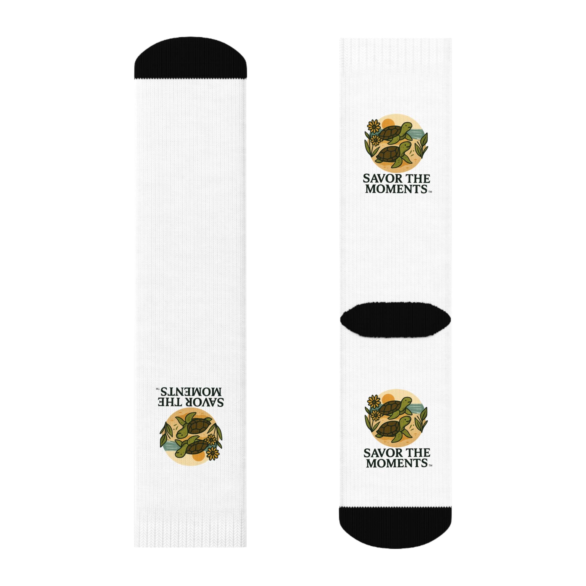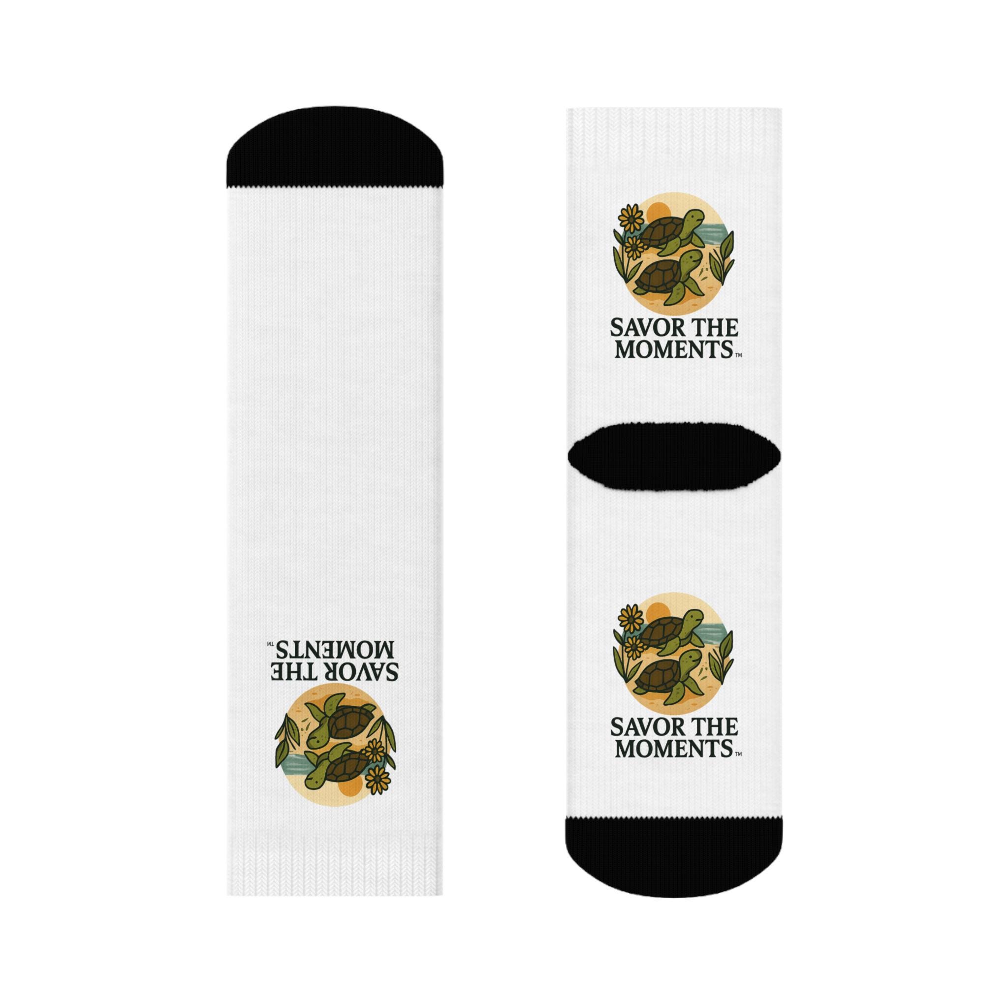 Sea Turtle Crew Socks • Beach Sunset Vibe • Nature Floral Design • Savor the Moments Ocean Lover Gift