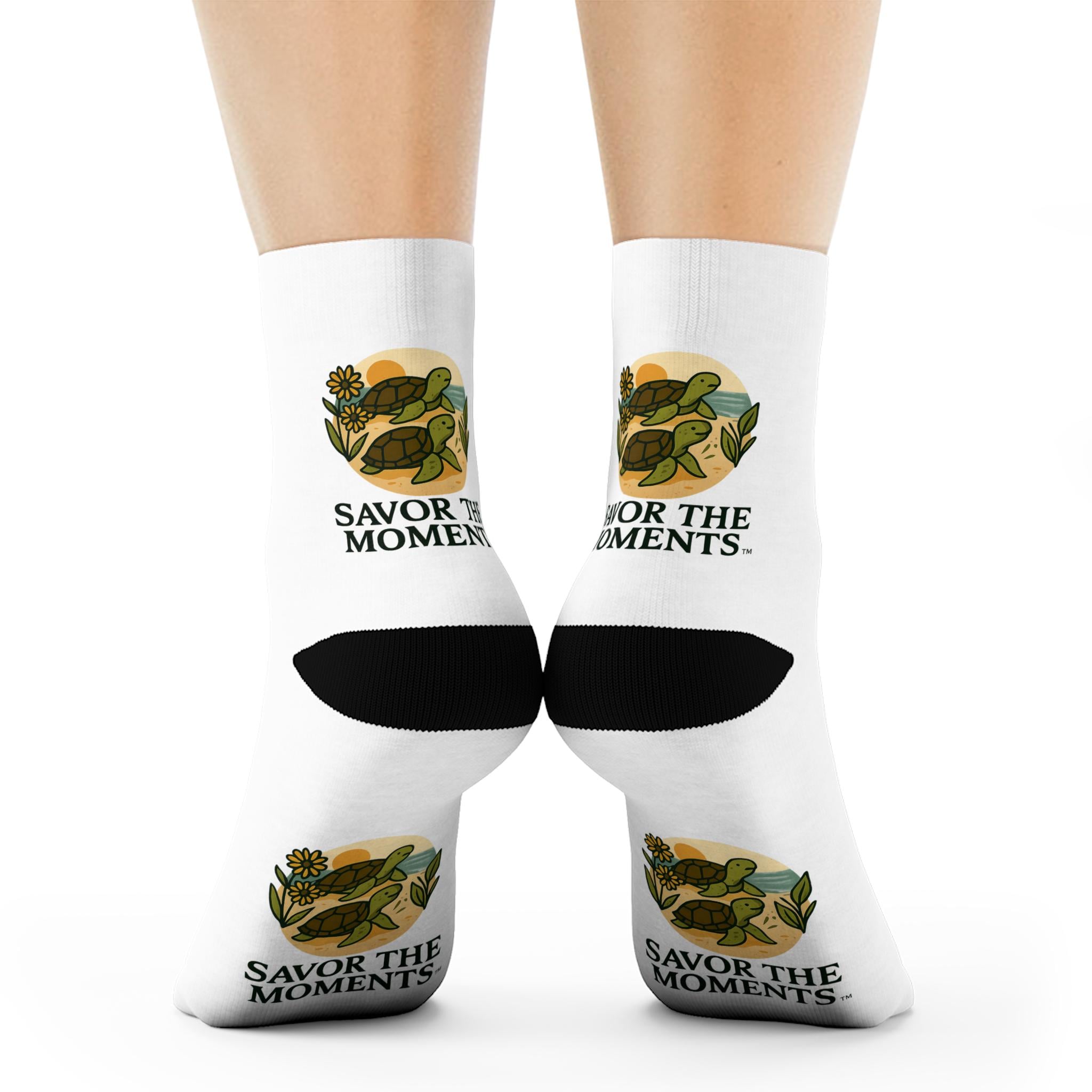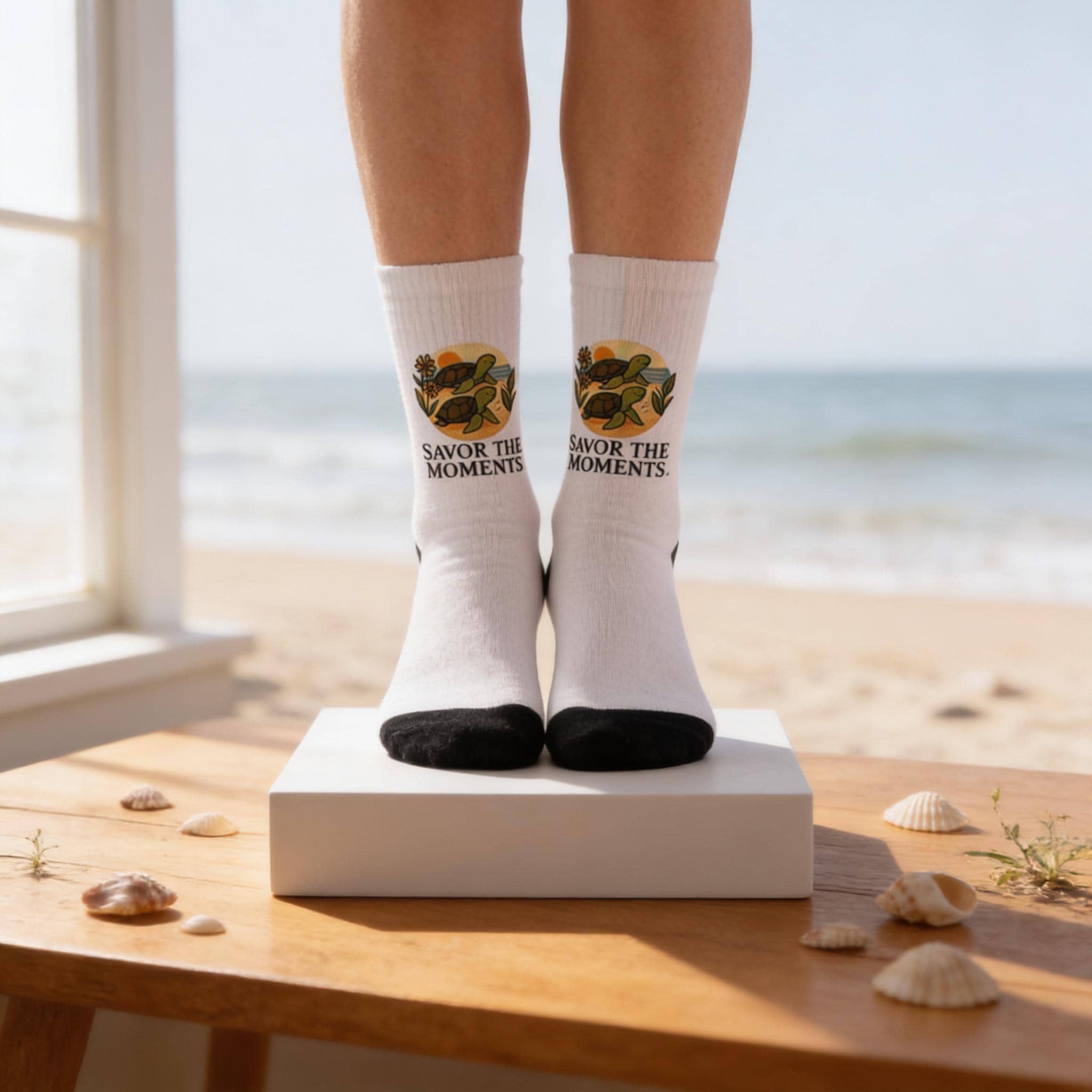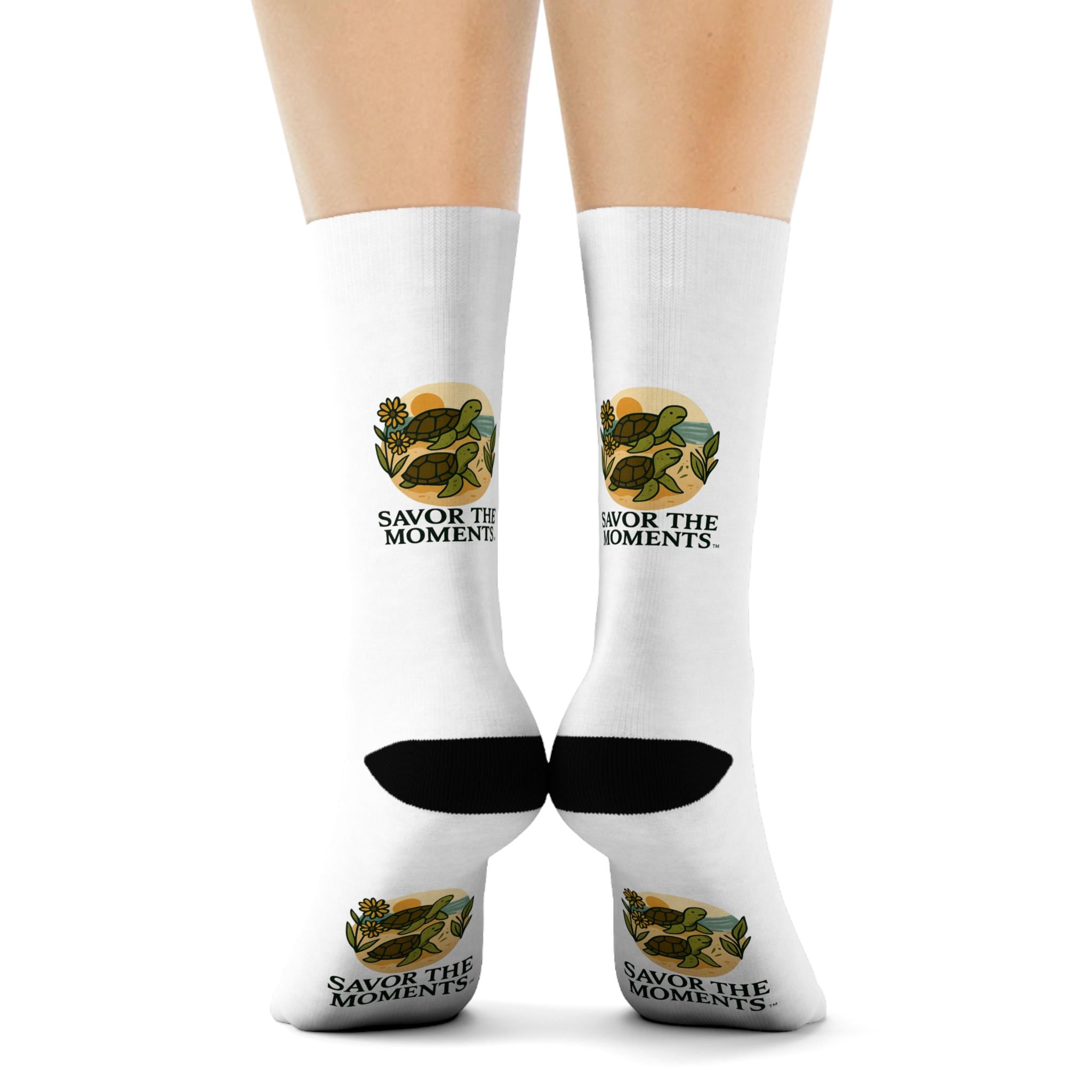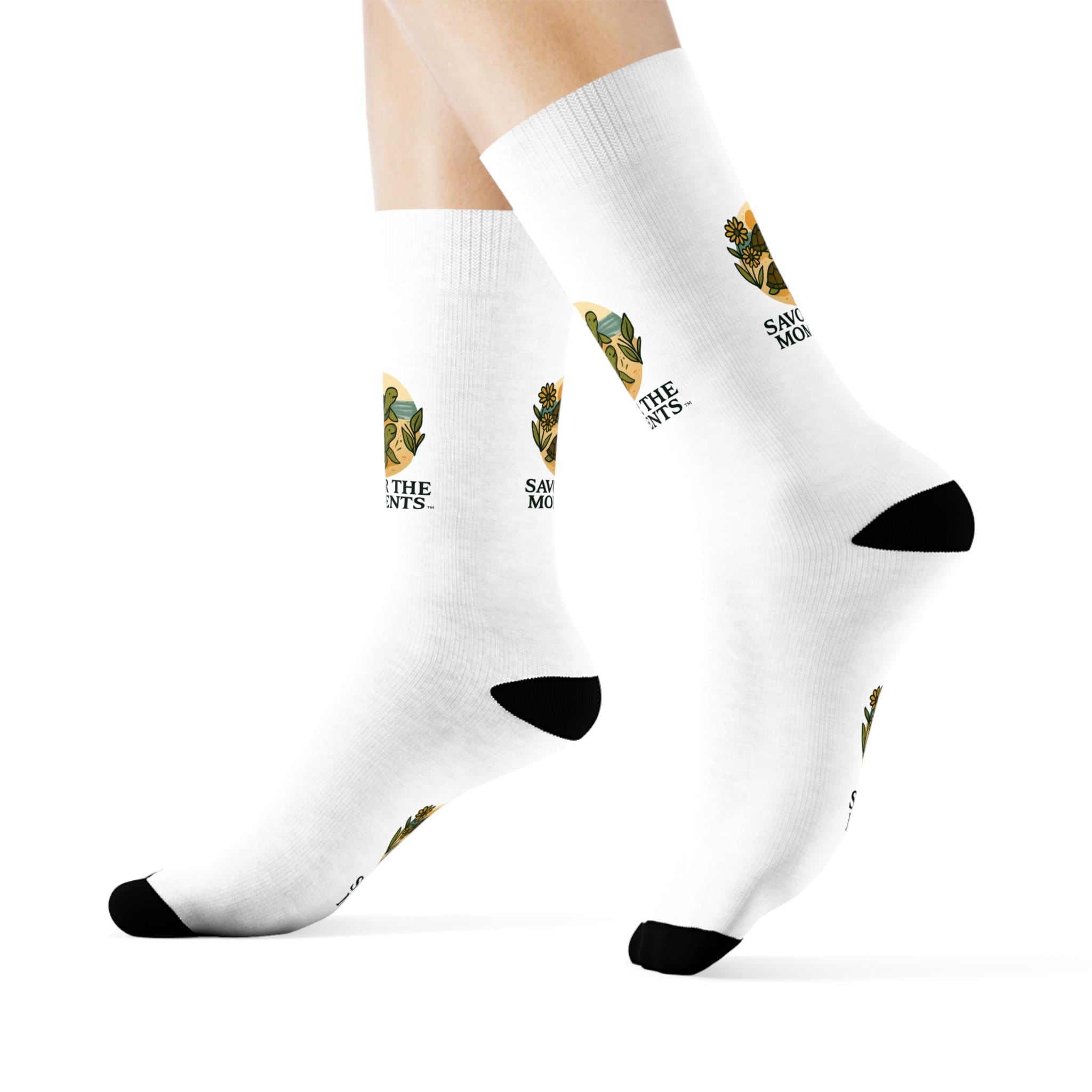 Soft, cushioned crew socks that carry a calm, nostalgic message. These white socks feature a warm, vintage-inspired illustration of a sunlit still life and the words “SAVOR THE MOMENTS.” The black heel, toe, and 1" ribbed cuff frame the artwork for a bold contrast. Lightweight and quick-drying polyester keeps the print crisp and the fit lively through daily wear. Slip them on when you want a small, mindful reminder tucked into an everyday routine—morning coffee, slow weekend walks, or quiet evenings at home.