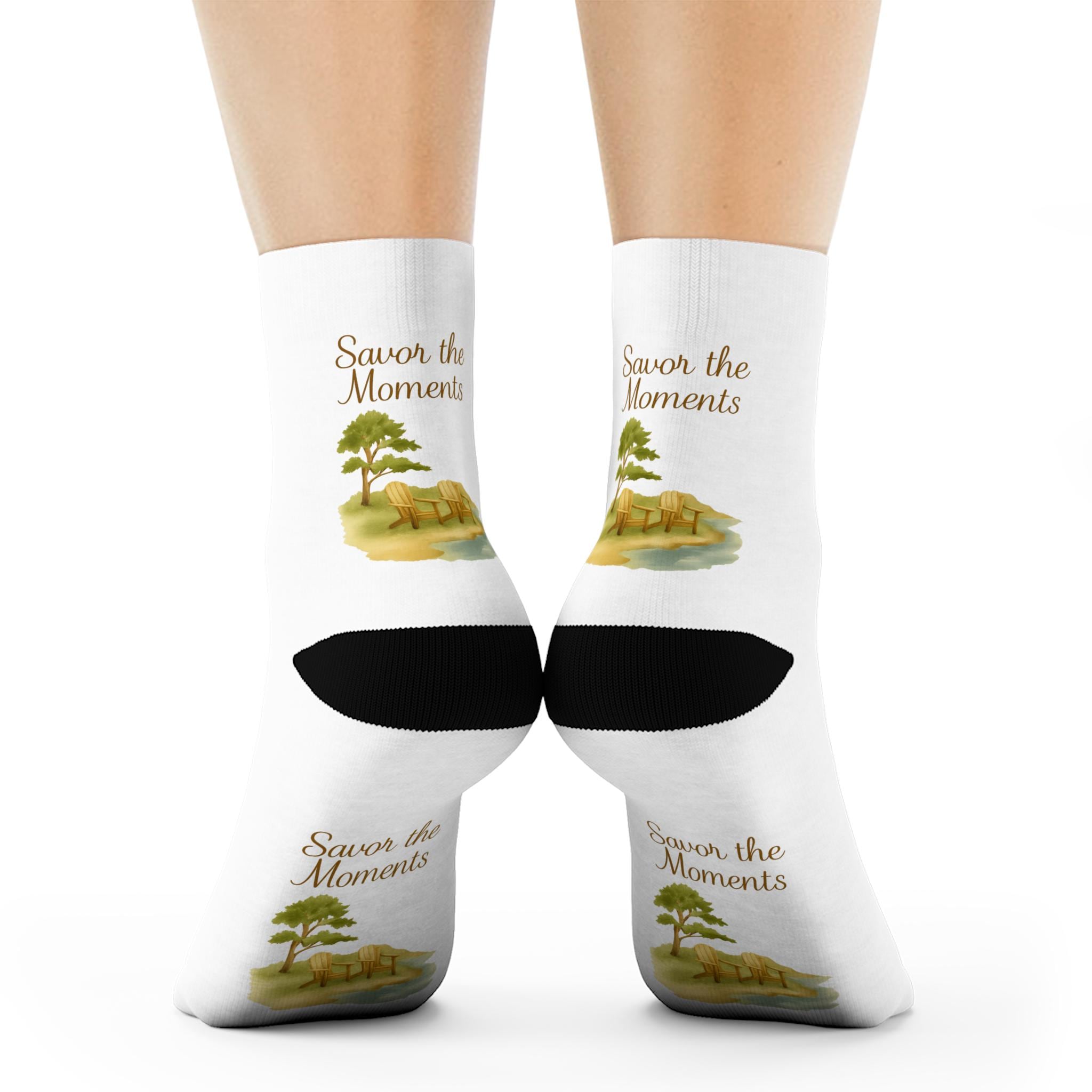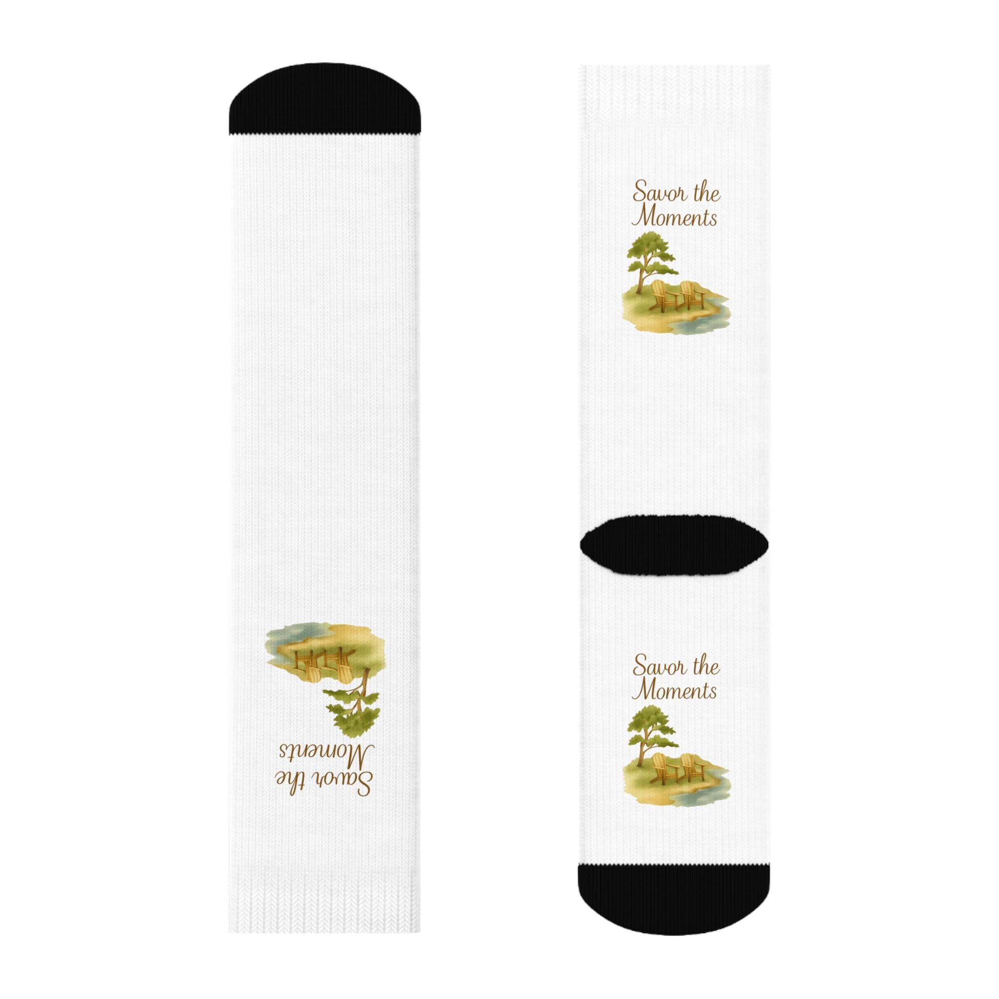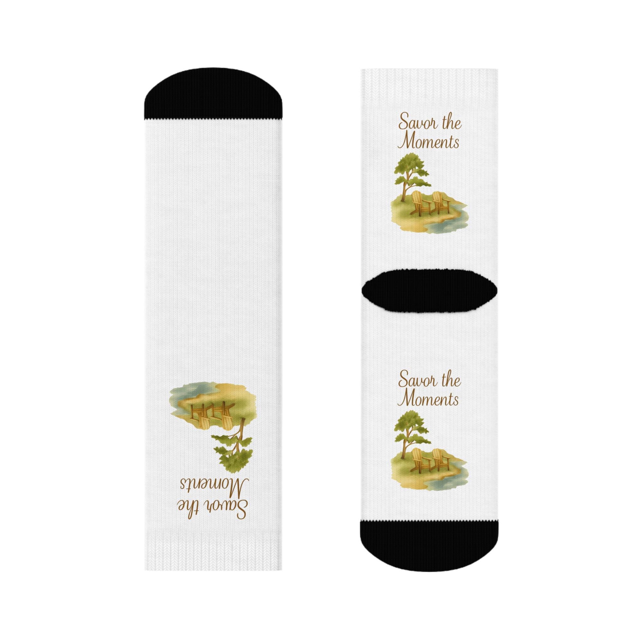 These crew socks carry a quiet, nostalgic mood. A soft watercolor landscape — a lone tree beside a gentle stream — and the phrase “Savor the Moments” are printed along the calf on a clean white background. The contrast black cuff and heel give a grounded, lived-in look, while cushioned soles make them pleasant to wear during slow mornings or long strolls. They feel like a small ritual: slipping them on to remind yourself to slow down, notice the view, and hold a tiny keepsake of calm with you through the day.