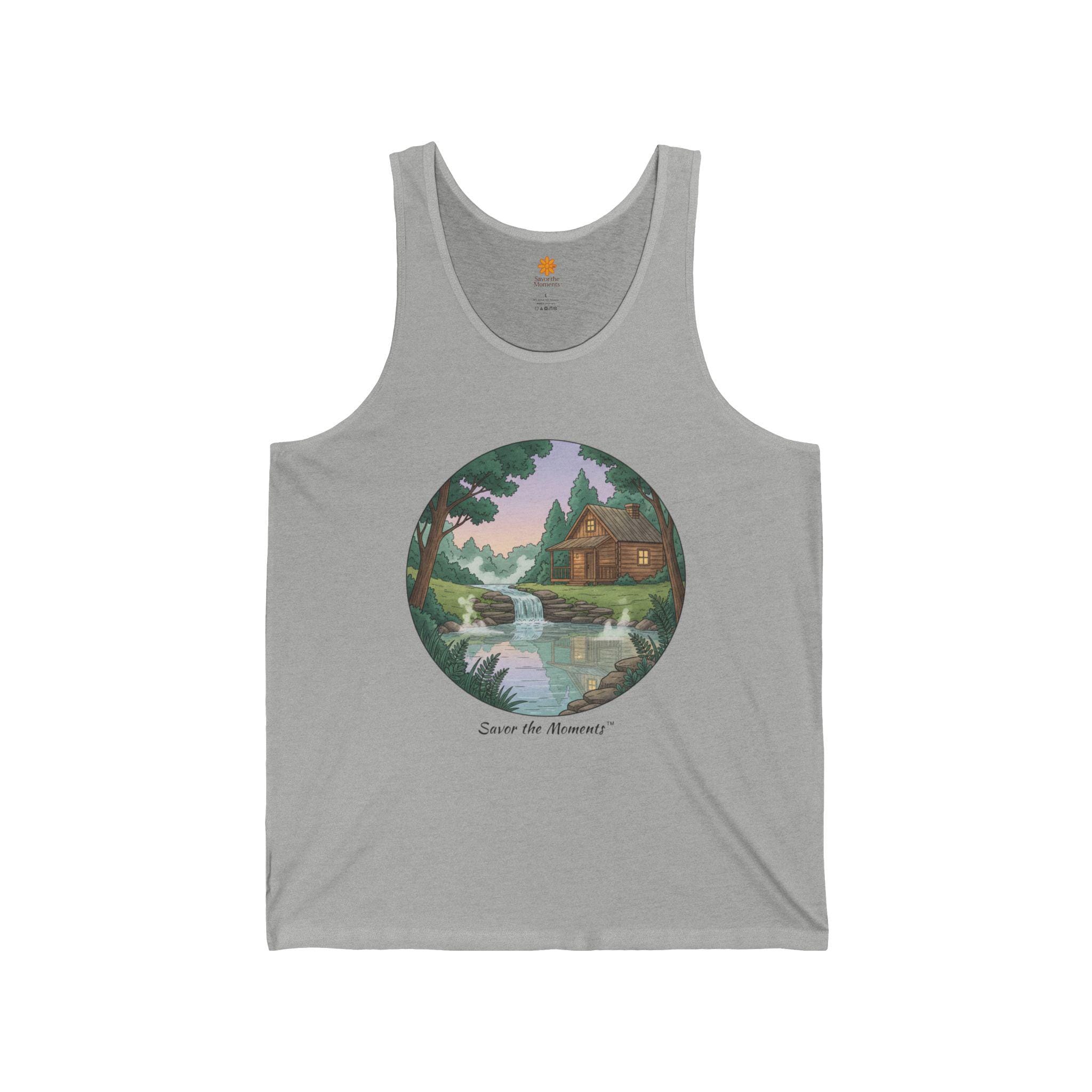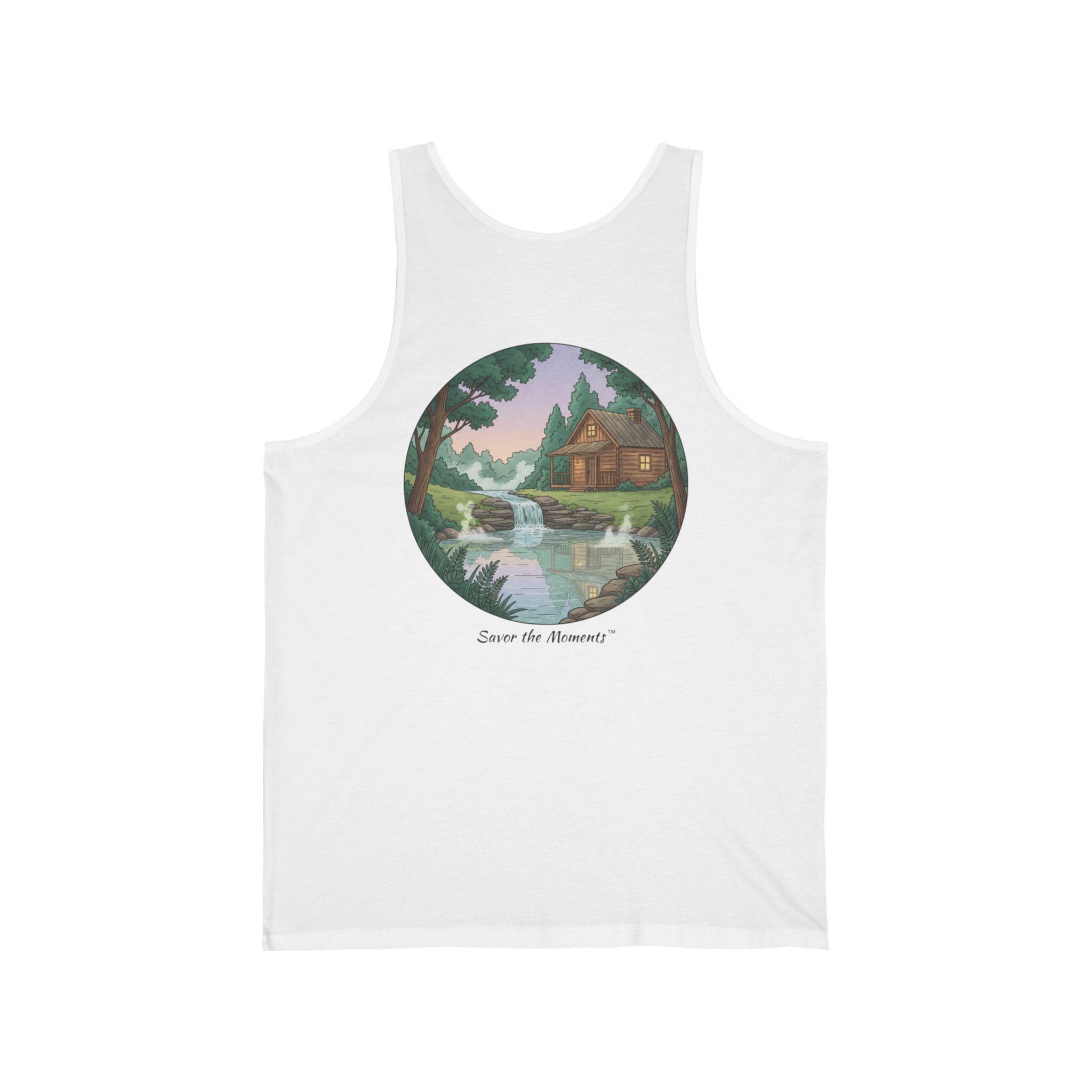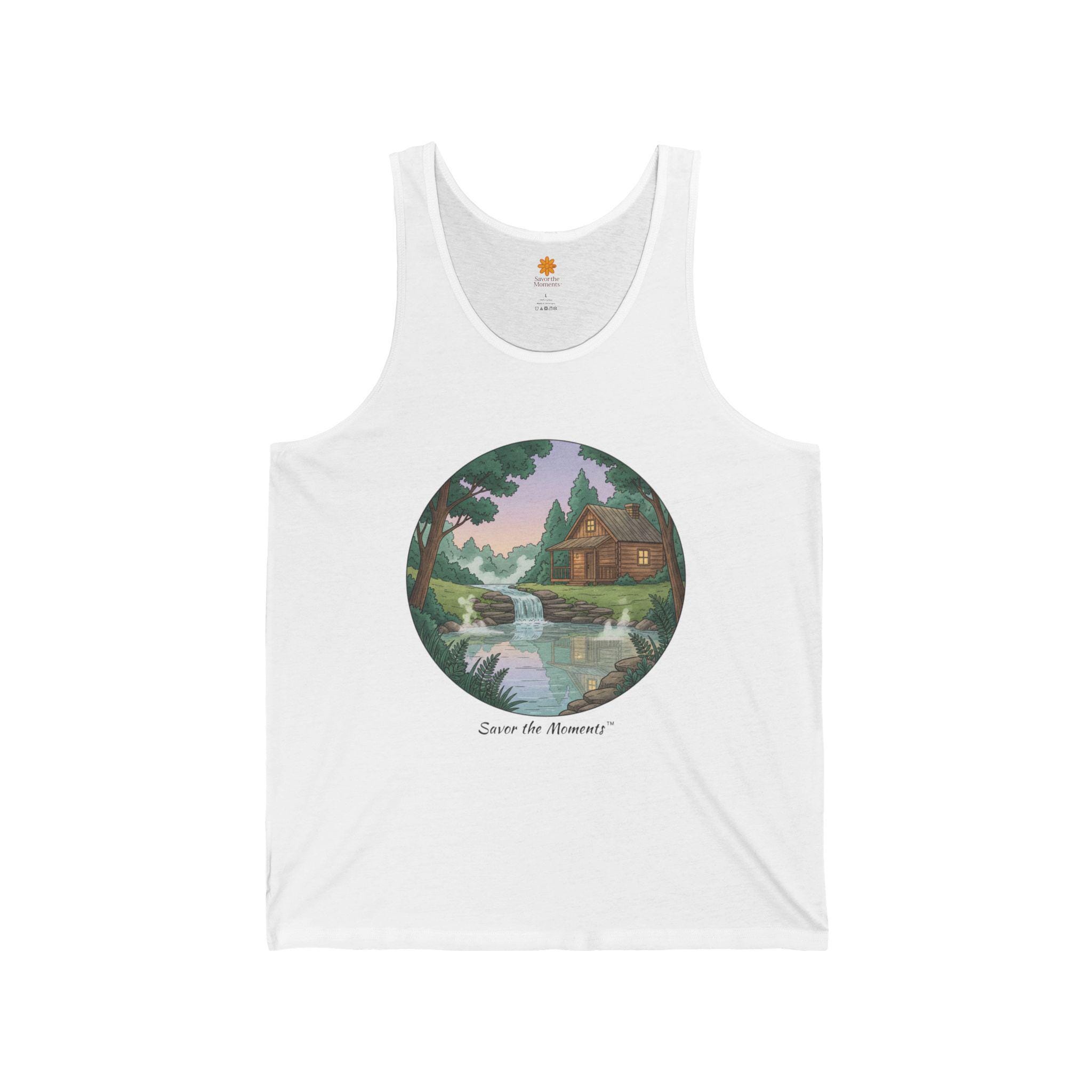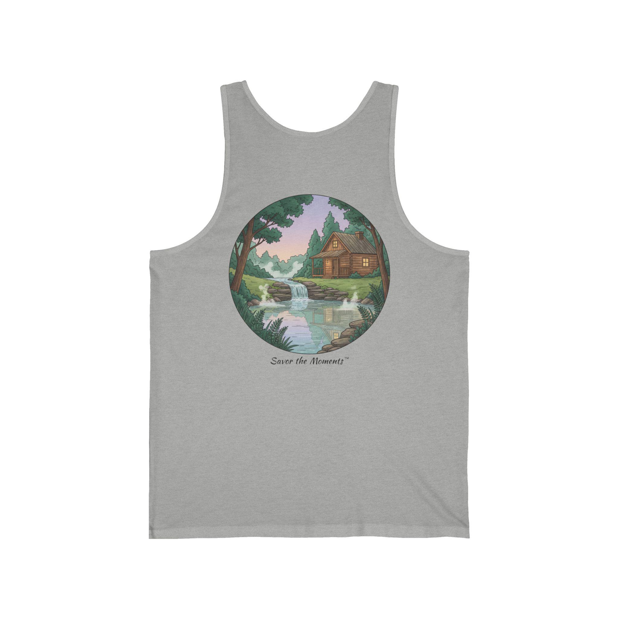Soft, lightweight tank with a nostalgic painted scene—a quiet cabin by a gentle river under pastel skies. Wear it on slow mornings, long hikes, or layered for bonfire nights. The retail fit drapes easily over tees or swimsuits and keeps its shape thanks to side seams and thoughtful construction. The image sits centered in a circular frame, giving a vintage postcard vibe that feels personal and calm. Breathable Airlume cotton and a tear-away label make it comfortable all day, and the subtle texture of heather or triblend colorways adds lived-in warmth.
