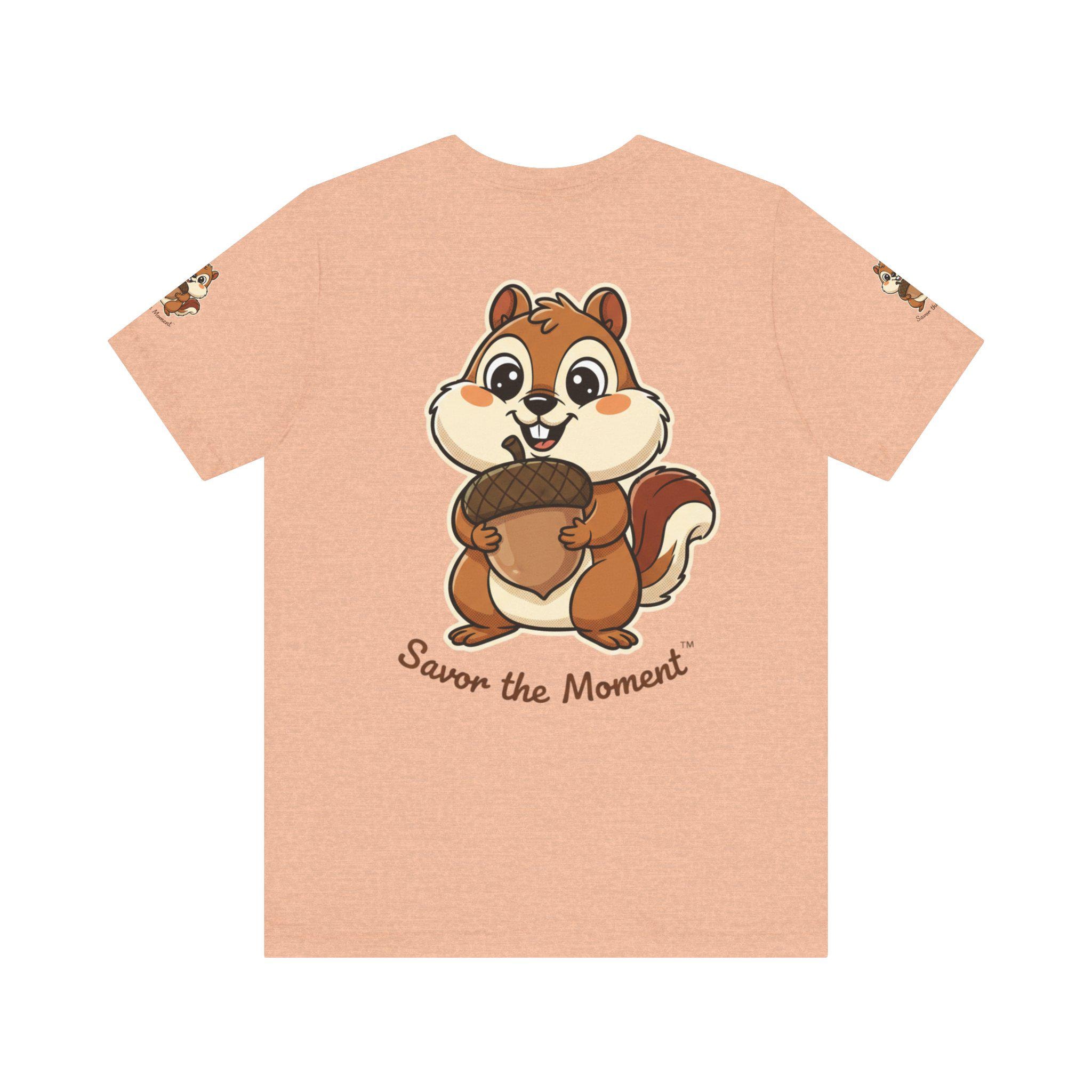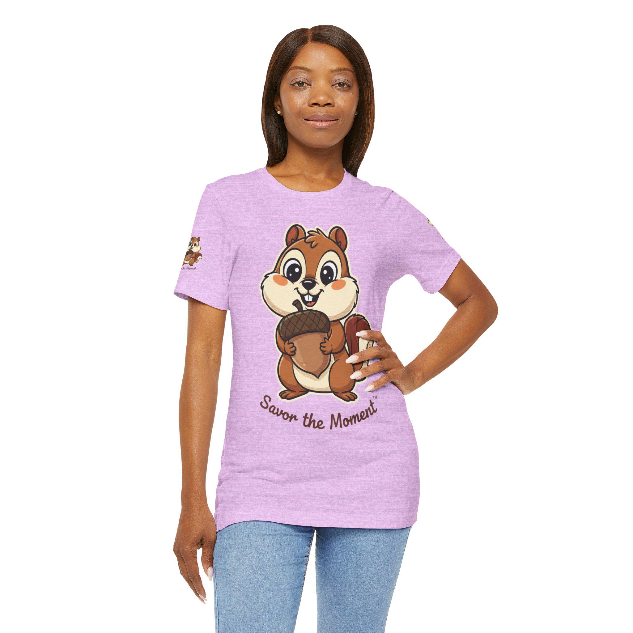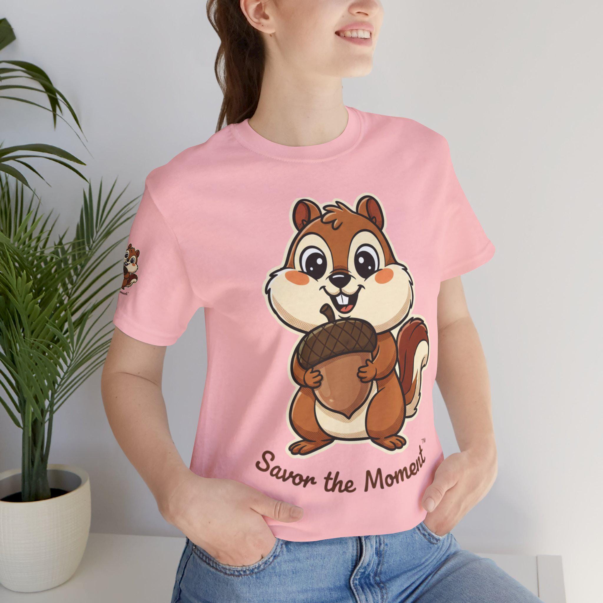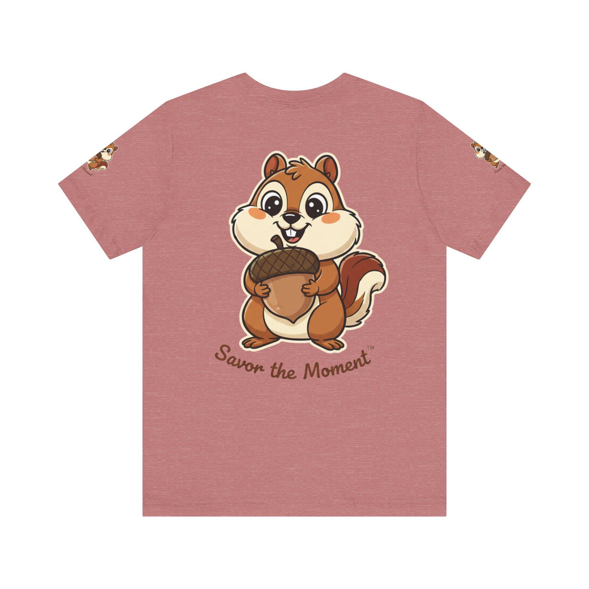 A soft, breathable tee printed with an affectionate squirrel clutching an oversized acorn and the hand-lettered phrase “Savor the Moment.” Light and easy to wear, it brings a playful, slow-living vibe to everyday outfits. Slip it on for morning coffee, park strolls, or cozy hangouts — the illustration sparks, smiles and reminds the wearer to notice small joys. The crew neck and retail fit keep the silhouette neat for layering under jackets or wearing solo. Thoughtful production details — tear-away label, side seams, shoulder tape, and responsibly sourced Airlume combed cotton — make this shirt comfortable and long-lasting, keeps the artwork crisp and true to color.