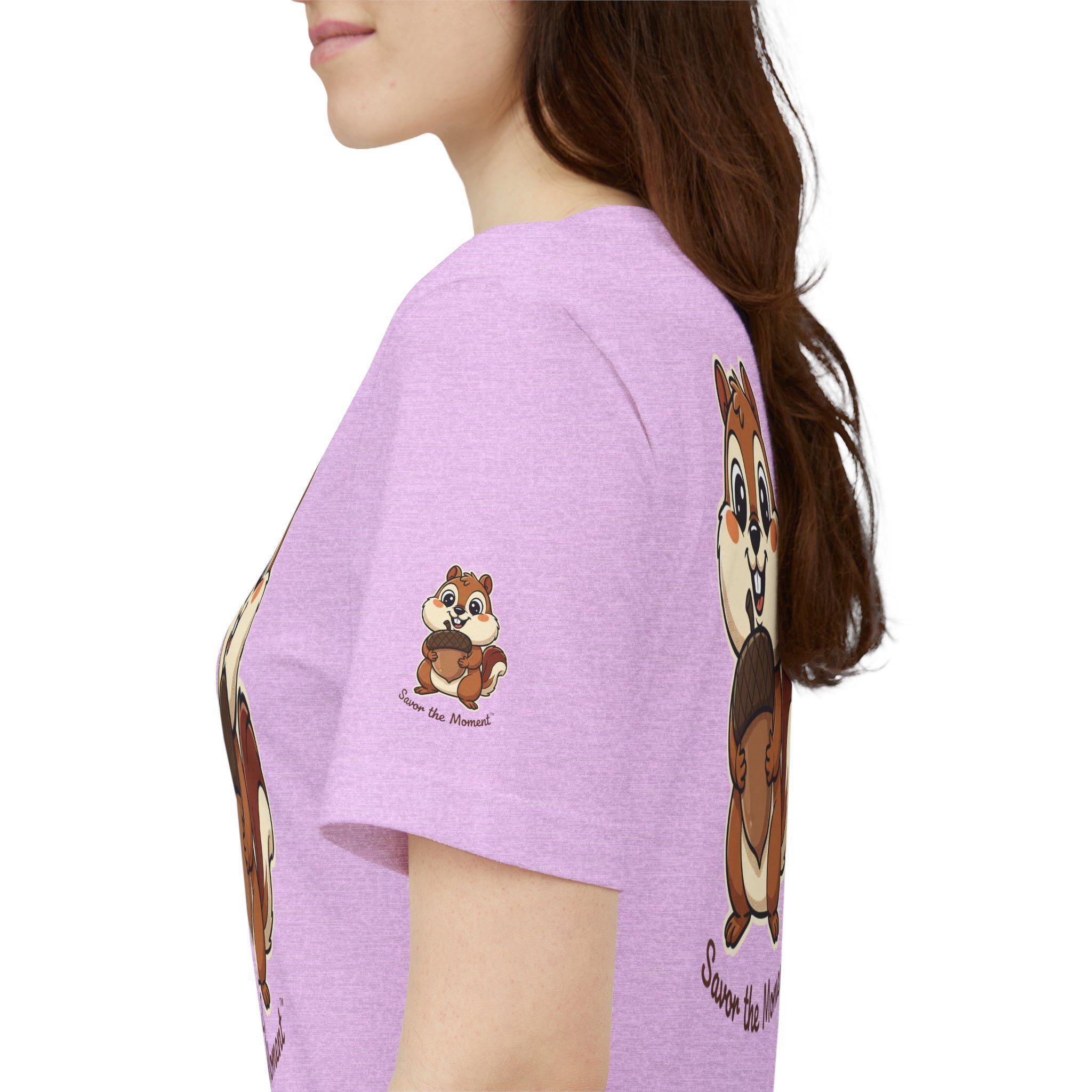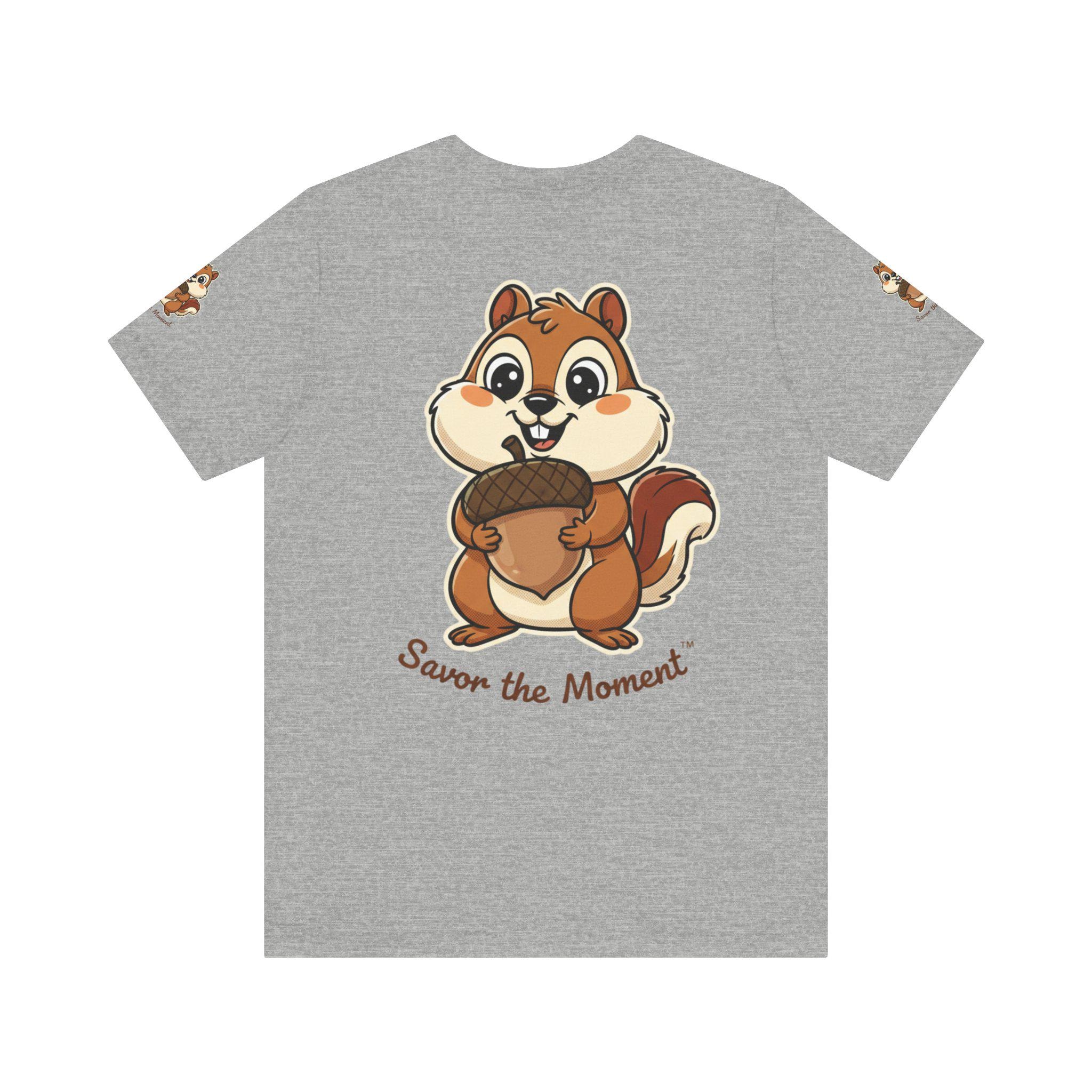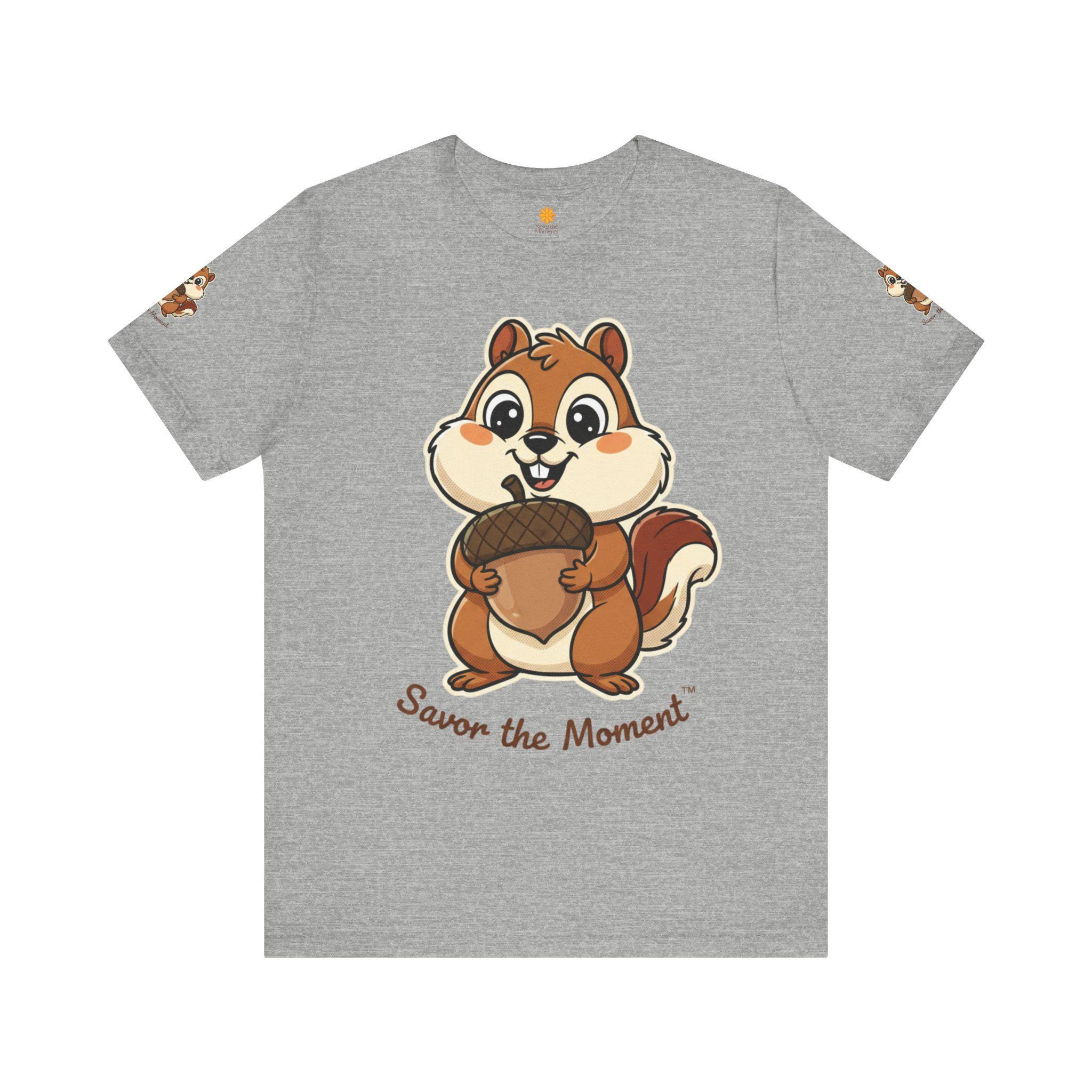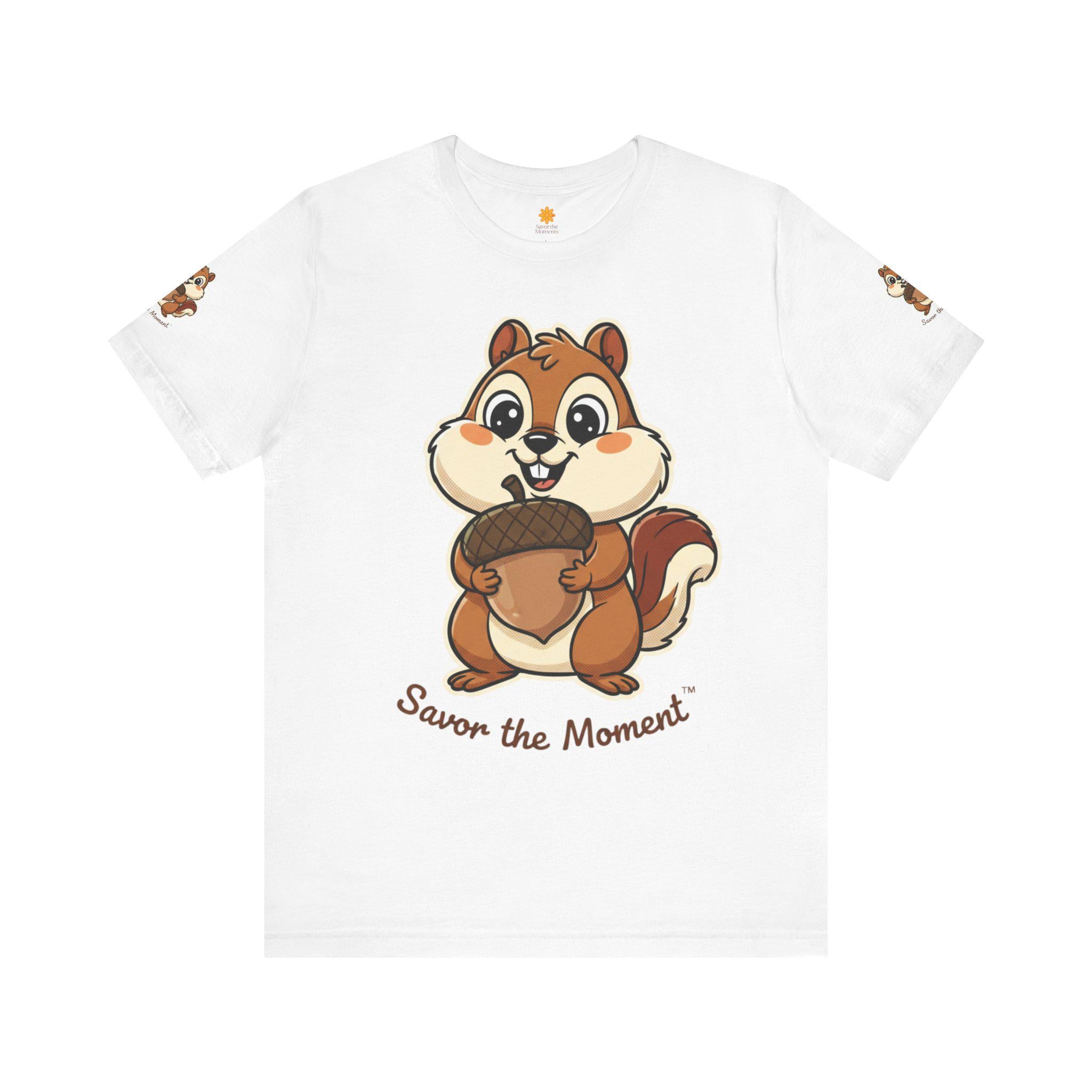 Chipmunk acorn tee, animal lovers, outdoor nature vibes, unisex, crewneck T‑shirt. Whimsical goofy graphic.
