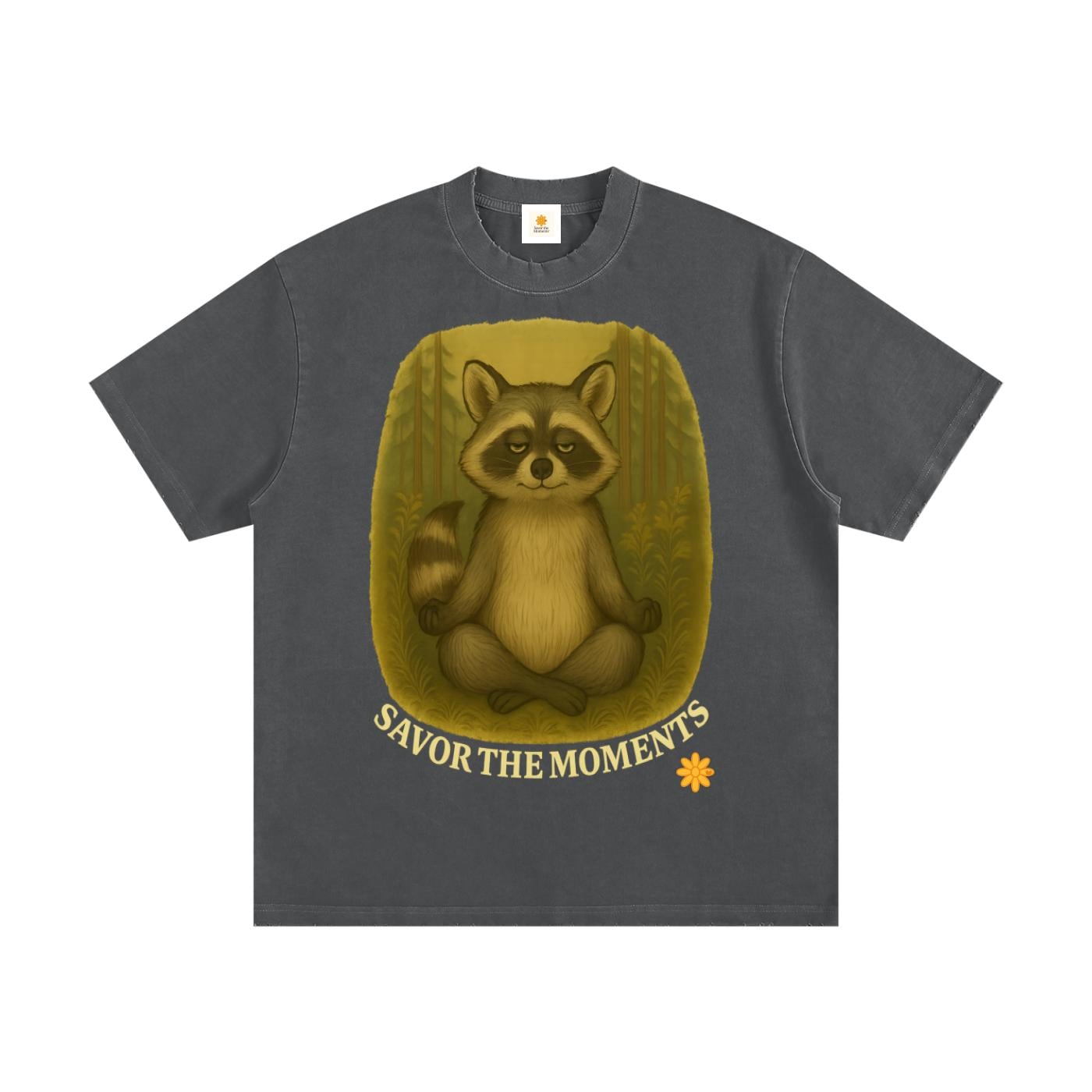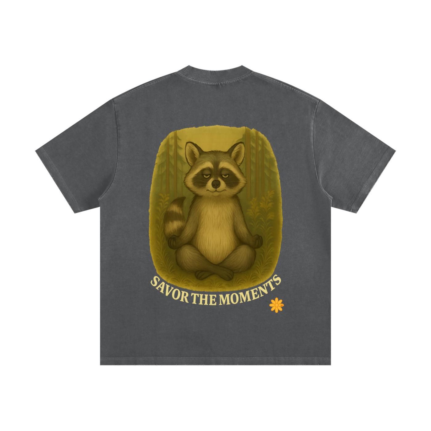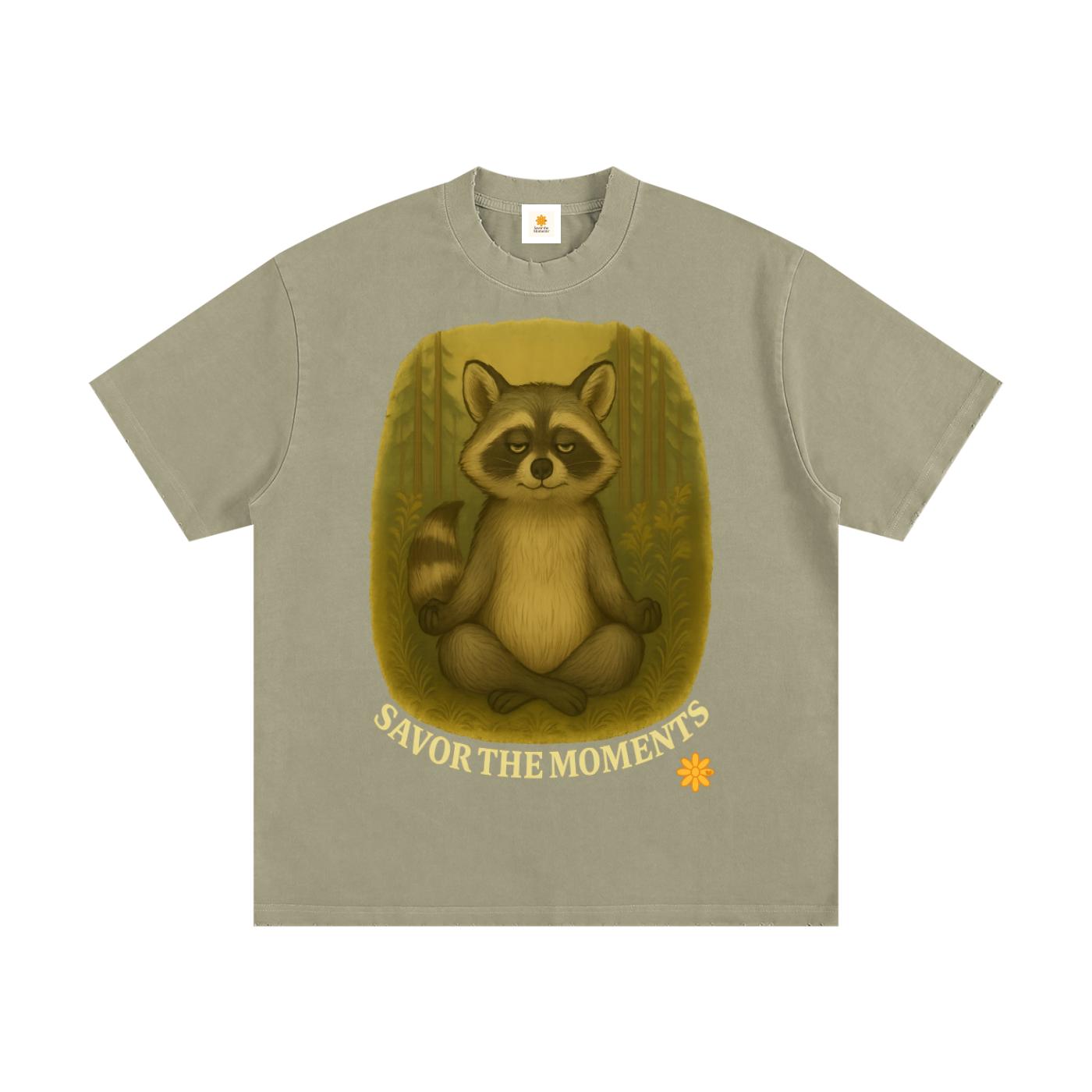 Goofy Zen Forest Friends, Zen Raccoon, Heavyweight Vintage Washed Frayed T-Shirt.