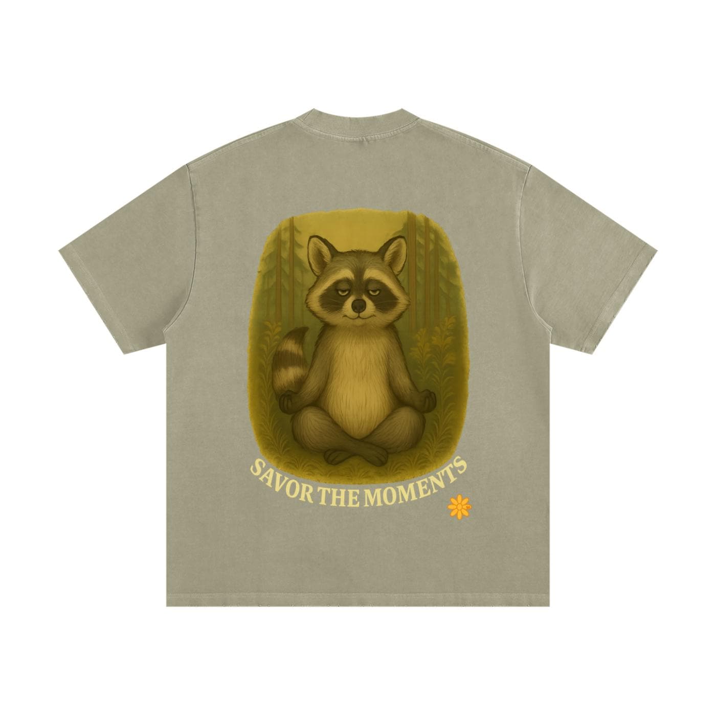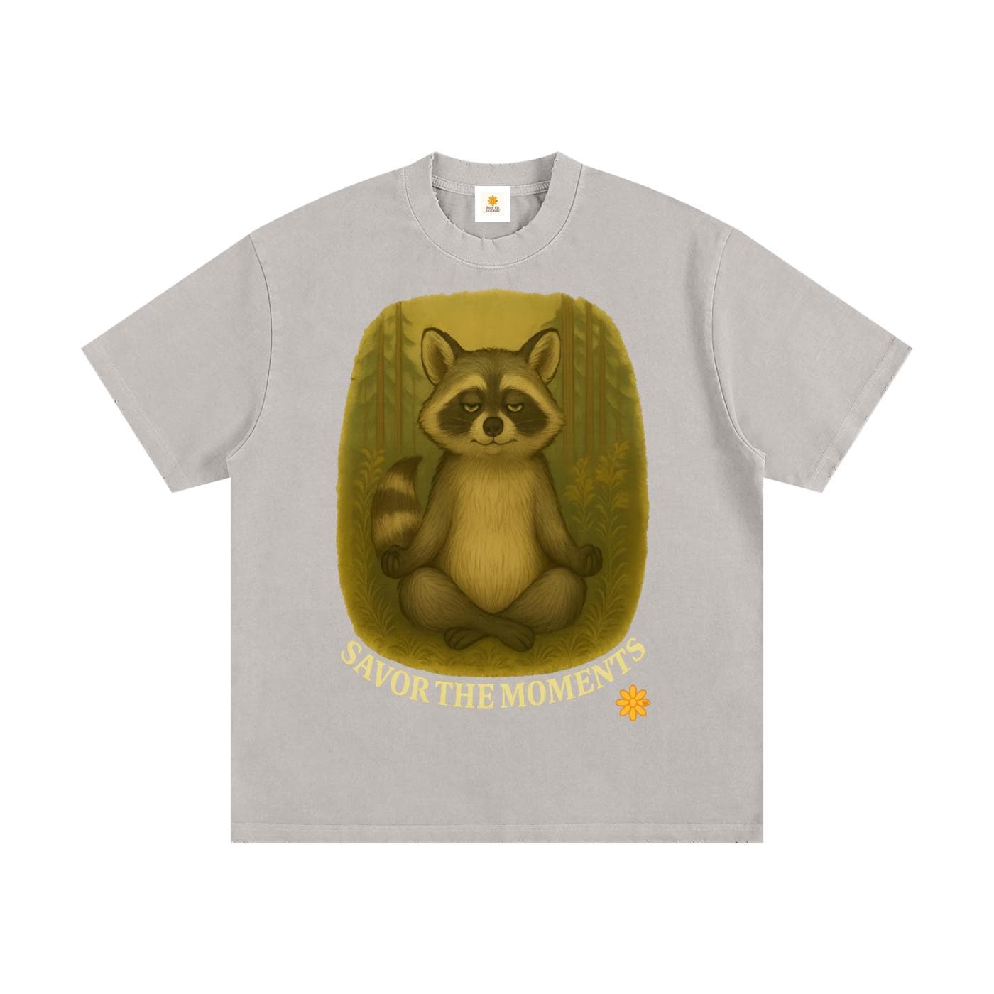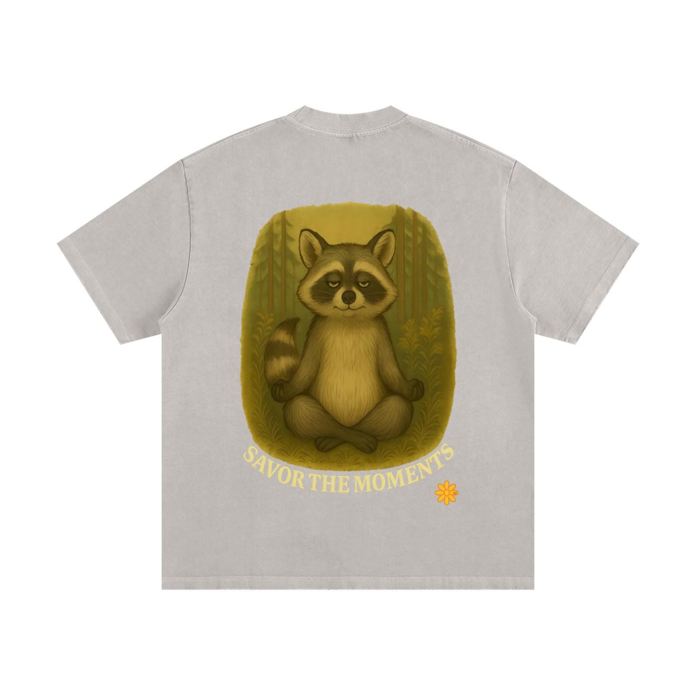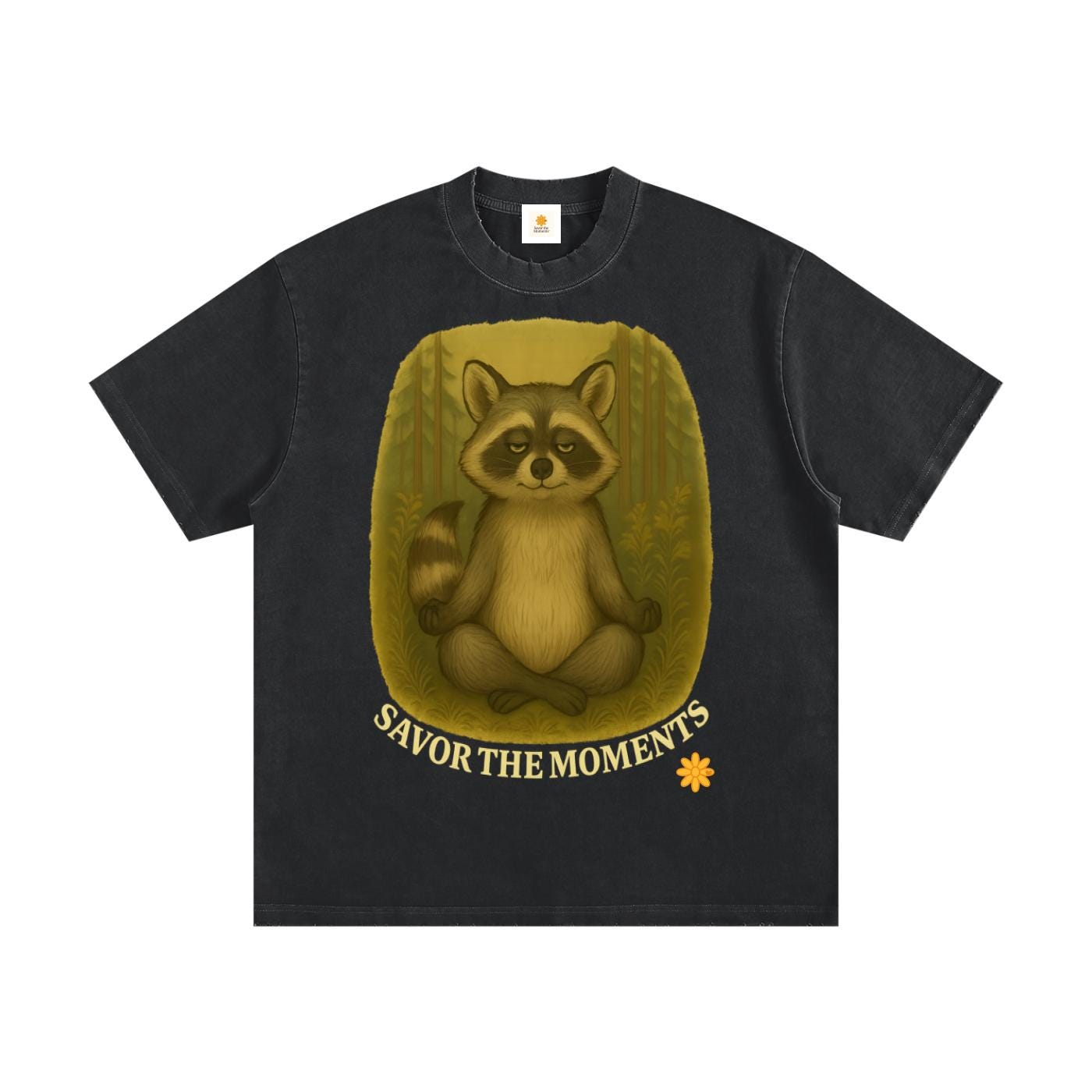 Goofy Zen Forest Friends, Zen Raccoon, Heavyweight Vintage Washed Frayed T-Shirt.