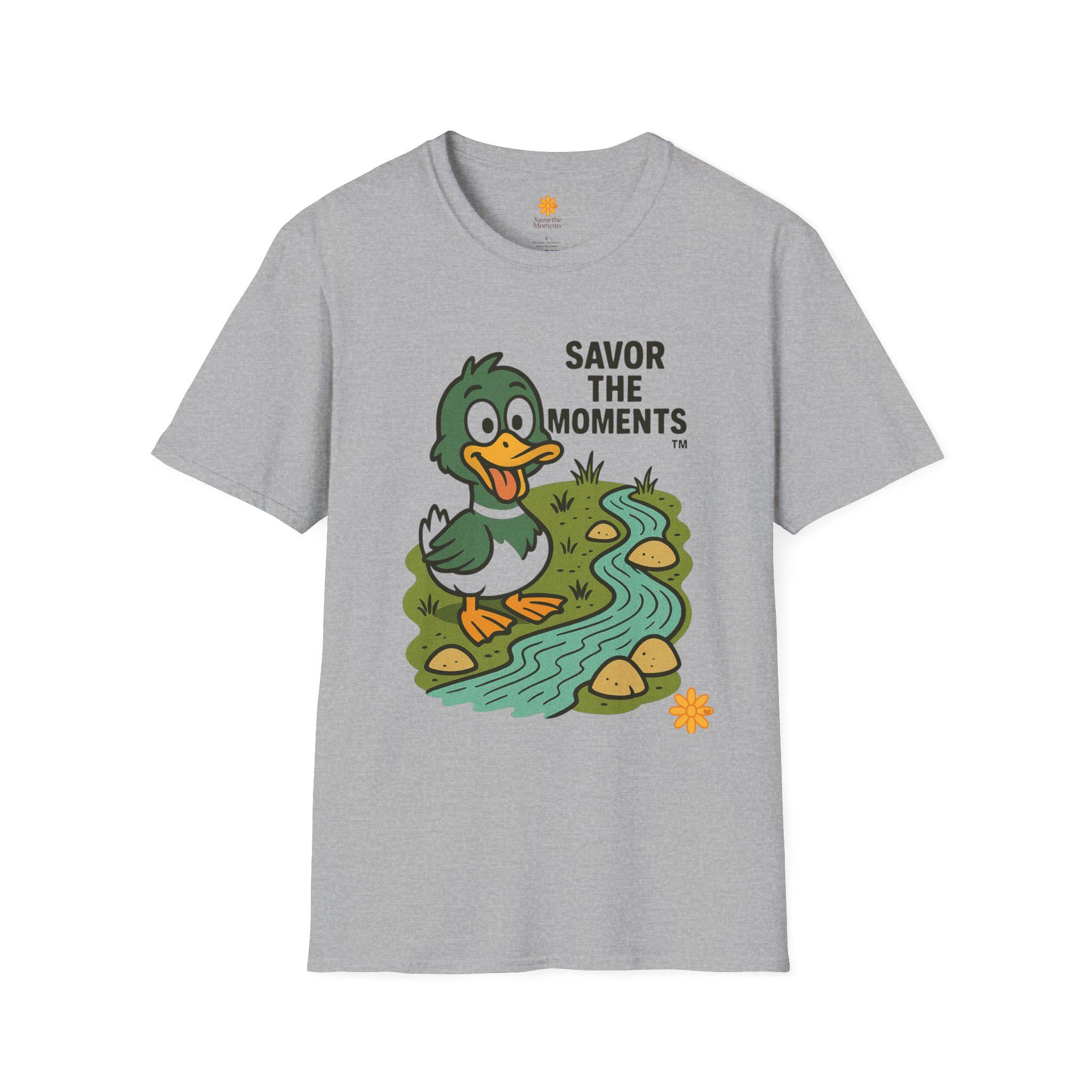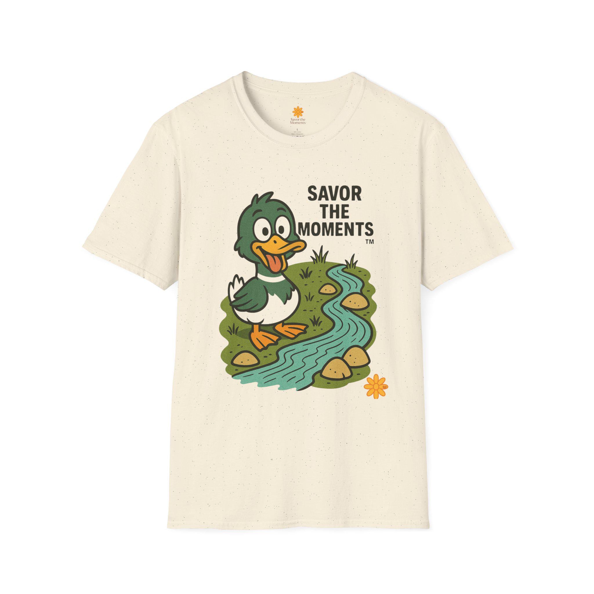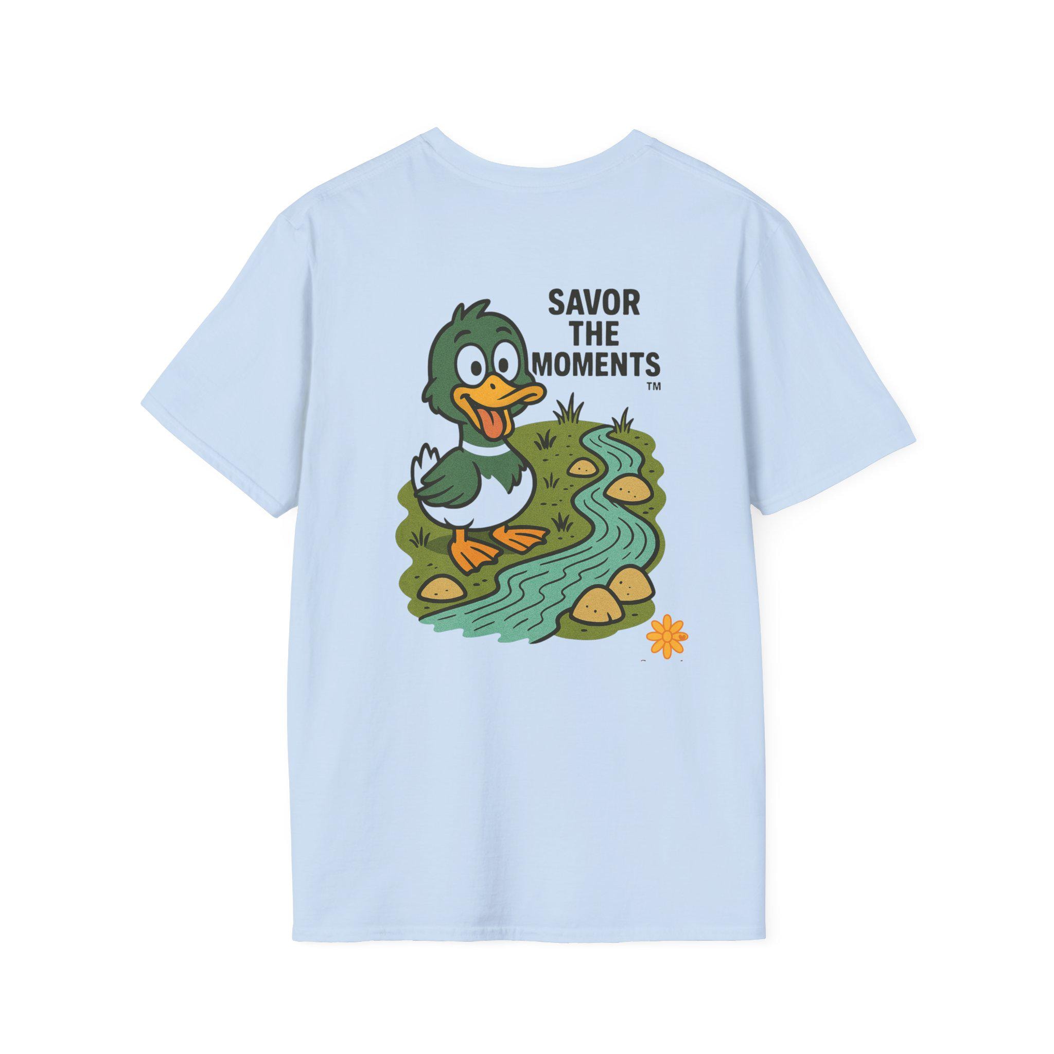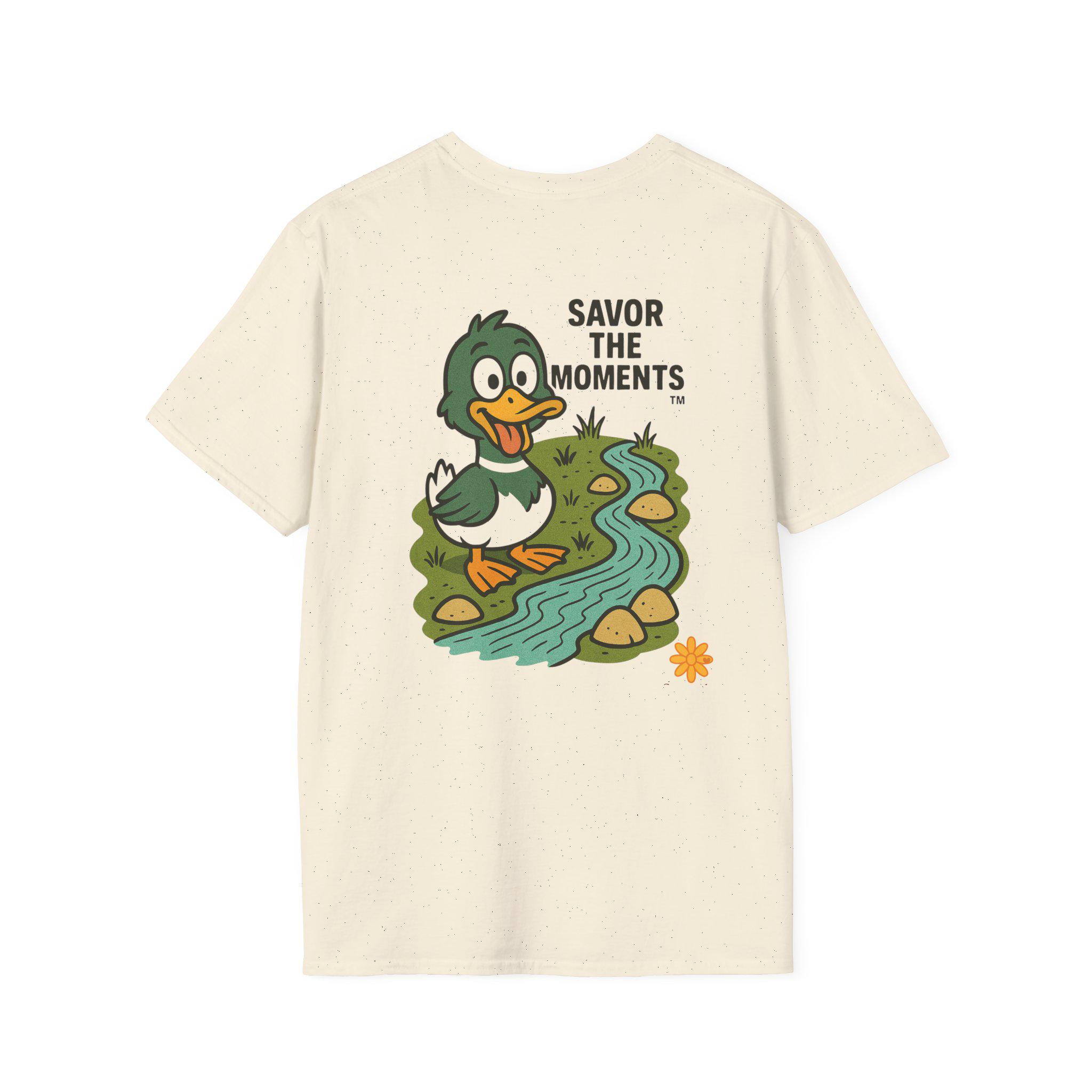 Duck illustration T-Shirt |cartoon duck by a stream, Savor the moments apparel.