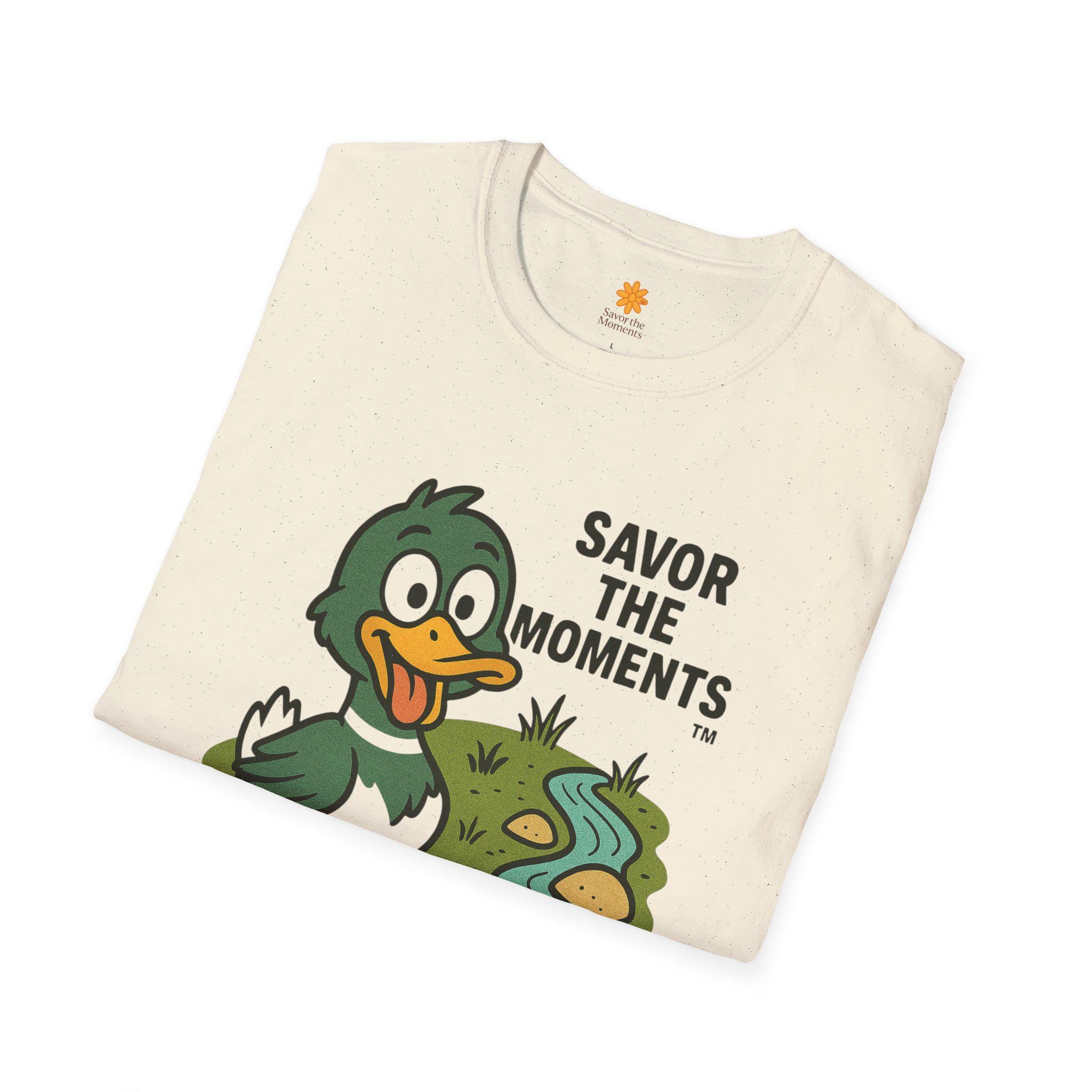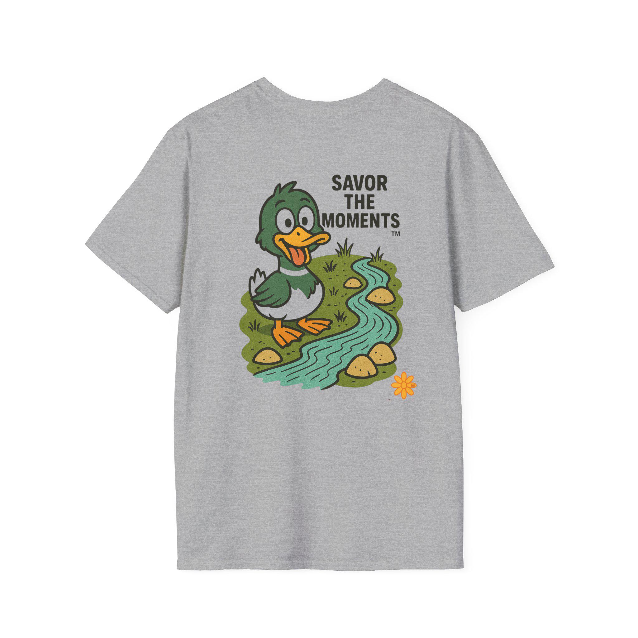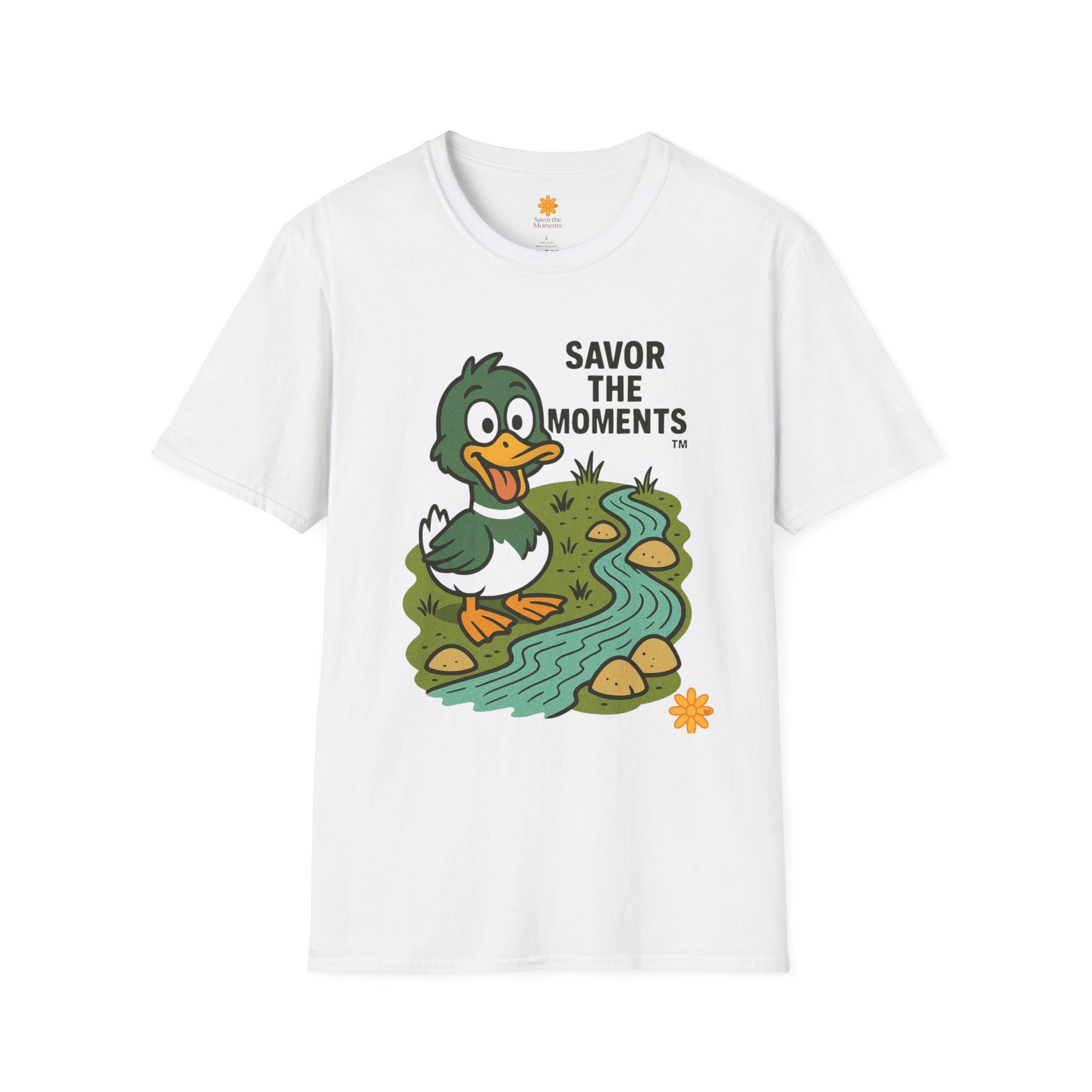 Duck illustration T-Shirt |cartoon duck by a stream, Savor the moments apparel.