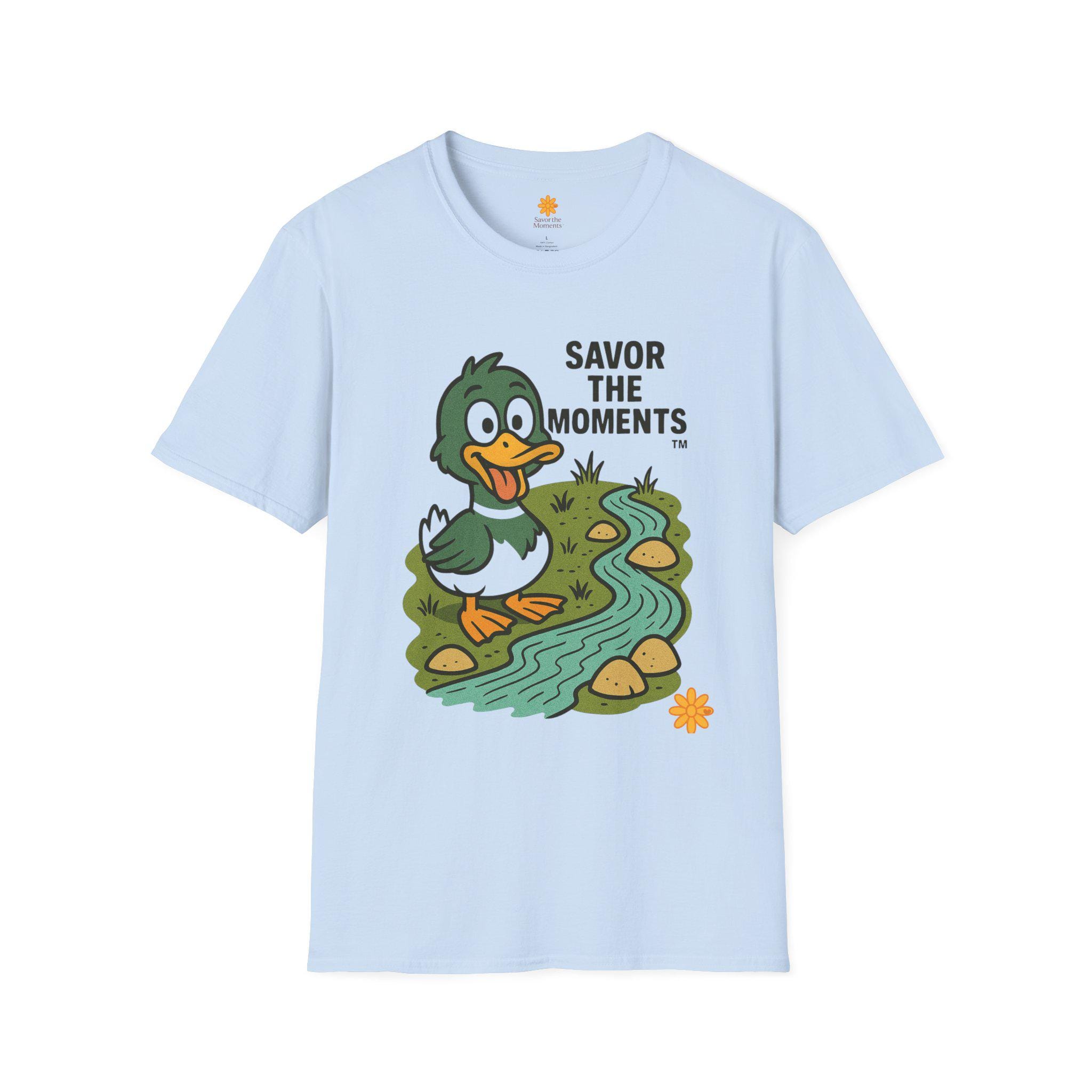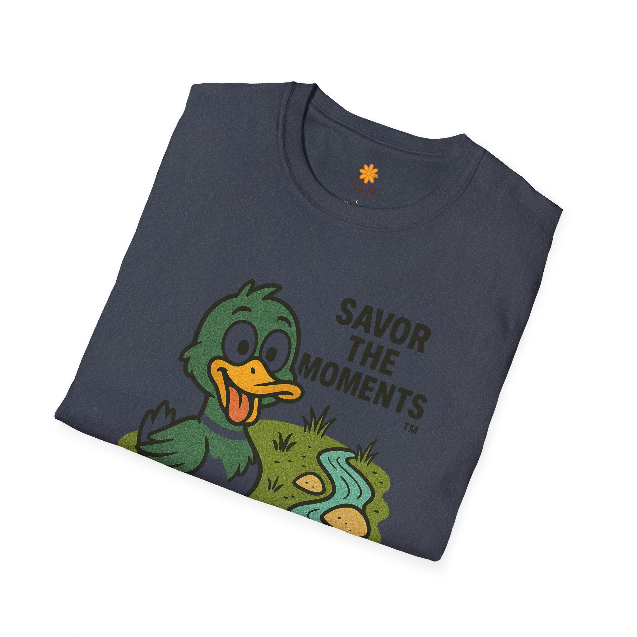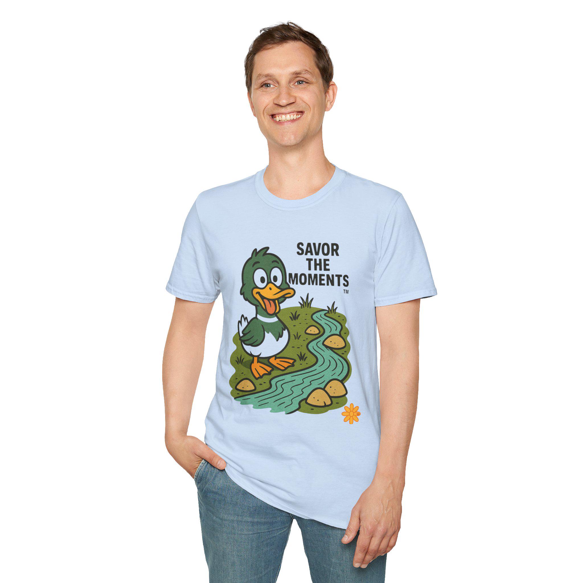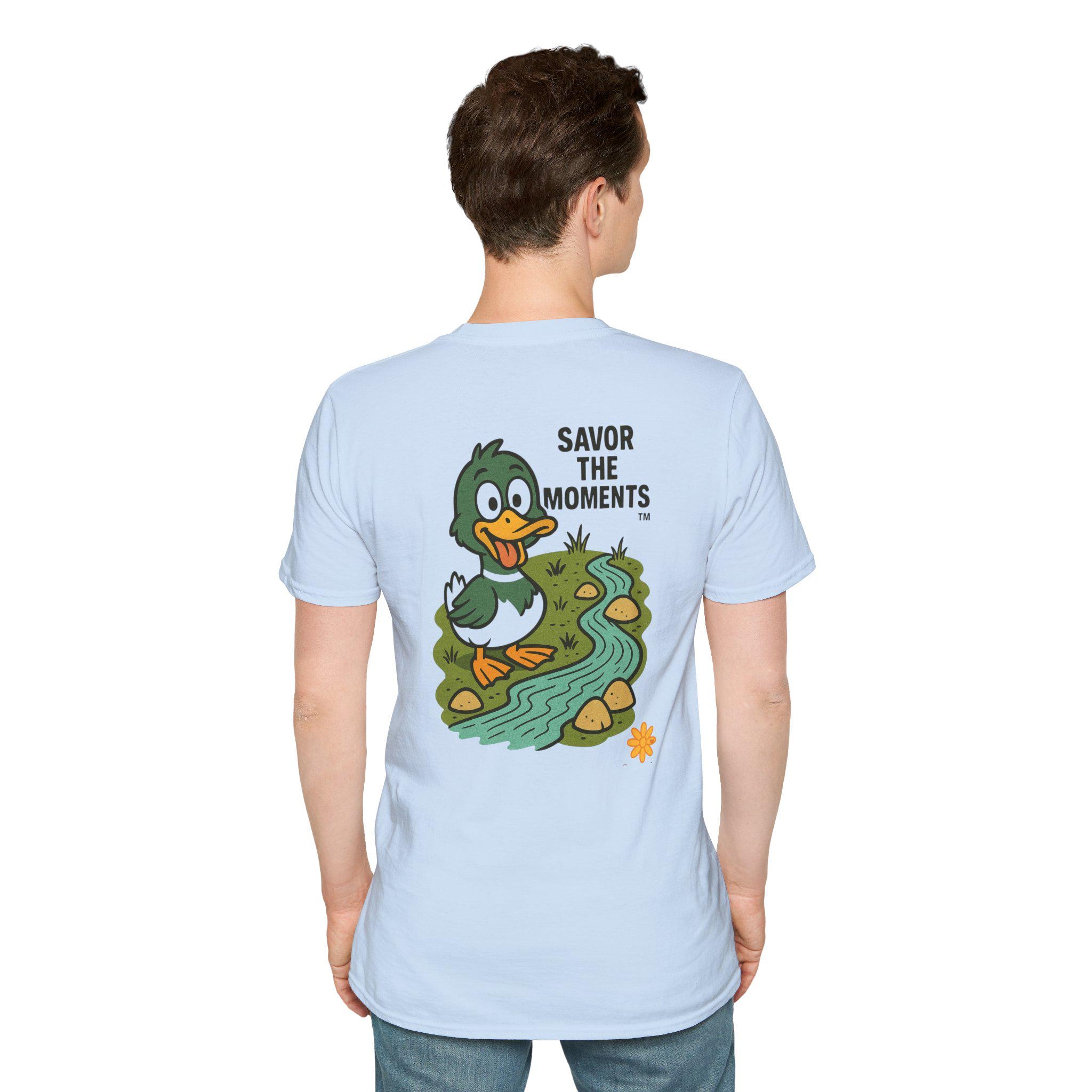 Duck illustration T-Shirt |cartoon duck by a stream, Savor the moments apparel.