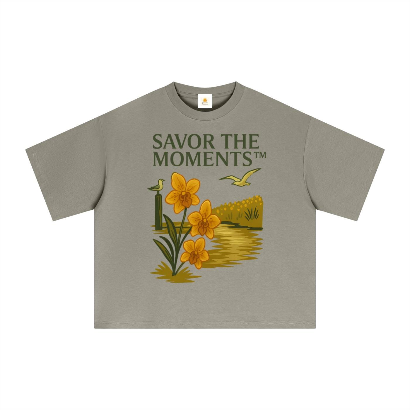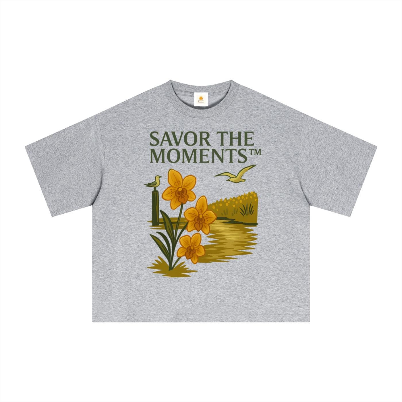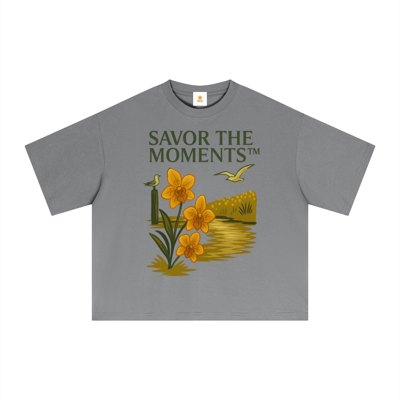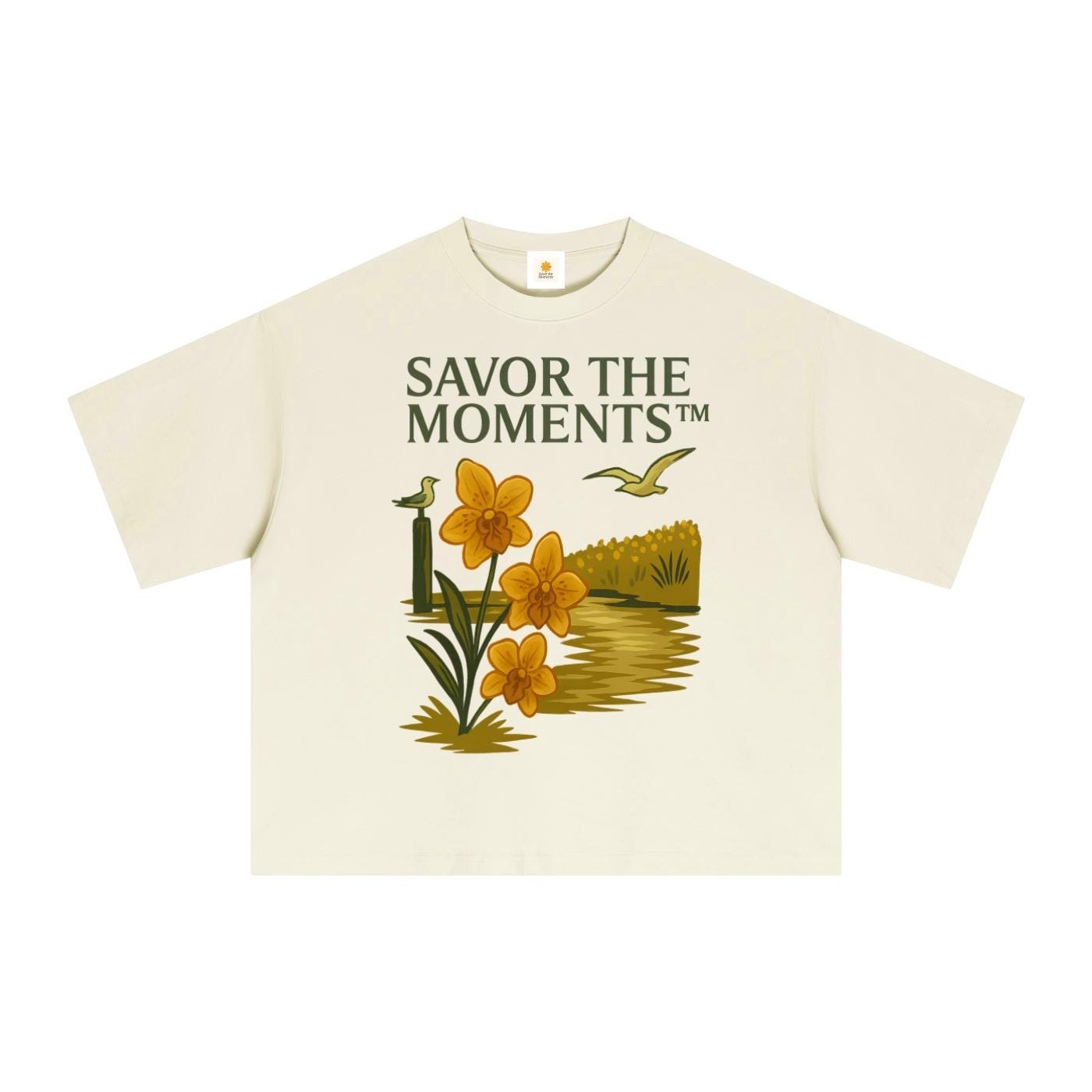 Coastal vibe, Seagulls, Orange Flowers, Essential Sorona Boxy T-Shirt