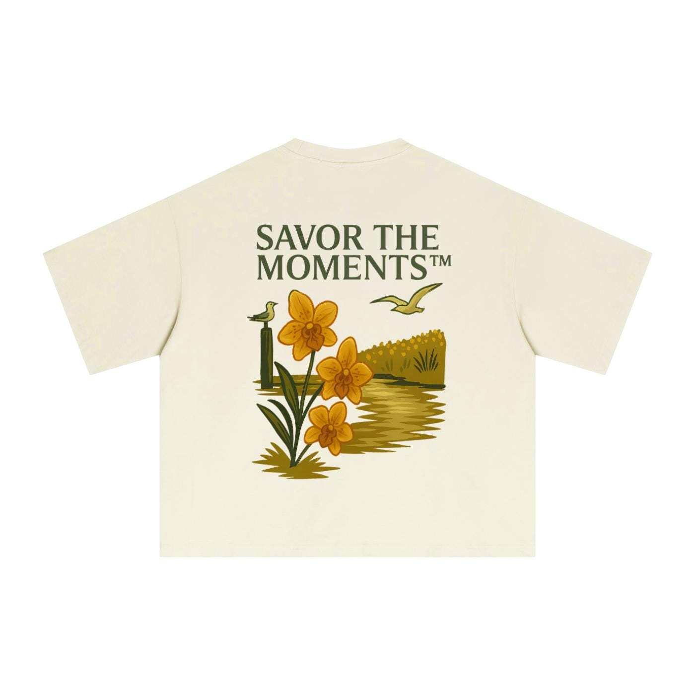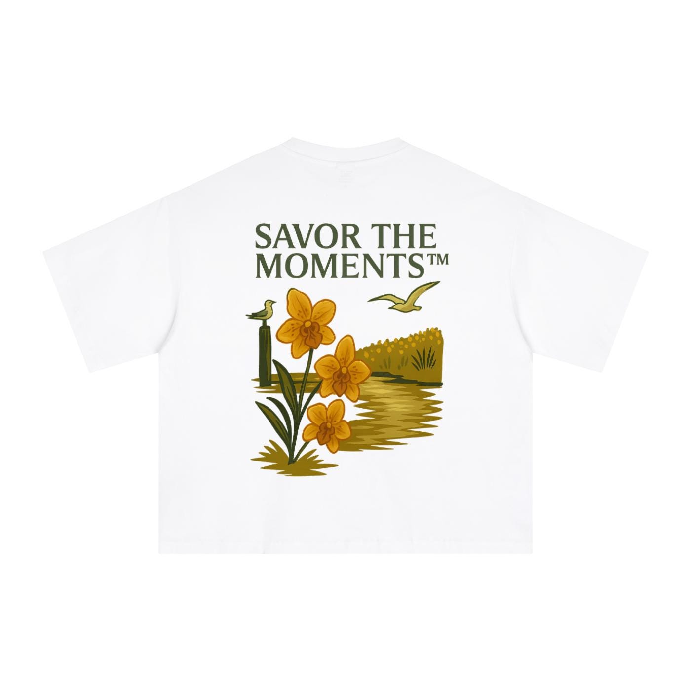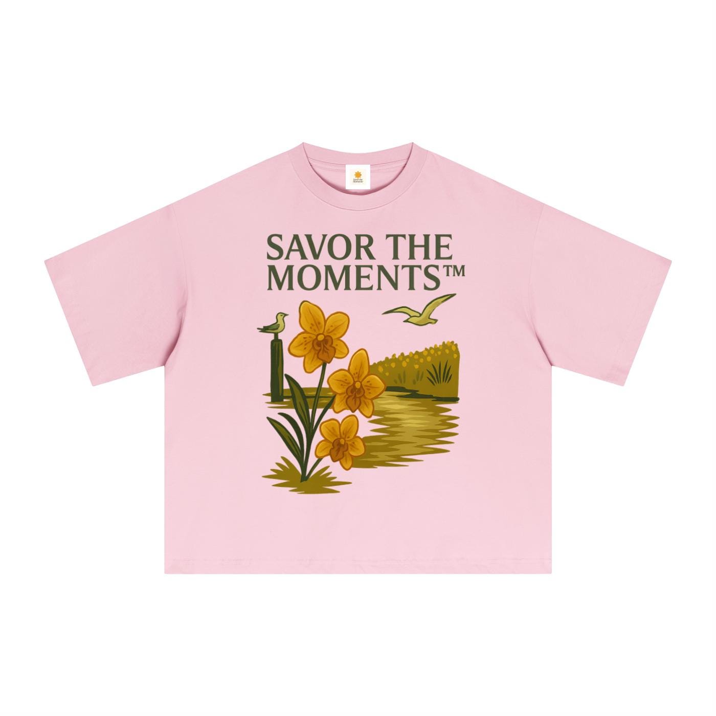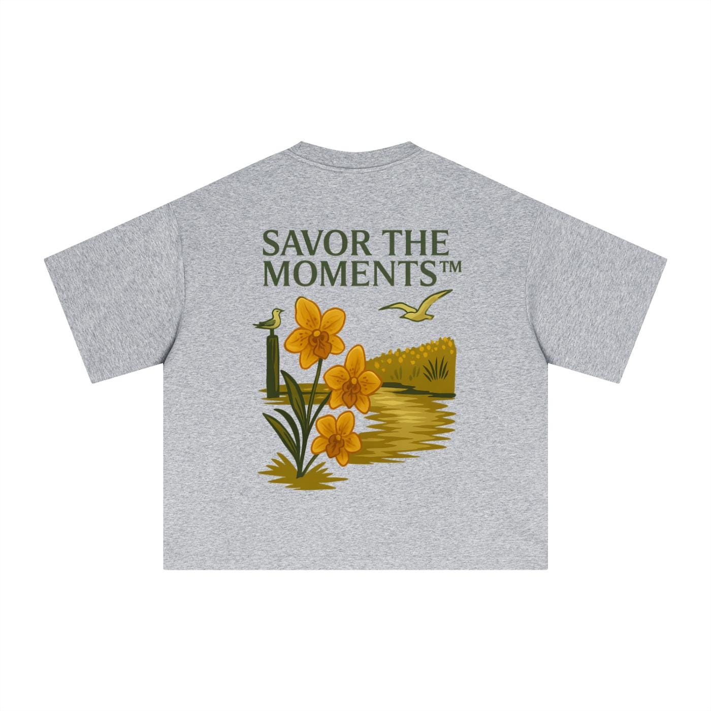 Coastal vibe, Seagulls, Orange Flowers, Essential Sorona Boxy T-Shirt