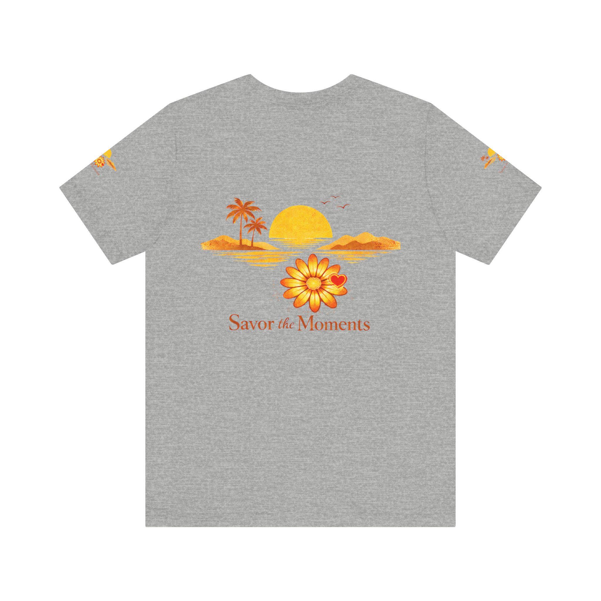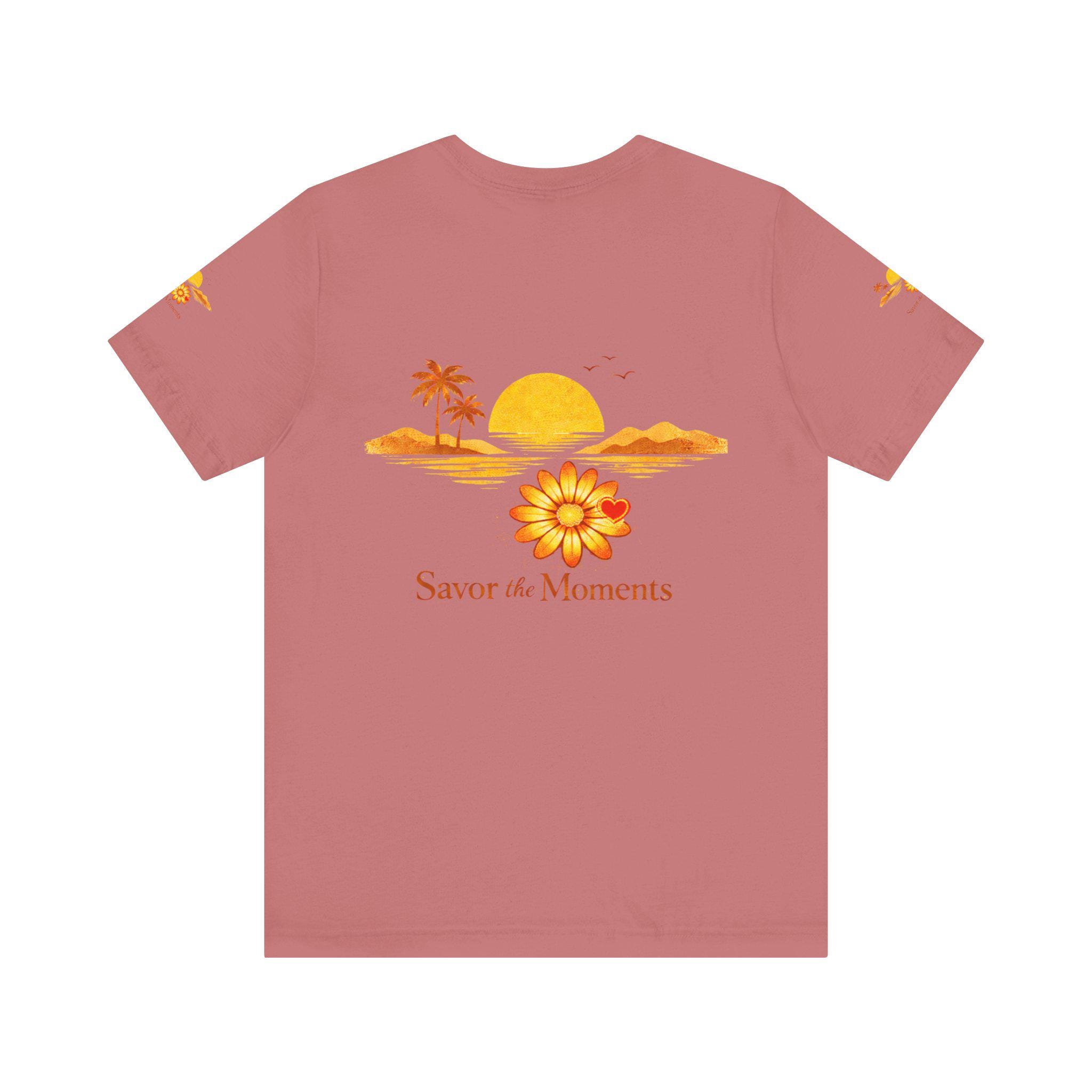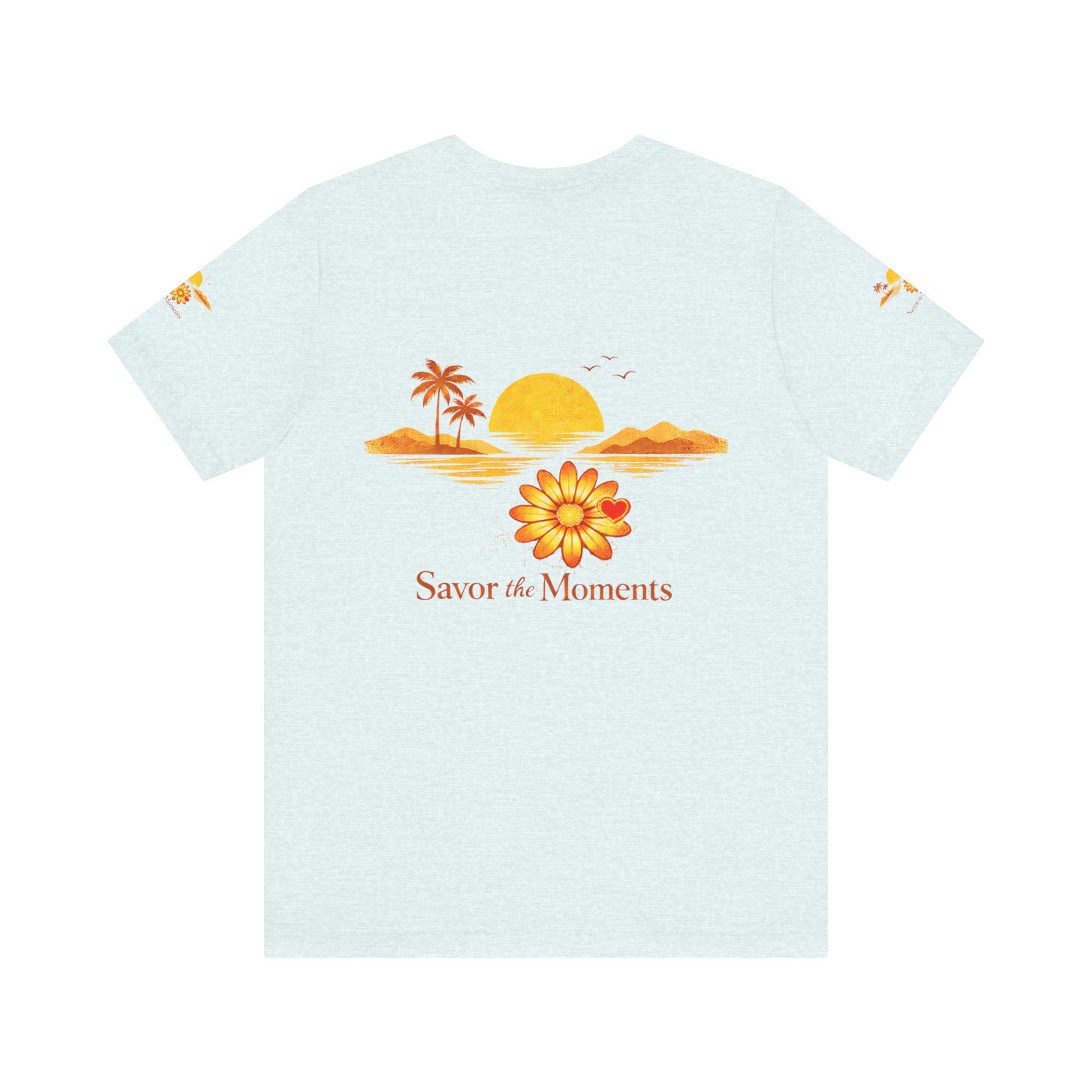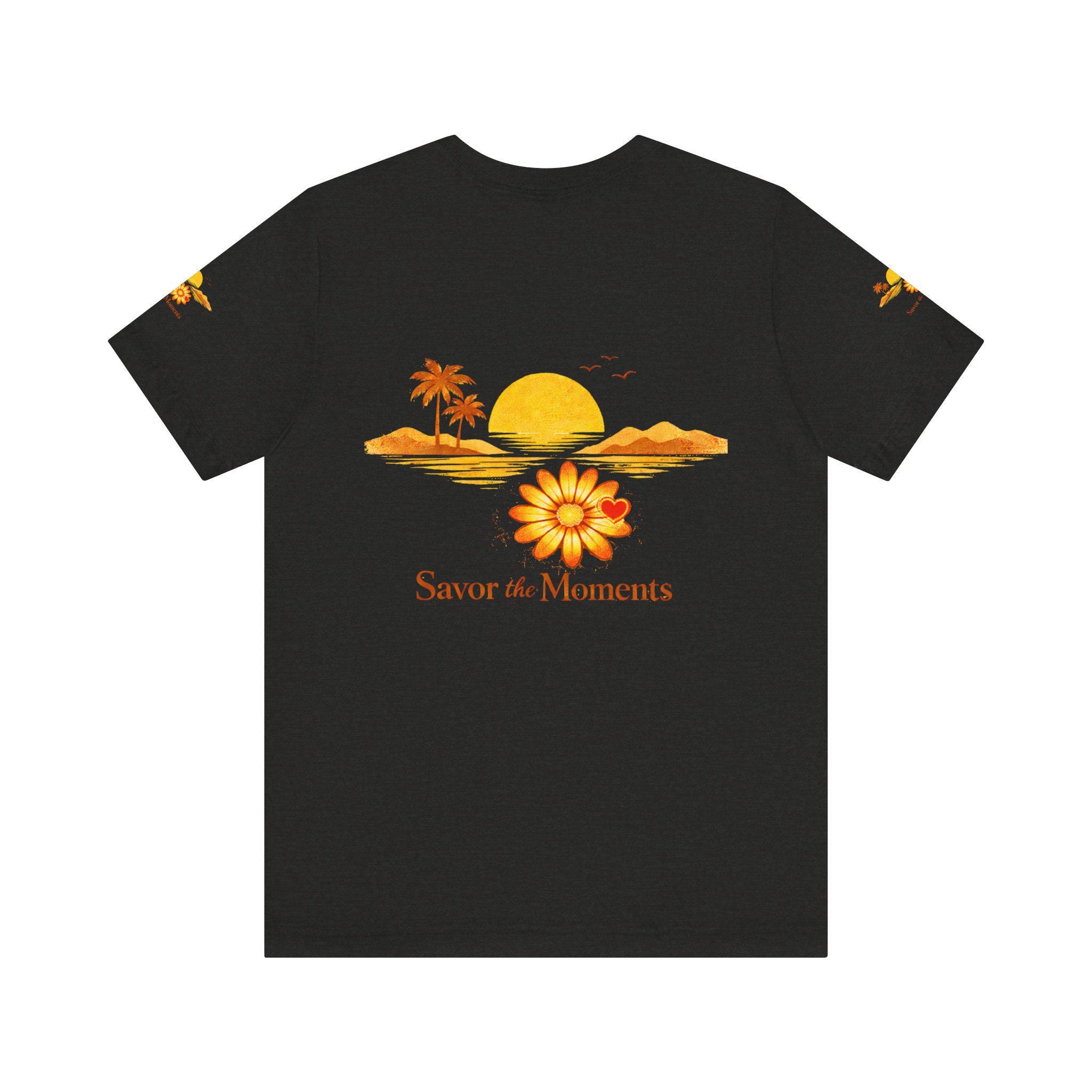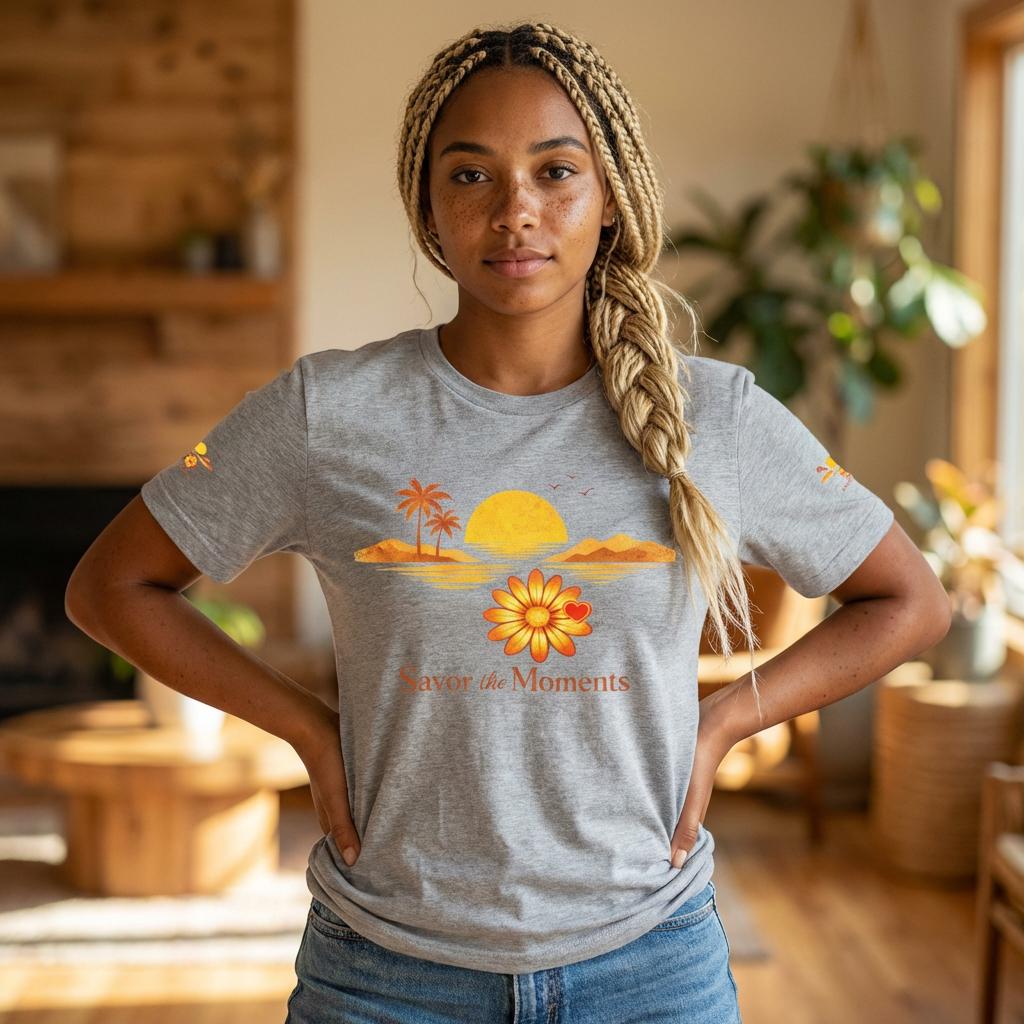 Breathe in the slow warmth of a late afternoon on the coast. This lightweight jersey tee captures a mellow sunset—golden sun, palm silhouettes, and a simple floral accent—paired with the gentle reminder: Savor the Moments. It sits neatly at the crew neck and falls with a relaxed retail fit, layering easily under jackets or worn solo while wandering boardwalks, picnicking by the water, or lounging at home. Thoughtful details like side seams, ribbed knit collar, and shoulder tape keep the shape soft but structured. Made from breathable Airlume combed and ring-spun cotton with a tear-away label for extra comfort, it’s crafted in ethically audited facilities. Reach-certified and adult-sized, the shirt’s warm palette and calm vibe invite slow afternoons and easy conversations.