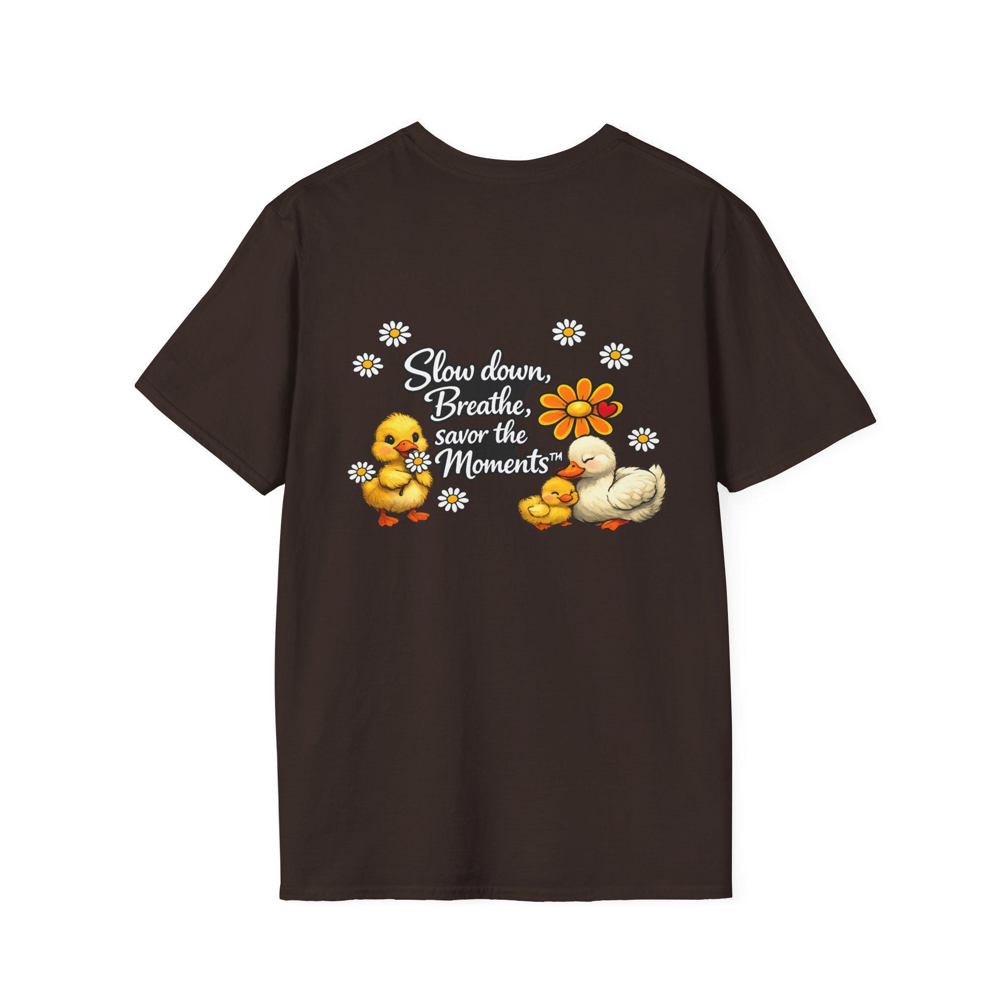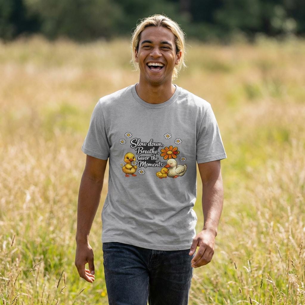 Soft, light, and quietly cheerful — this cotton tee brings a gentle reminder to slow down and savor small joys. Sweet illustrated ducklings nestle around a warm daisy, framed by tiny daisies and the hand-lettered phrase “Slow down. Breathe. Savor the Moments.” The print sits comfortably on a classic crew tee that breathes and moves with you, making it easy to wear when you want calm and a little smile in your day. It layers well under jackets or pairs with relaxed jeans for casual mornings, walks in the park, or calm weekends at home. Subtle natural flecks in the undyed option give the shirt an organic, lived-in feel that suits quiet, mindful wardrobes.