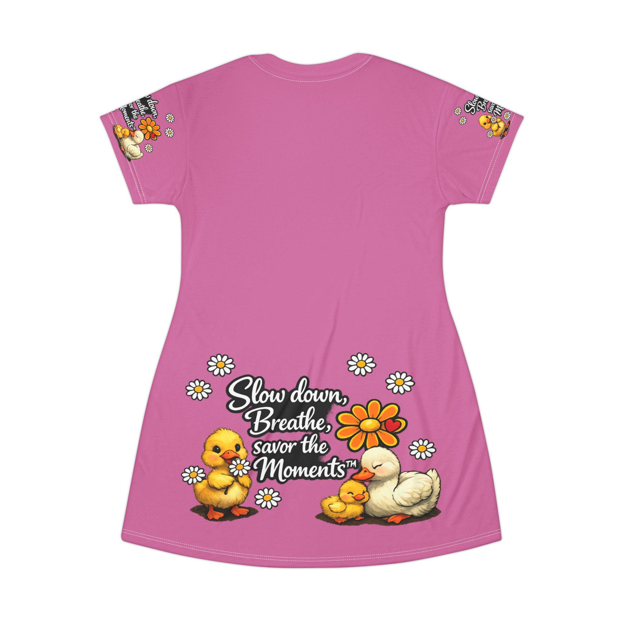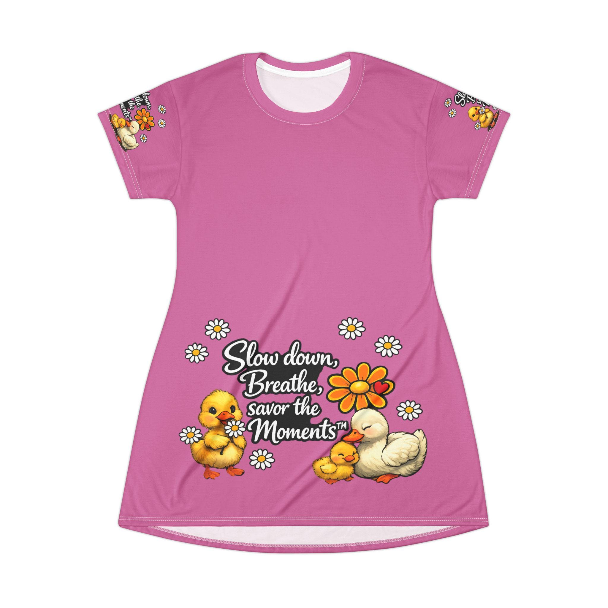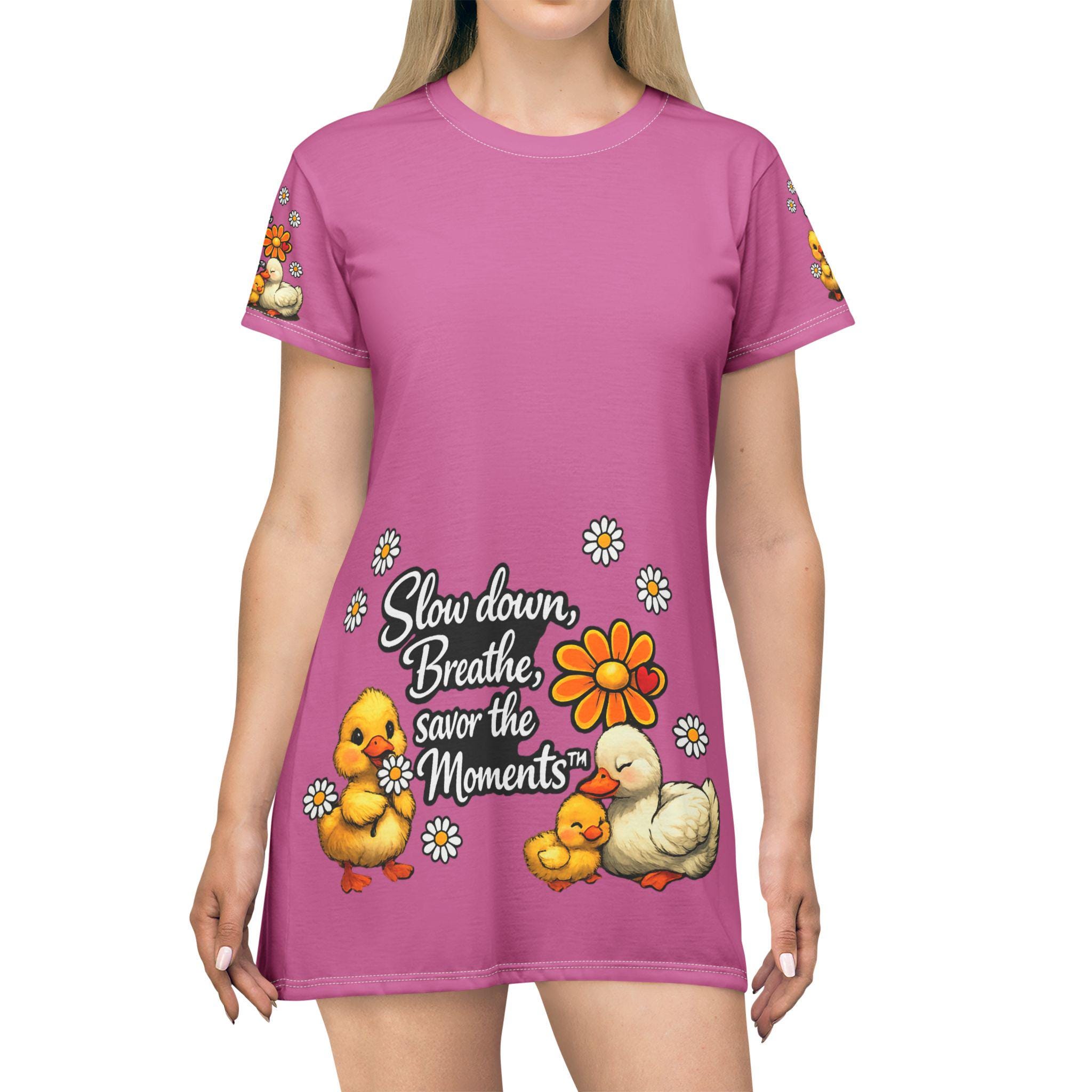Soft, cheerful, and light as a spring afternoon — this printed dress brings a gentle reminder to slow down and savor small joys. The vivid pink canvas showcases a cluster of sweet ducklings, daisies, and a warm hand-lettered sentiment that feels like a friendly nudge to breathe. Wear it on easy mornings with bare feet in the garden or layered over leggings for a cozy afternoon of crafting and tea. The breezy fabric and relaxed A-line shape let you move without fuss, while the bright, uplifting artwork keeps the mood playful and calm.