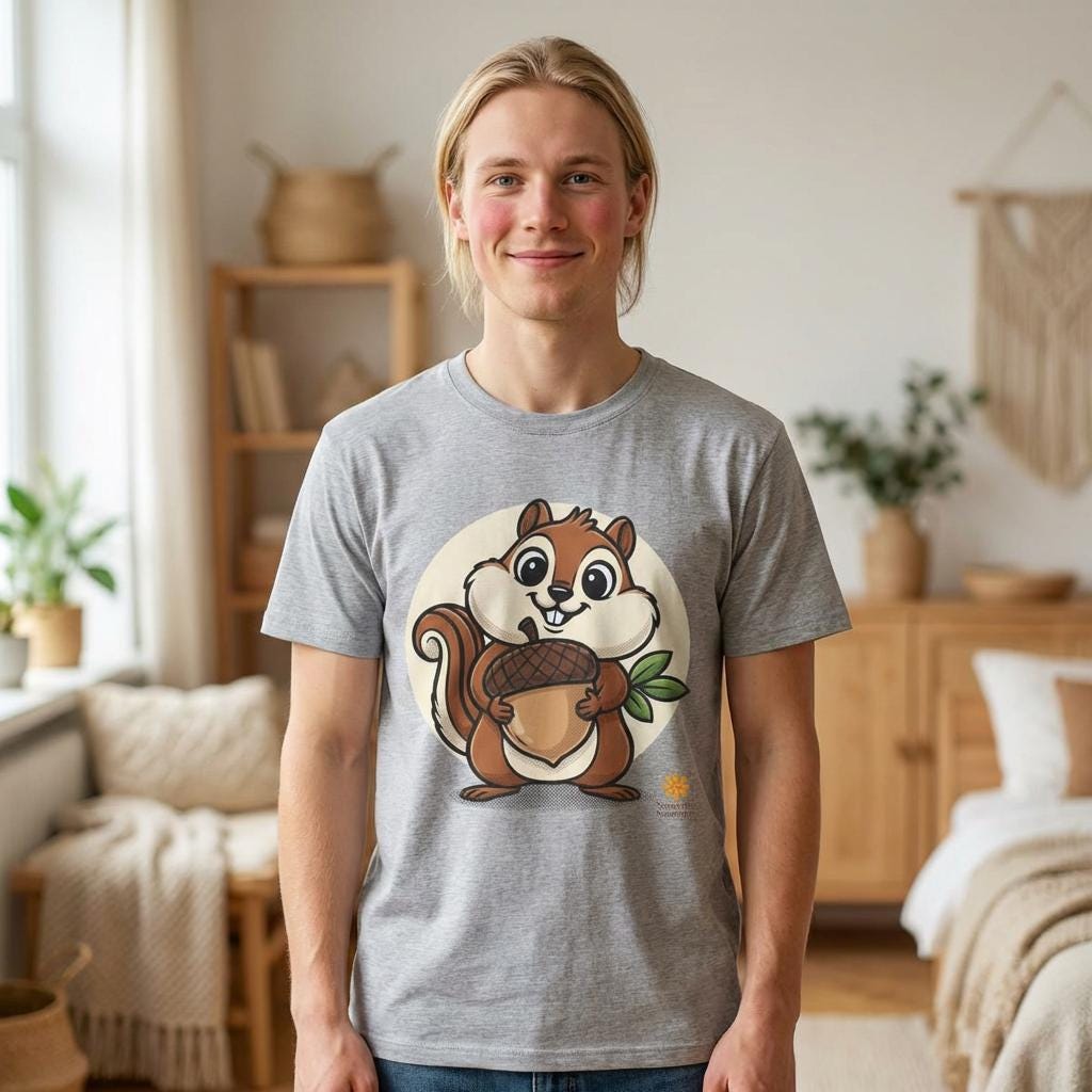 This lightweight cotton tee carries a playful woodland vibe—an adorable chipmunk cradling a giant acorn against a soft circular backdrop. It feels like a warm laugh on a cool morning: easy to wear, simple to style, and instantly nostalgic. The illustration reads as hand-drawn and friendly, so the shirt works well layered under a flannel on nature walks, or worn solo for a casual coffee run. The crew neckline and classic fit keep the silhouette clean while the soft fabric and tear-away label keep you comfortable all day. It’s the kind of shirt that sparks smiles and starts conversations—great for folks who love low-key outdoor charm and cute, whimsical art.