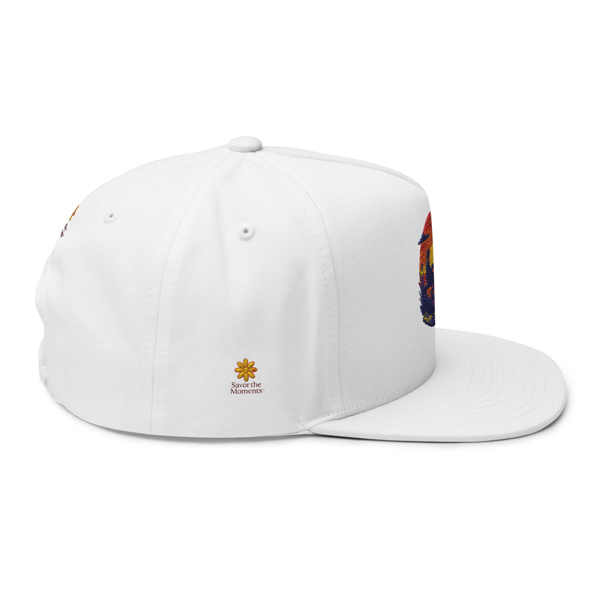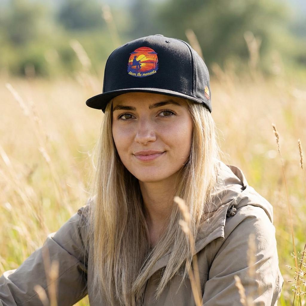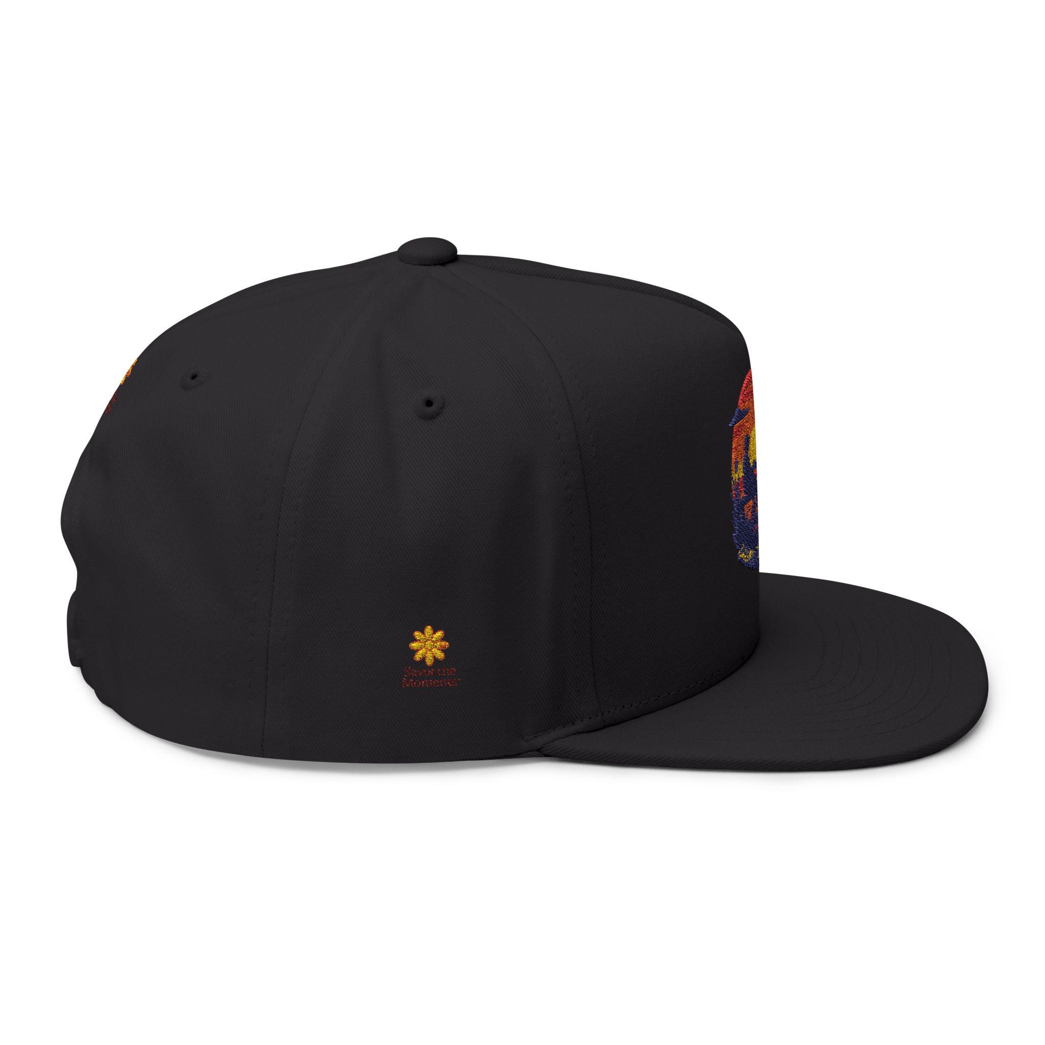 Sunset threads meet slow-paced afternoons. This structured flat bill cap carries an embroidered sunset scene—warm oranges and deep indigo stitched into a circular vignette—paired with a small emblem at the back. It feels vintage yet deliberate: the high-profile, five-panel shape gives presence, the green under visor adds that old-school baseball vibe, and the cotton twill softens with every wear. Wear it on long drives, market Saturdays, or evening walks when the light finally leans golden. The adjustable snap lets you share it, trade it, or hand it down, while the sewn eyelets keep air moving when the day heats up. It’s for people who collect quiet moments and want a little sun-caught color on their head as they do it.