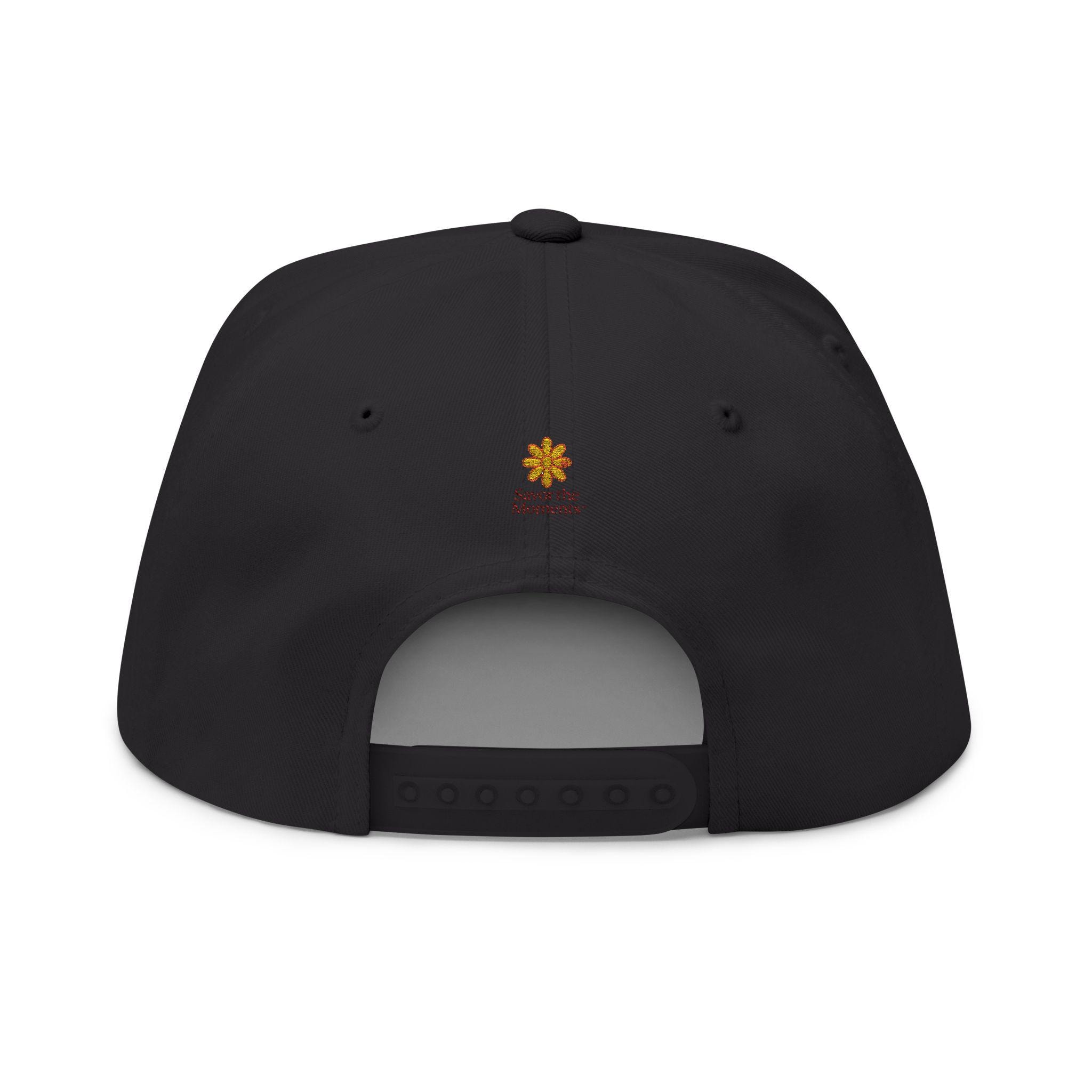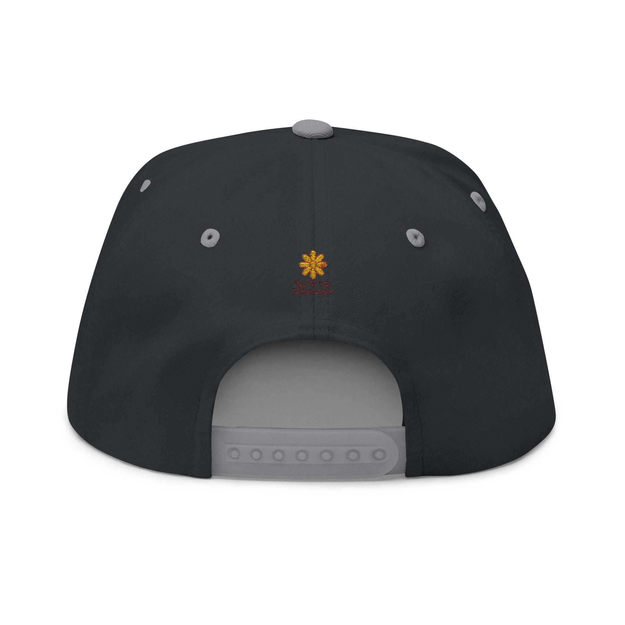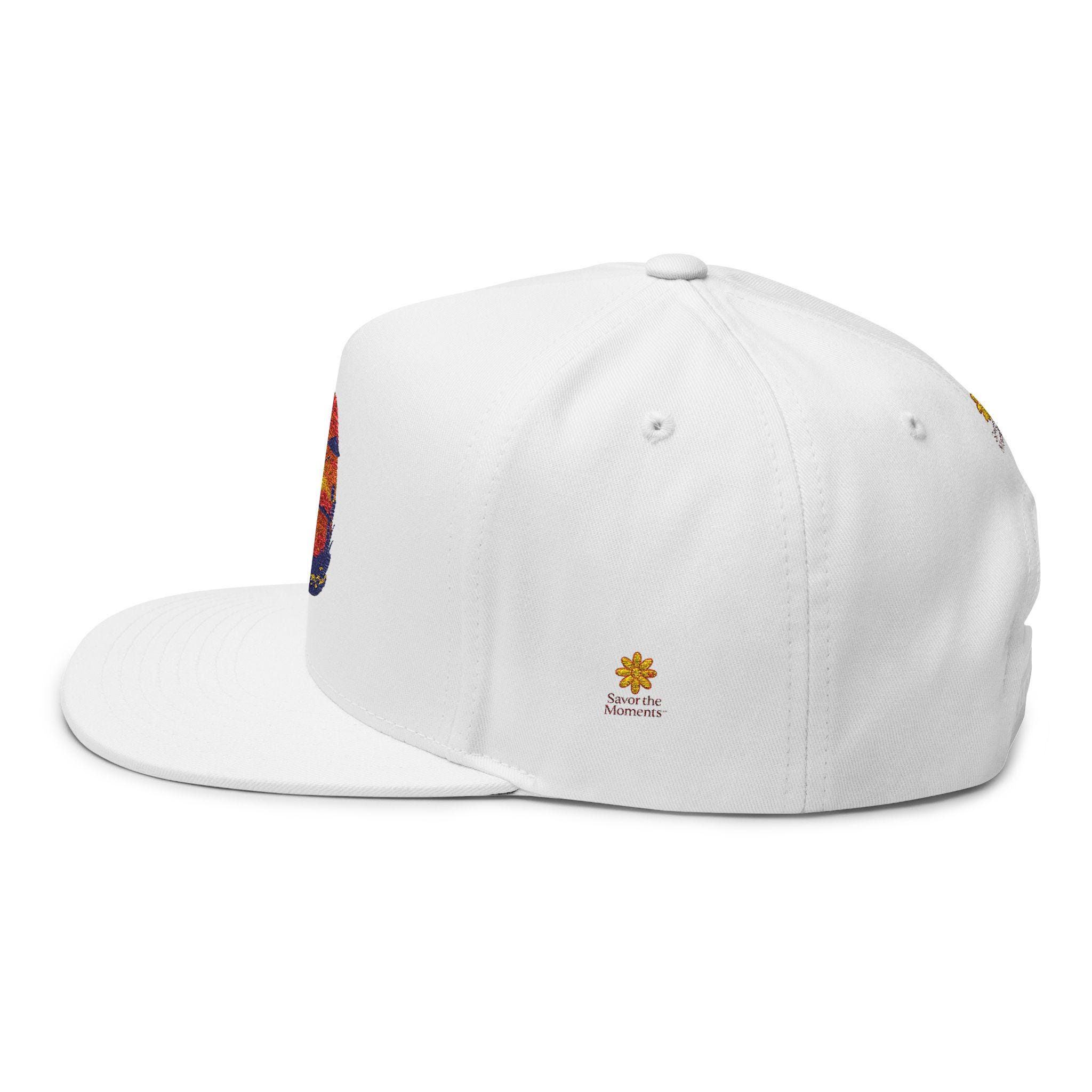 Sunset threads meet slow-paced afternoons. This structured flat bill cap carries an embroidered sunset scene—warm oranges and deep indigo stitched into a circular vignette—paired with a small emblem at the back. It feels vintage yet deliberate: the high-profile, five-panel shape gives presence, the green under visor adds that old-school baseball vibe, and the cotton twill softens with every wear. Wear it on long drives, market Saturdays, or evening walks when the light finally leans golden. The adjustable snap lets you share it, trade it, or hand it down, while the sewn eyelets keep air moving when the day heats up. It’s for people who collect quiet moments and want a little sun-caught color on their head as they do it.