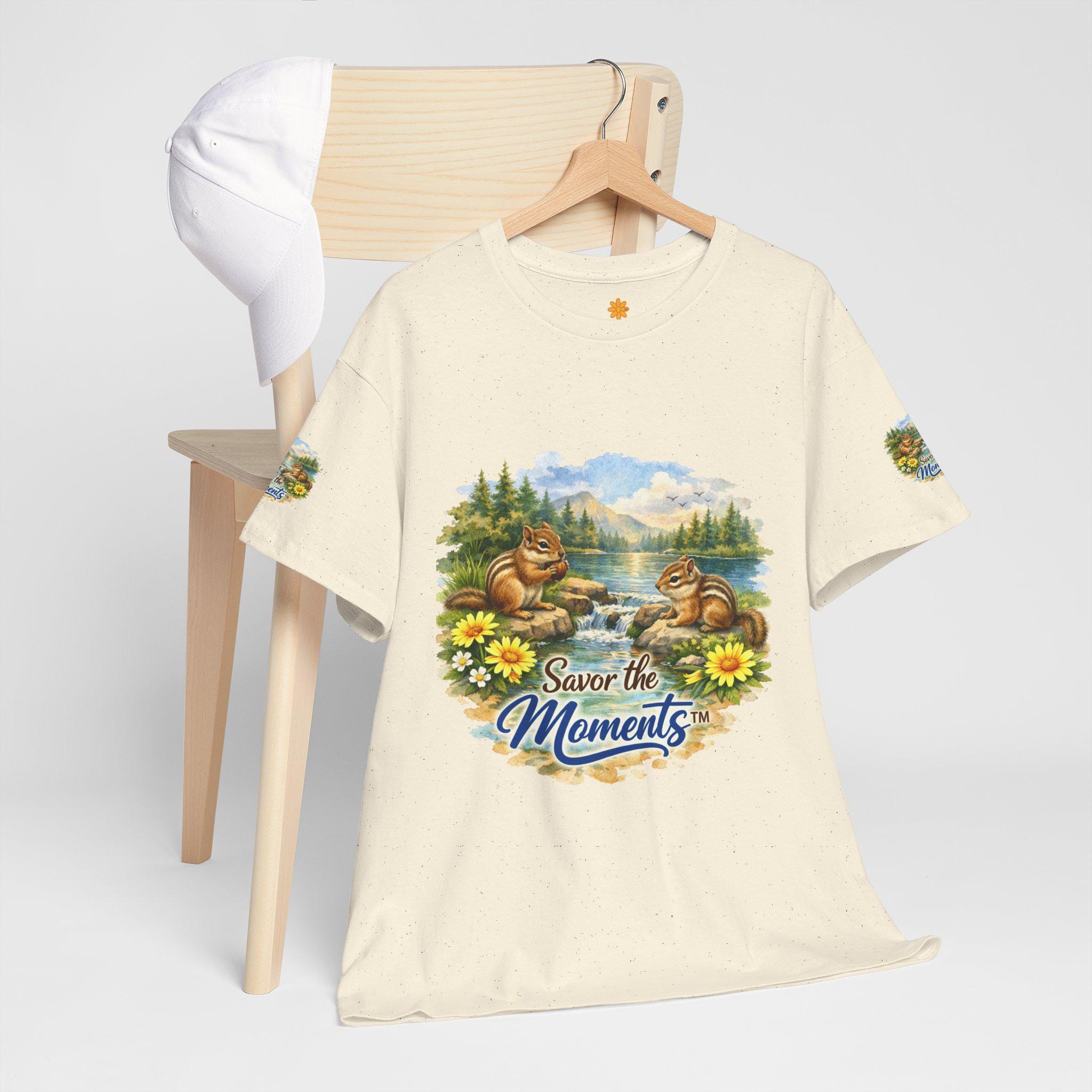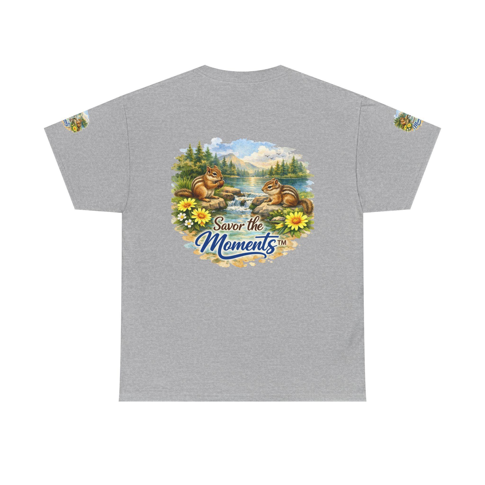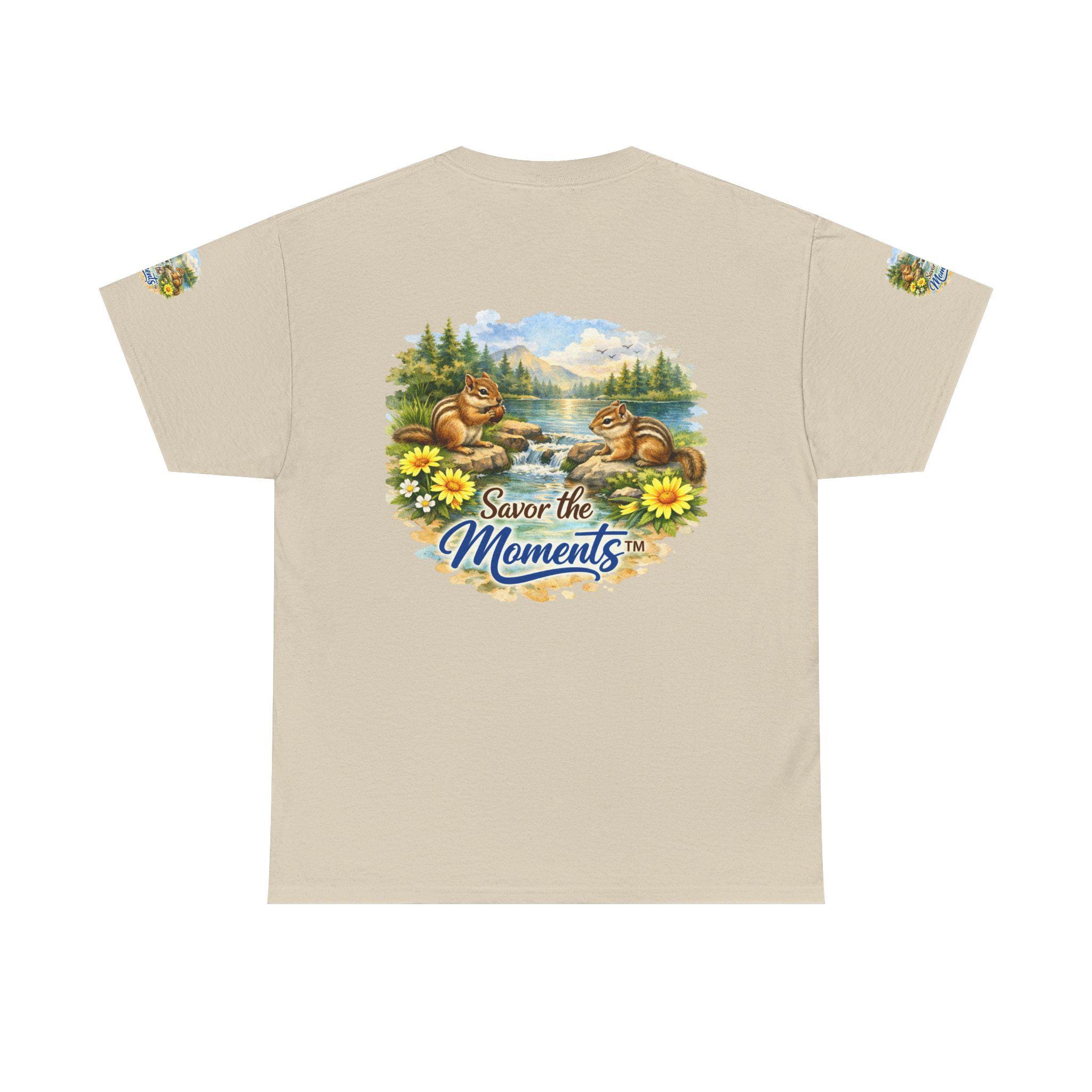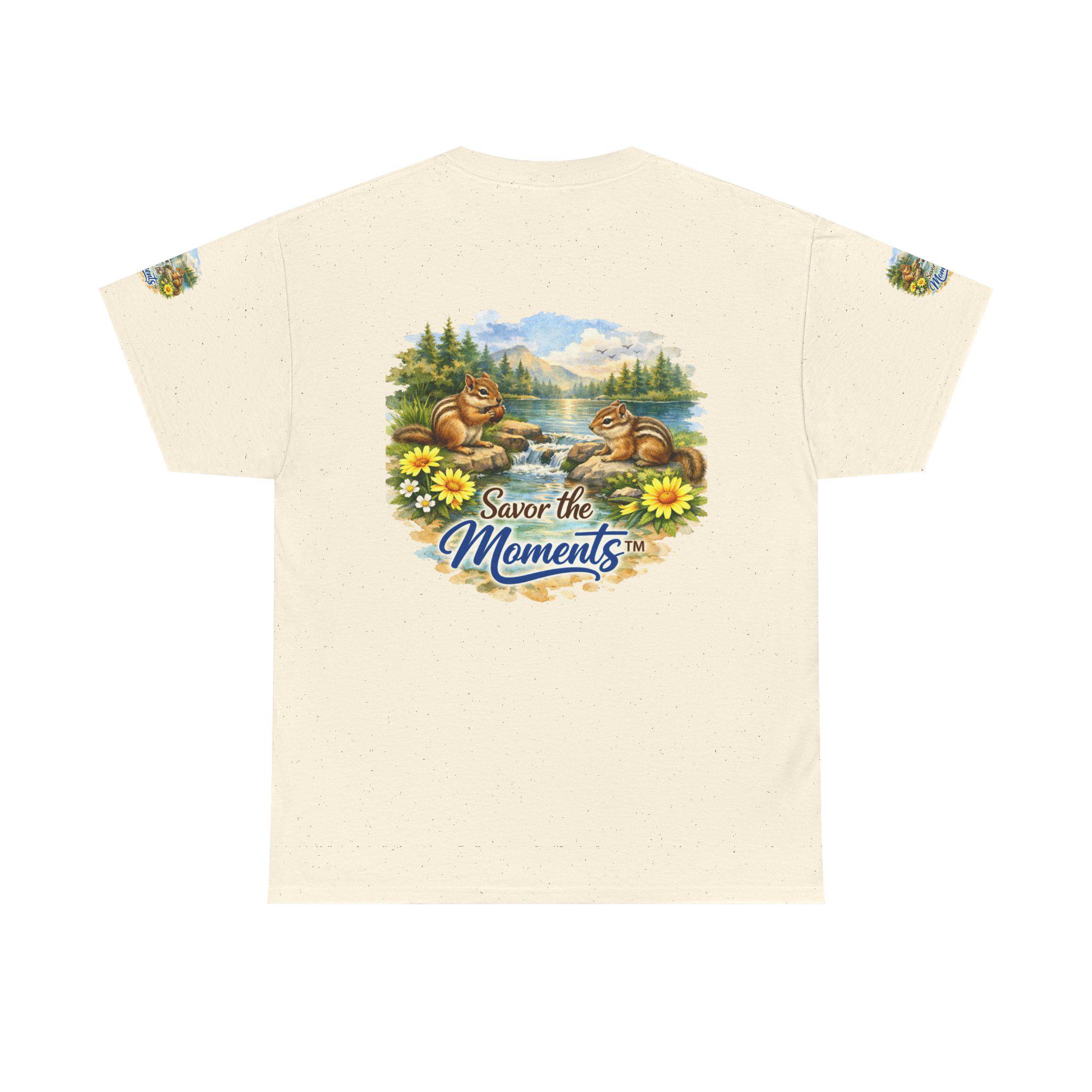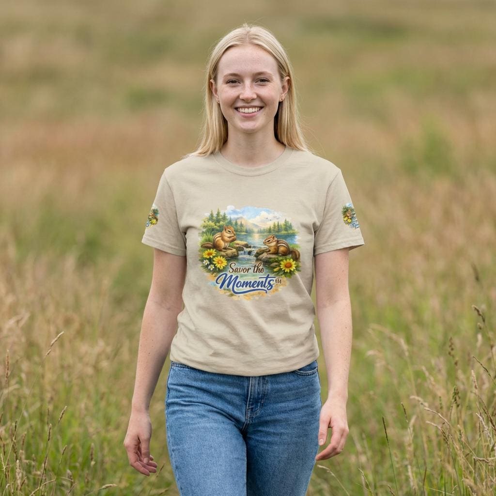 Soft, breathable cotton with a cozy classic fit — this tee brings a quiet, nostalgic scene to everyday wear. Two chipmunks lounge by a sunlit lakeshore, framed by wildflowers and pine trees, with the gentle phrase “Savor the Moments” woven into the art. The print sits on the chest and repeats subtly on each sleeve, so the calm, outdoor vibe reads from every angle. Wear it on slow mornings, trail-side breaks, or backyard gatherings when you want clothing that whispers of easy afternoons and small joys. The medium-weight fabric holds its shape, the ribbed collar stays neat, and the tear-away label keeps the back of your neck comfortable. Ethically grown U.S. cotton and durable printing methods mean the scene keeps its color and detail through many washes, so the memory it conjures lasts as long as the tee does.