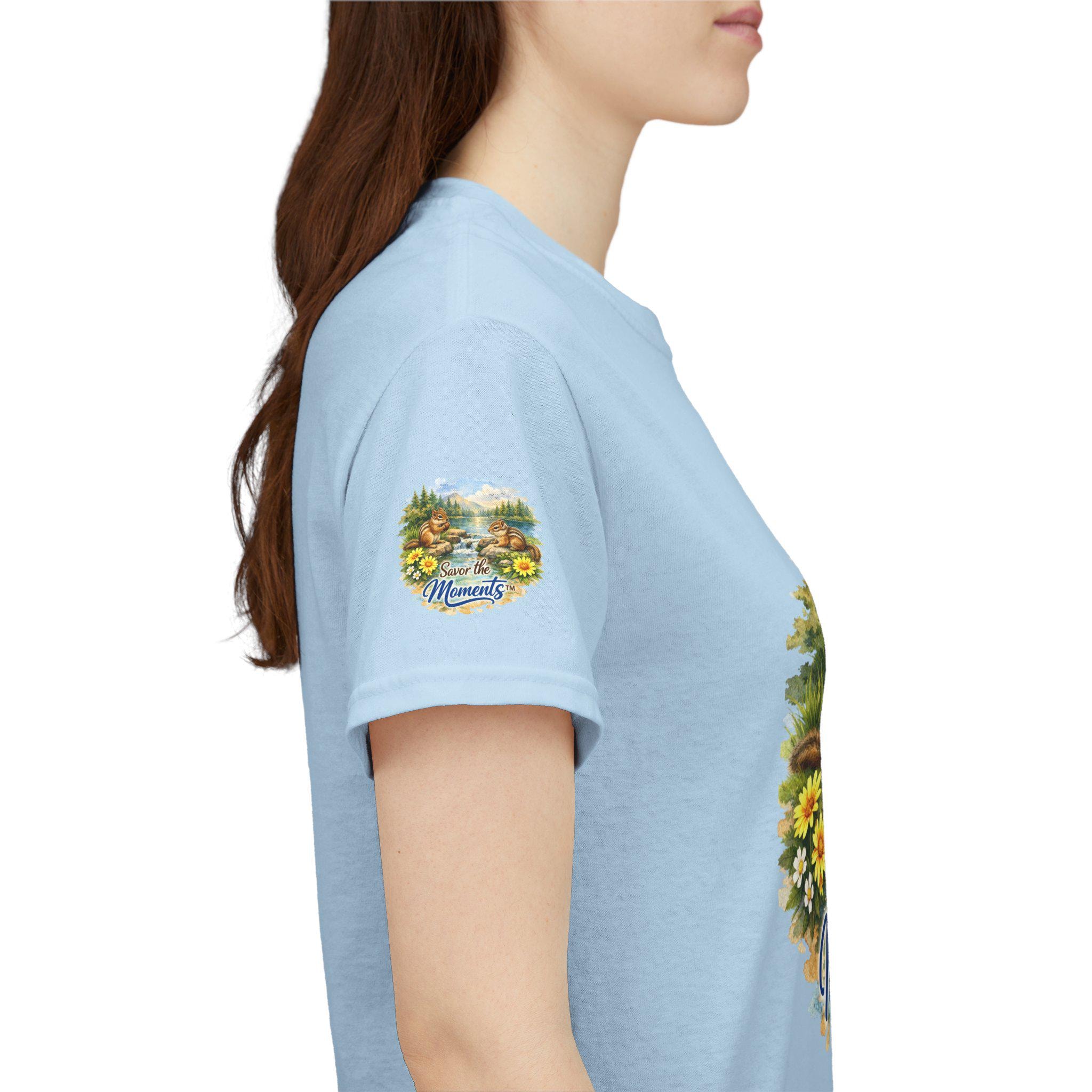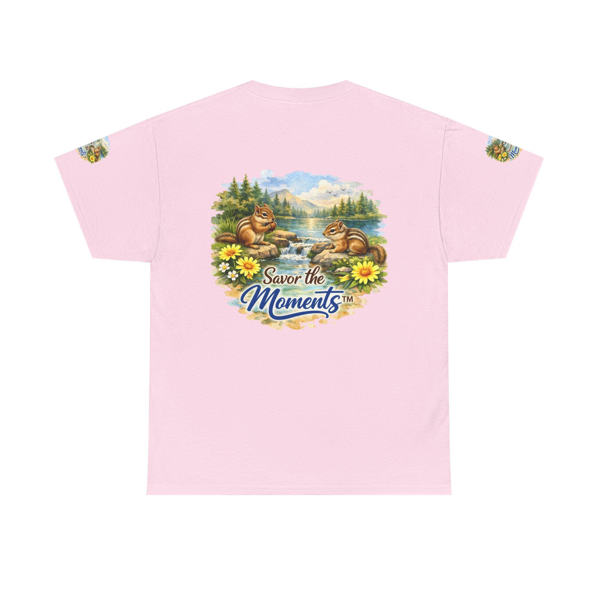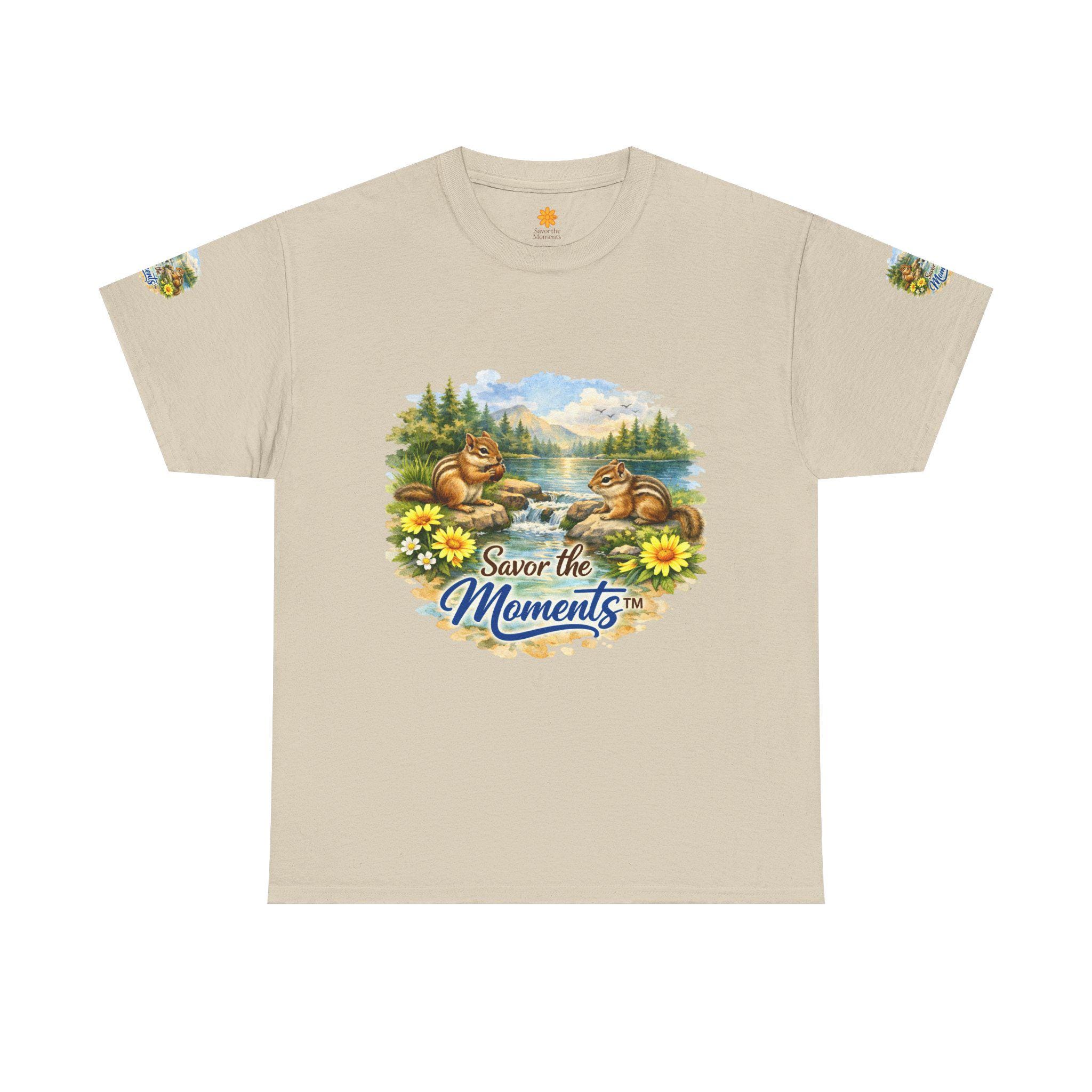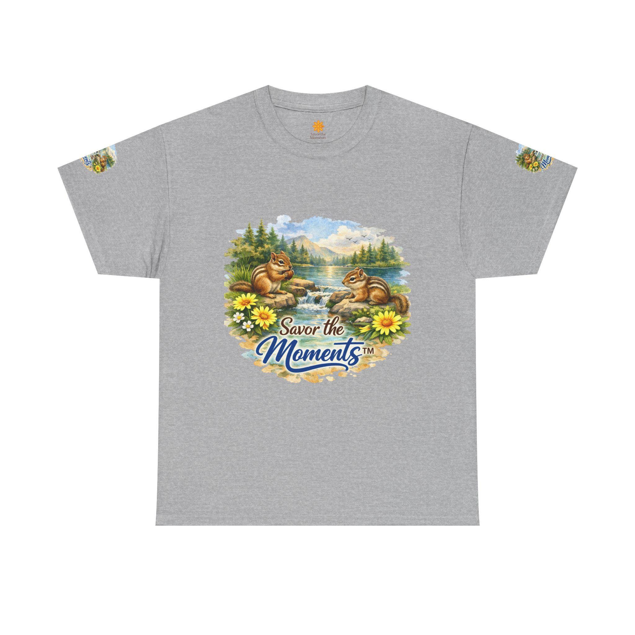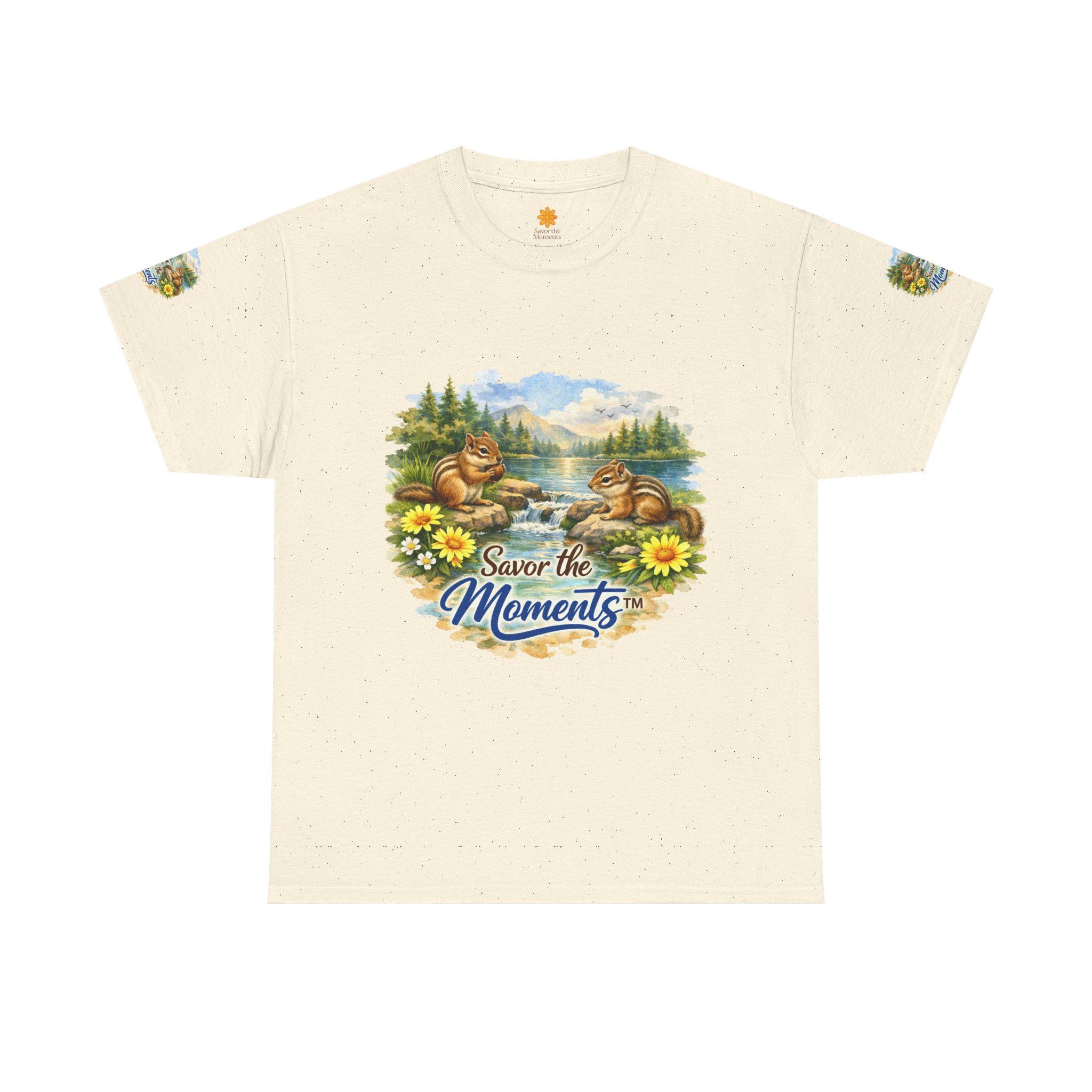 Soft, breathable cotton with a cozy classic fit — this tee brings a quiet, nostalgic scene to everyday wear. Two chipmunks lounge by a sunlit lakeshore, framed by wildflowers and pine trees, with the gentle phrase “Savor the Moments” woven into the art. The print sits on the chest and repeats subtly on each sleeve, so the calm, outdoor vibe reads from every angle. Wear it on slow mornings, trail-side breaks, or backyard gatherings when you want clothing that whispers of easy afternoons and small joys. The medium-weight fabric holds its shape, the ribbed collar stays neat, and the tear-away label keeps the back of your neck comfortable. Ethically grown U.S. cotton and durable printing methods mean the scene keeps its color and detail through many washes, so the memory it conjures lasts as long as the tee does.