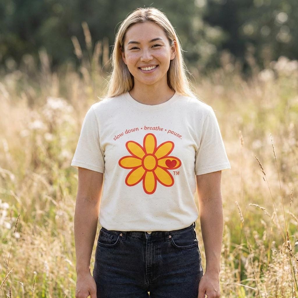 This lightweight cotton tee carries a gentle, sunny reminder to slow down. A bold, retro-inspired daisy sits at the center in warm yellow and orange tones, with a small heart accent—above it, the words “slow down • breathe • pause” arc like a calm breath. The classic crewneck and smooth ring-spun cotton feel soft against skin, while tubular construction and shoulder taping keep the silhouette neat through repeated wear. Wear it on morning walks, quiet coffee breaks, or long travel days to anchor a calmer pace and share a friendly, gentle vibe.