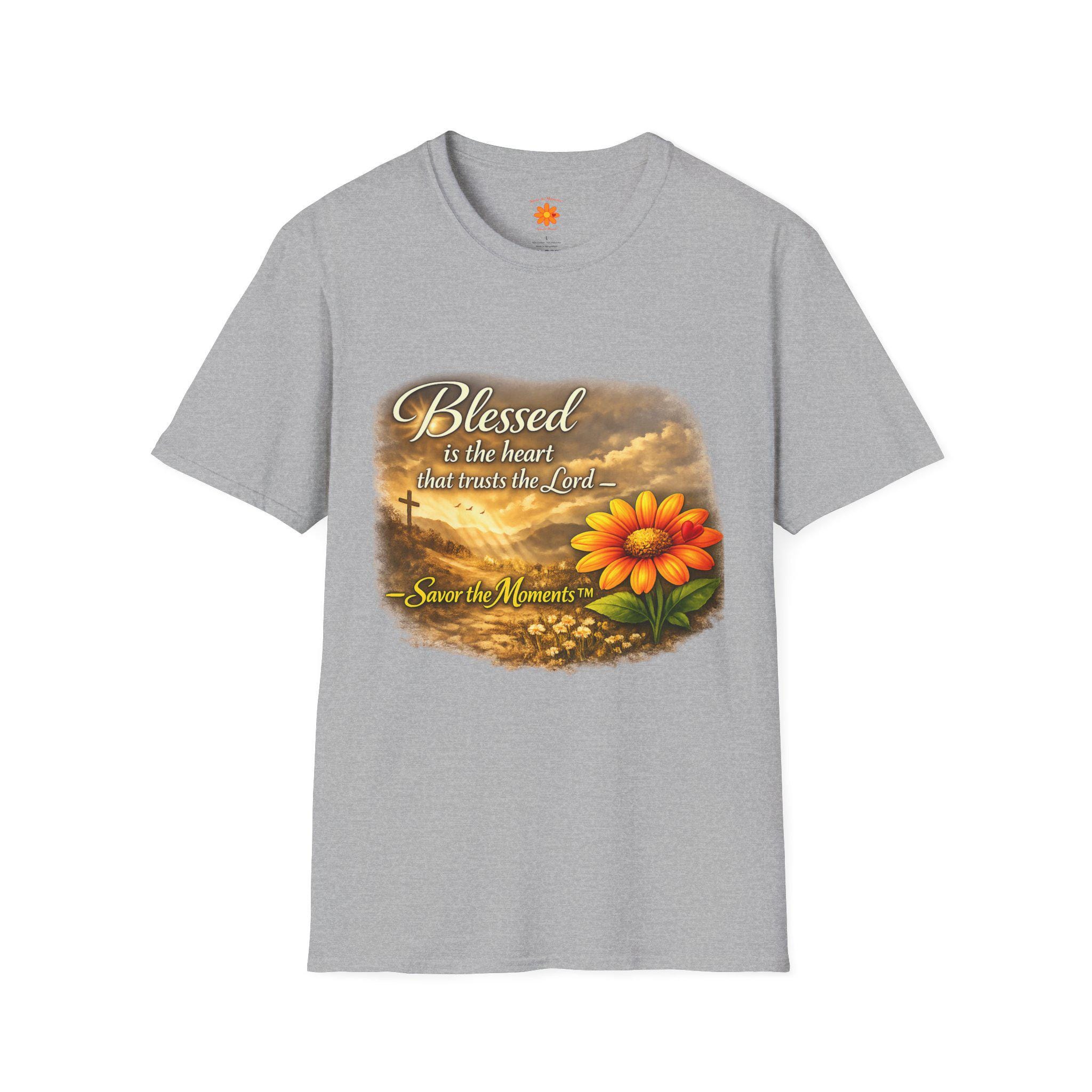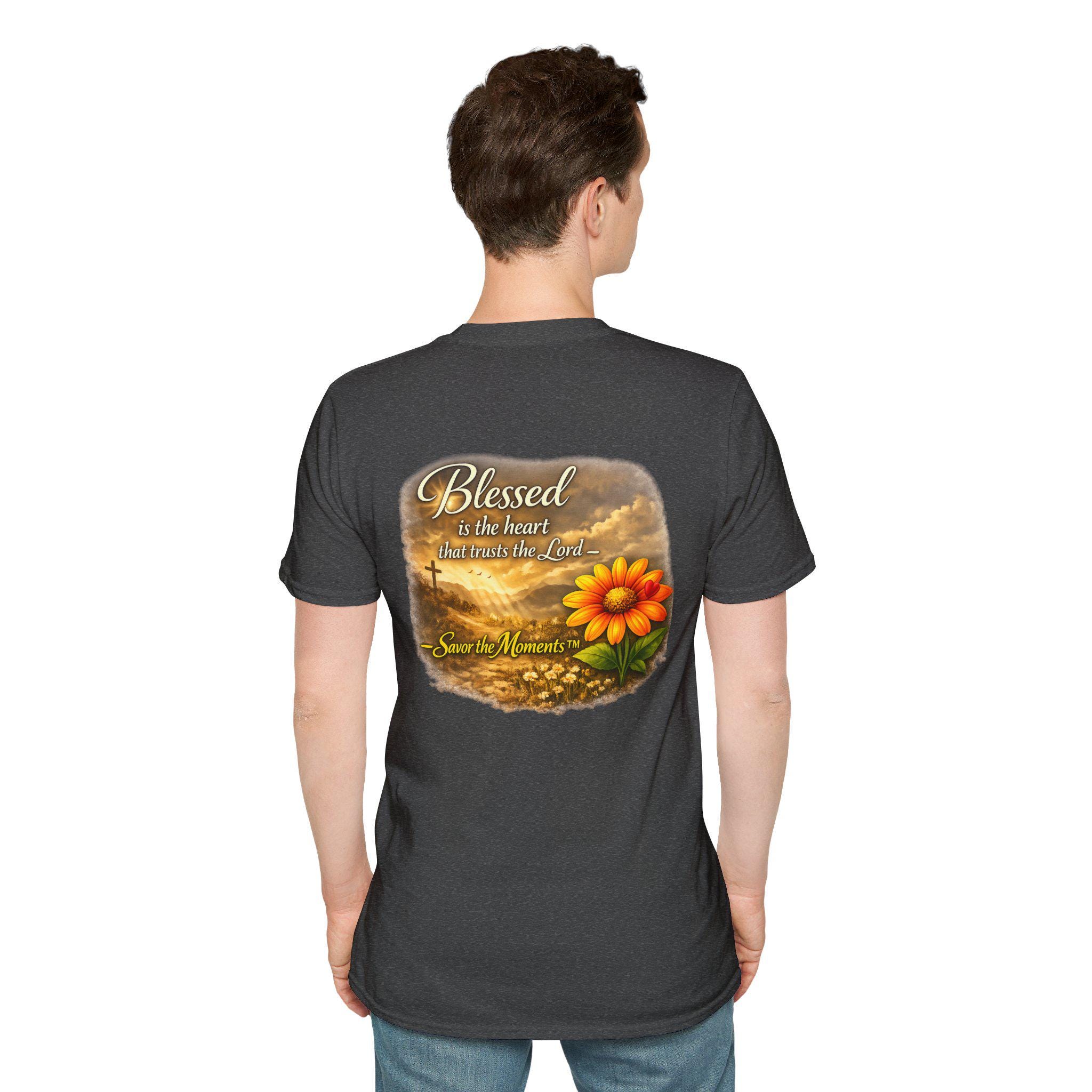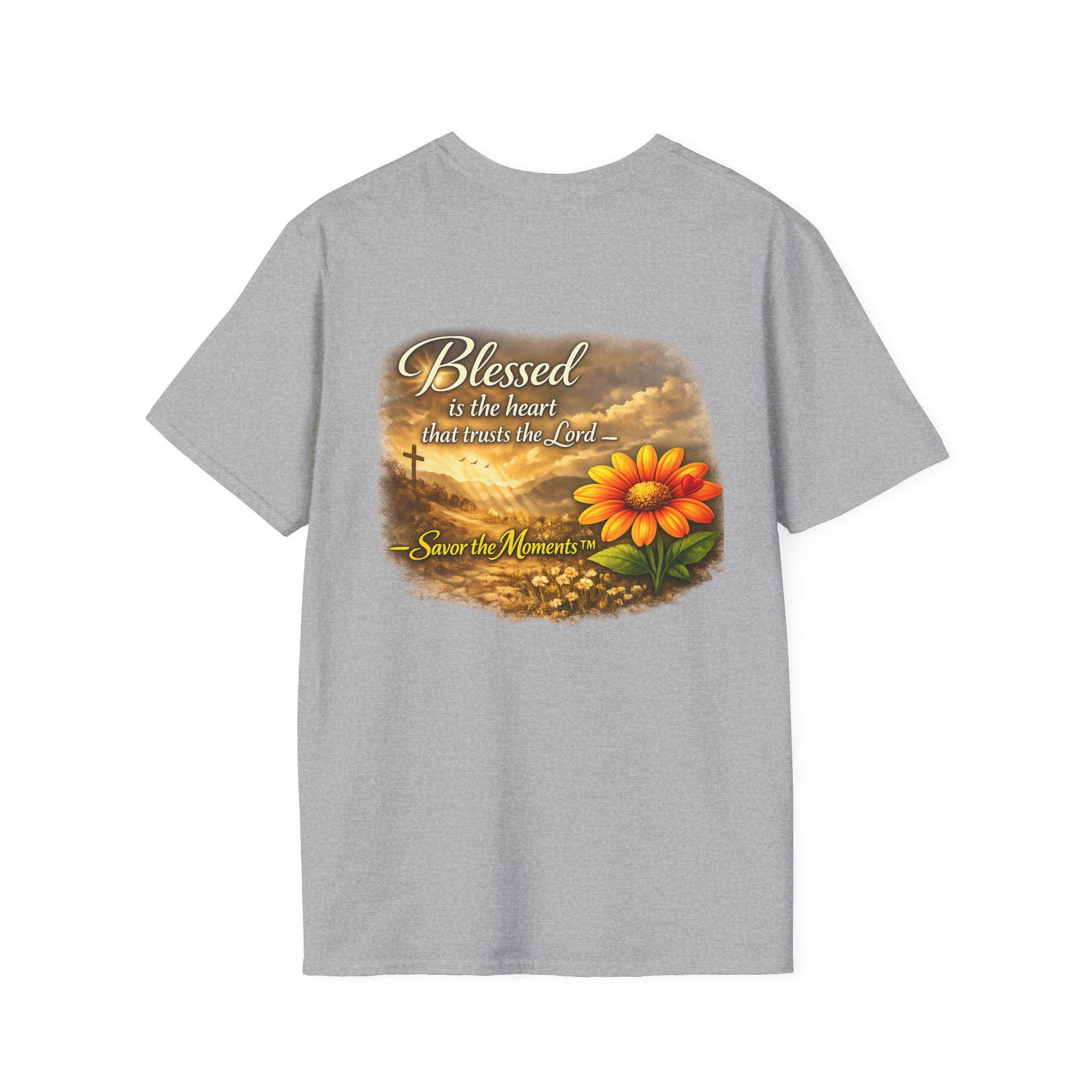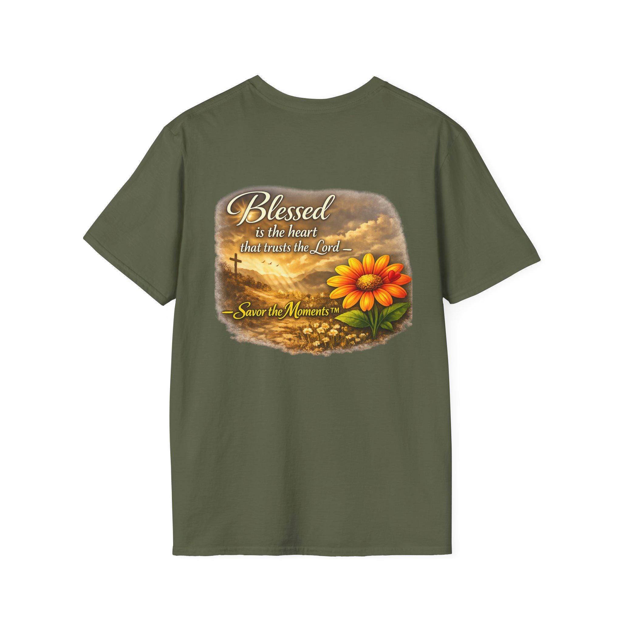 A lightweight, breathable tee that carries a gentle message of faith and gratitude. Soft ring-spun cotton gives a smooth, lived-in feel while the warm sunset artwork — a glowing bloom set against a cross and rolling clouds — brings calm and reflection to everyday wear. It slips easily into a quiet morning routine, a casual church gathering, or an afternoon spent visiting loved ones. The design reads like a small reminder to pause and savor the moment, blending wearable comfort with a quietly devotional style.