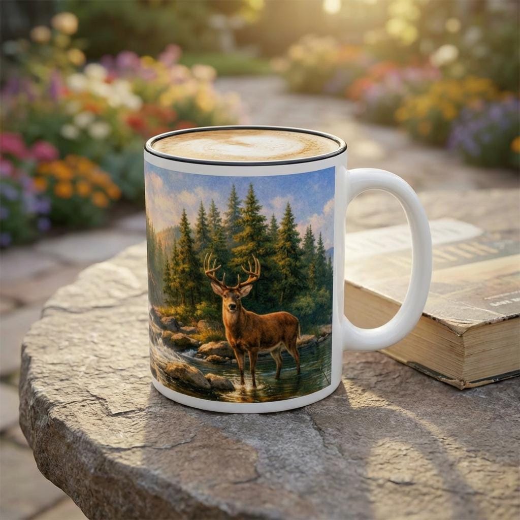 Morning light filters through firs, steam rising from a warm cup as a majestic stag stands at the water’s edge. This ceramic accent-rim mug brings that quiet forest scene to your table — rich, painterly colors wrap around the surface so every sip feels like a small woodland escape. The black rim and handle add a refined contrast that highlights the art while keeping the mug comfortable to hold. Use it during slow mornings, while sketching, or as a companion on a nature journal session — it’s made to settle into the rituals of people who love the outdoors and the calm that comes with it.