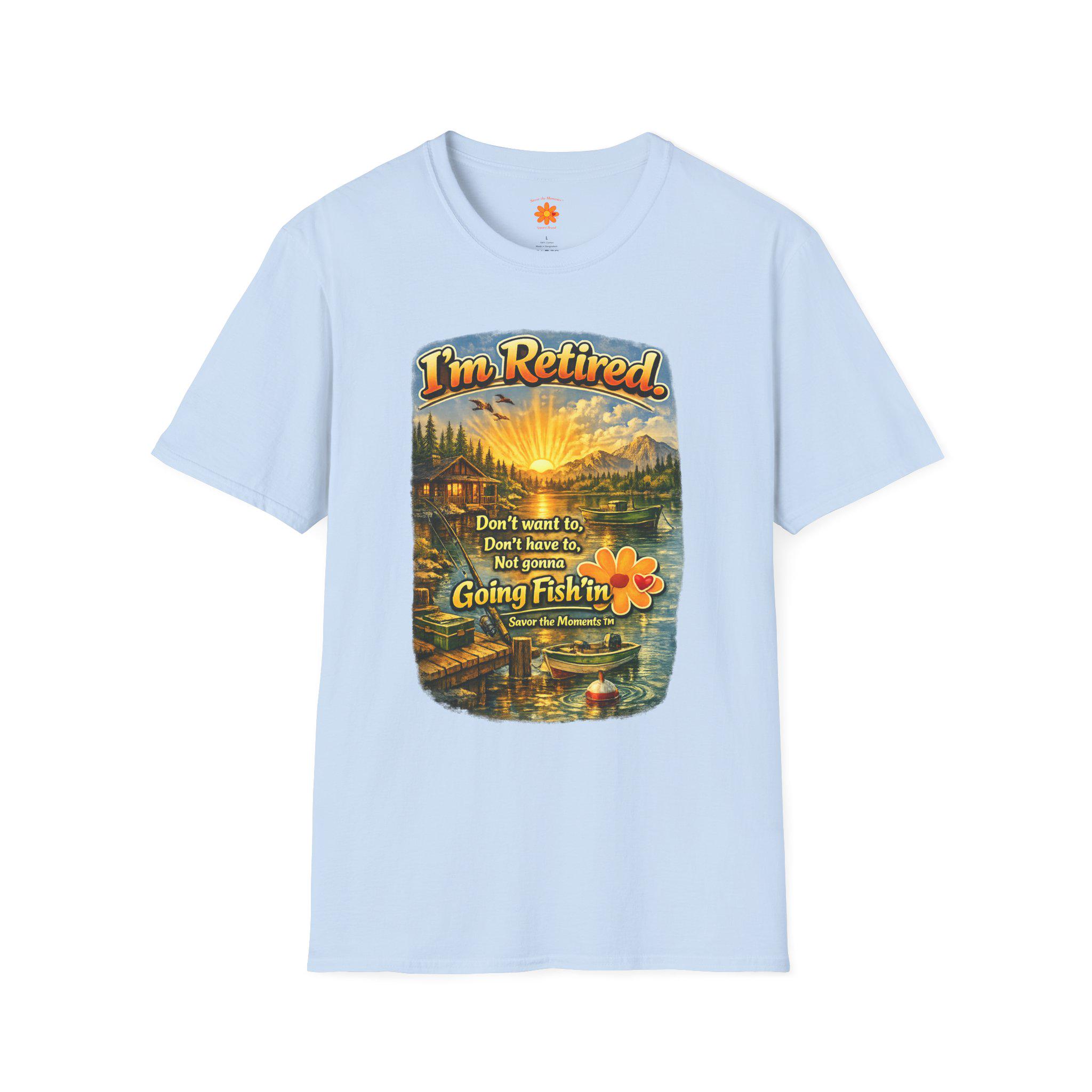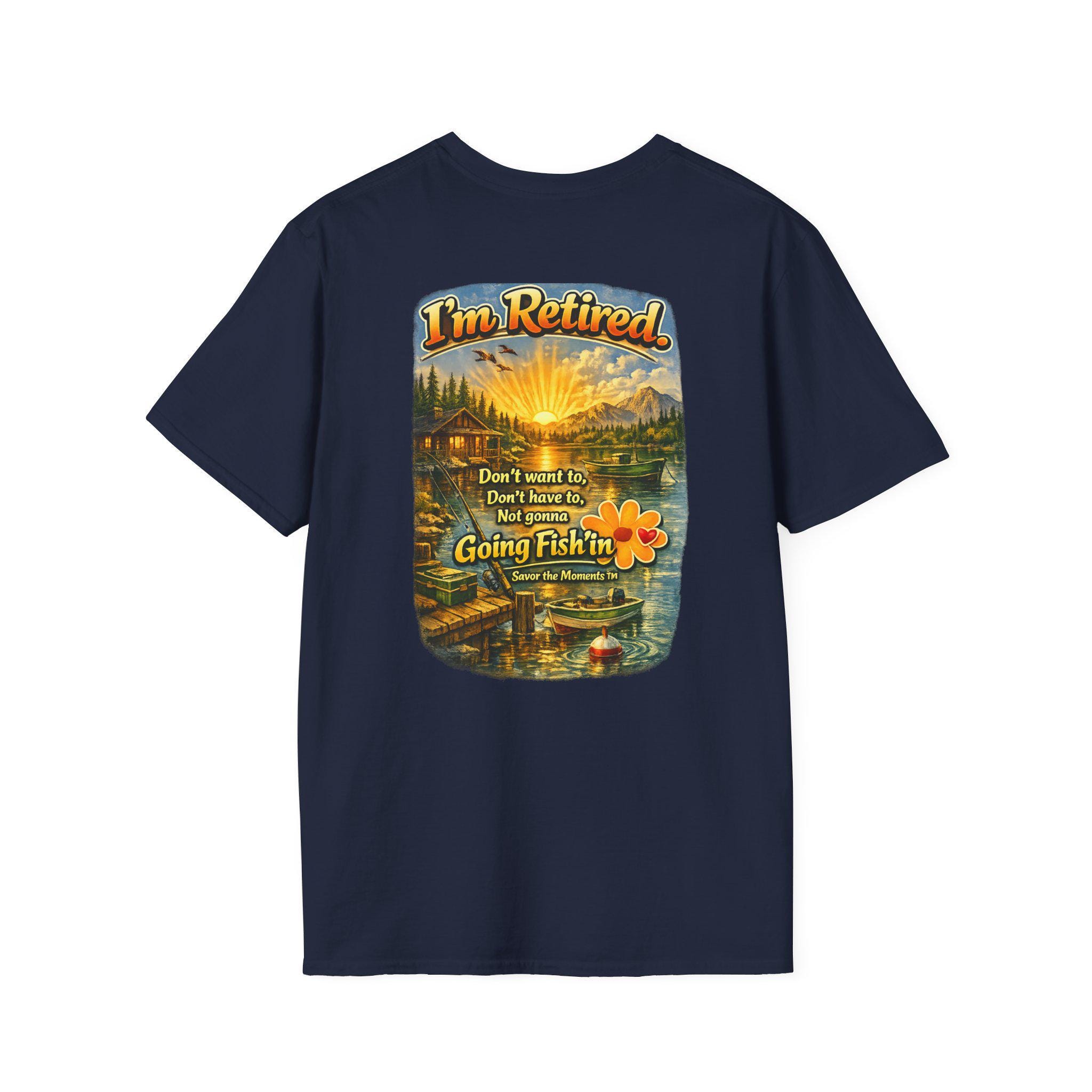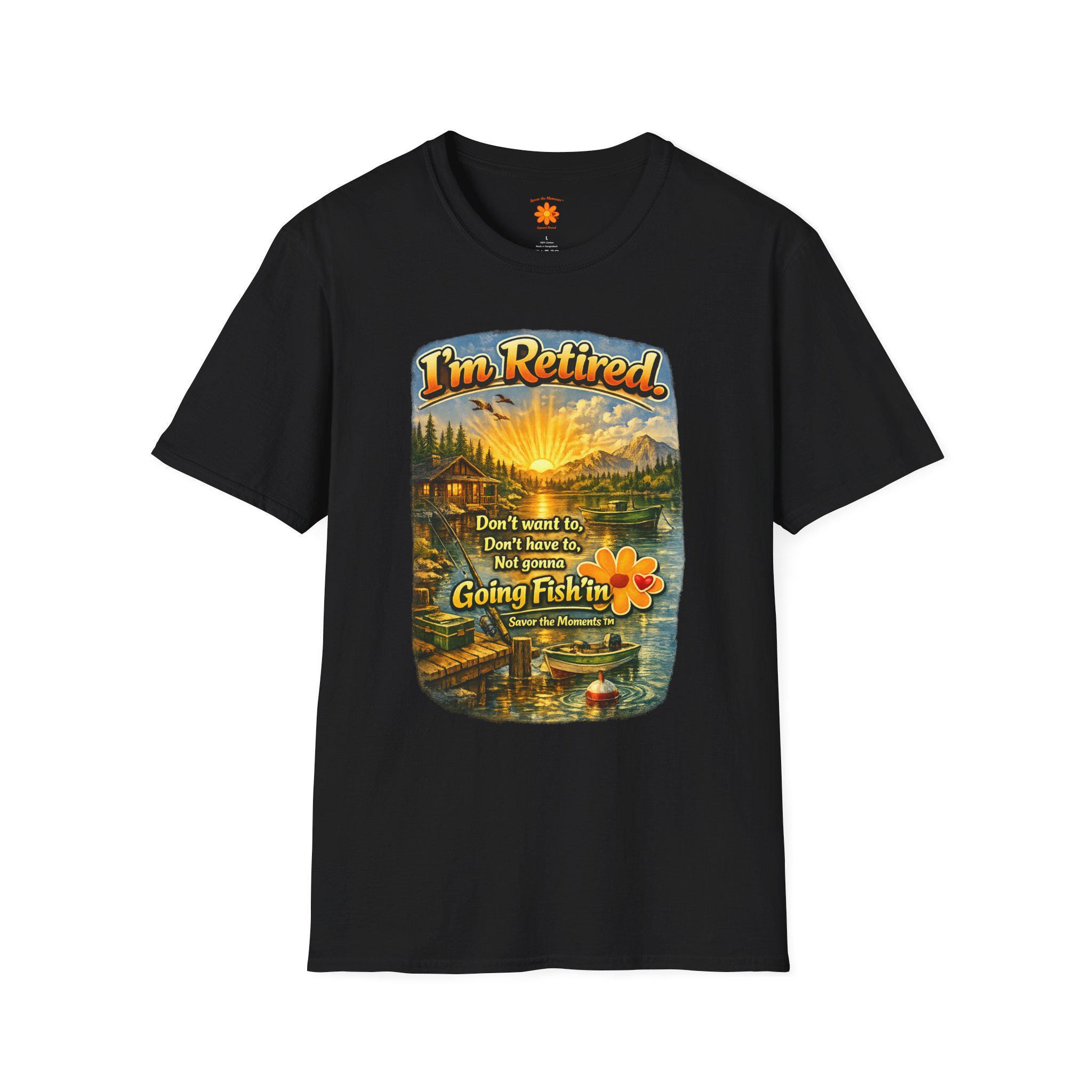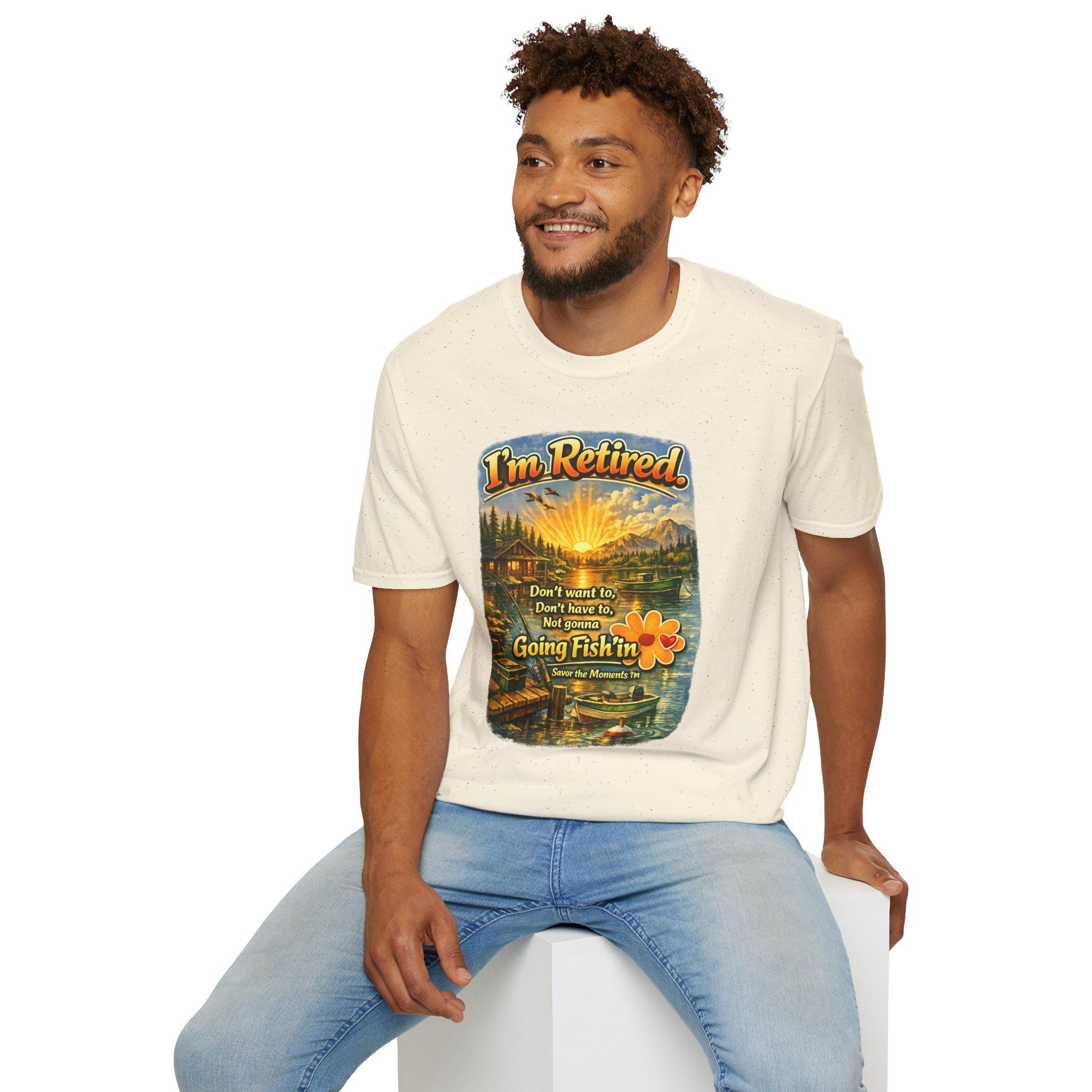 This lightweight cotton tee carries a warm, lakeside scene that reads like a little retirement daydream. Golden sunlight spills across a cabin, dock and still water while vintage lettering declares: "I'm Retired... Don't leave me, don't leave me not going fishin'". It feels like a slow morning with a thermos, a faithful rod, and the quiet company of pine-scented air. Wear it to tell the story: you’ve traded calendars for cast lines. The soft, smooth fabric and classic crew cut make it easy to slip on for early-morning fishing runs, casual afternoons at the cabin, or relaxed get-togethers with fellow retirees who appreciate humor and simple joys.