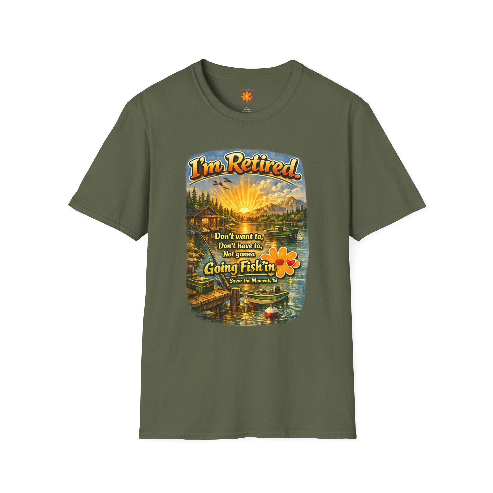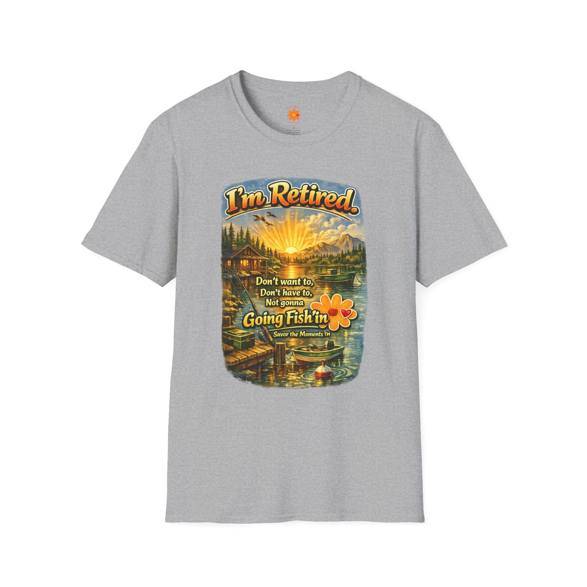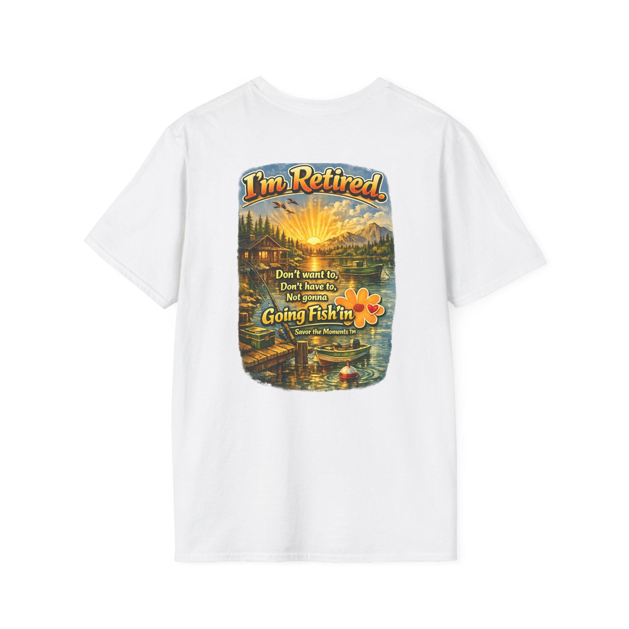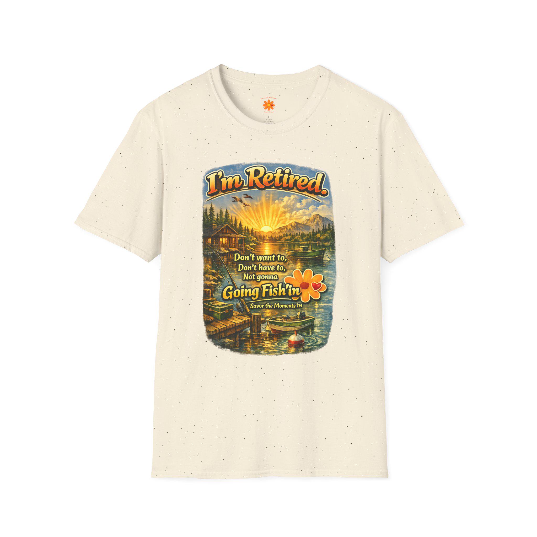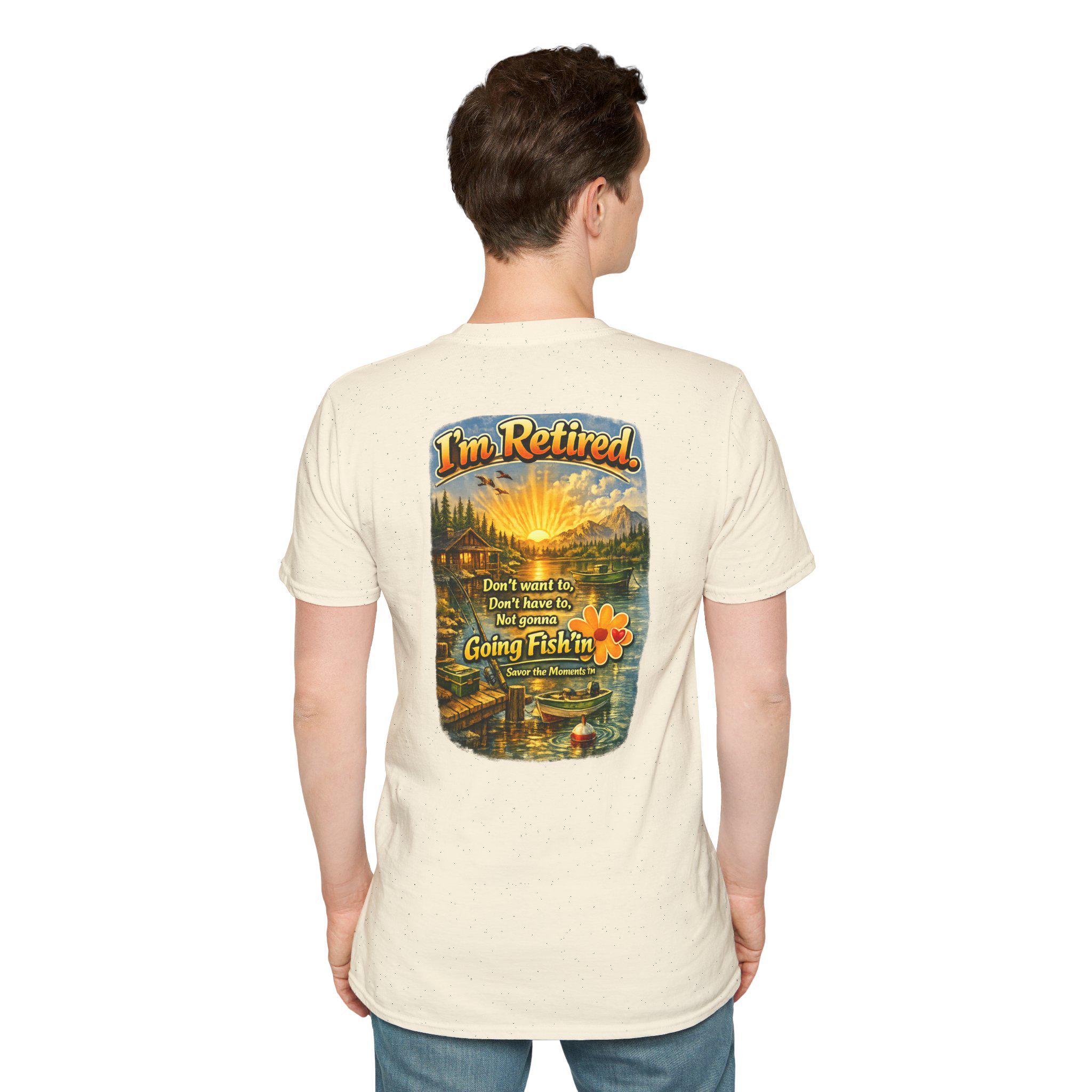 This lightweight cotton tee carries a warm, lakeside scene that reads like a little retirement daydream. Golden sunlight spills across a cabin, dock and still water while vintage lettering declares: "I'm Retired... Don't leave me, don't leave me not going fishin'". It feels like a slow morning with a thermos, a faithful rod, and the quiet company of pine-scented air. Wear it to tell the story: you’ve traded calendars for cast lines. The soft, smooth fabric and classic crew cut make it easy to slip on for early-morning fishing runs, casual afternoons at the cabin, or relaxed get-togethers with fellow retirees who appreciate humor and simple joys.