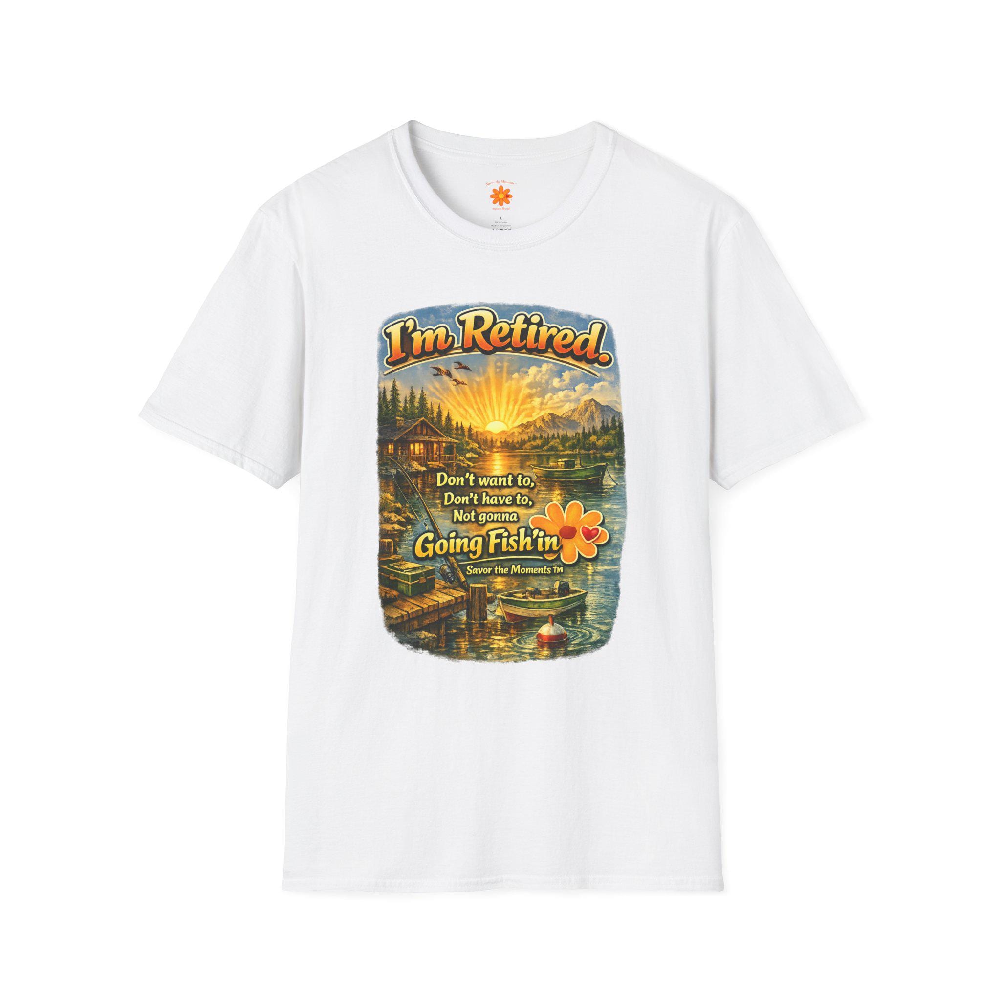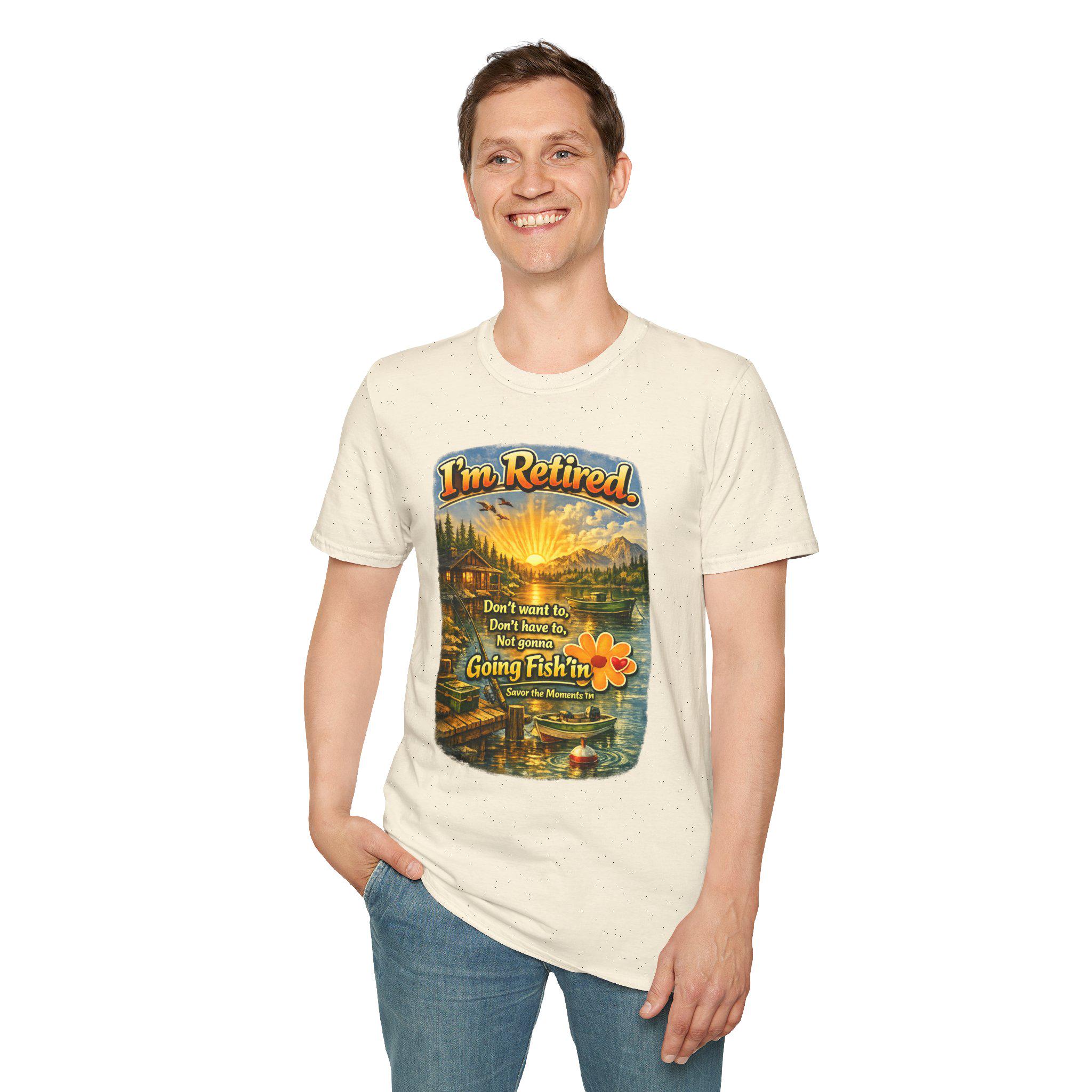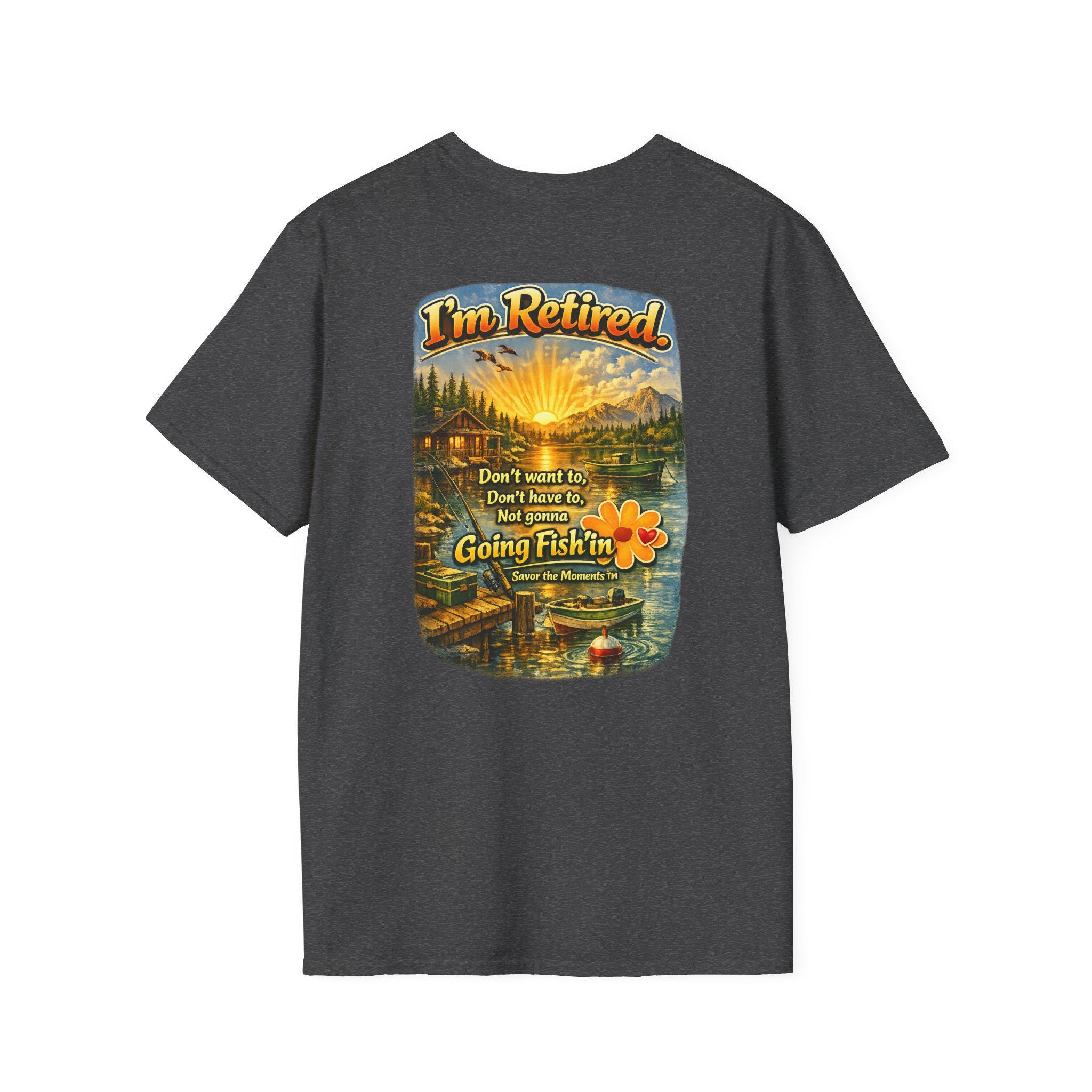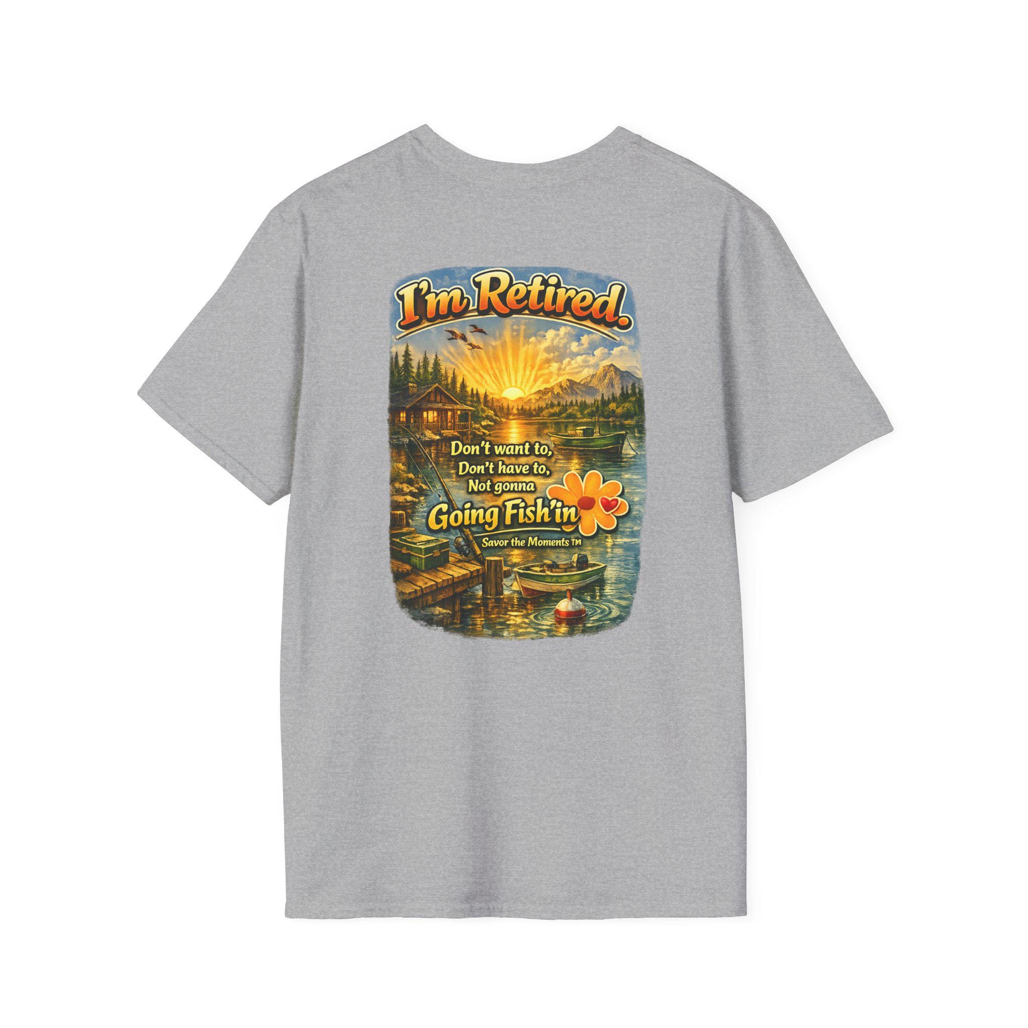 I'm Retired Going Fishin' T-Shirt | Fishing Lake Sunset Cabin Design.