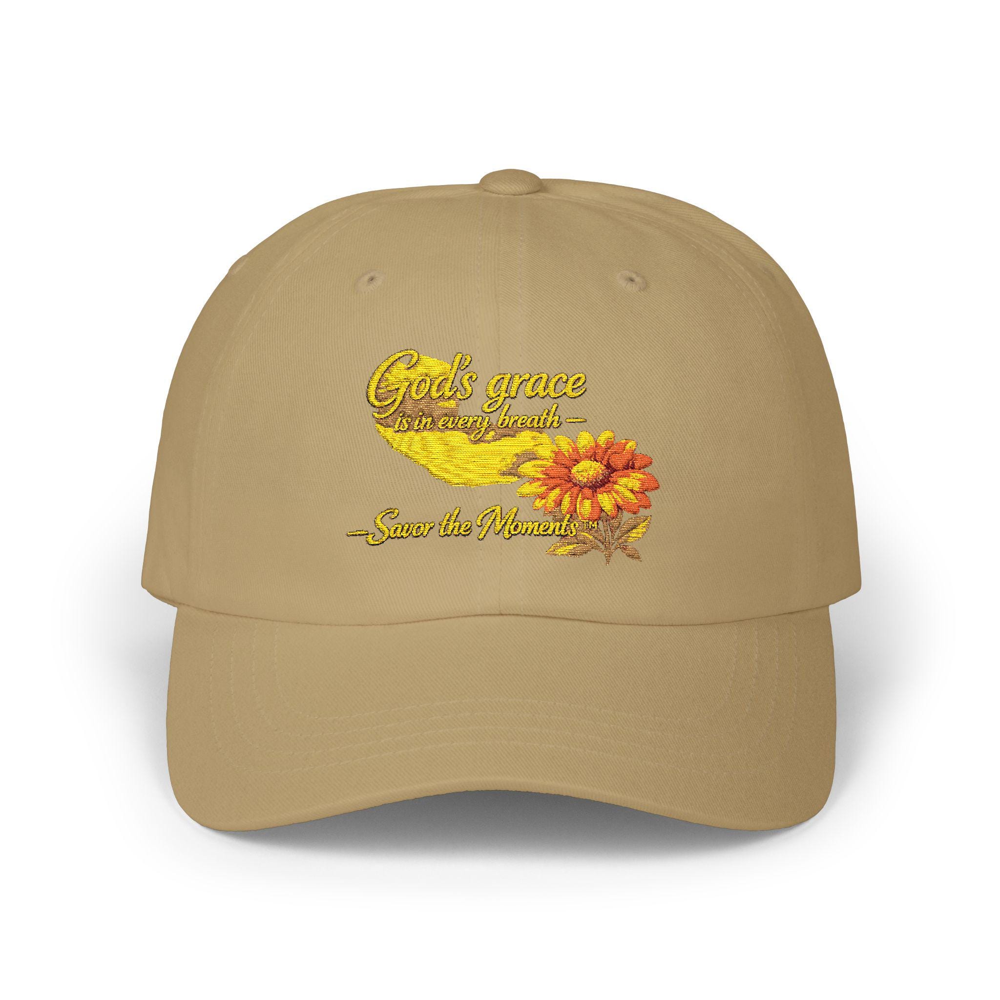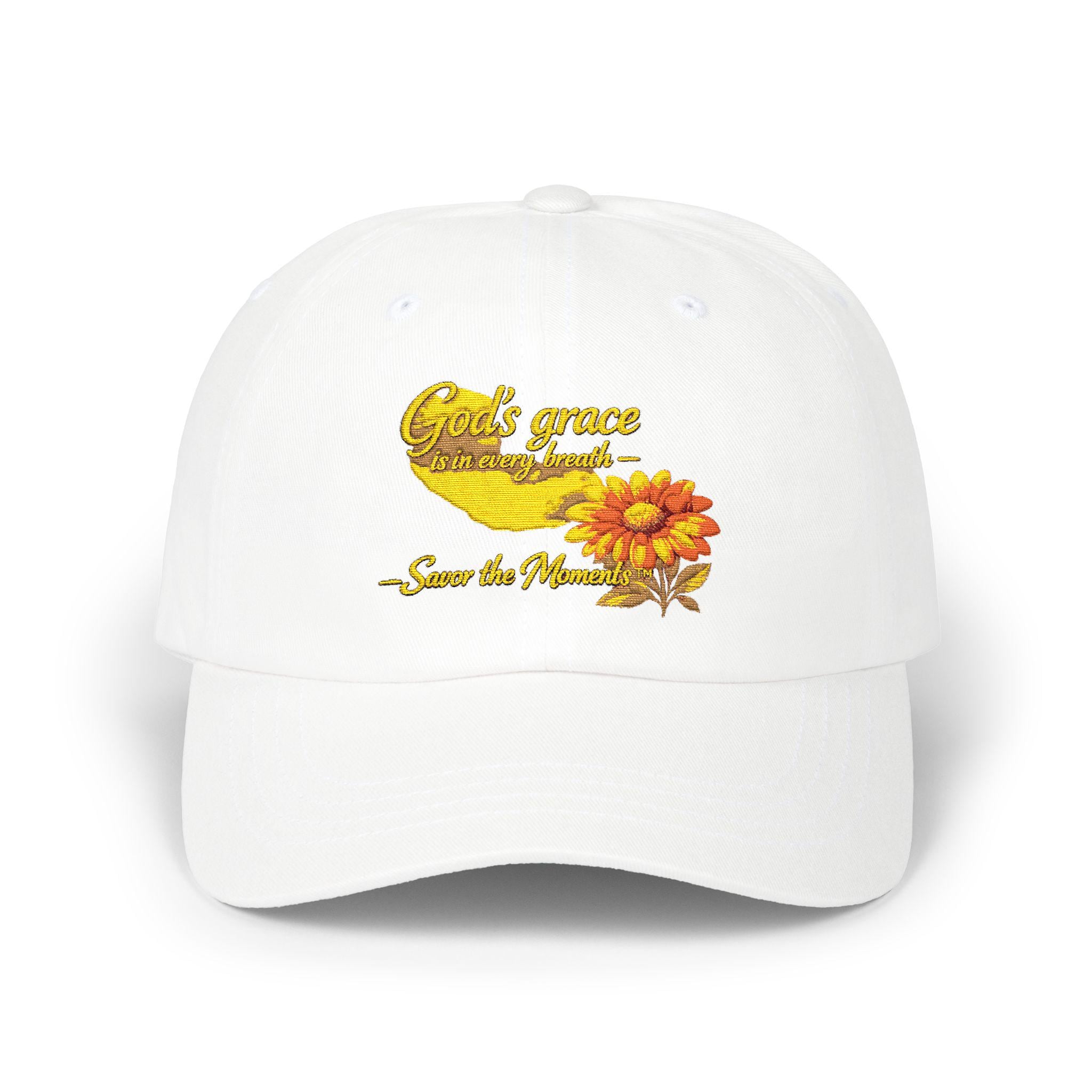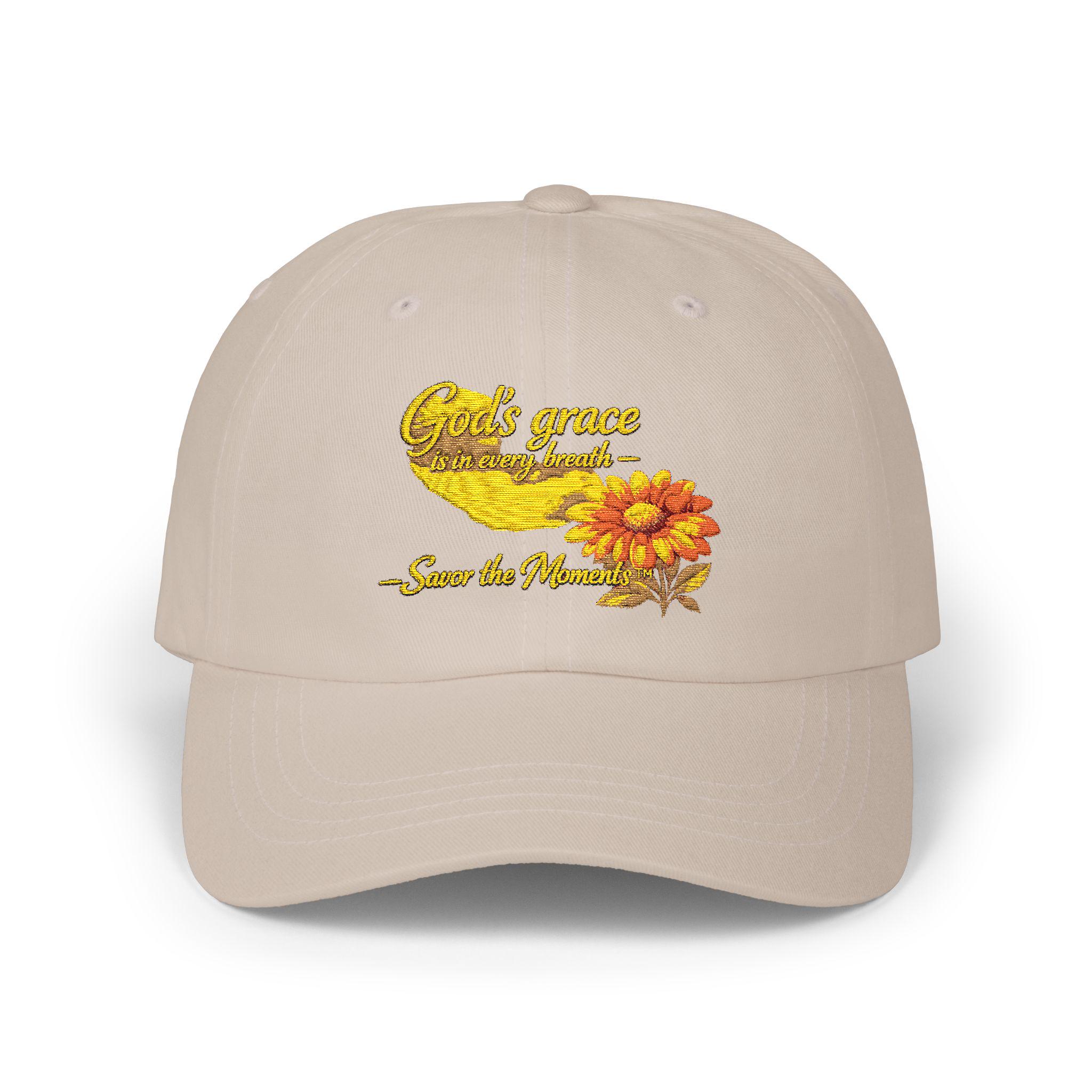 Faith-inspired dad cap featuring an uplifting quote. Celebrate God’s grace and savor life’s moments in timeless style."