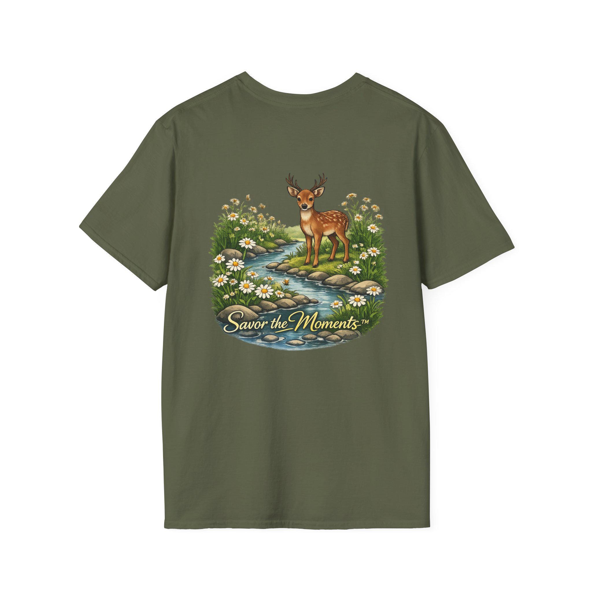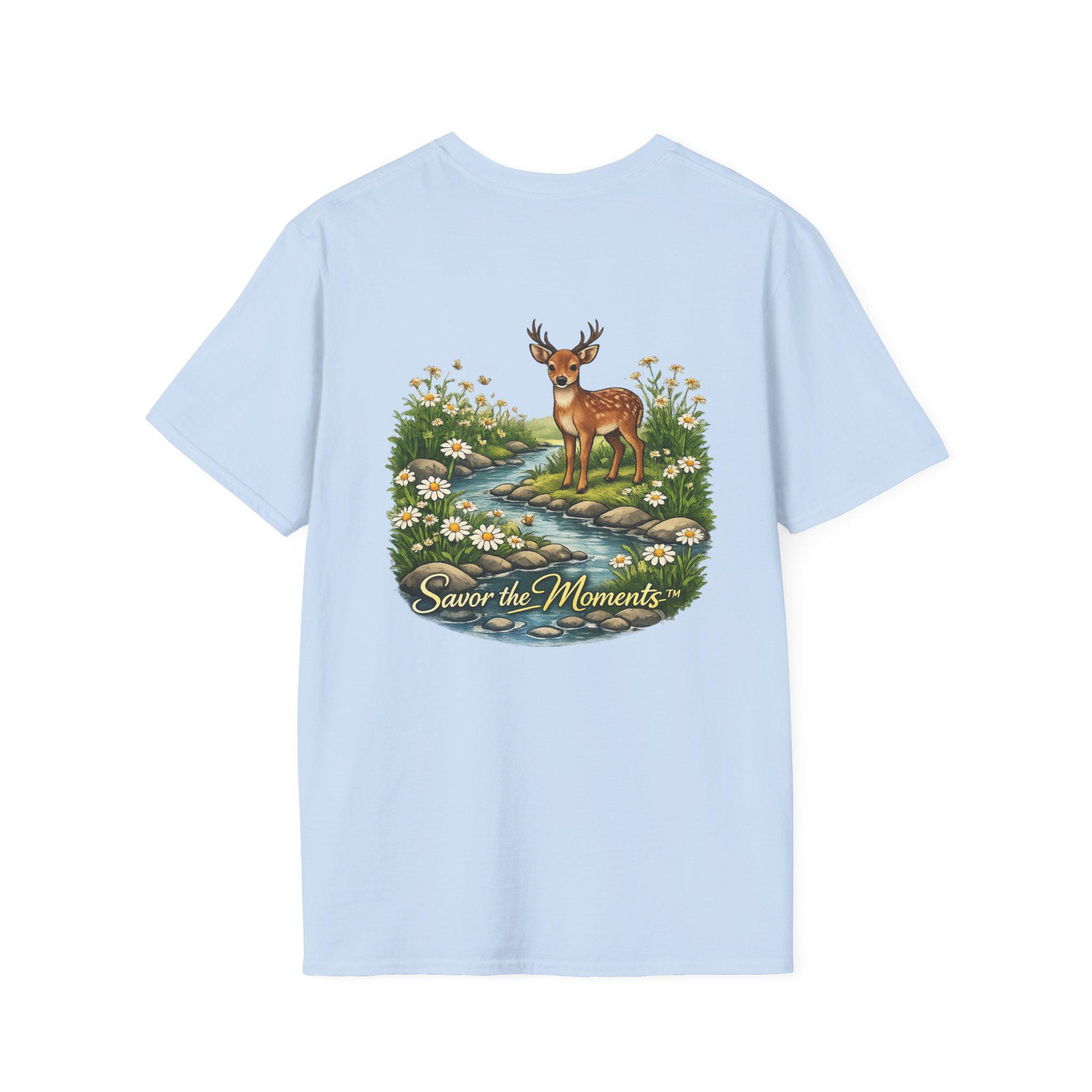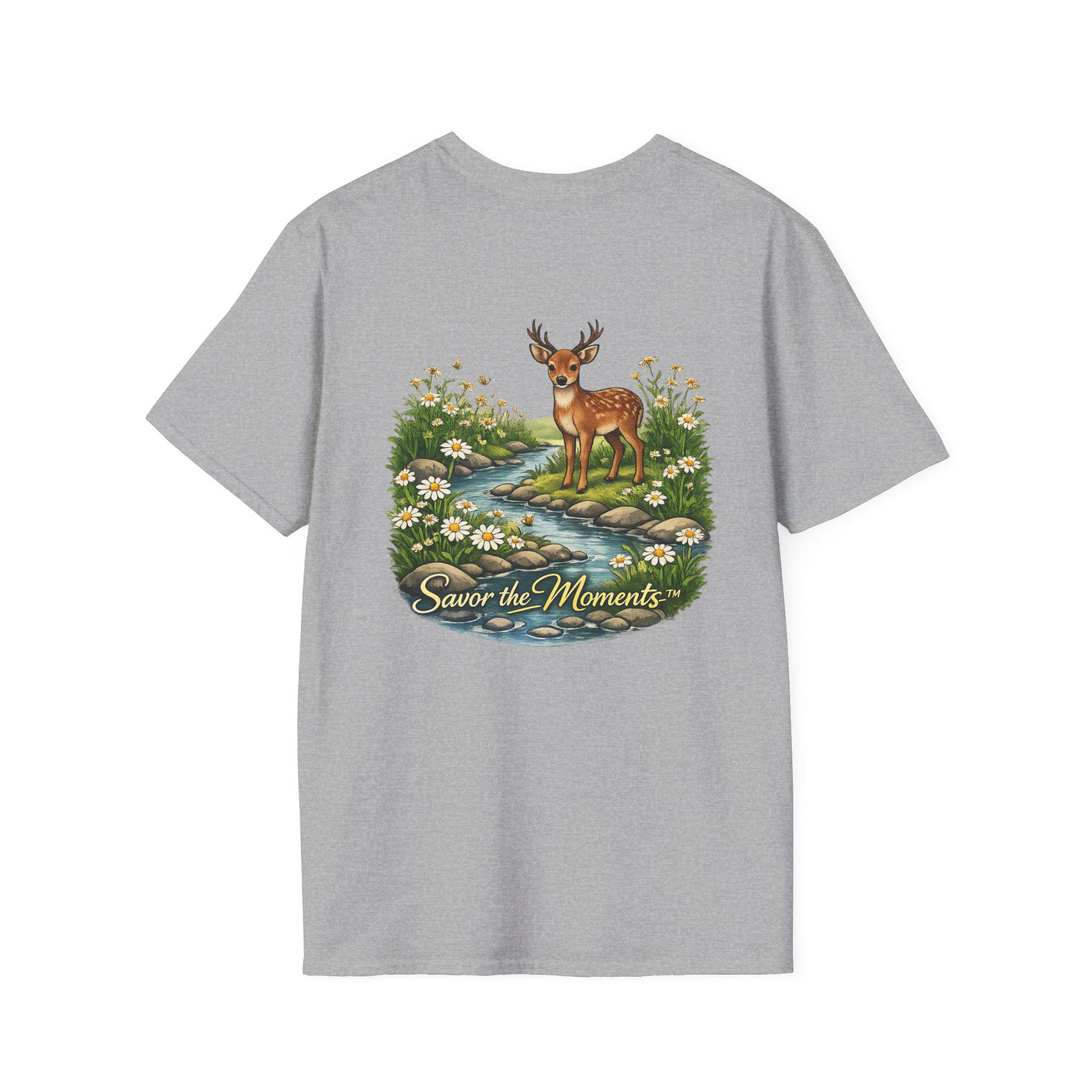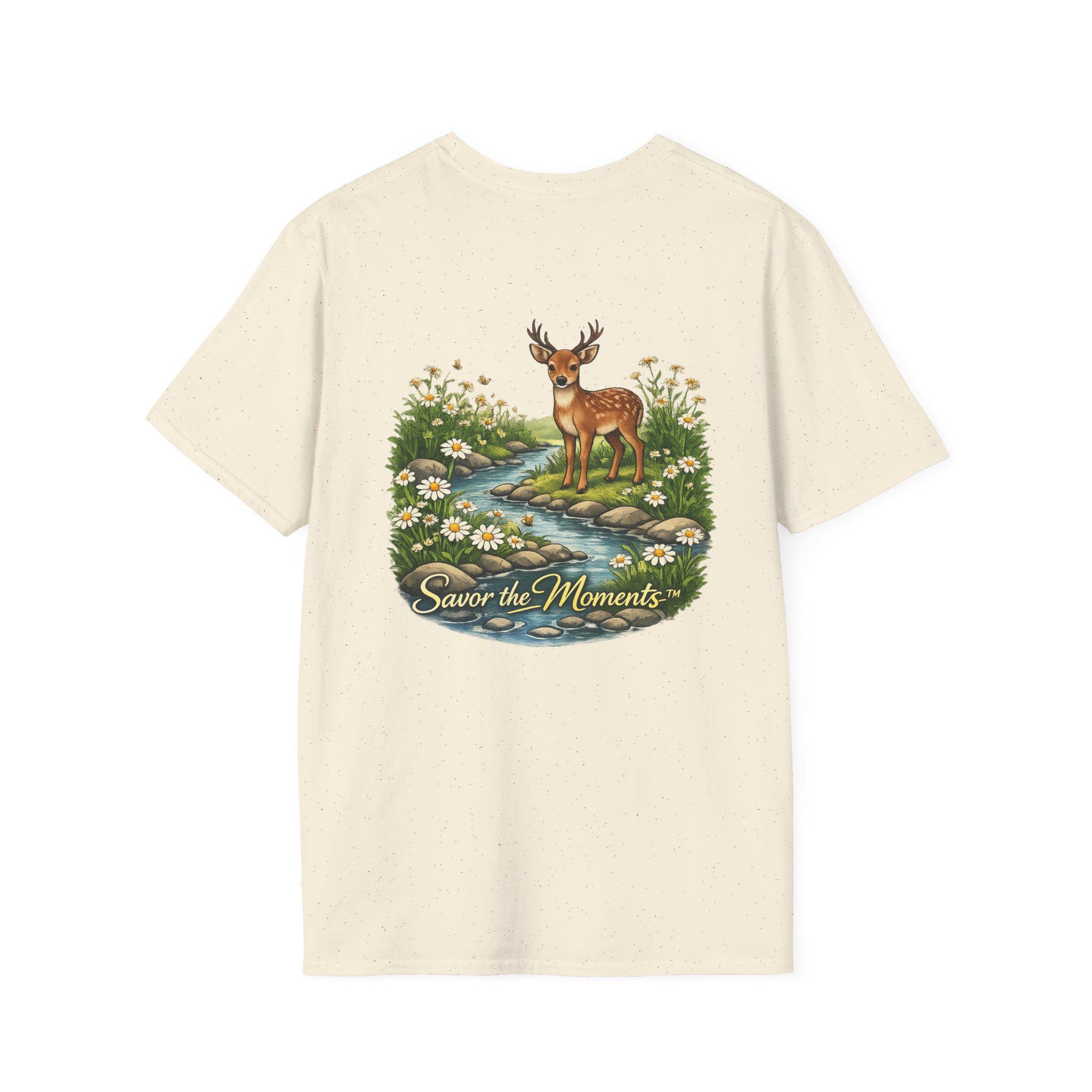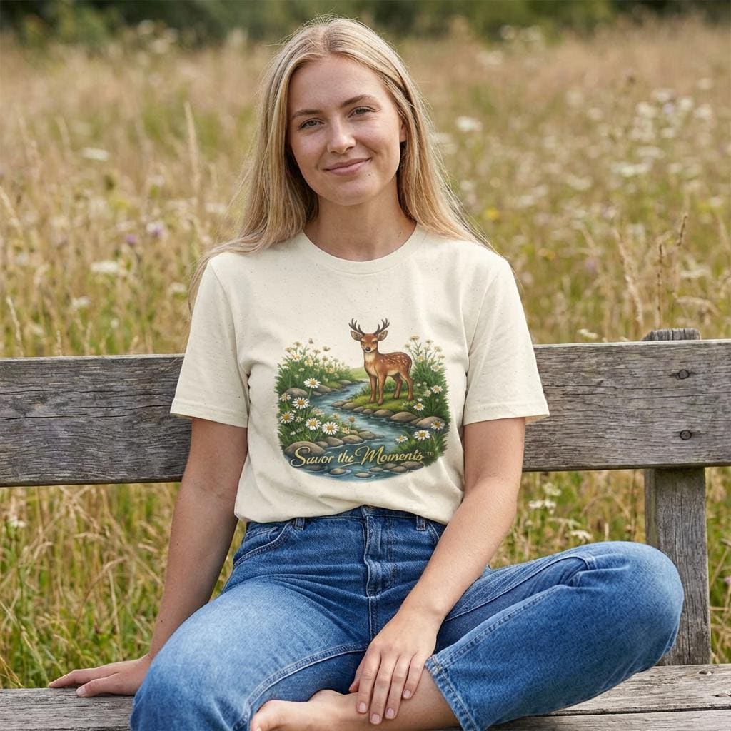 A lightweight, vintage-inspired tee that brings a quiet woodland moment into everyday wear. Soft ring-spun cotton feels gentle against the skin while a detailed nature illustration — a gentle deer standing beside a babbling stream framed by daisies — sits centered on front and back. The scene, paired with the phrase “Savor the Moments,” invites slower days, morning walks, and evenings on the porch. It layers easily under jackets or stands alone as a small reminder to notice the little things in a busy life.