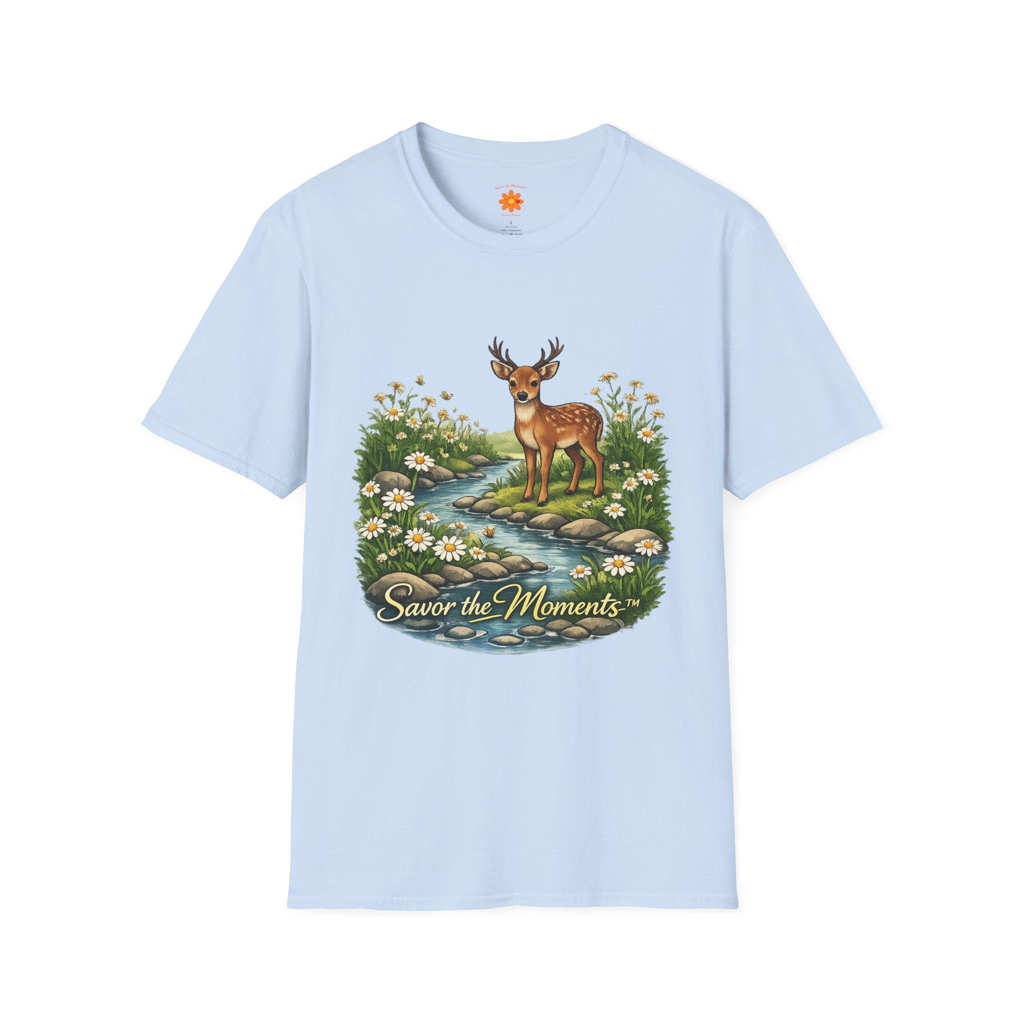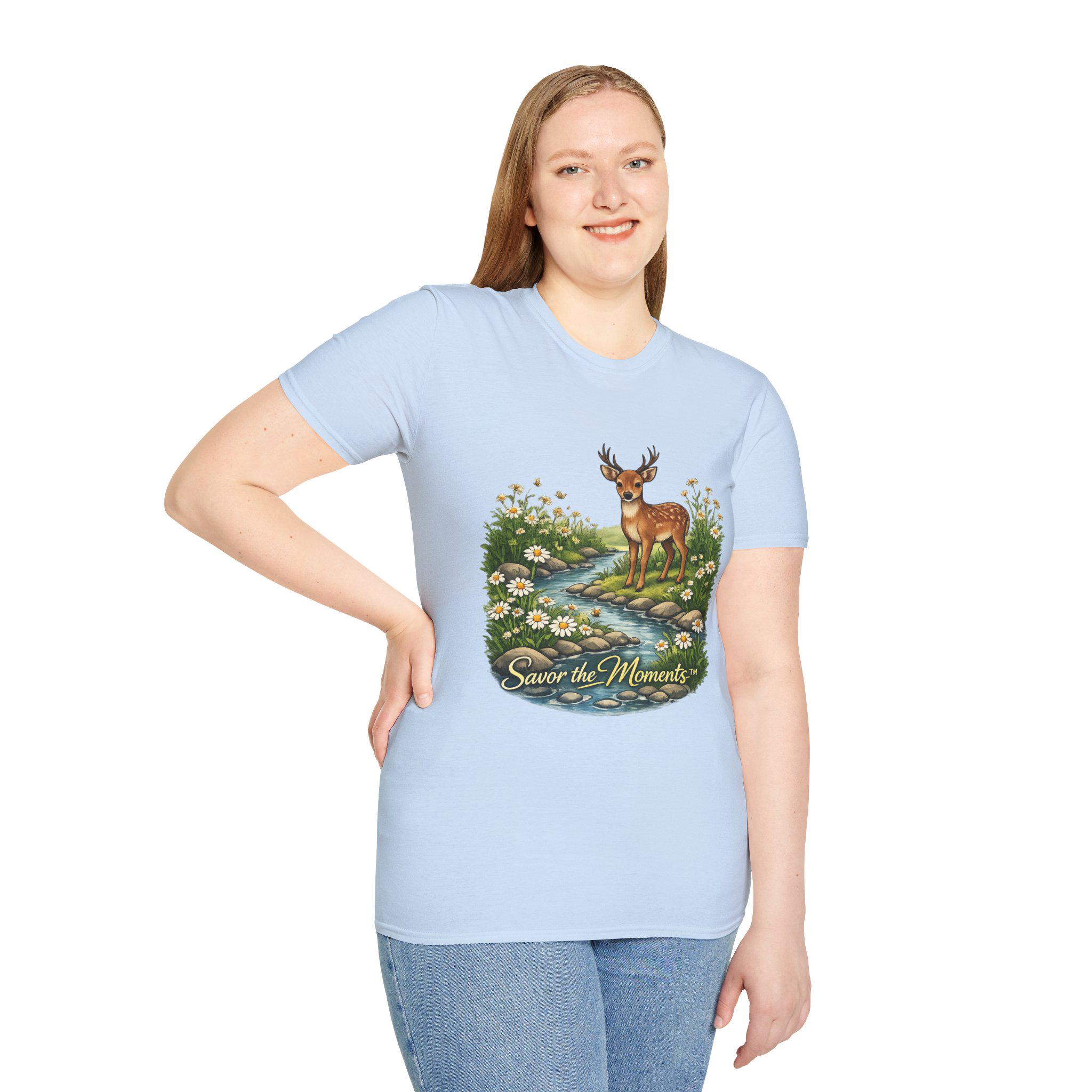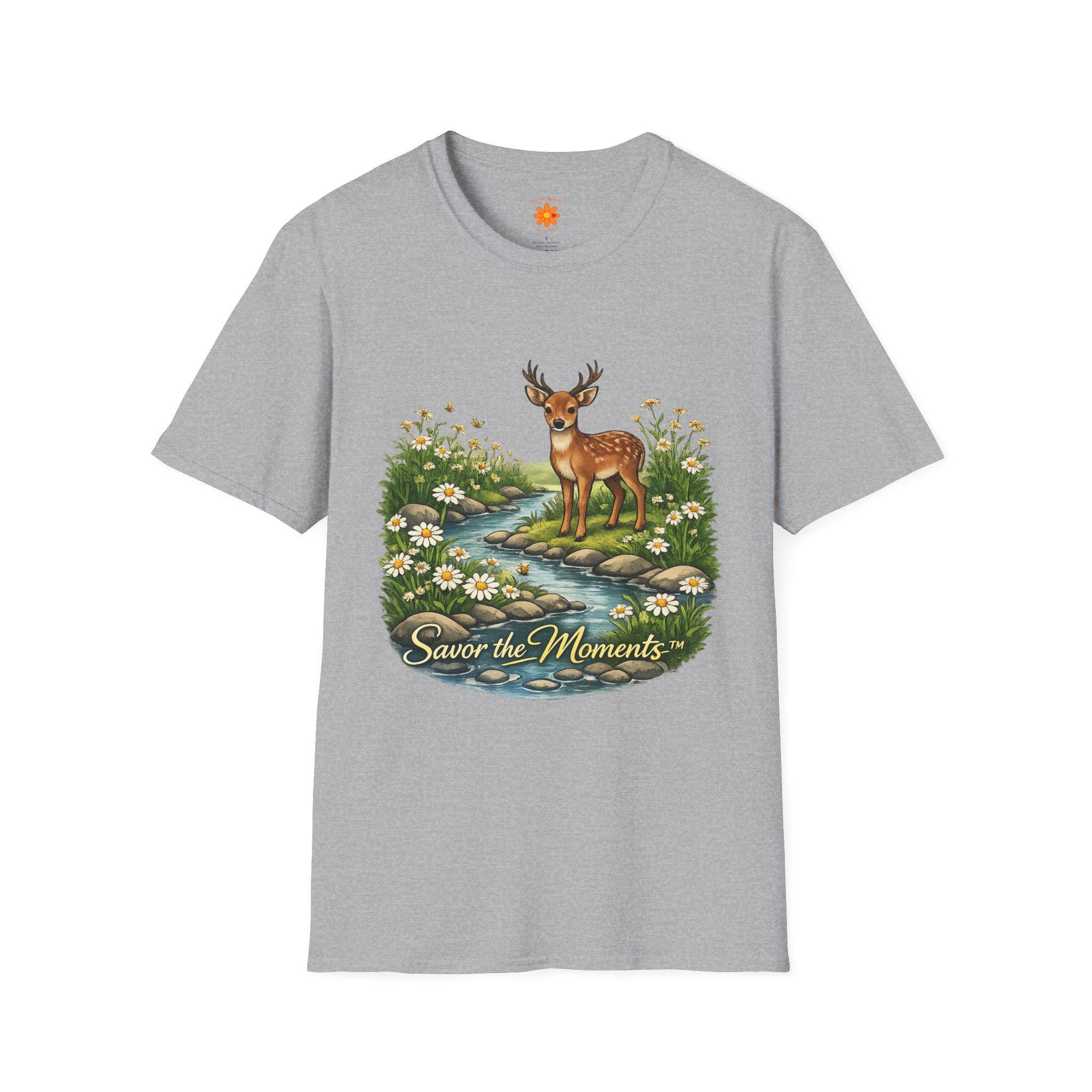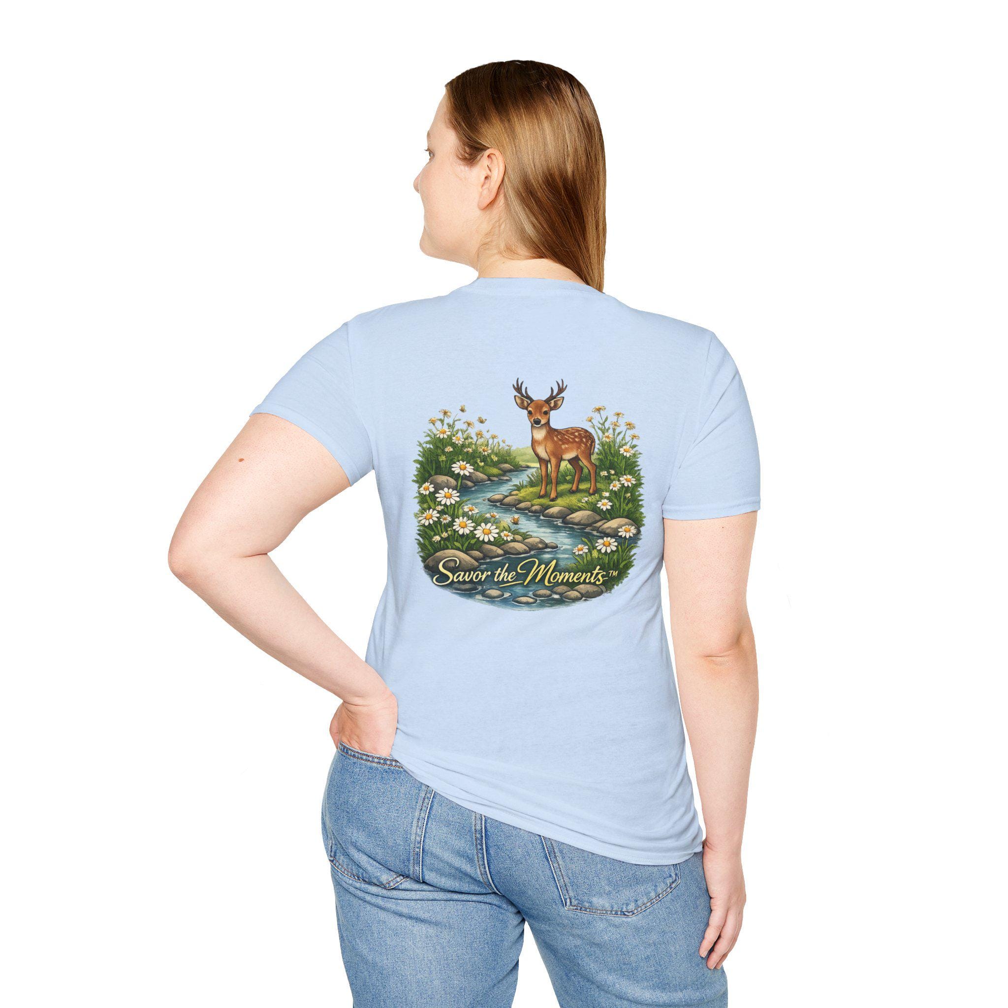 A lightweight, vintage-inspired tee that brings a quiet woodland moment into everyday wear. Soft ring-spun cotton feels gentle against the skin while a detailed nature illustration — a gentle deer standing beside a babbling stream framed by daisies — sits centered on front and back. The scene, paired with the phrase “Savor the Moments,” invites slower days, morning walks, and evenings on the porch. It layers easily under jackets or stands alone as a small reminder to notice the little things in a busy life.