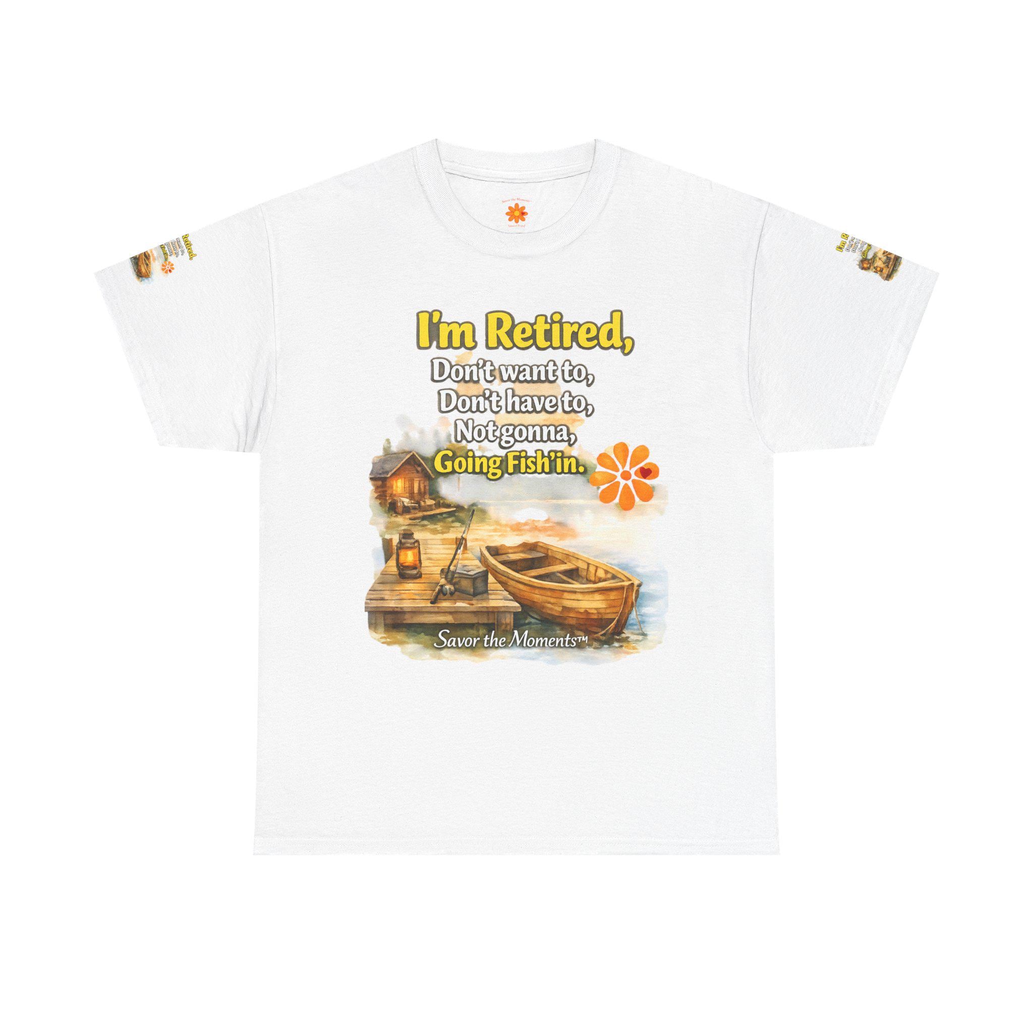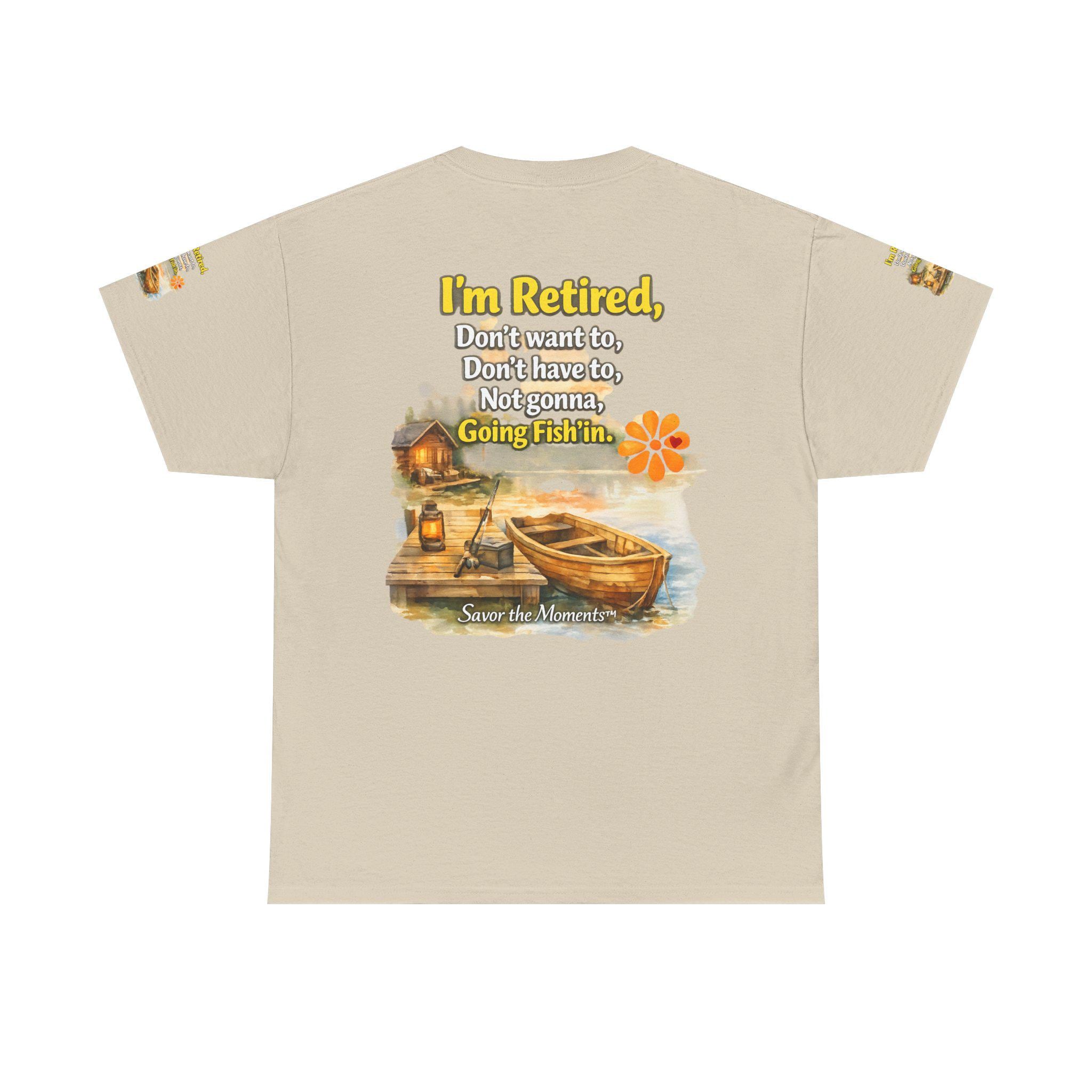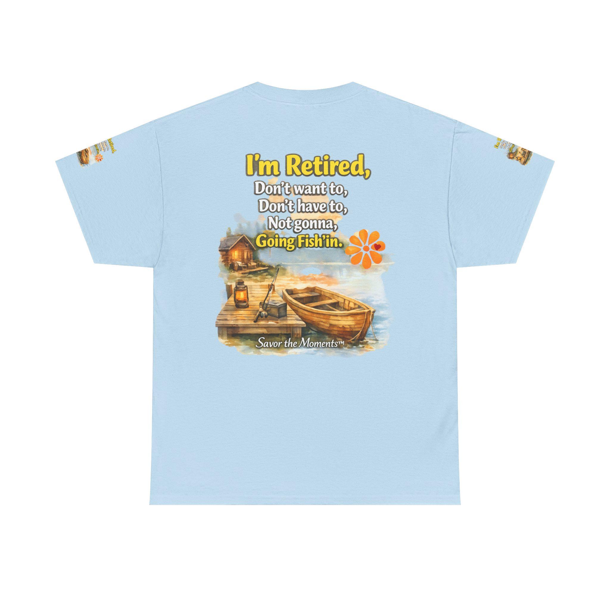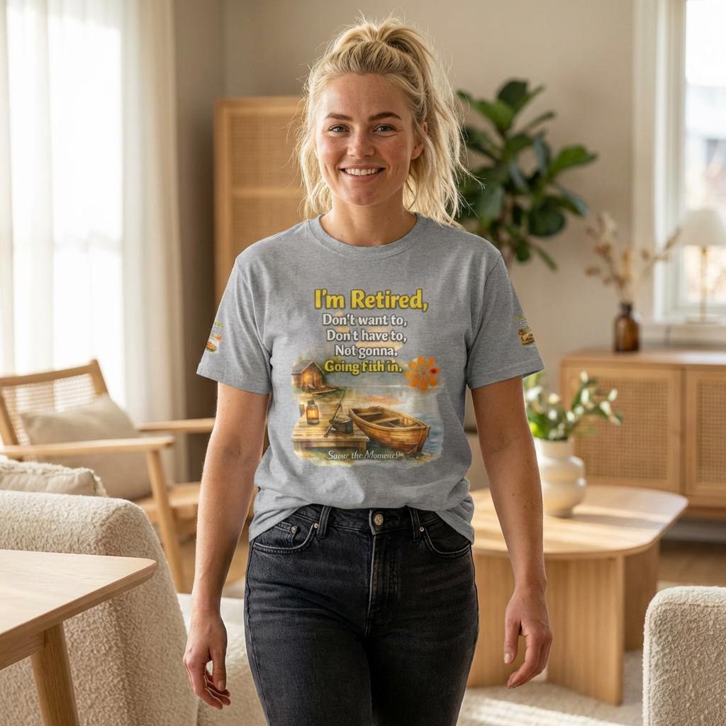 A soft, breathable cotton tee that feels like easy mornings by the lake. The shirt shows a warm watercolor scene: a wooden boat tied to a weathered dock, a small cabin with a lantern glowing, and gentle ripples in the water. Over the image sits a playful, retired-person mantra that reads like a wink to anyone who’s swapped schedules for slow days. The overall vibe is relaxed and nostalgic — the kind of shirt you reach for when you want to be comfortable and quietly content. It layers well under a flannel for cool dawns or wears alone while sipping coffee on the porch. The sleeve details and printed inner label add a thoughtful, finished touch that fans of cottage and lakeside life will notice and appreciate.